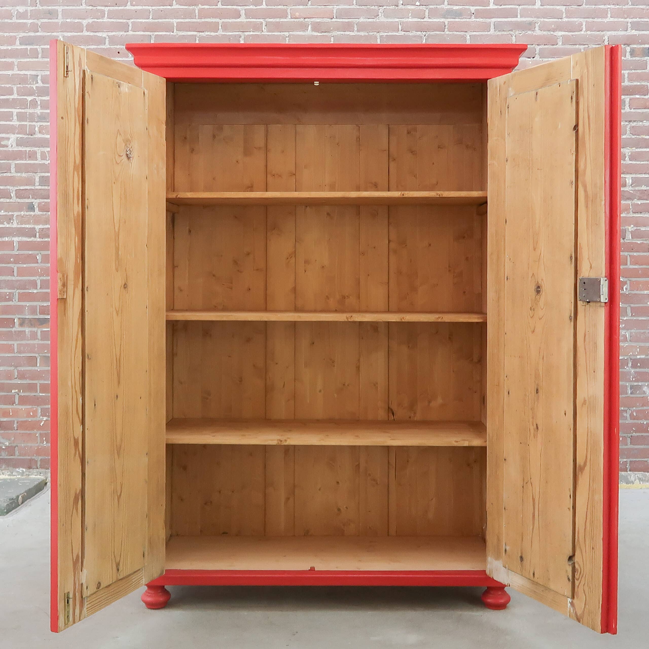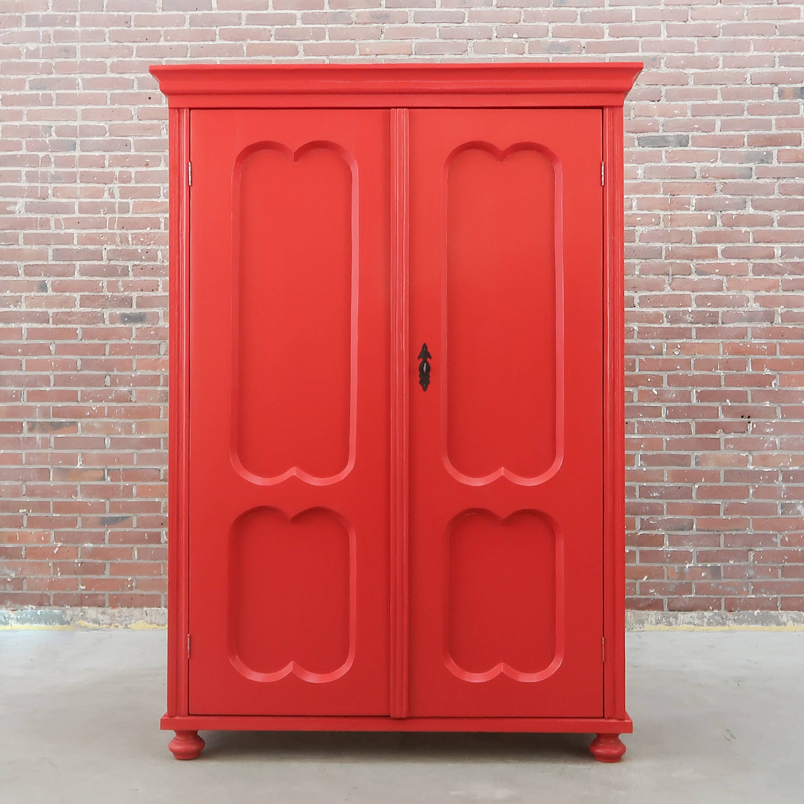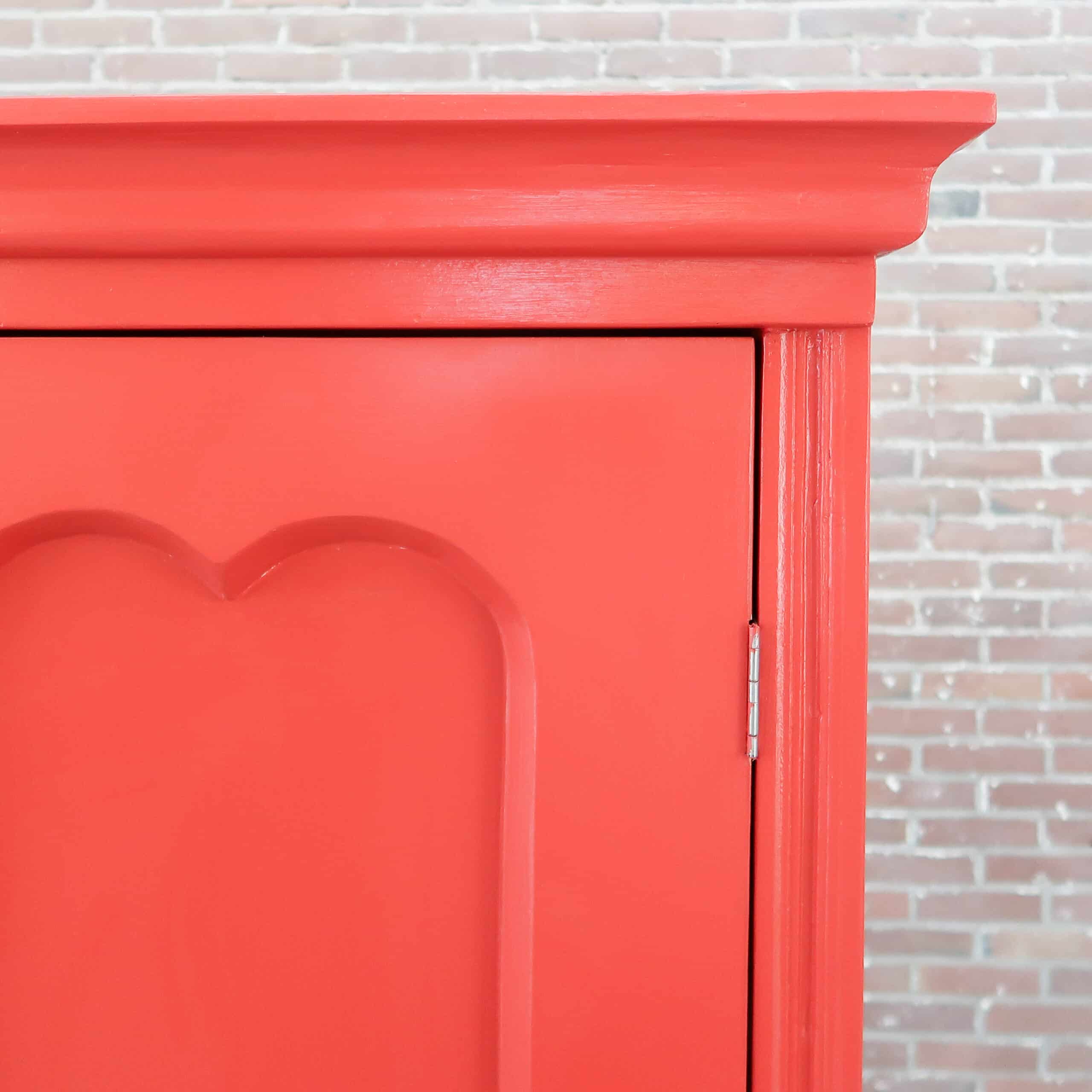Deze brocante rode linnenkast hebben we opgespeurd en opgeknapt in Hongarije! Zo hebben we haar oa nieuwe planken en een rood knal kleur gegeven.