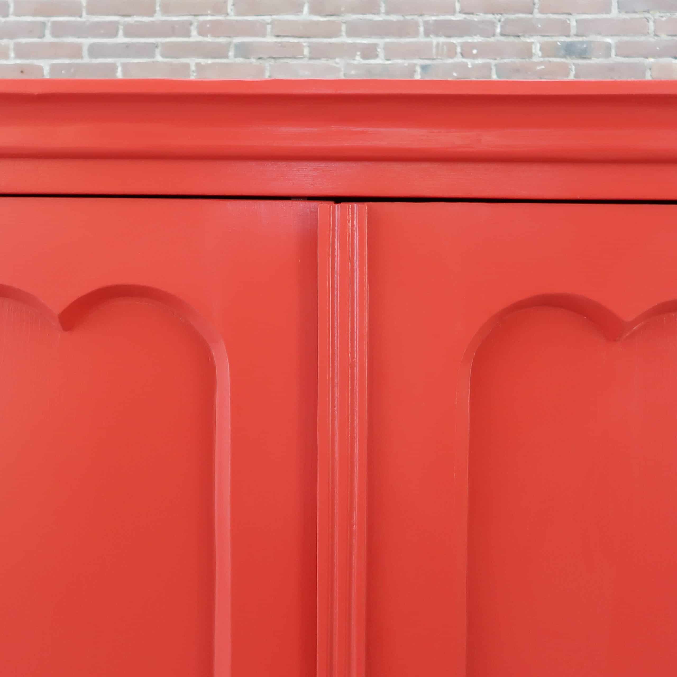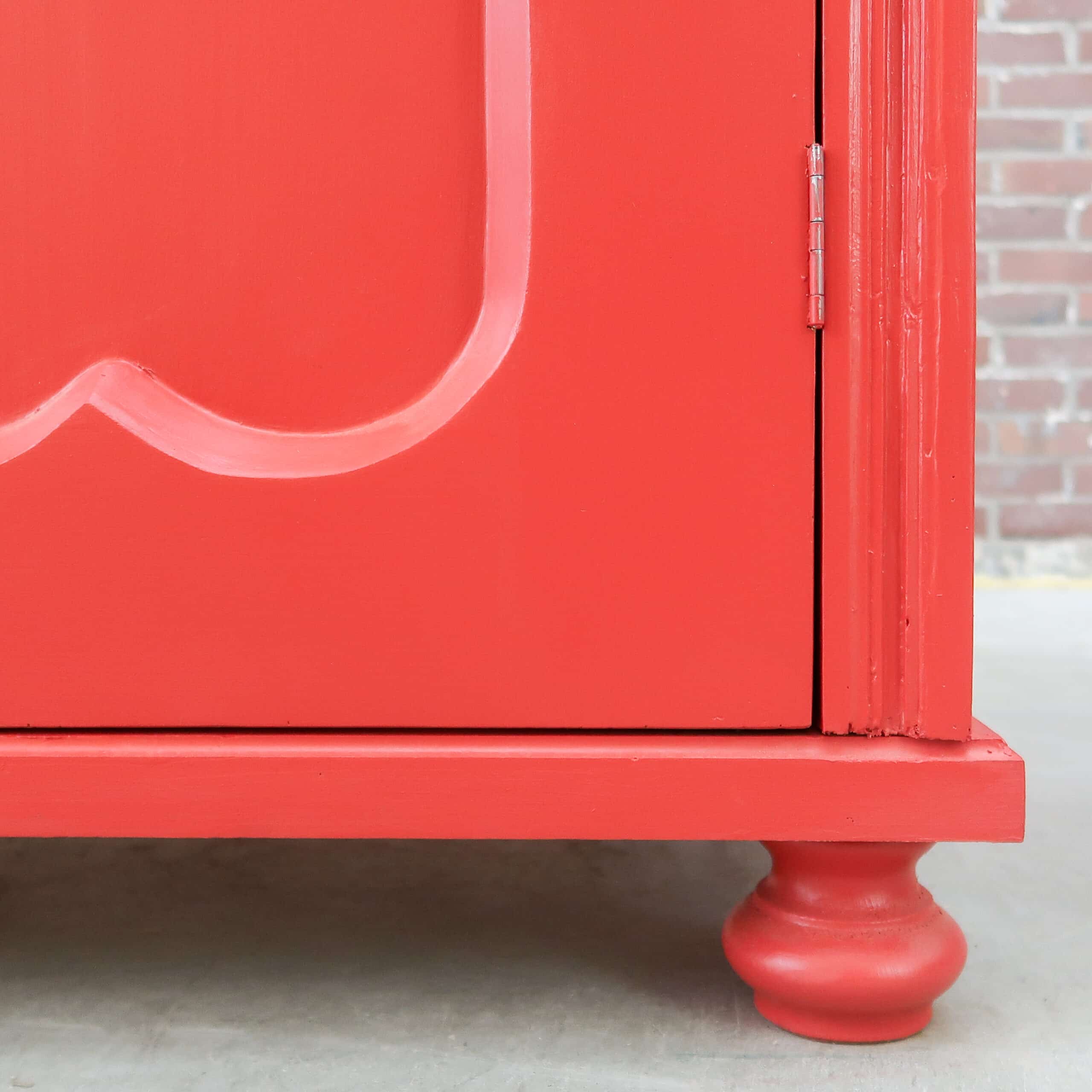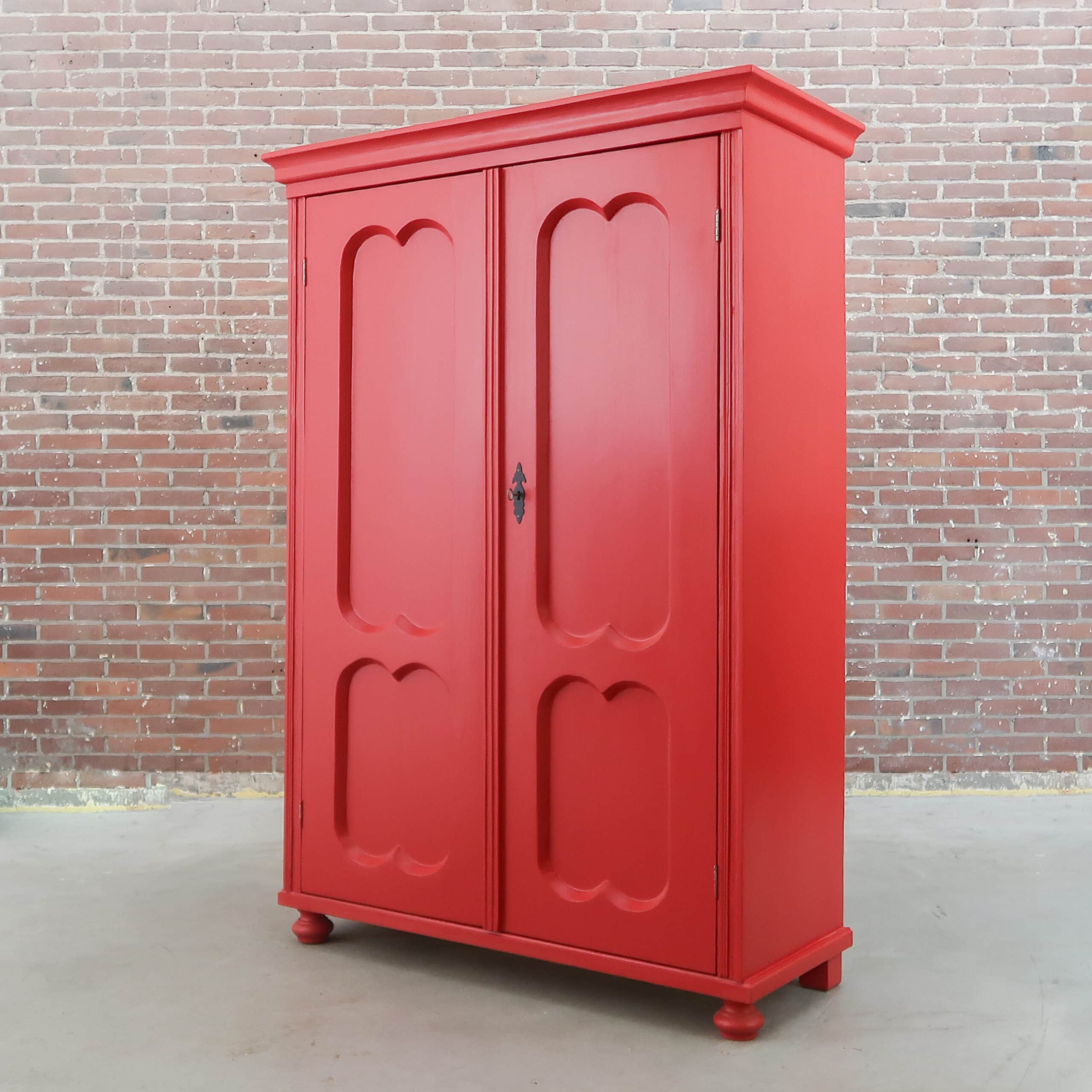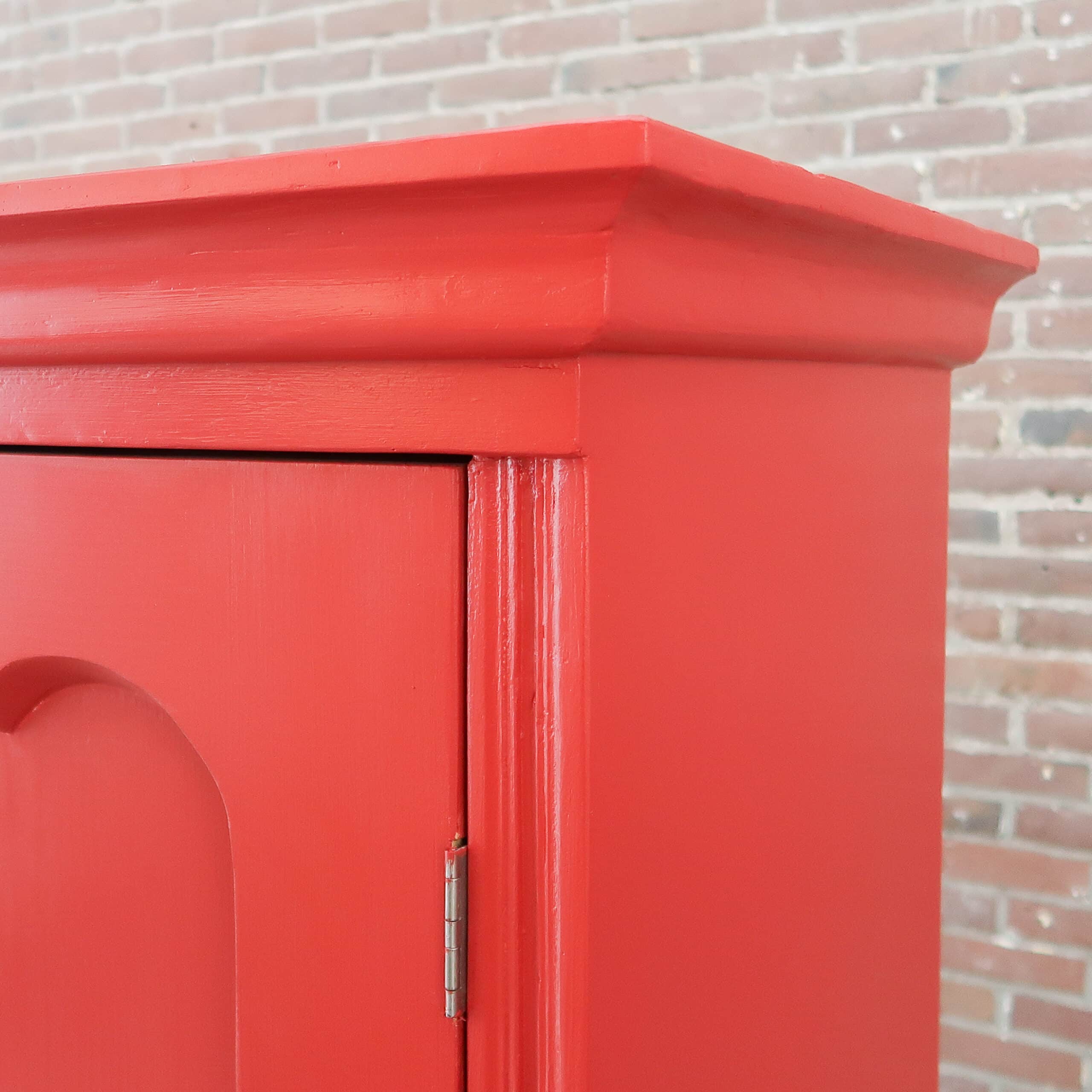 Deze brocante rode linnenkast hebben we opgespeurd en opgeknapt in Hongarije! Zo hebben we haar oa nieuwe planken en een rood knal kleur gegeven.
