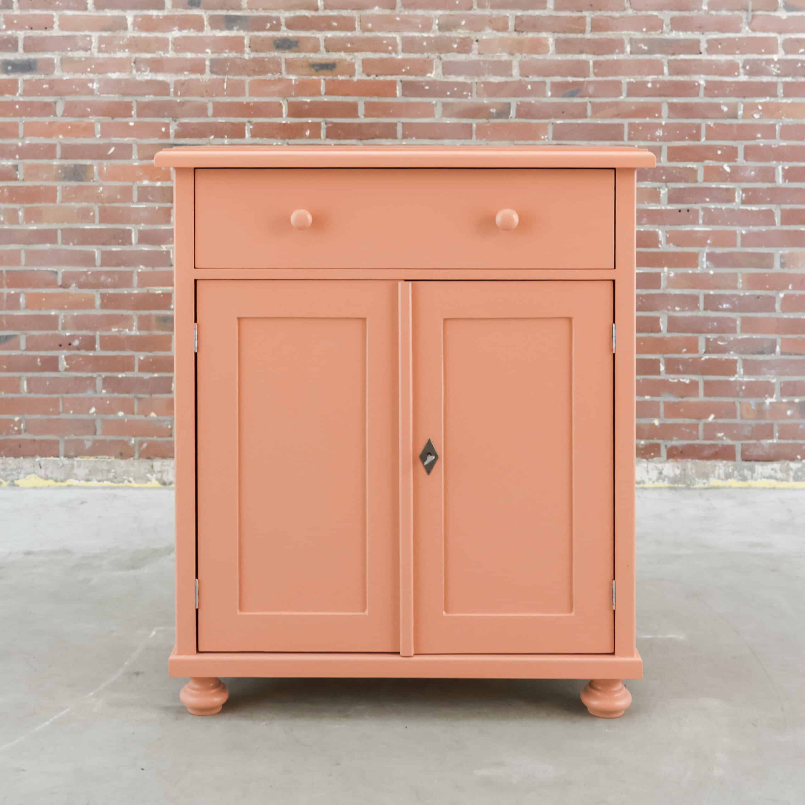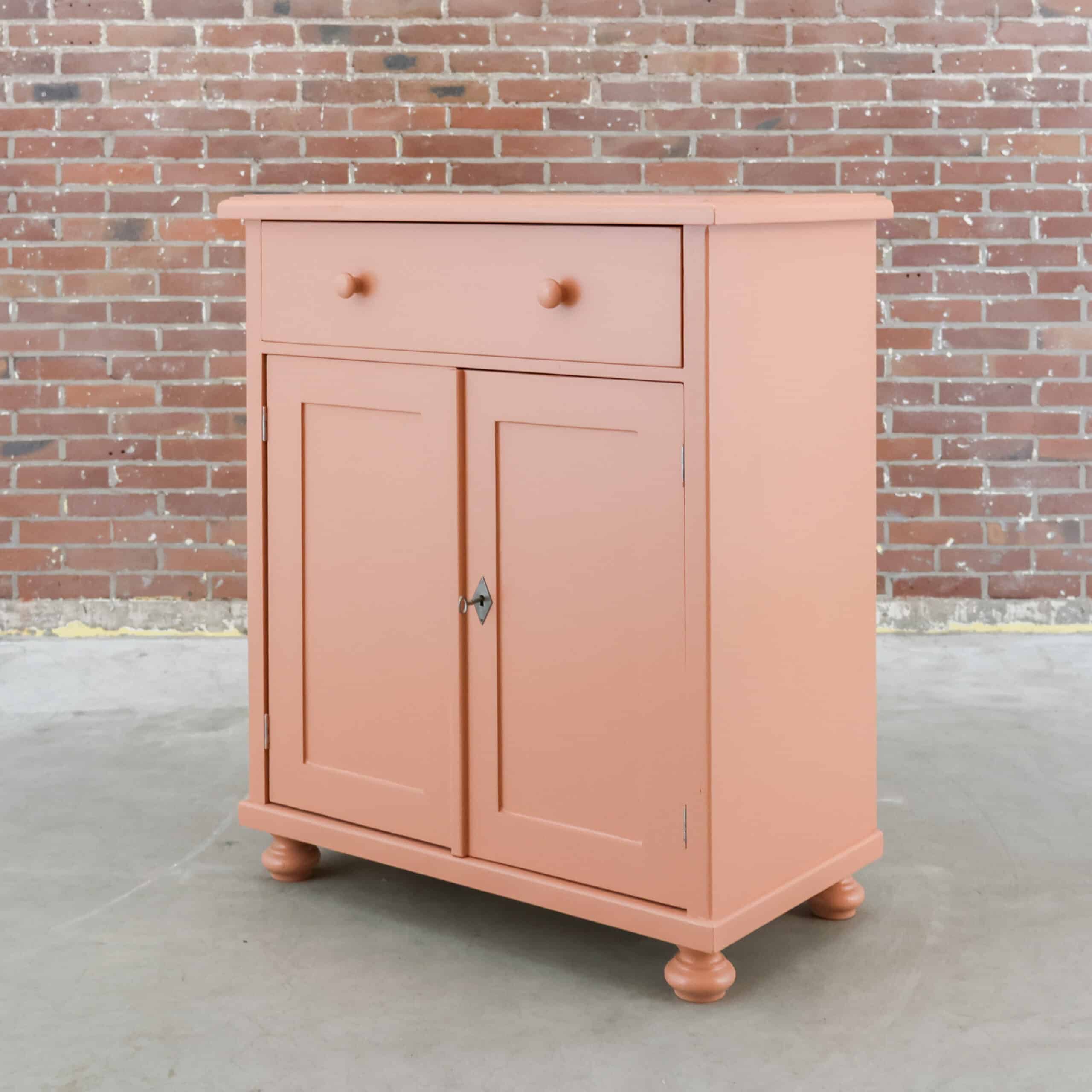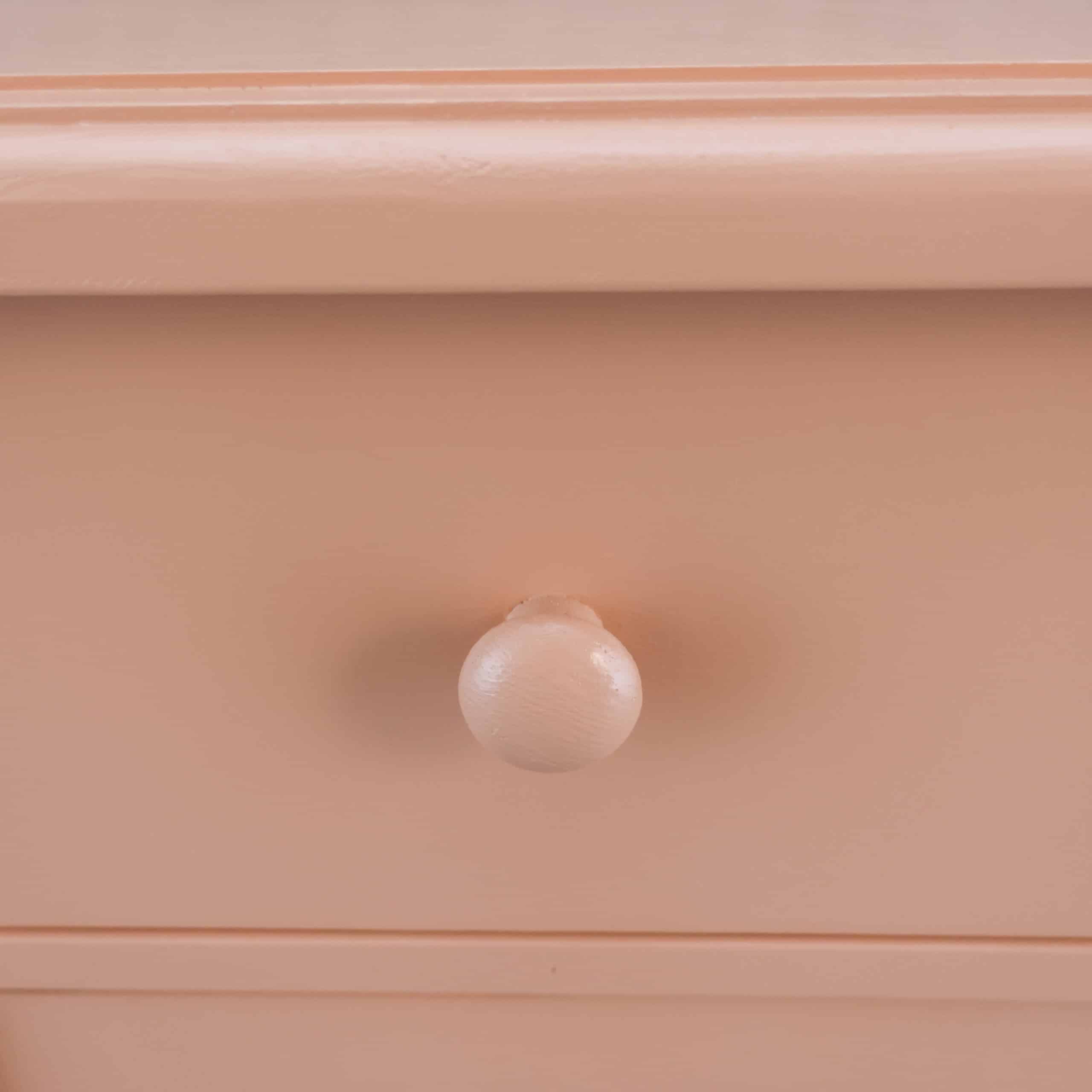 Leuk brocante dressoir met een mooie warme roze kleur! Het kastje heeft een grote la en simpele klassieke look. Handig voor bijvoorbeeld een babykamer.