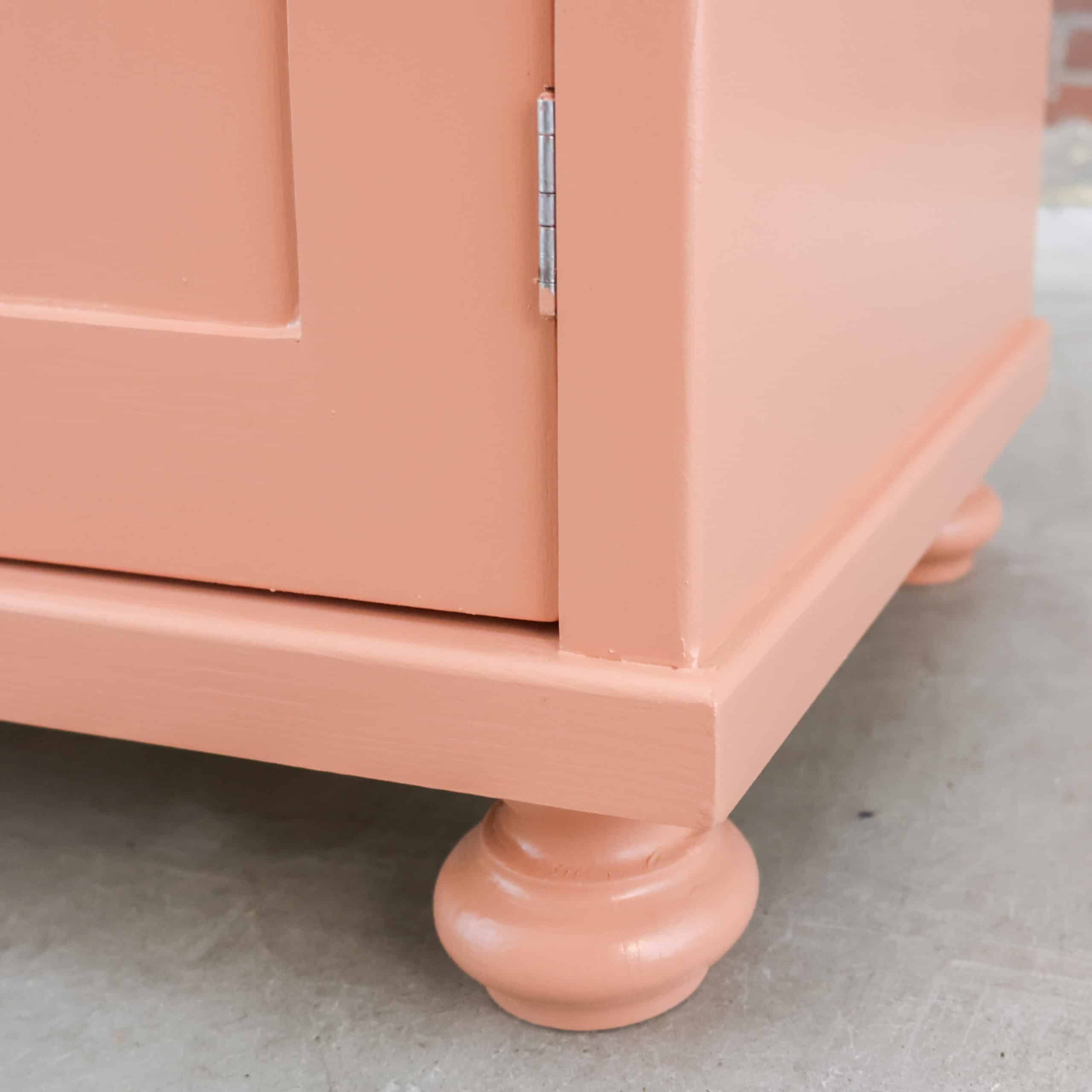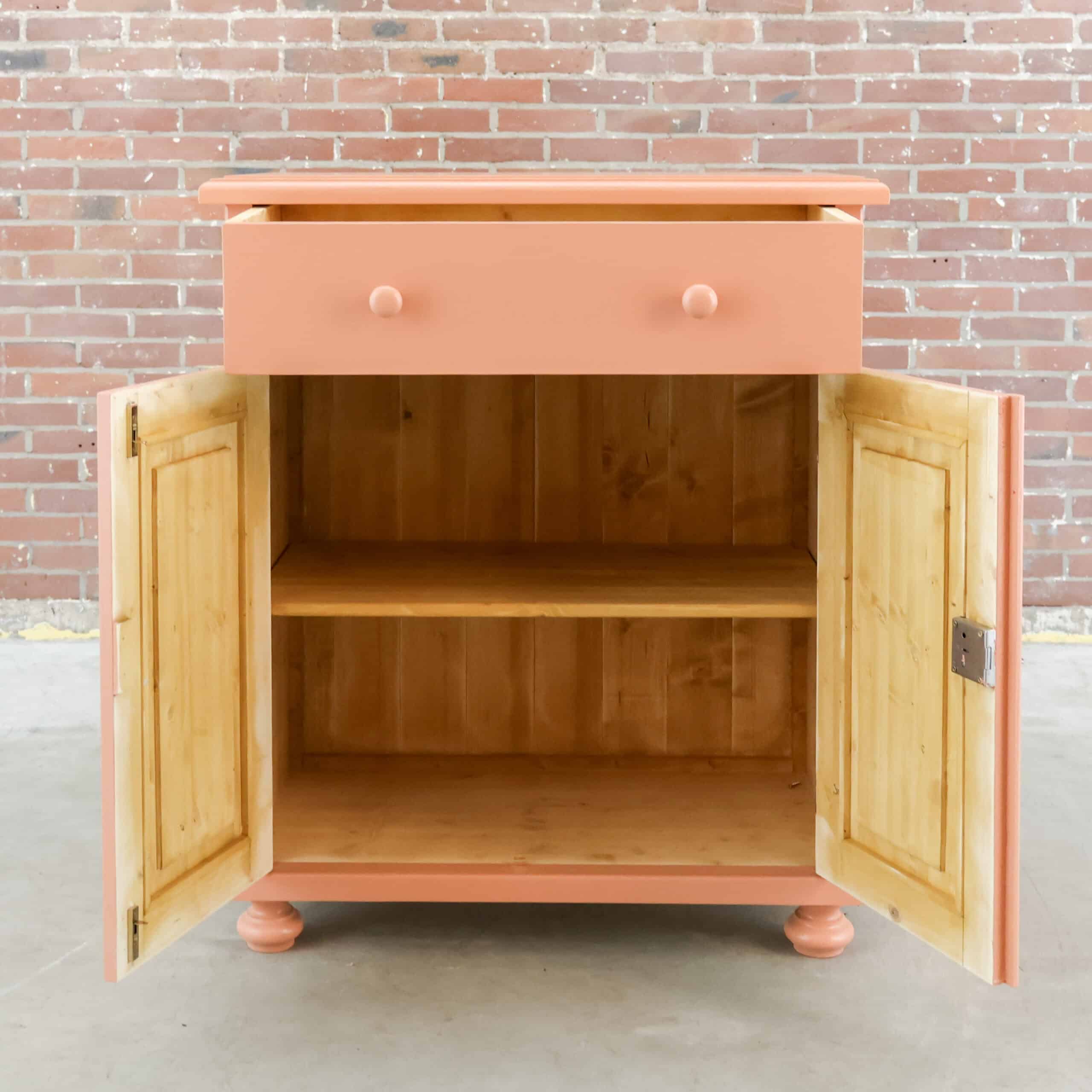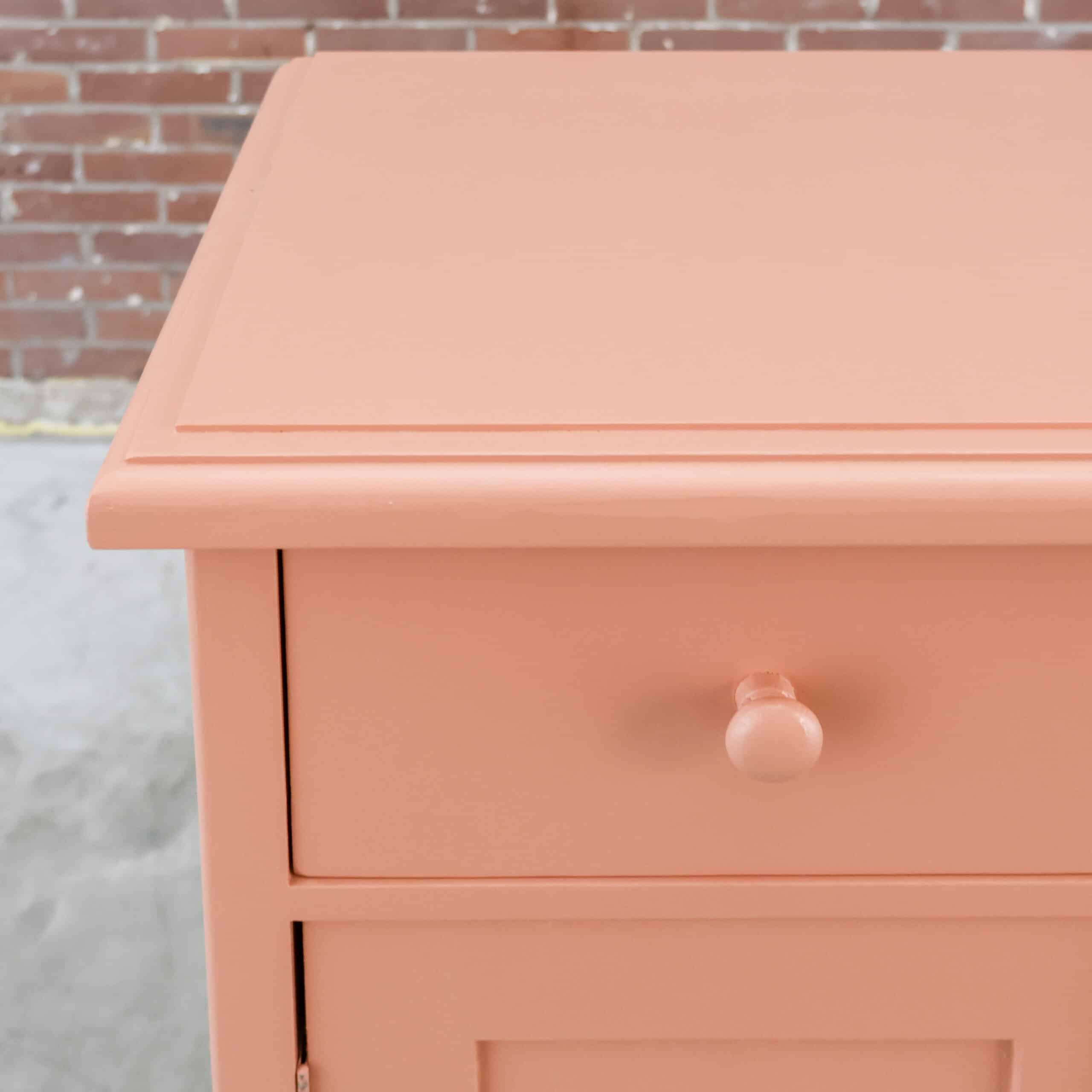 Leuk brocante dressoir met een mooie warme roze kleur! Het kastje heeft een grote la en simpele klassieke look. Handig voor bijvoorbeeld een babykamer.