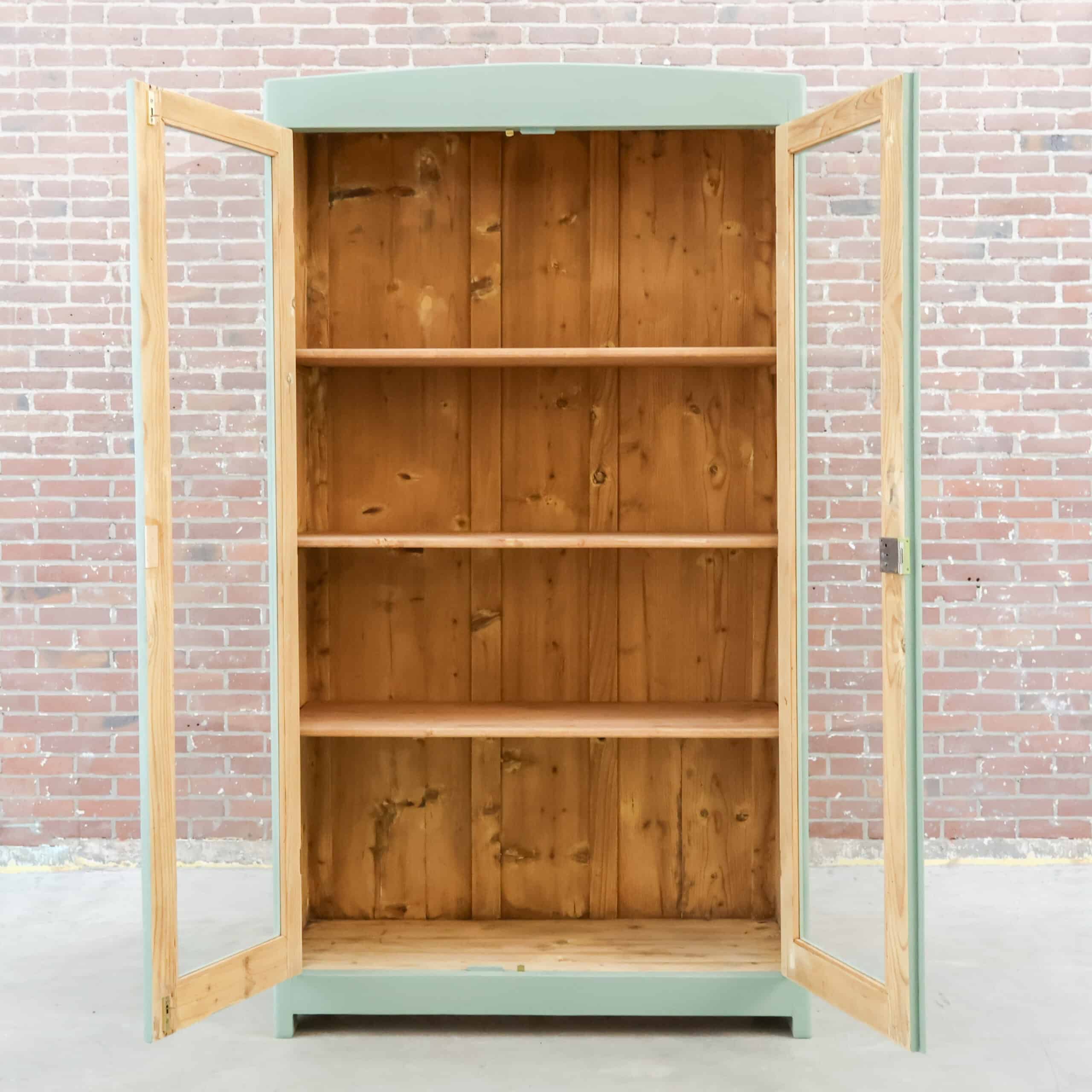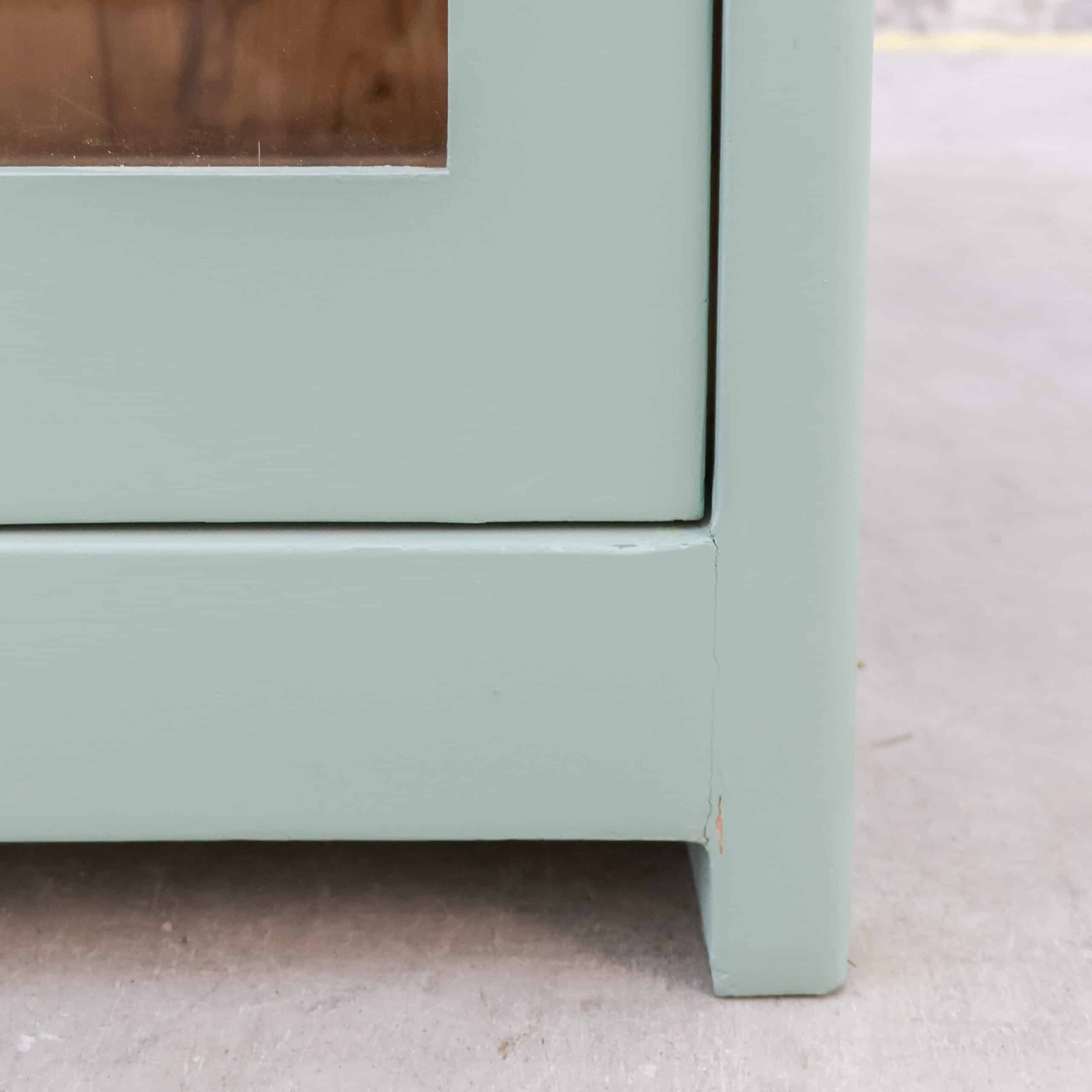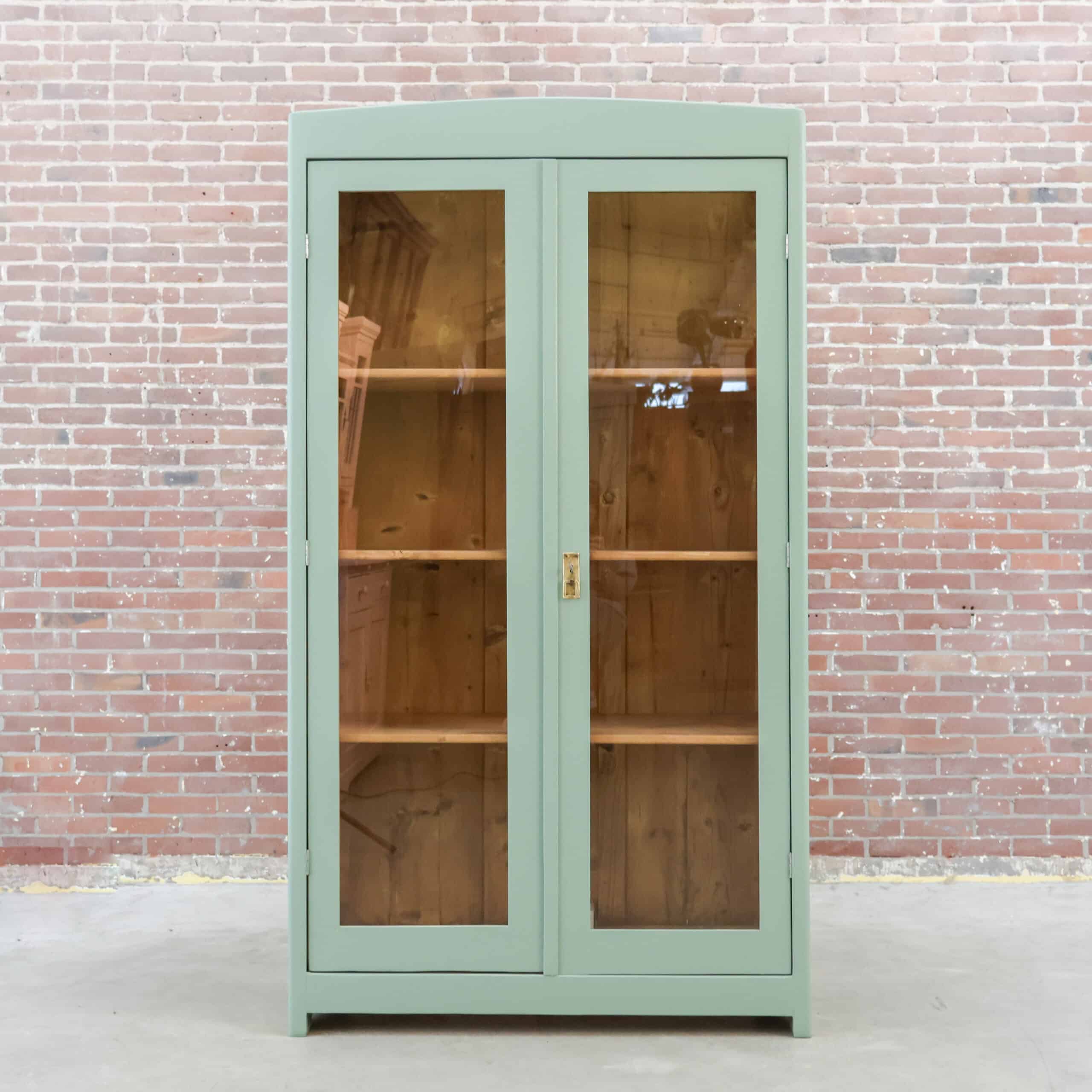 Deze brocante vitrinekast uit Hongarije is volledig opgeknapt en voorzien van een frisse blauwe mint kleur. De kast heeft nieuwe planken, glas en is verder met zorg gerestaureerd. Dankzij de glazen panelen is hij perfect om mooie items in tentoon te stellen. Een stijlvol en praktisch meubel met karakter.