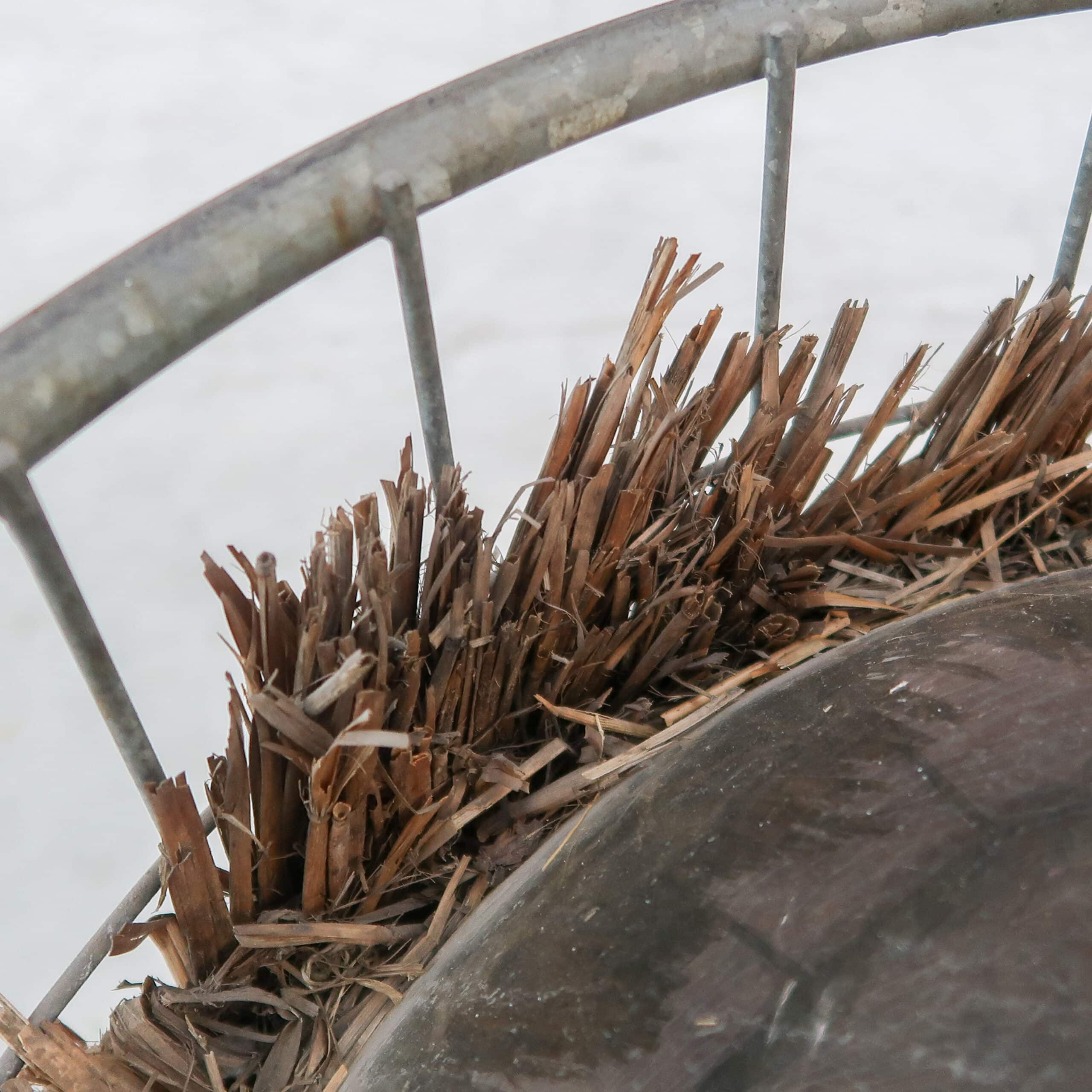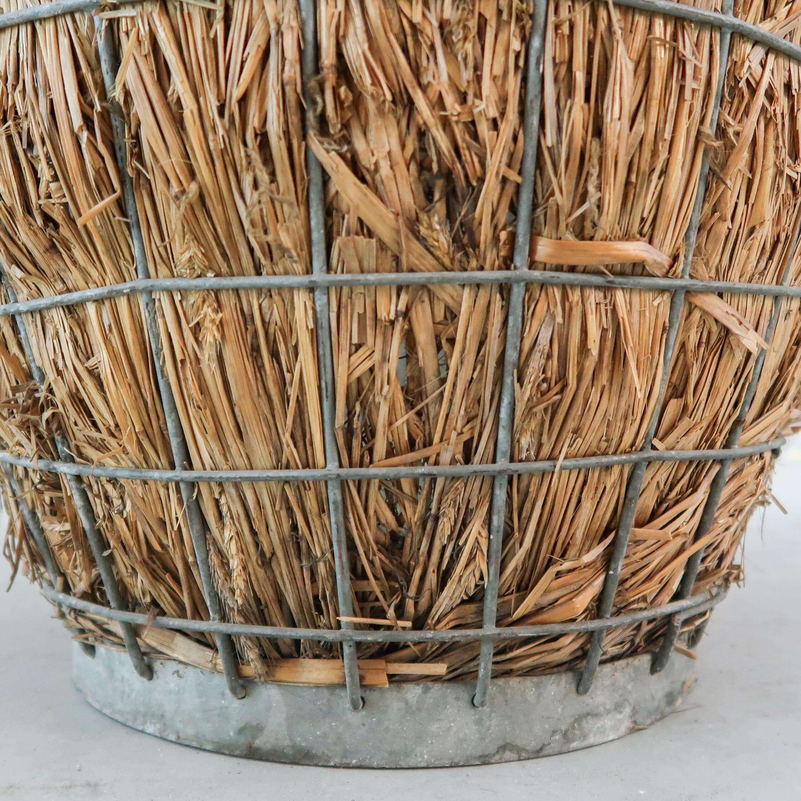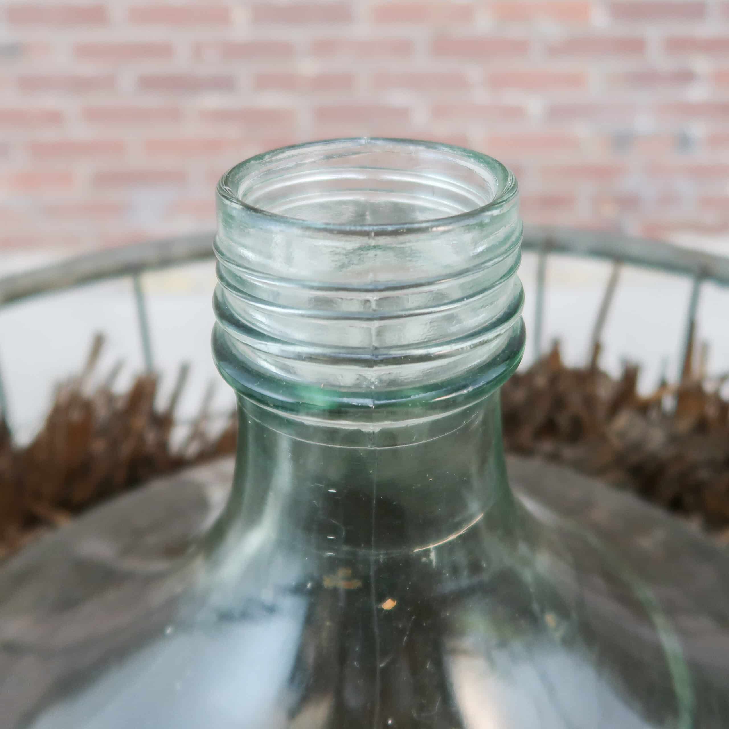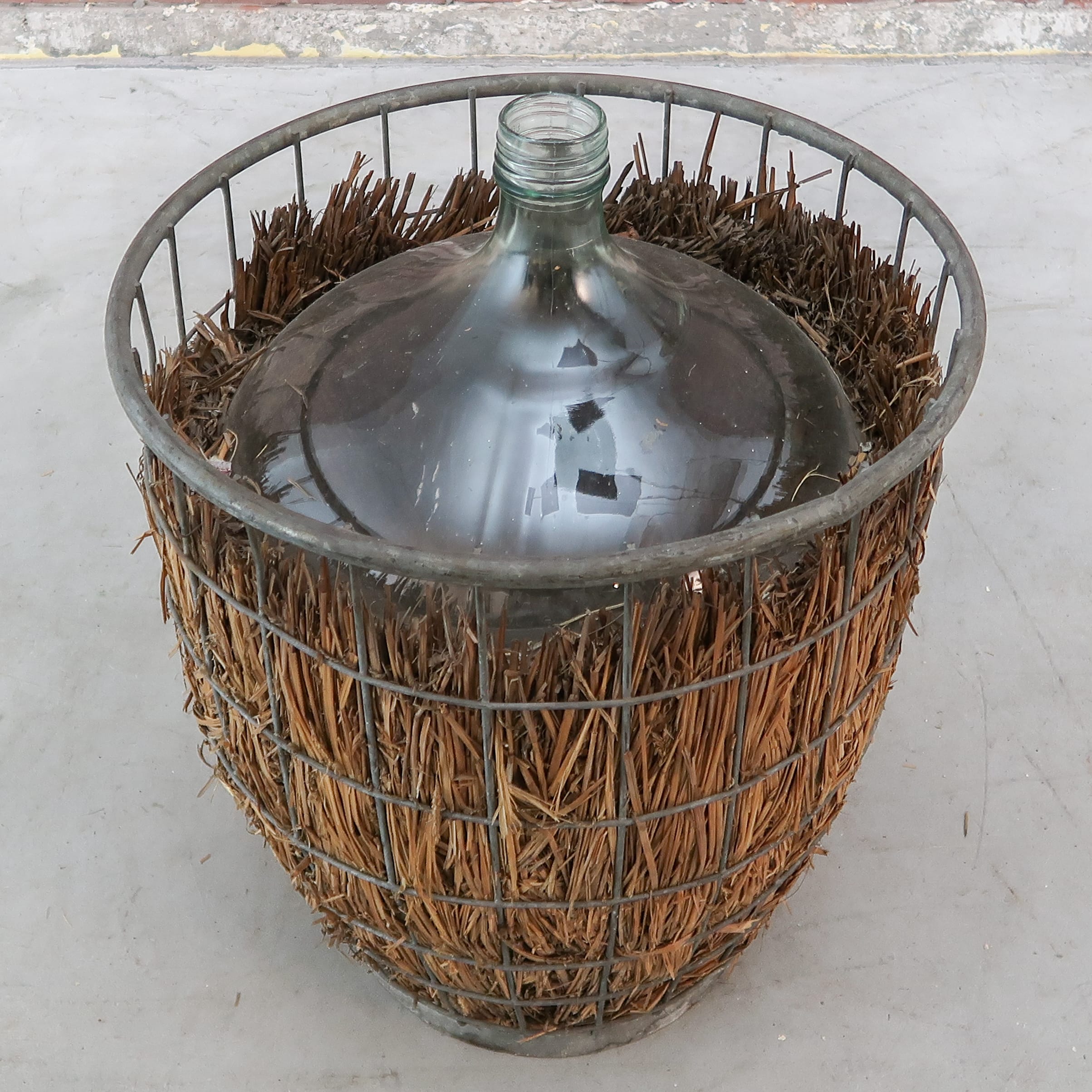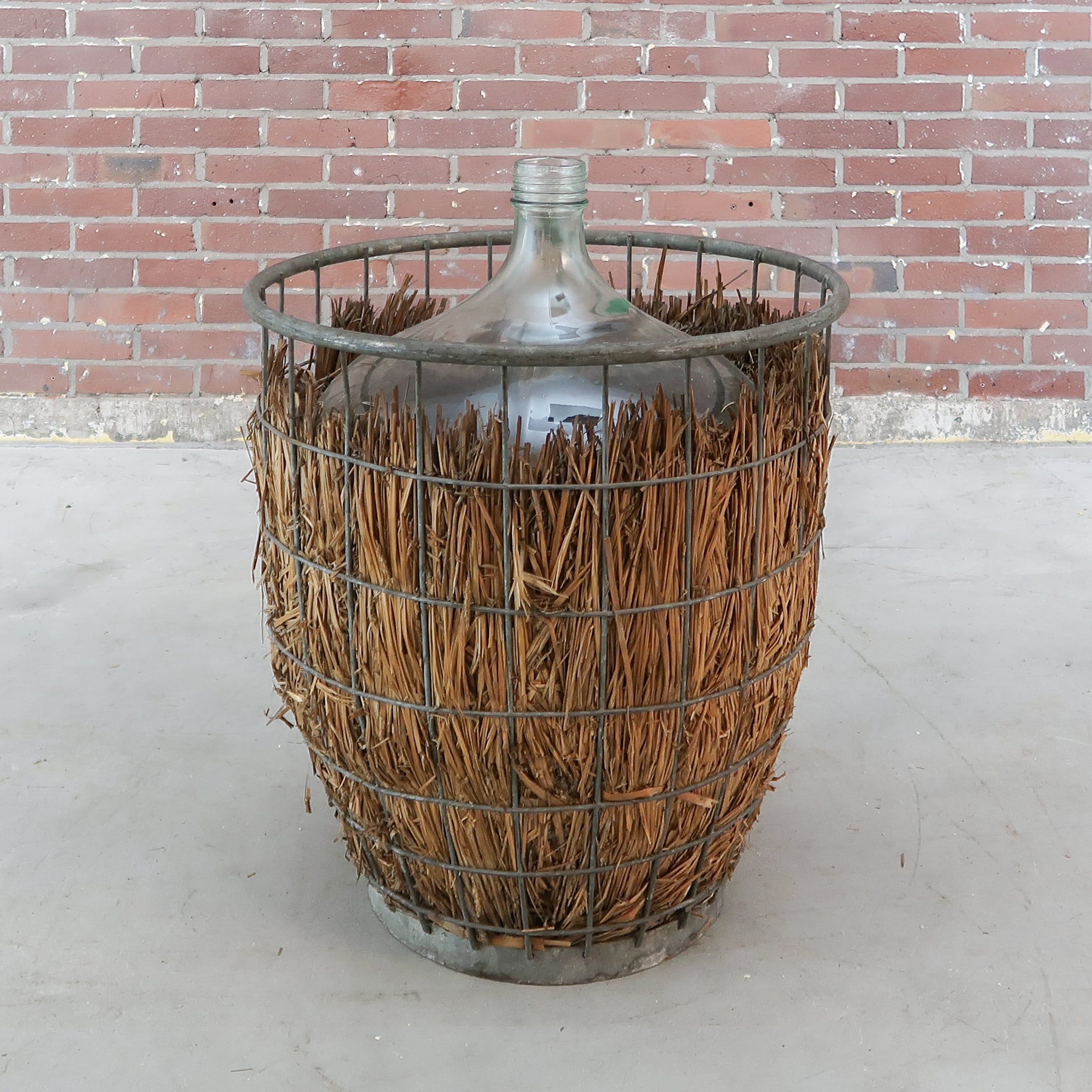 Karaktervolle gistfles uit de eerste helft van de 20e eeuw, met een dikke handgeblazen glazen fles in een originele mand van gevlochten stro en metalen frame. Deze flessen werden vroeger gebruikt voor het gisten en bewaren van wijn of likeur. Perfect als decoratief object, vaas of blikvanger in een landelijke of industriële setting.