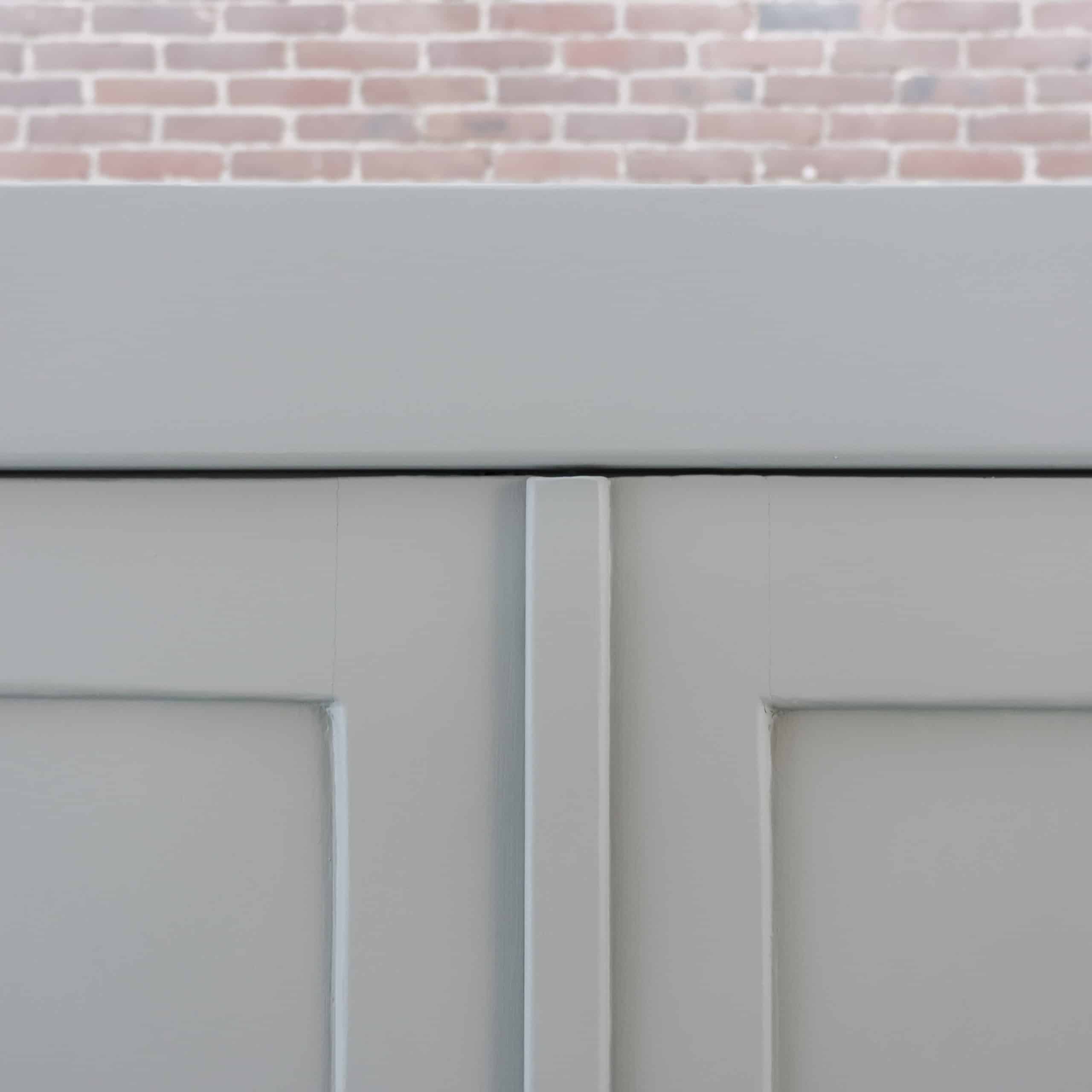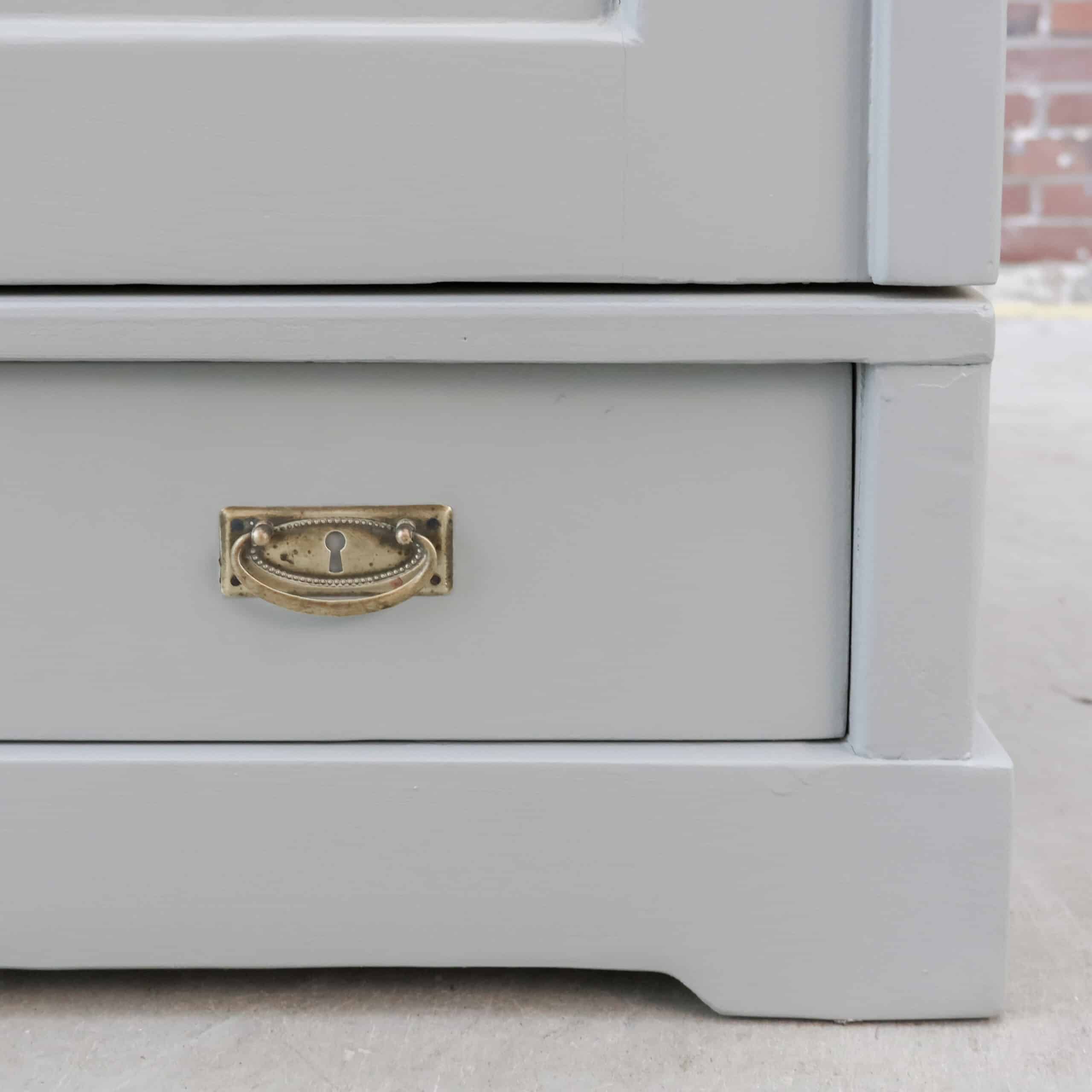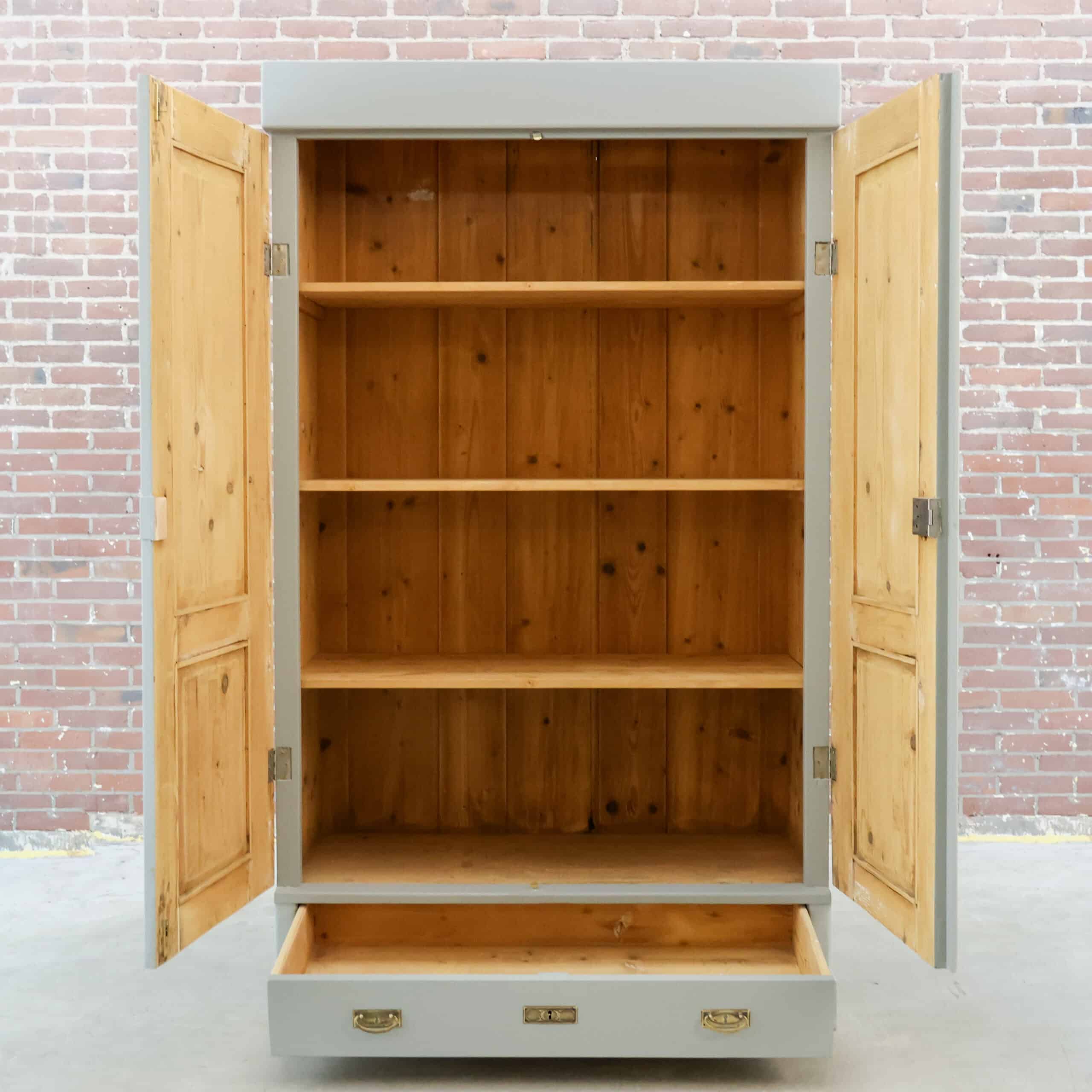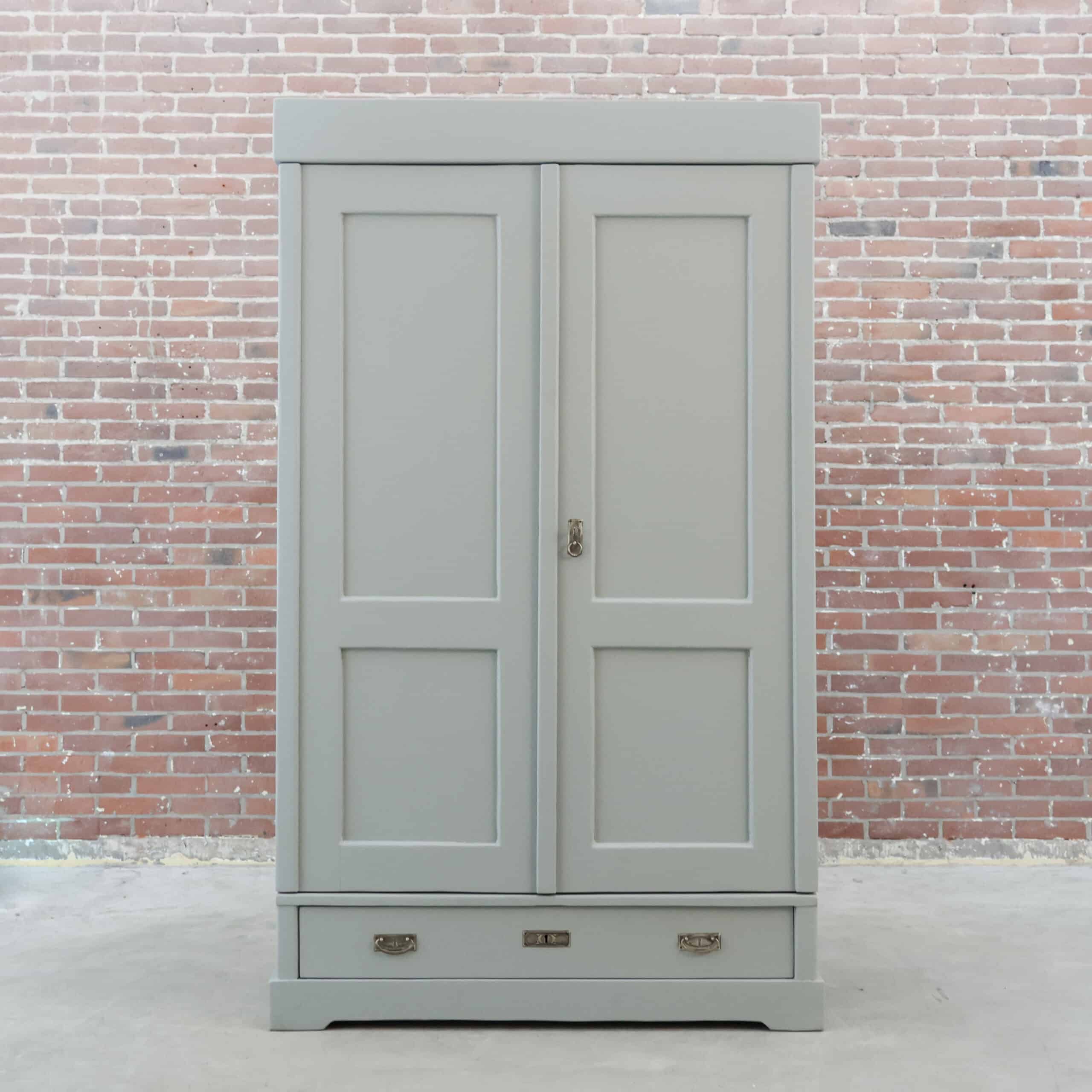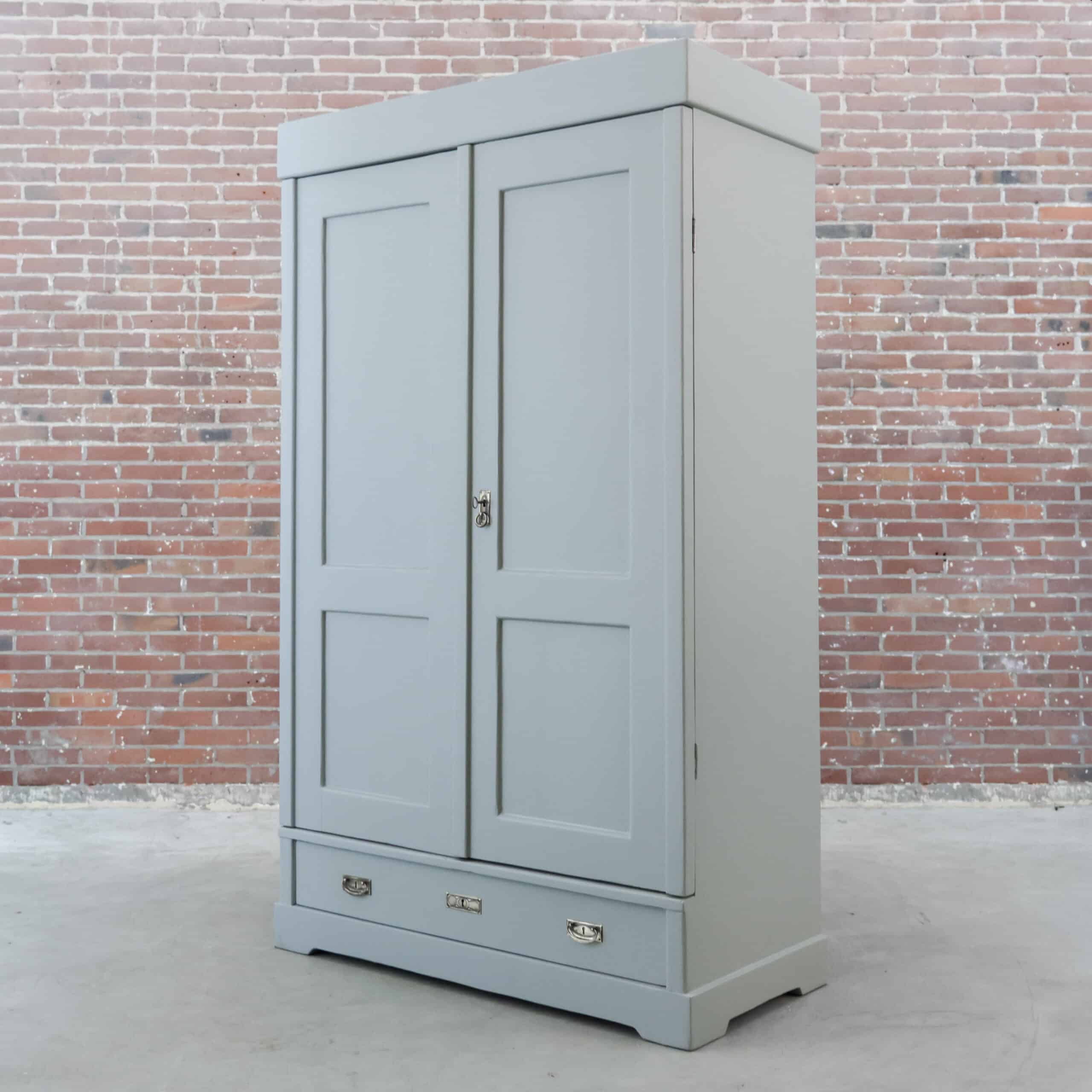Wederom een prachtige grijze kledingkast uit Hongarije! We hebben haar opgeknapt waar nodig, zo heeft ze naast nieuwe planken ook een zacht grijs kleurtje gekregen.