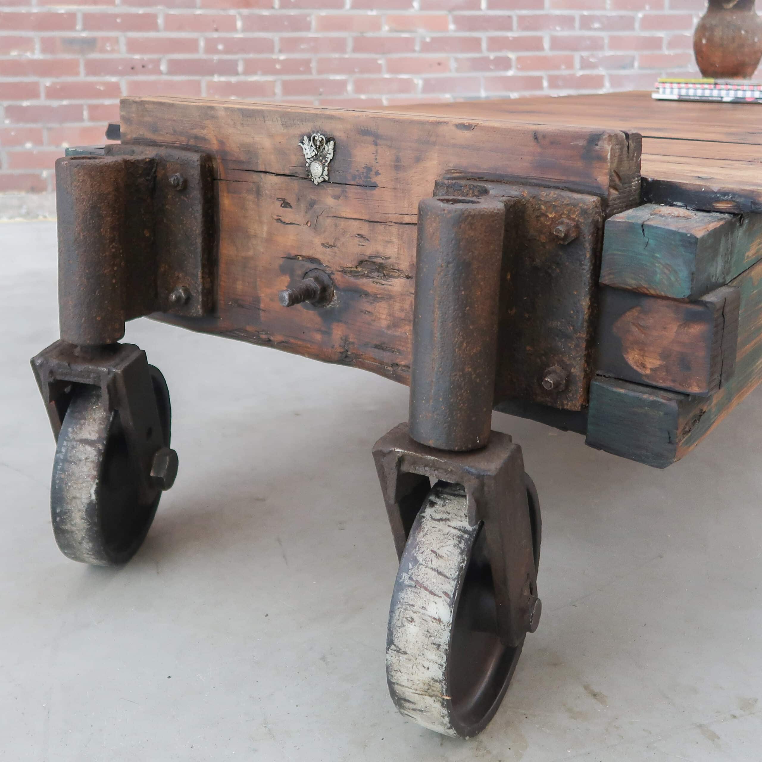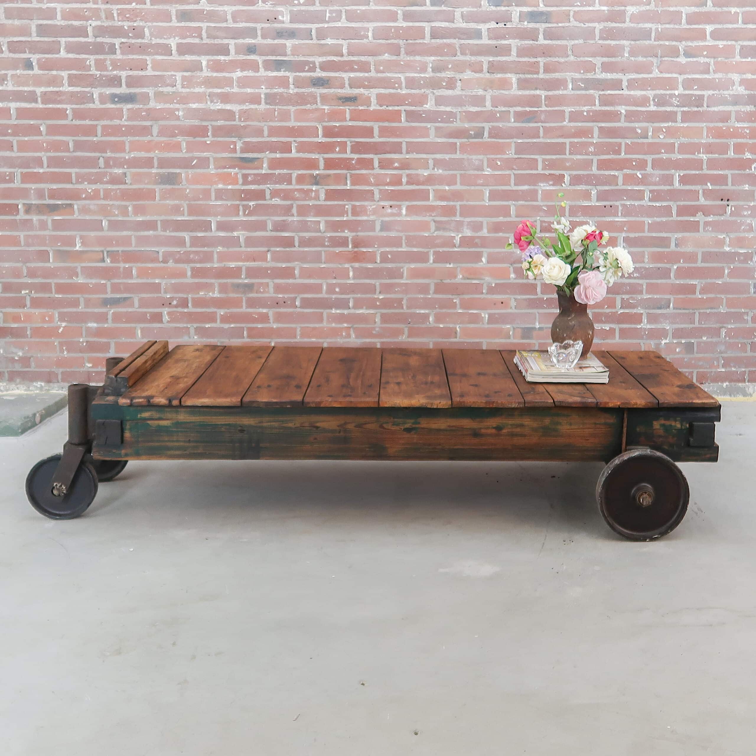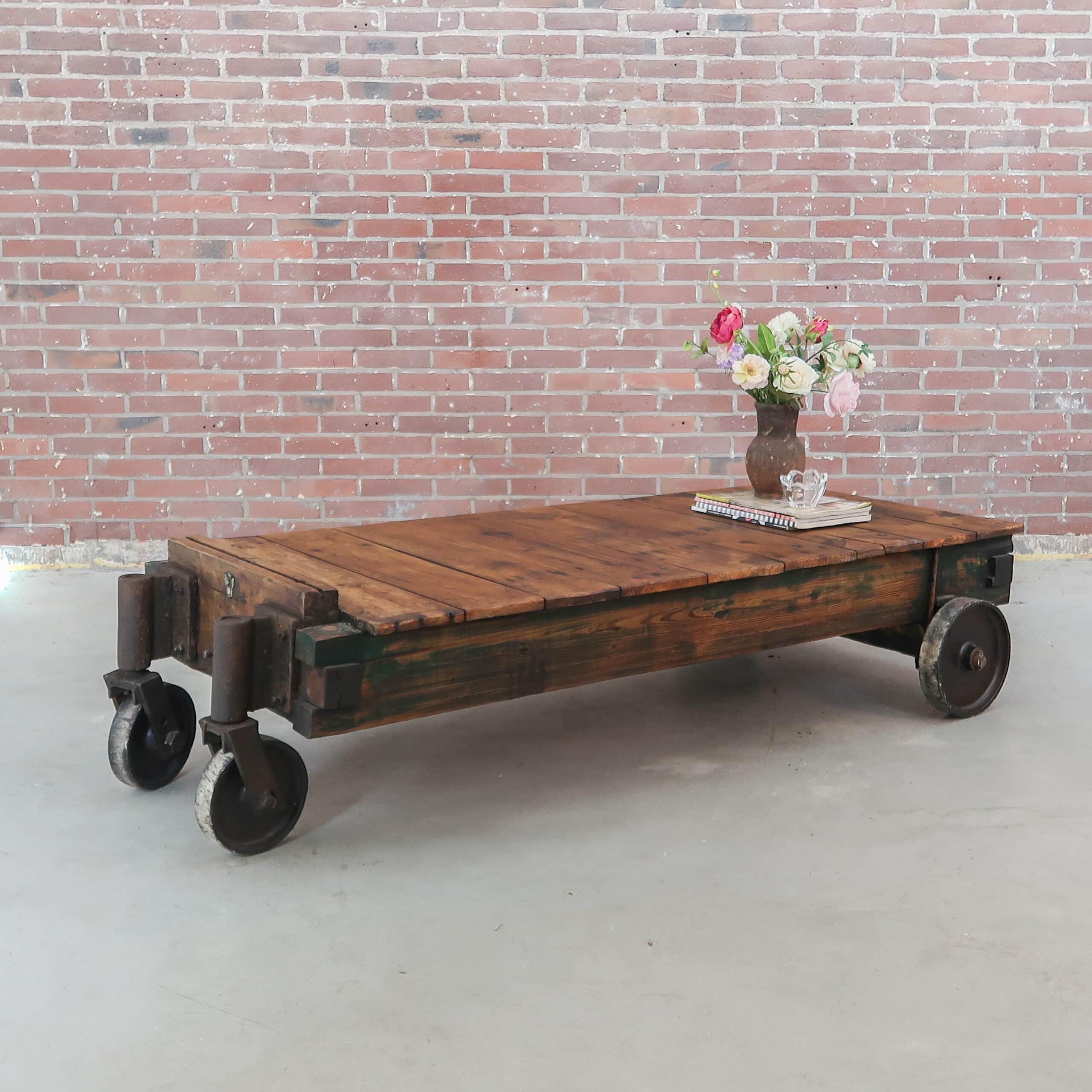 Stoere industriële salontafel met een blad van oud hout en een robuust metalen frame en wielen. Het verweerde hout geeft de tafel karakter en warmte, terwijl de stalen rand en wielen zorgen voor een stoere industriële look. Perfect te combineren in zowel een modern loft-interieur als een sfeervol vintage woonstijl. Een uniek meubelstuk met een prachtige mix van doorleefd en industrieel.