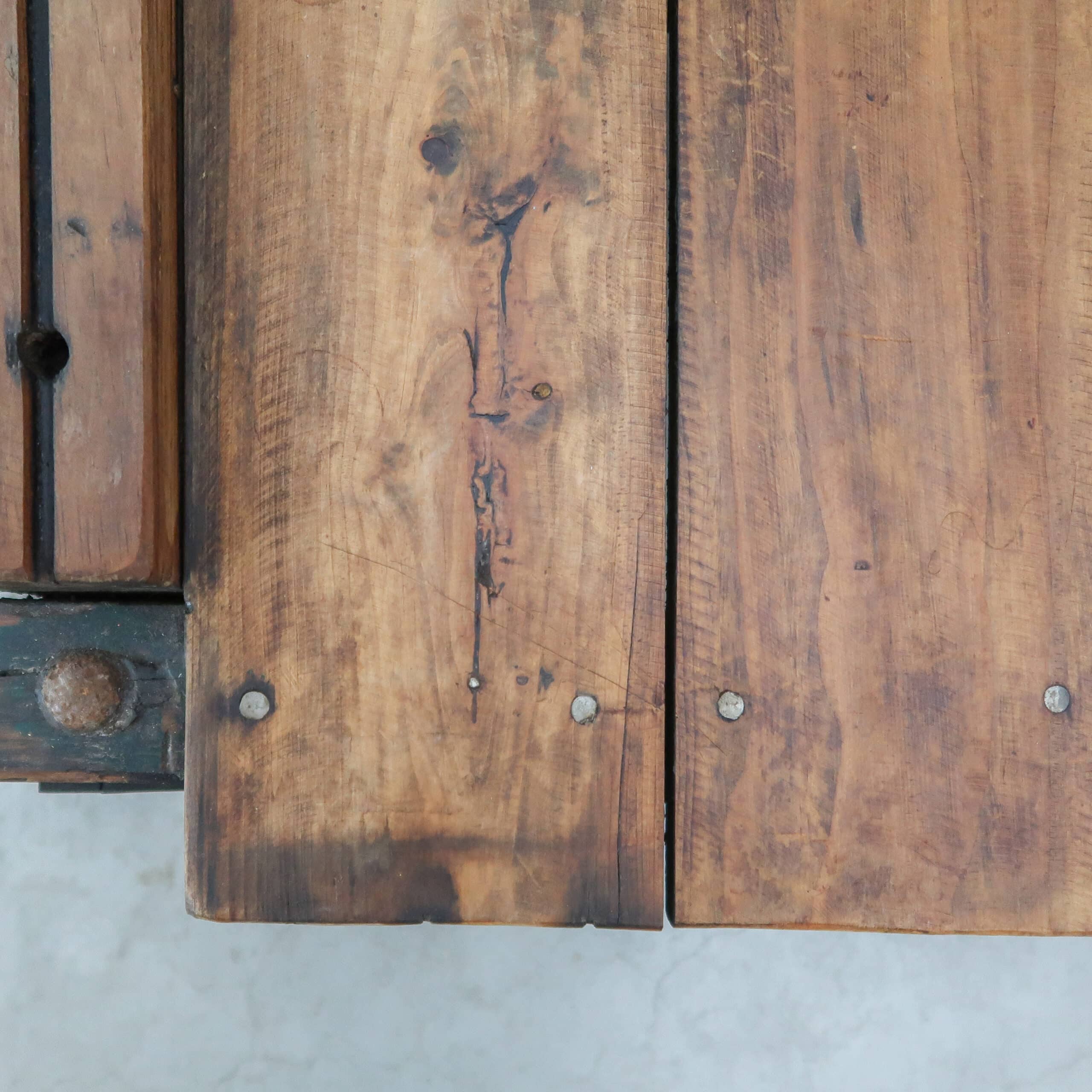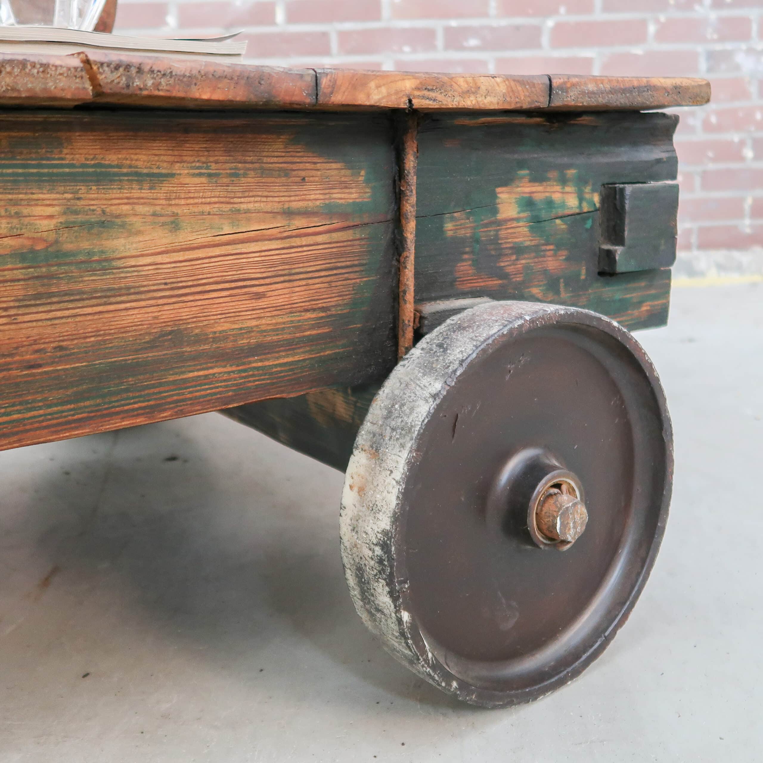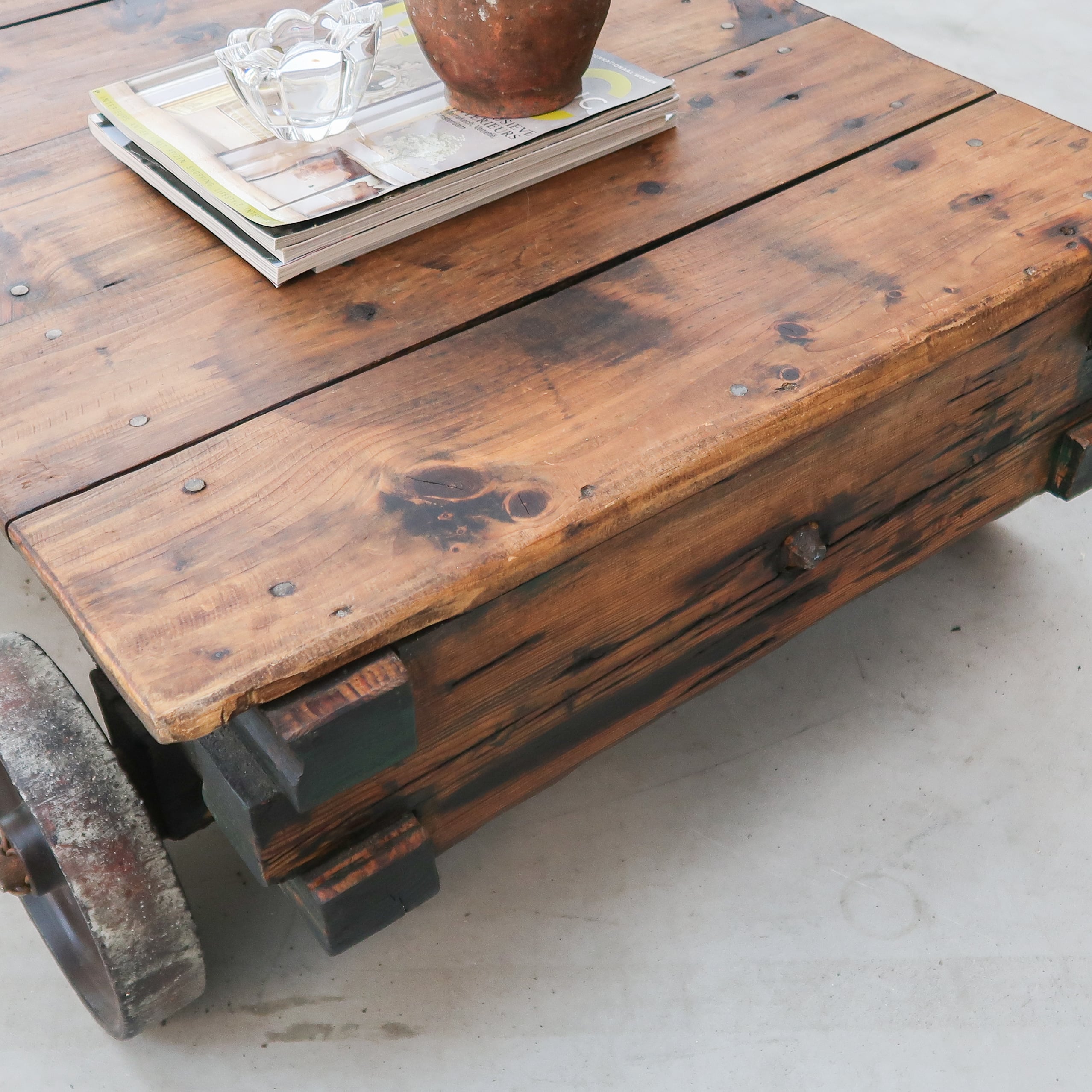 Stoere industriële salontafel met een blad van oud hout en een robuust metalen frame en wielen. Het verweerde hout geeft de tafel karakter en warmte, terwijl de stalen rand en wielen zorgen voor een stoere industriële look. Perfect te combineren in zowel een modern loft-interieur als een sfeervol vintage woonstijl. Een uniek meubelstuk met een prachtige mix van doorleefd en industrieel.