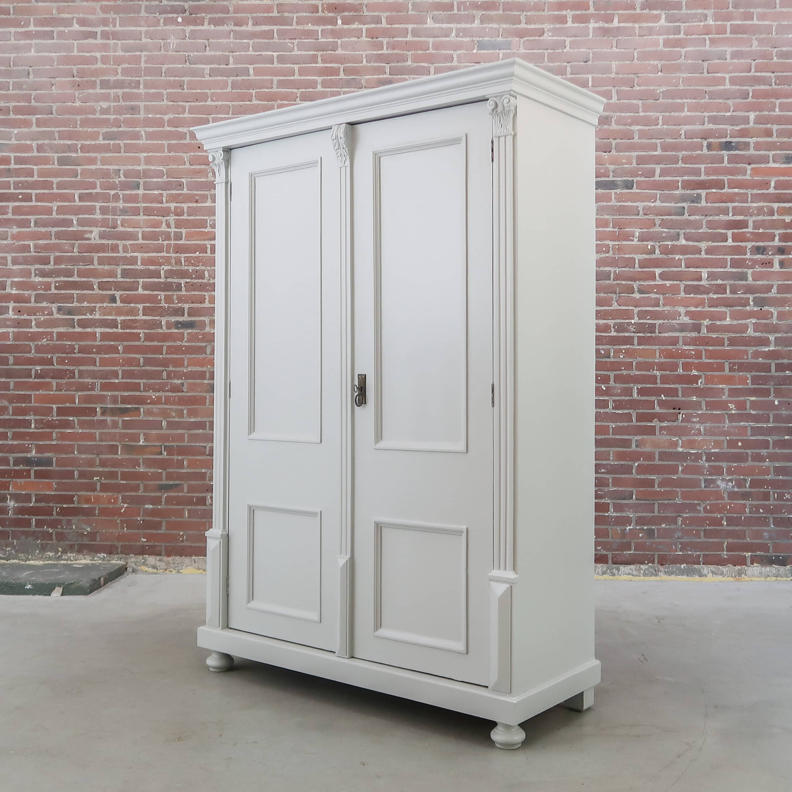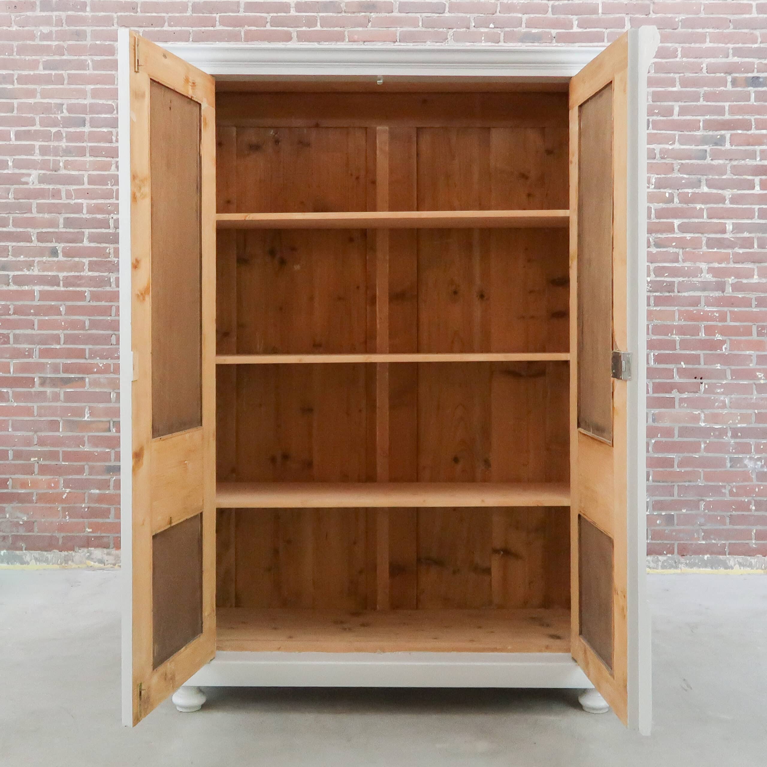 Wederom een prachtige lichtgrijze kledingkast uit Hongarije! We hebben haar opgeknapt waar nodig, zo heeft ze naast nieuwe planken ook een zacht grijs kleurtje gekregen.