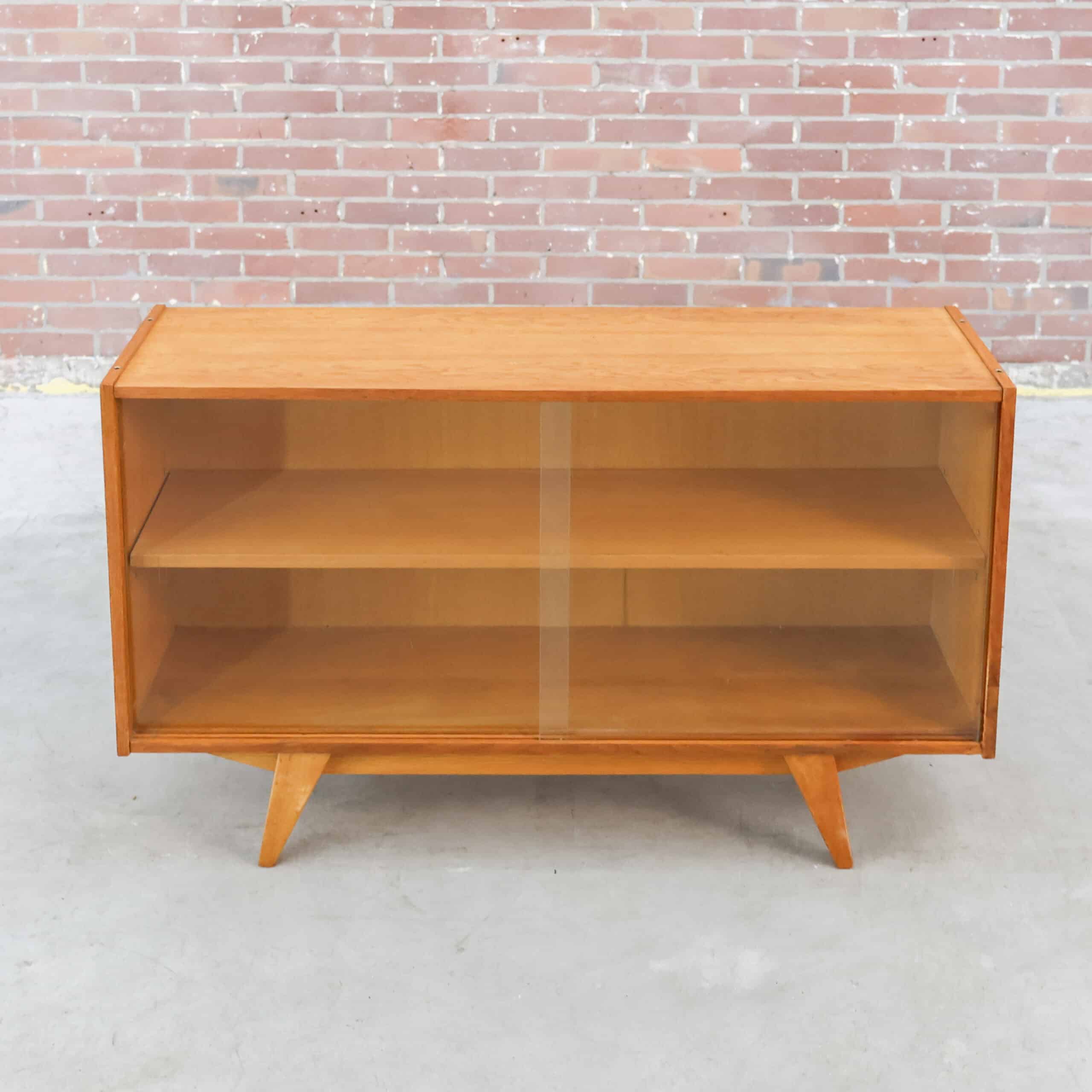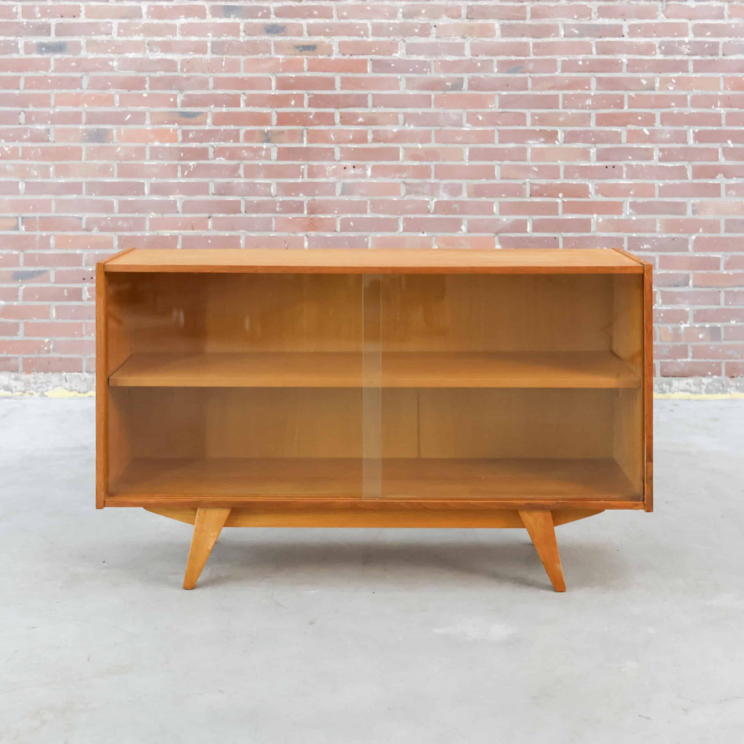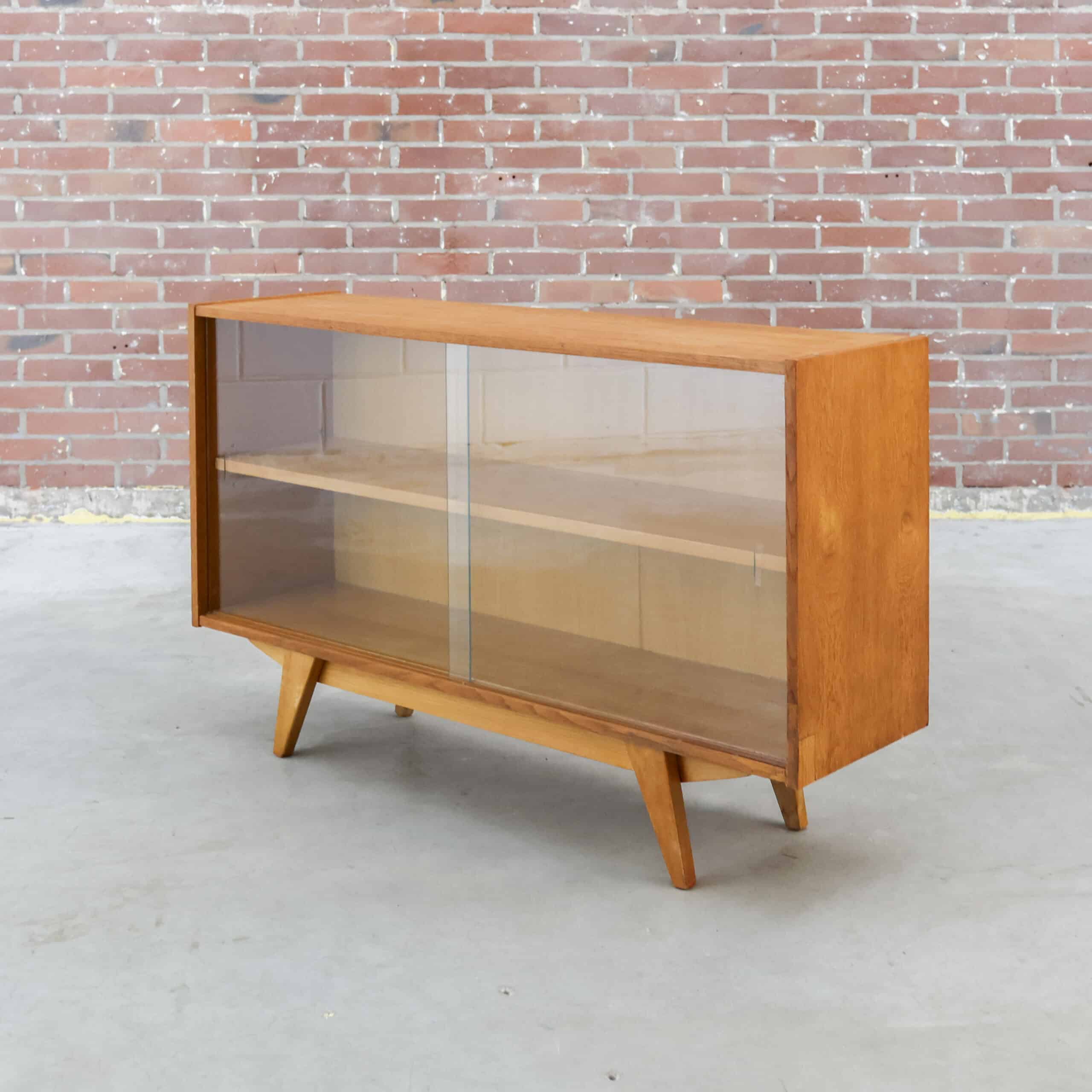 Dit is een mid-century vitrinekast, het model U-452 (of een vergelijkbare variant) ontworpen door de Tsjechische ontwerper Jiří Jiroutek rond 1960 voor de fabrikant Interier Praha.