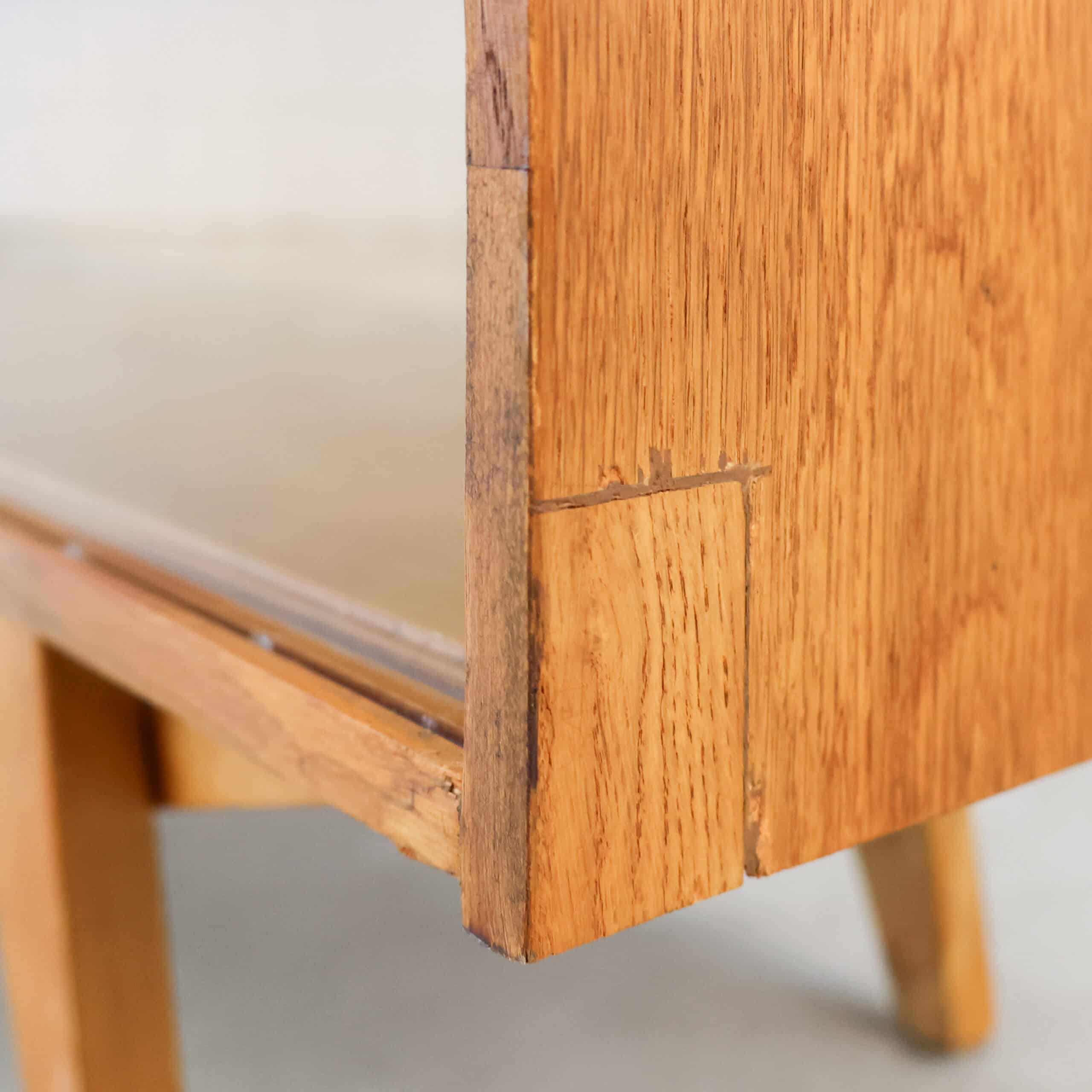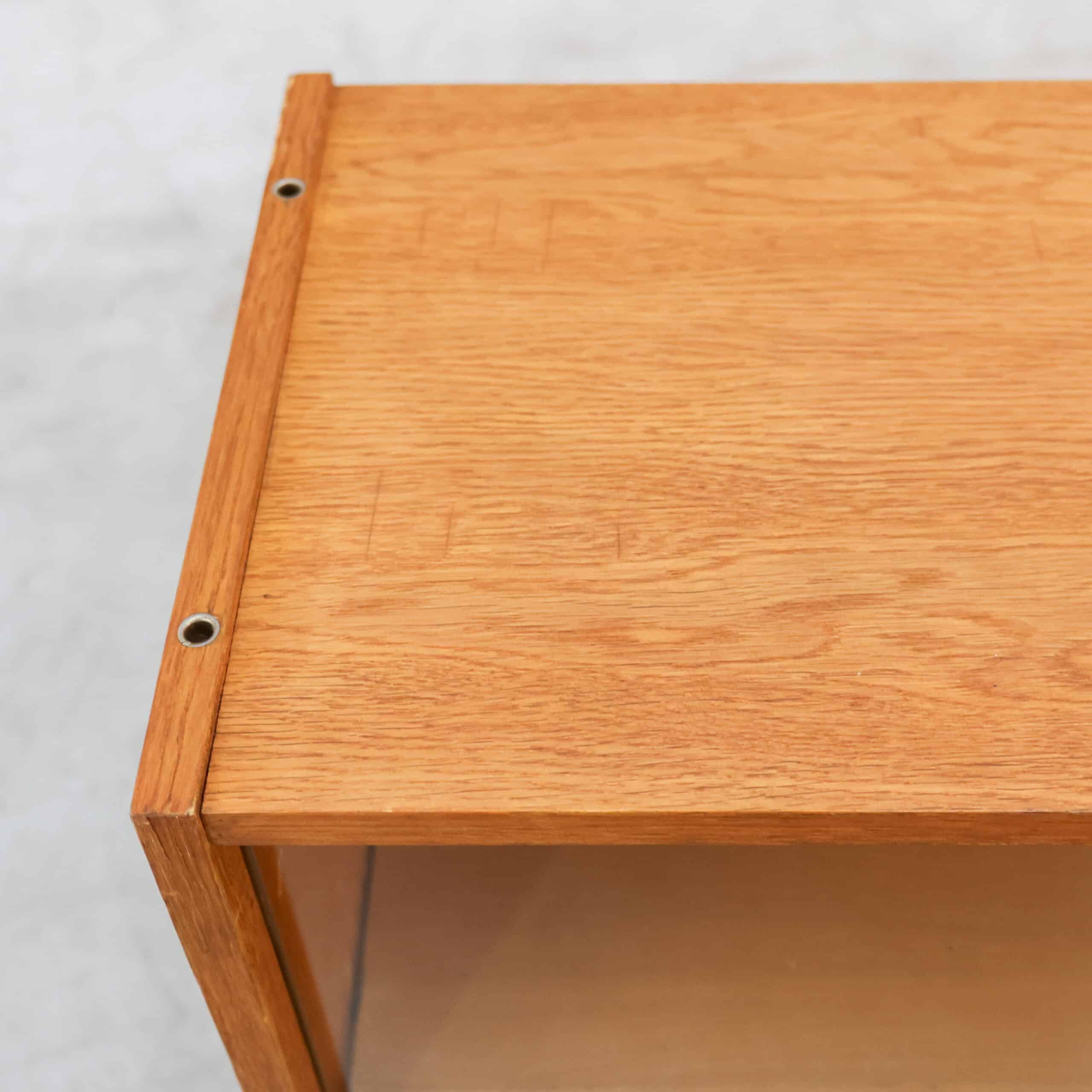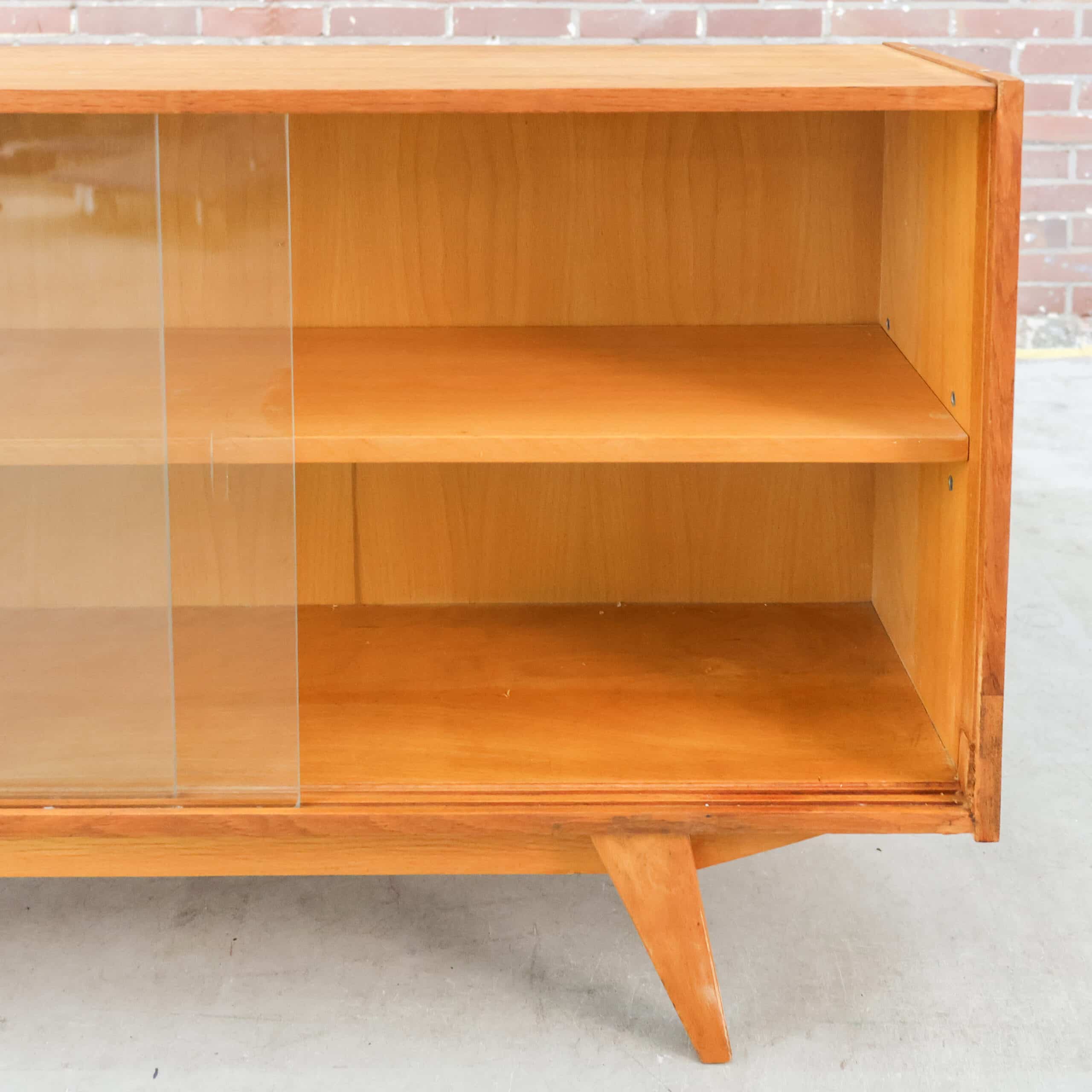 Dit is een mid-century vitrinekast, het model U-452 (of een vergelijkbare variant) ontworpen door de Tsjechische ontwerper Jiří Jiroutek rond 1960 voor de fabrikant Interier Praha.