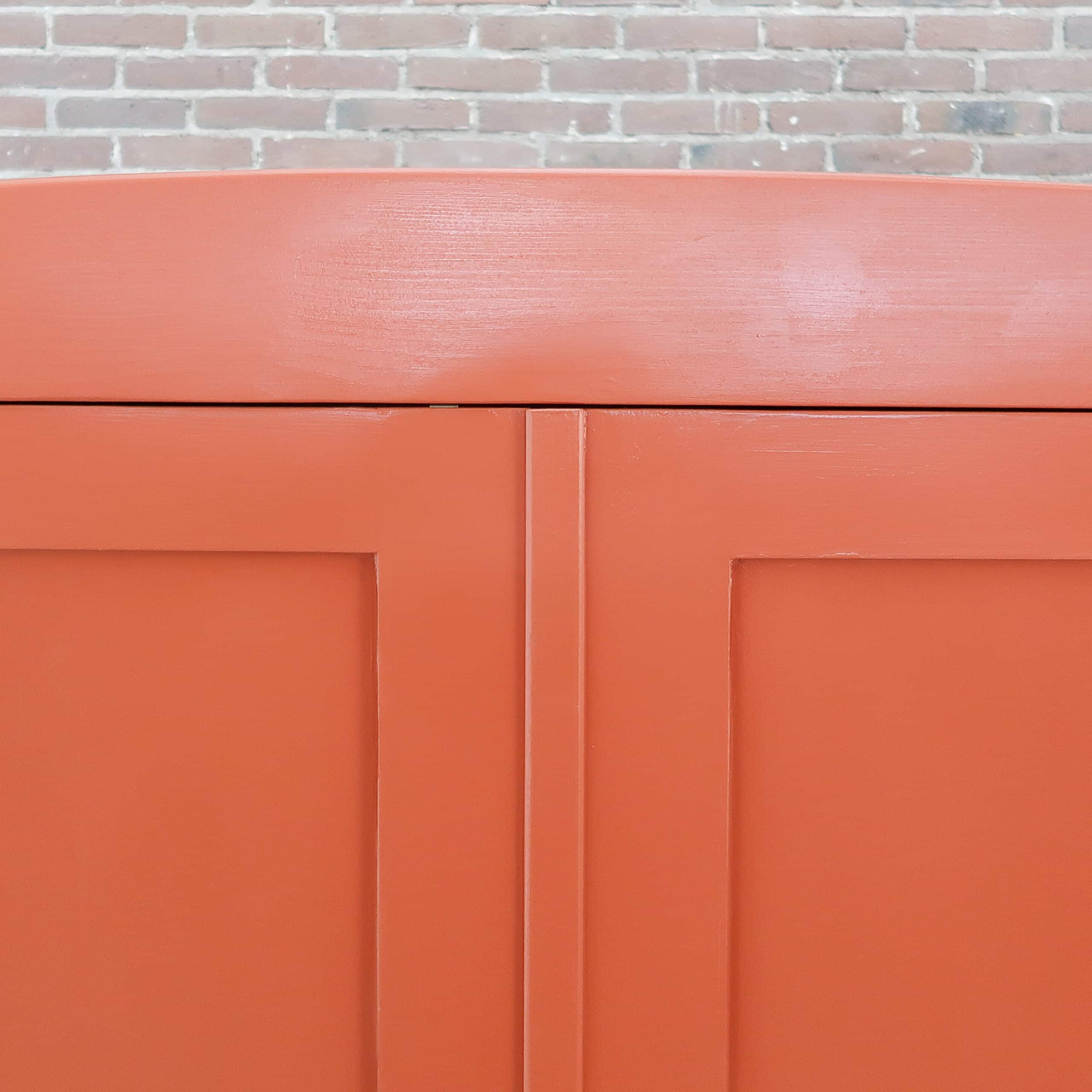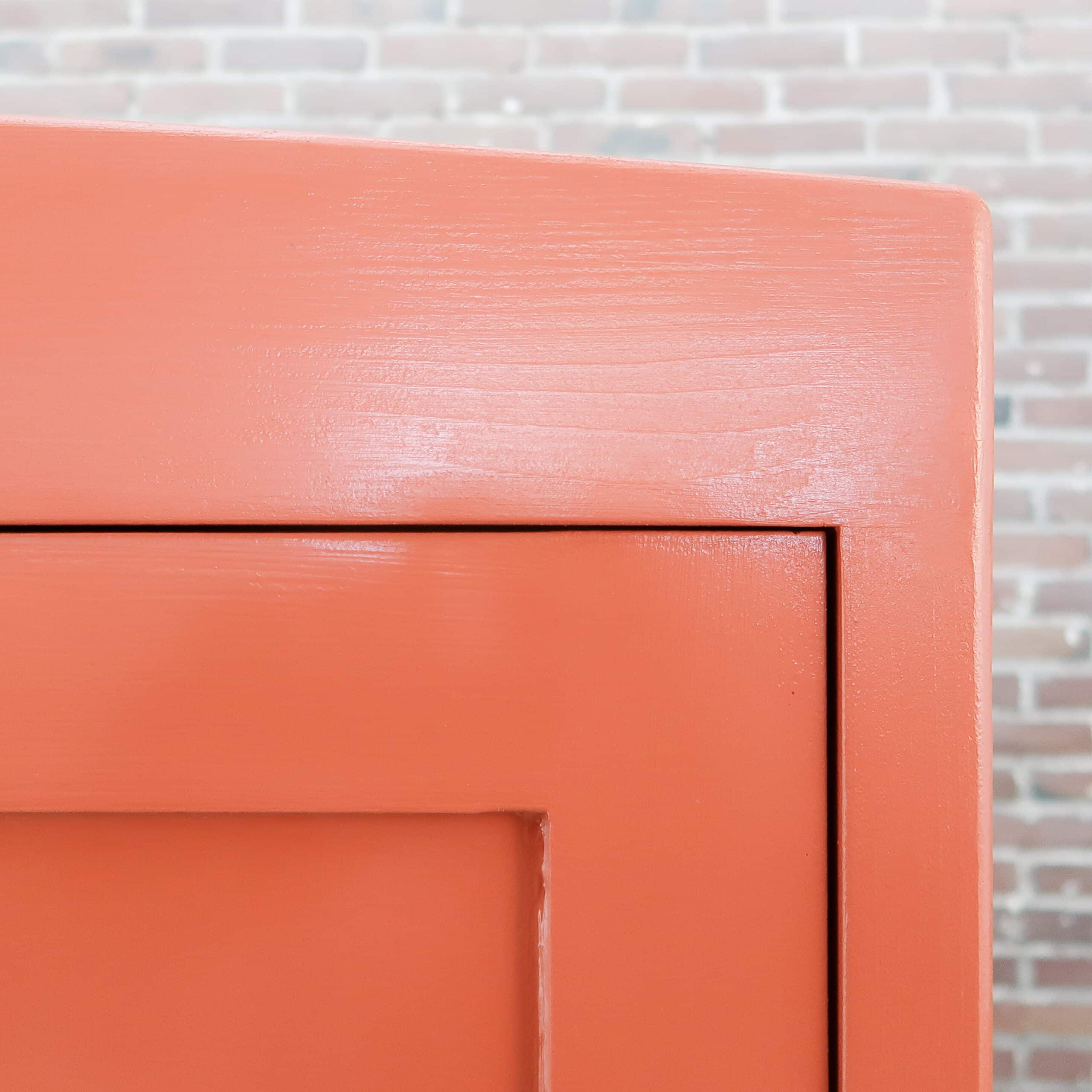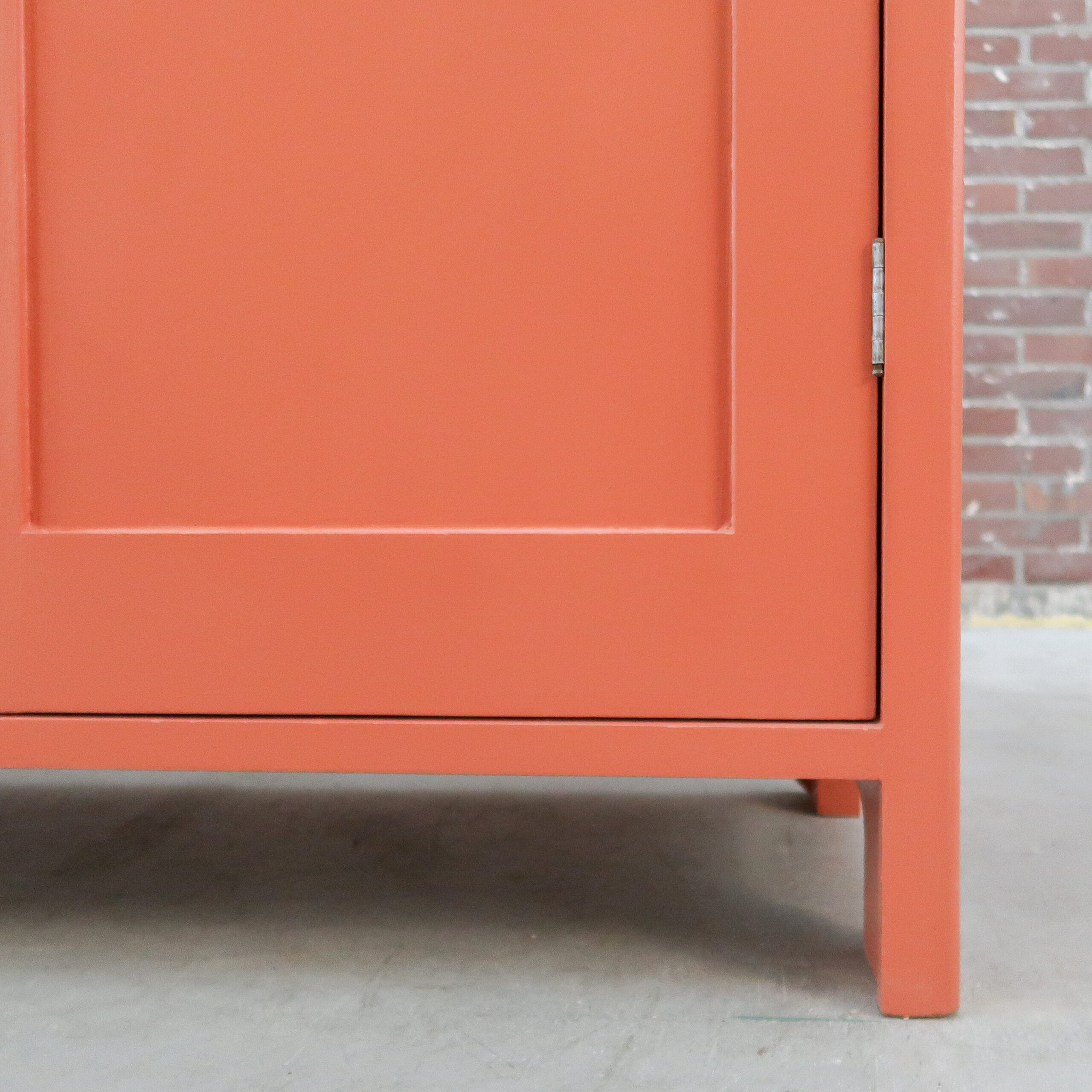 Deze terracotta oranje linnenkast hebben we opgespeurd in Hongarije en opgeknapt waar nodig. Zo heeft ze oa nieuwe planken en een bijzonder mooie kleur gekregen.