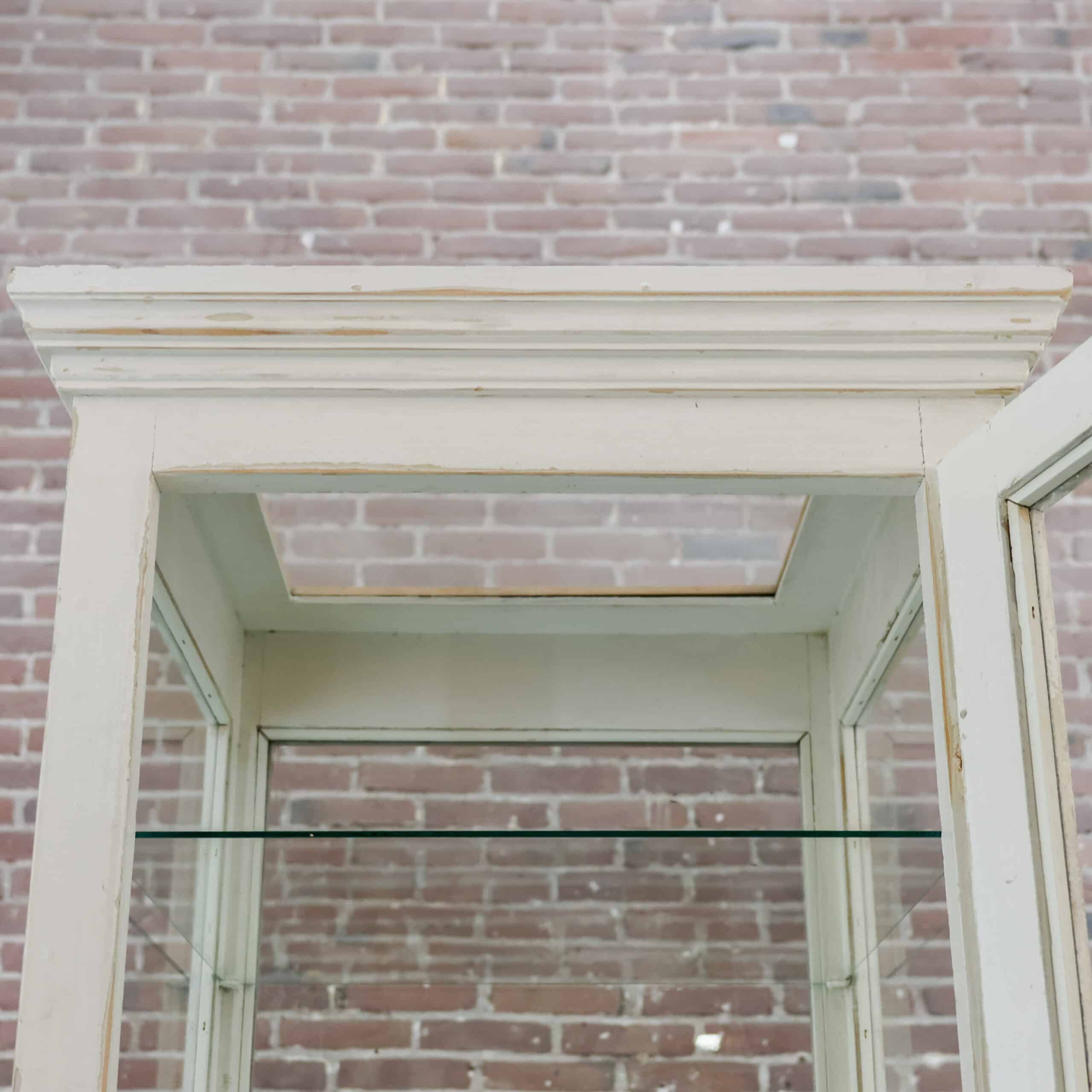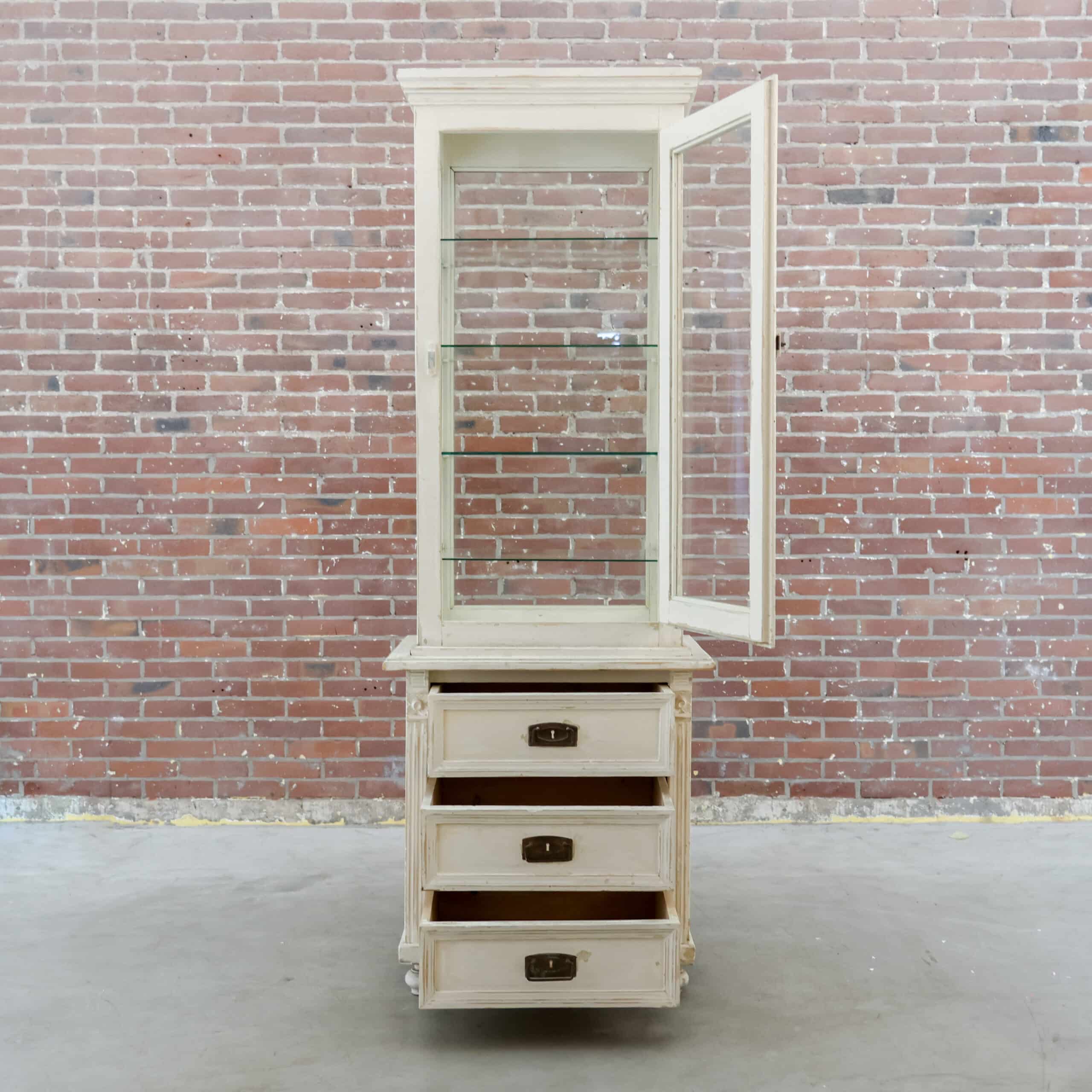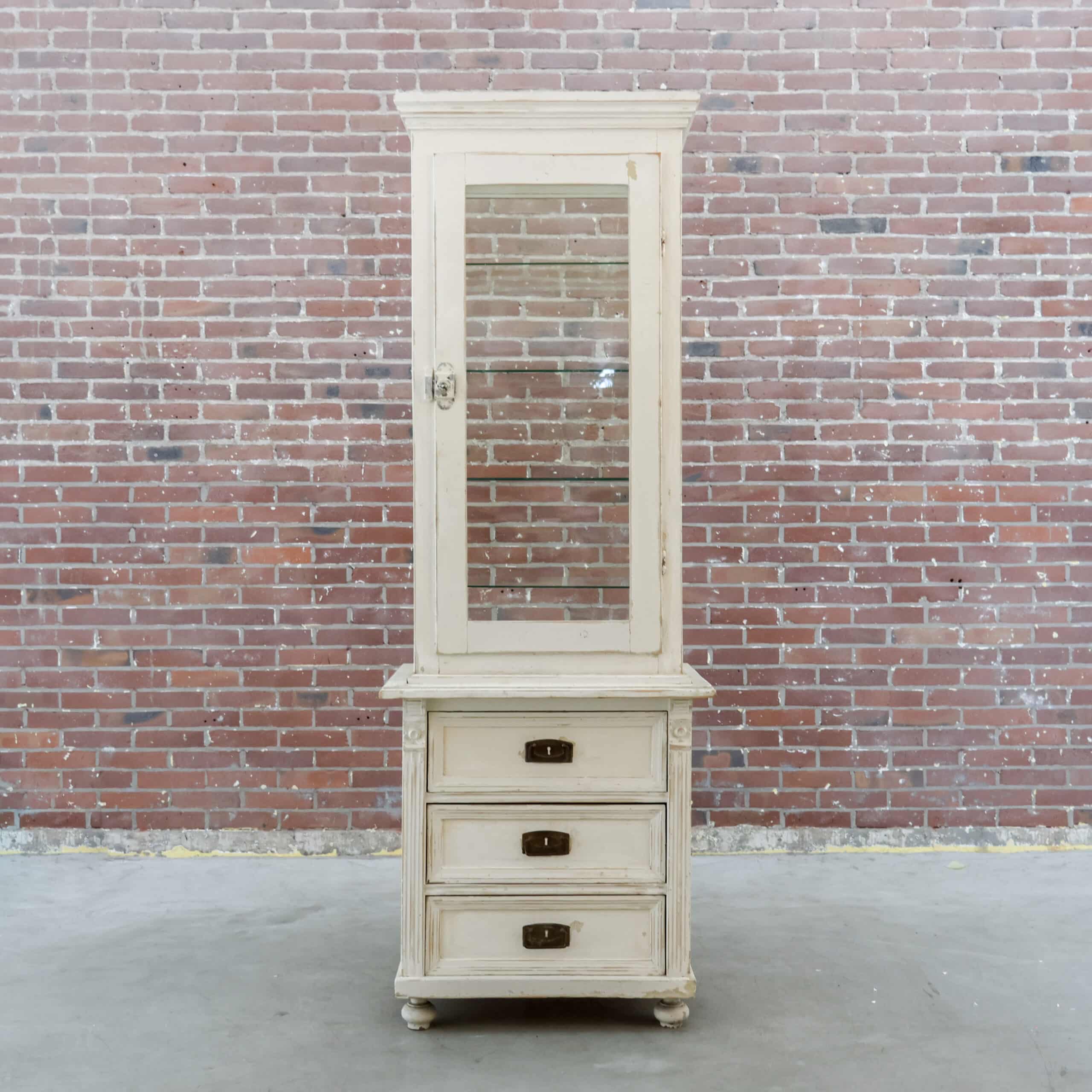 Charmante vintage dokterskast/ vitrinekast in een zacht verweerde witte tint met prachtige doorleefde details. De glazen bovenkast met legplanken is perfect om servies, glaswerk of verzamelingen te tonen, terwijl de drie lades onderin zorgen voor praktische opbergruimte. De verf vertoont hier en daar slijtage, wat bijdraagt aan de authentieke, warme uitstraling van dit unieke stuk met een knipoog naar oude dokters- en apothekersinterieurs.