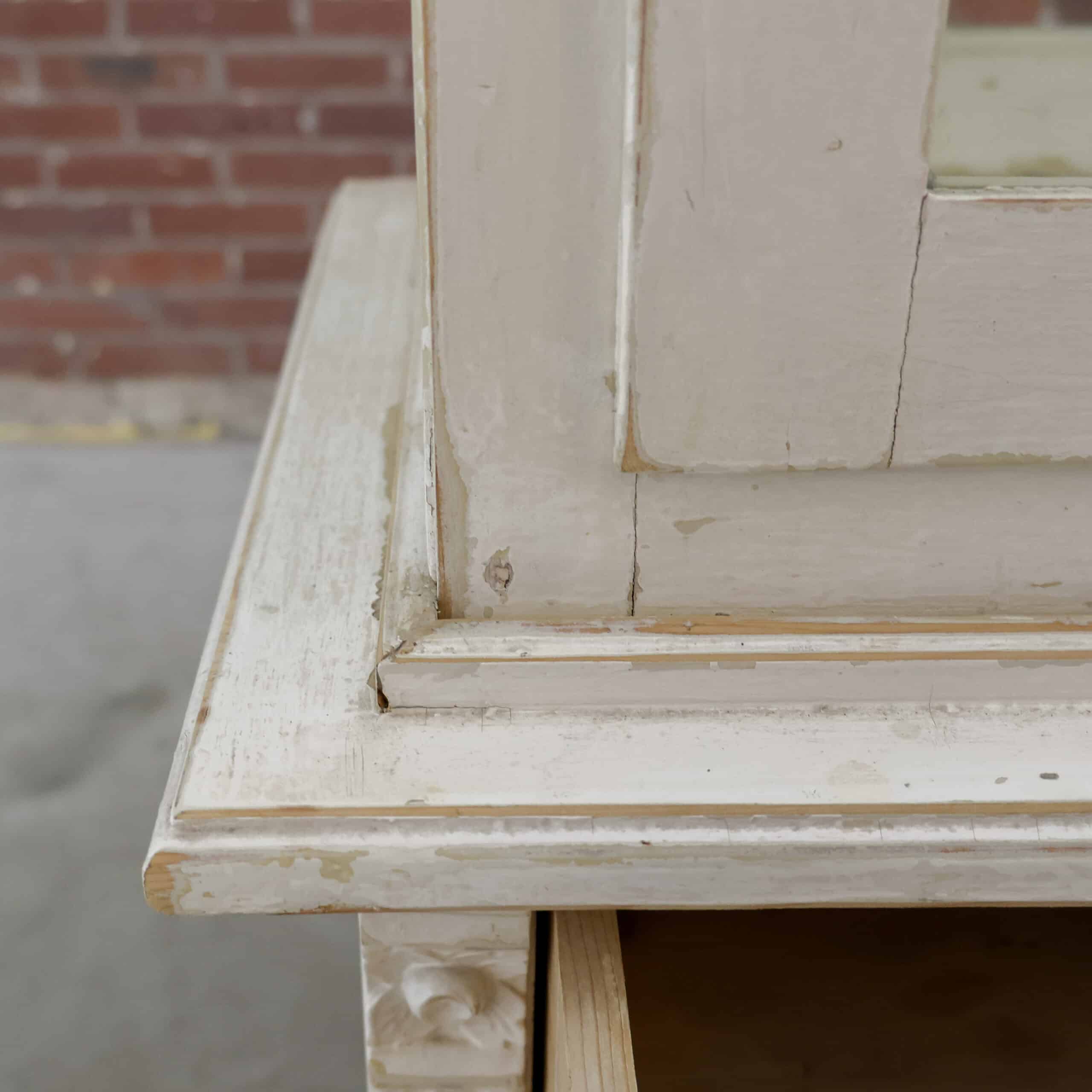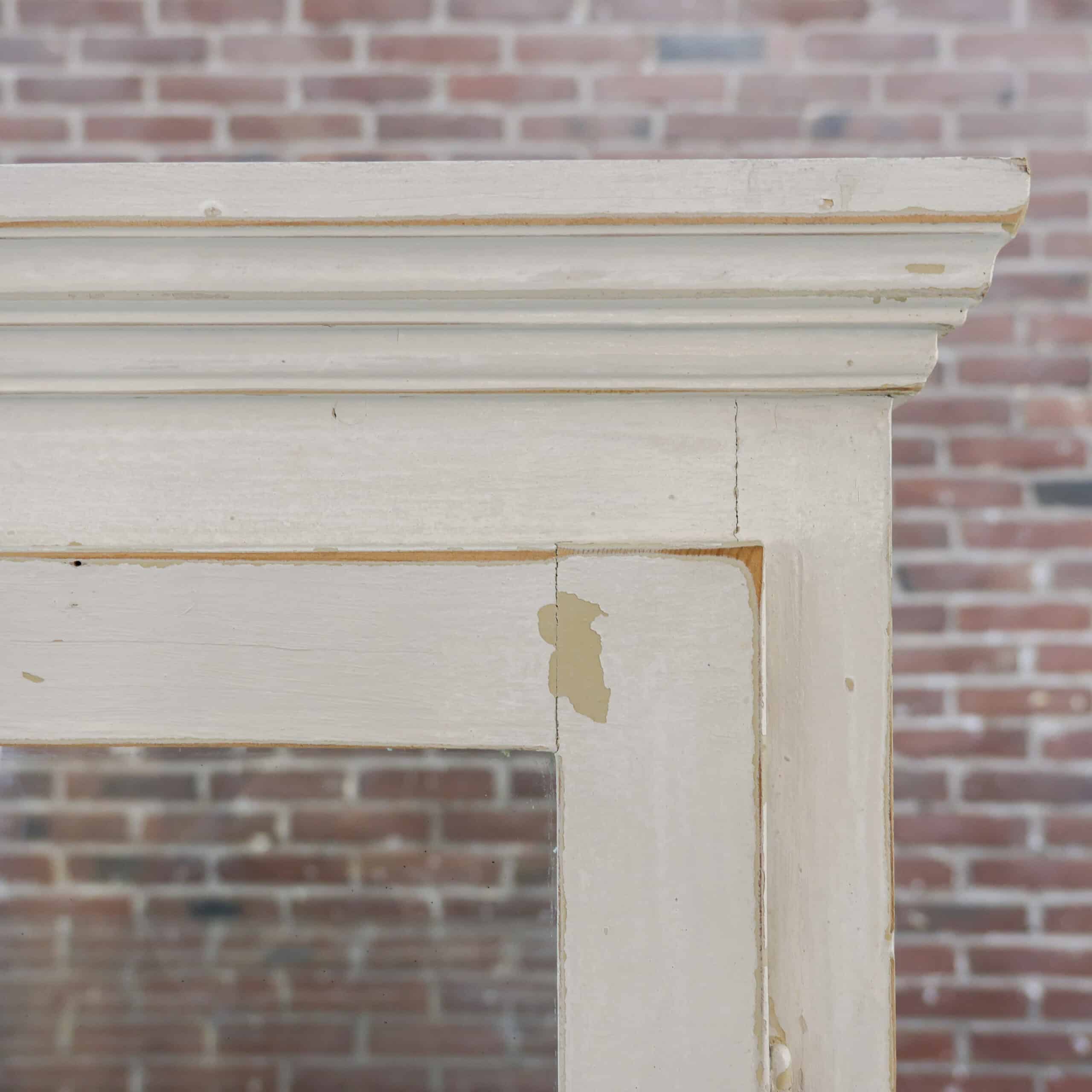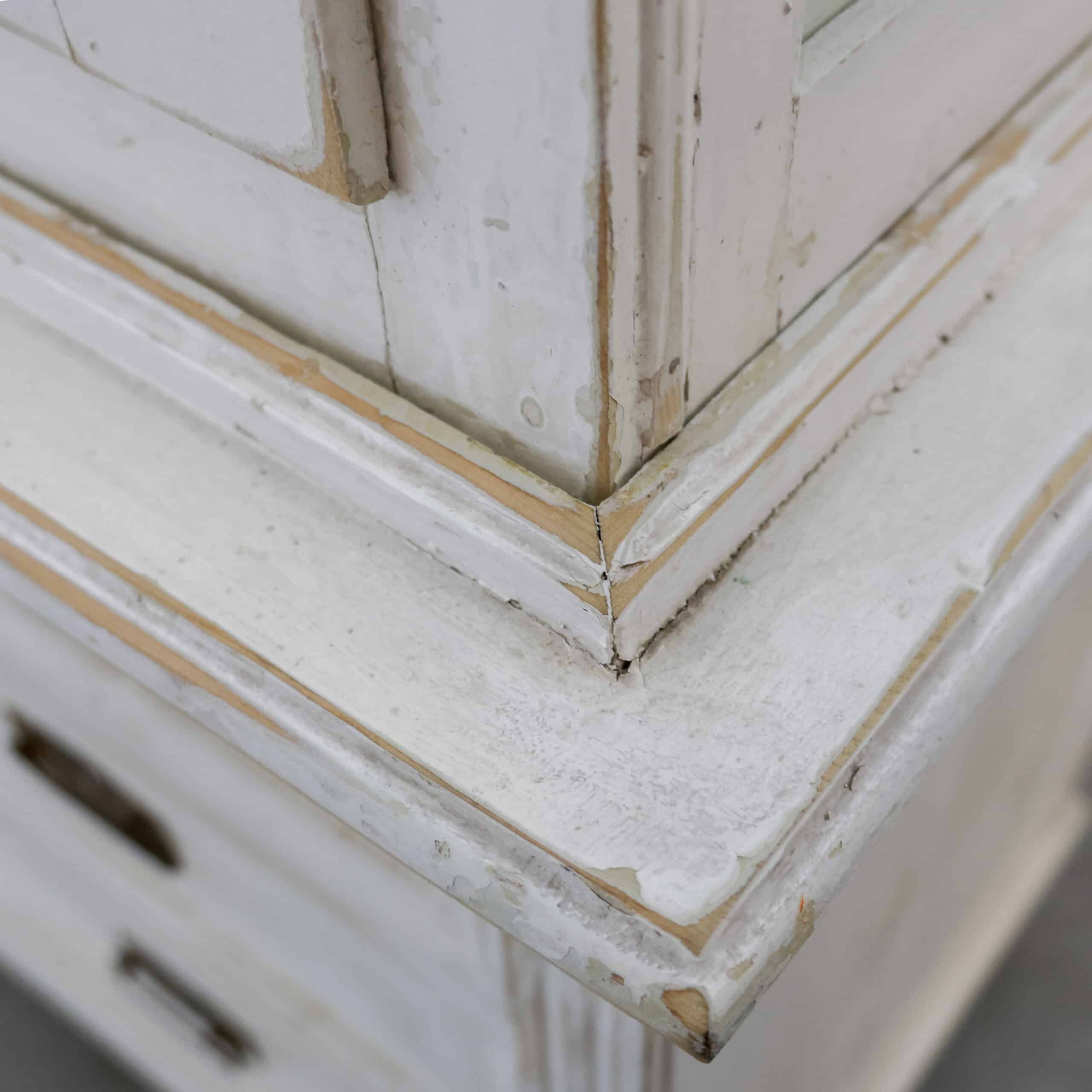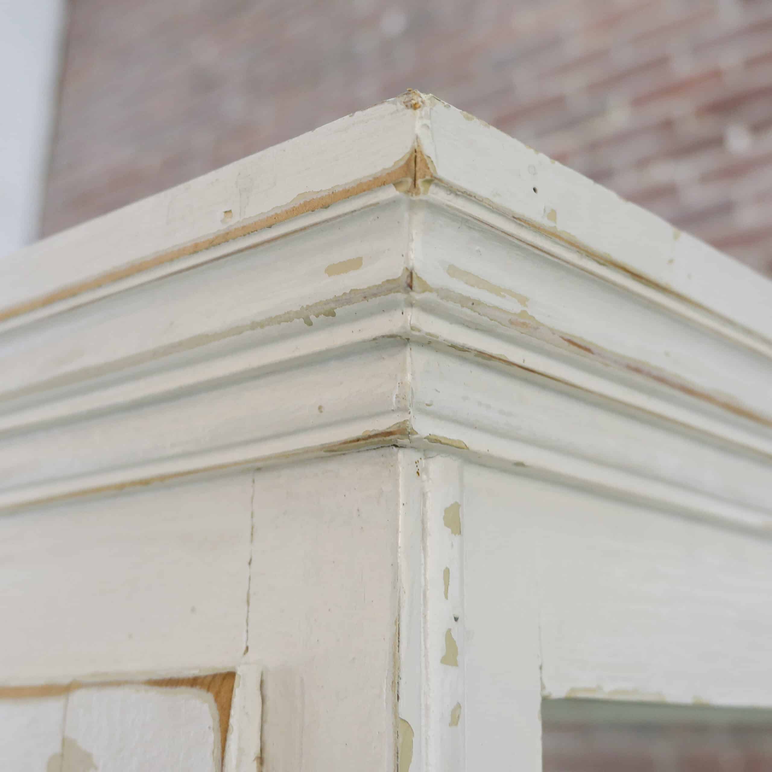 Charmante vintage dokterskast/ vitrinekast in een zacht verweerde witte tint met prachtige doorleefde details. De glazen bovenkast met legplanken is perfect om servies, glaswerk of verzamelingen te tonen, terwijl de drie lades onderin zorgen voor praktische opbergruimte. De verf vertoont hier en daar slijtage, wat bijdraagt aan de authentieke, warme uitstraling van dit unieke stuk met een knipoog naar oude dokters- en apothekersinterieurs.