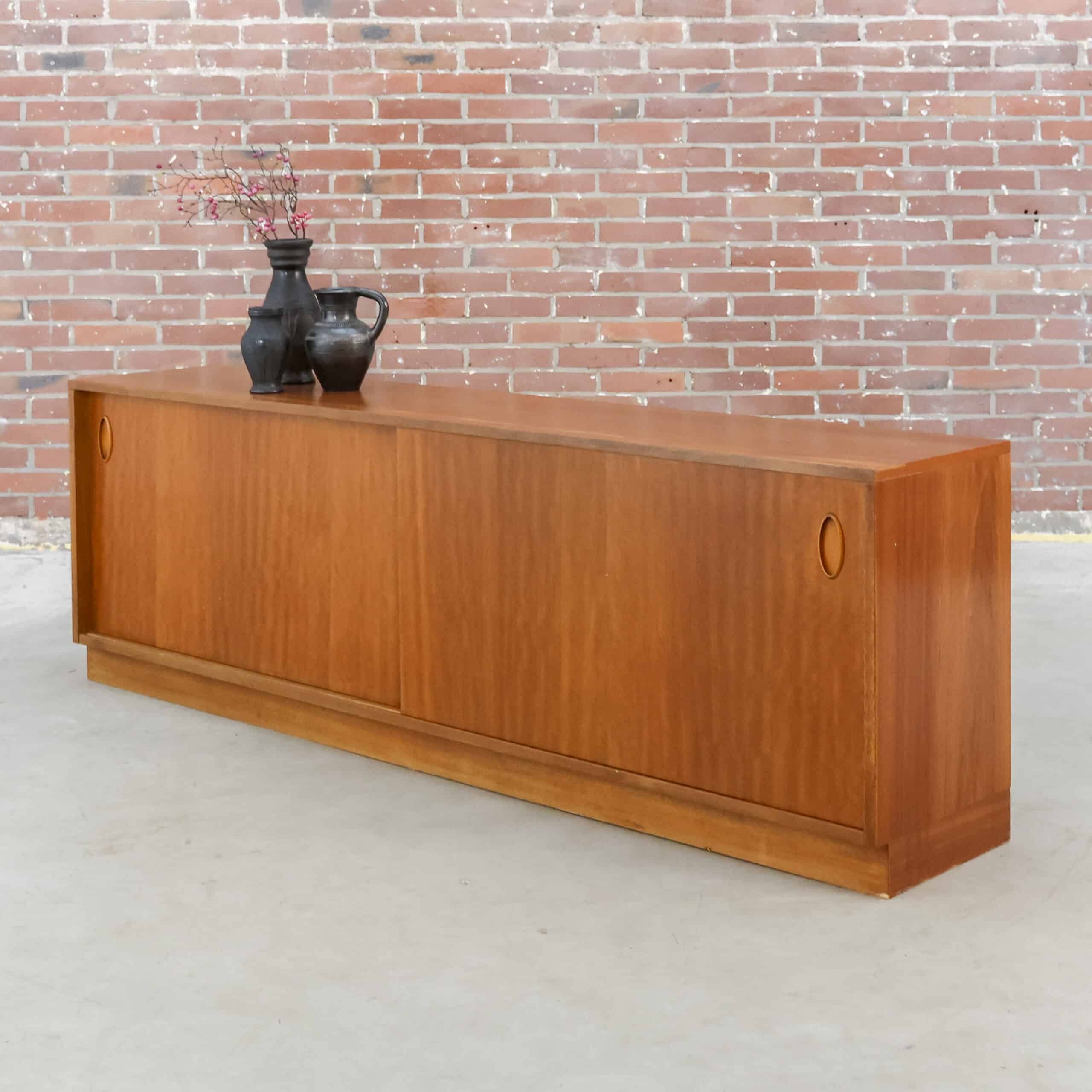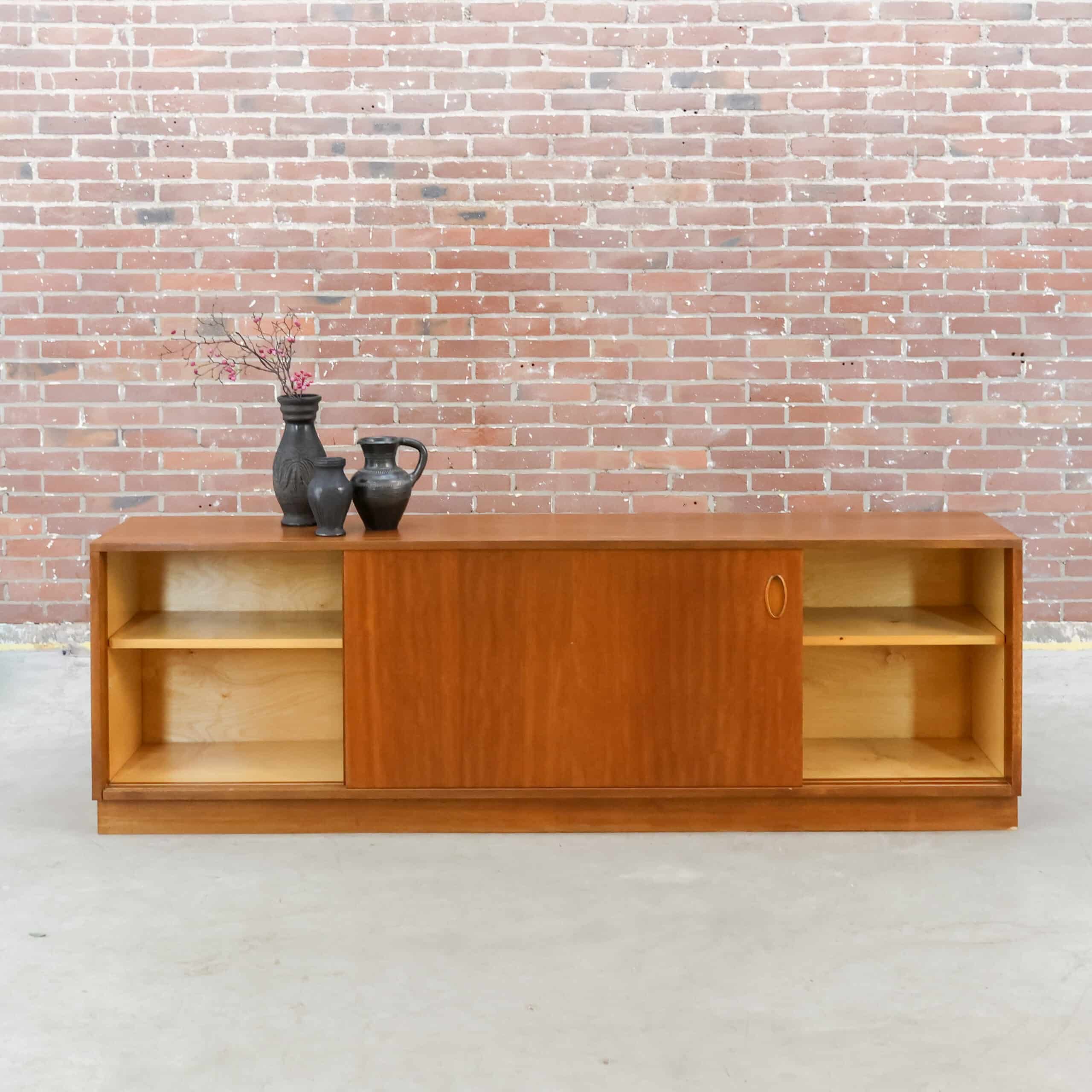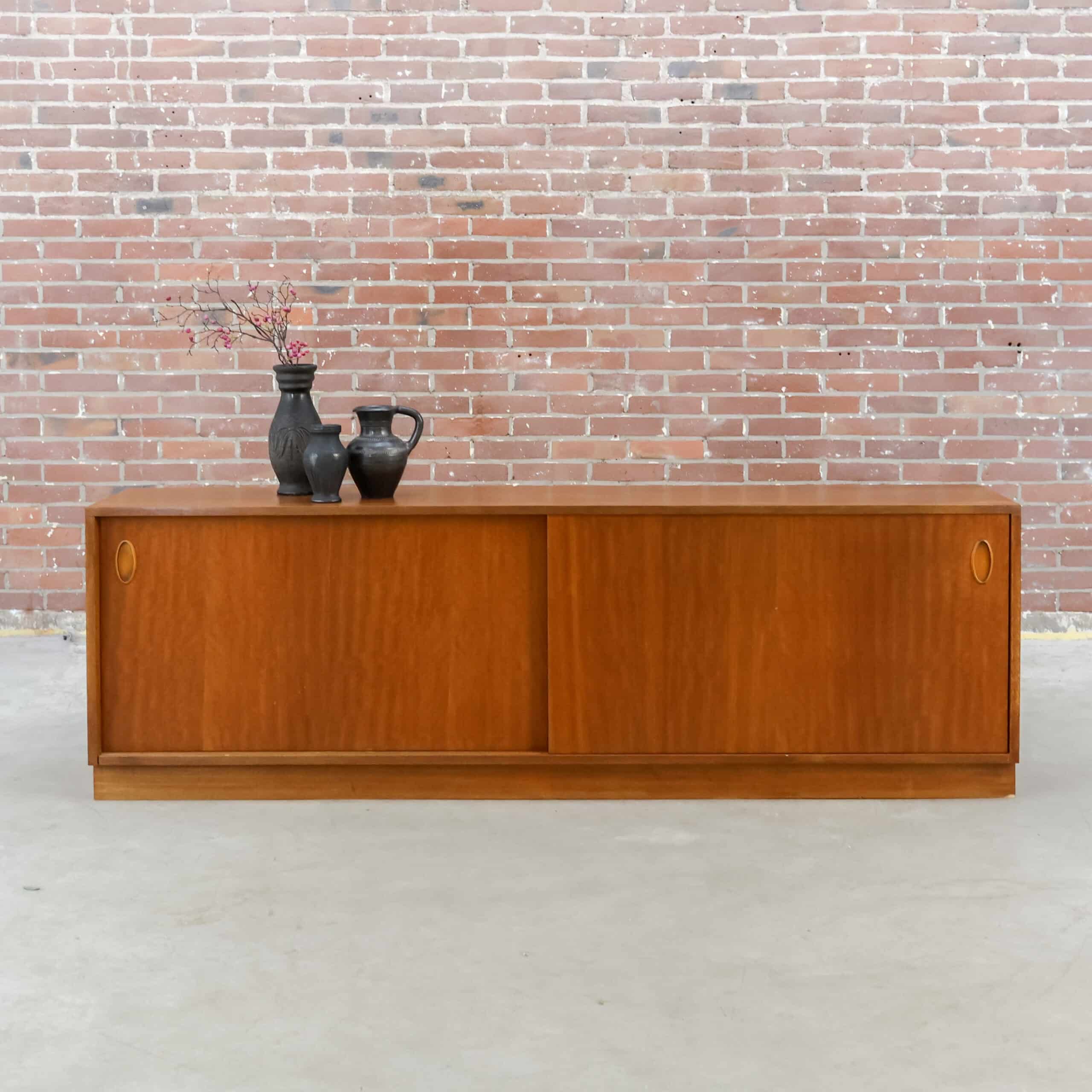 Strak vintage dressoir met schuifdeuren en warme houtkleur, typerend voor het mid-century design uit de jaren ’60. Achter de schuifdeuren bevinden zich praktische legplanken met veel opbergruimte, terwijl de minimalistische handgrepen zorgen voor een rustige en tijdloze uitstraling. Het dressoir heeft een mooi geleefd karakter en is stevig en functioneel. Bovenop zaten ooit kleine bevestigingen; de gaatjes zijn netjes opgevuld en vallen nauwelijks op.