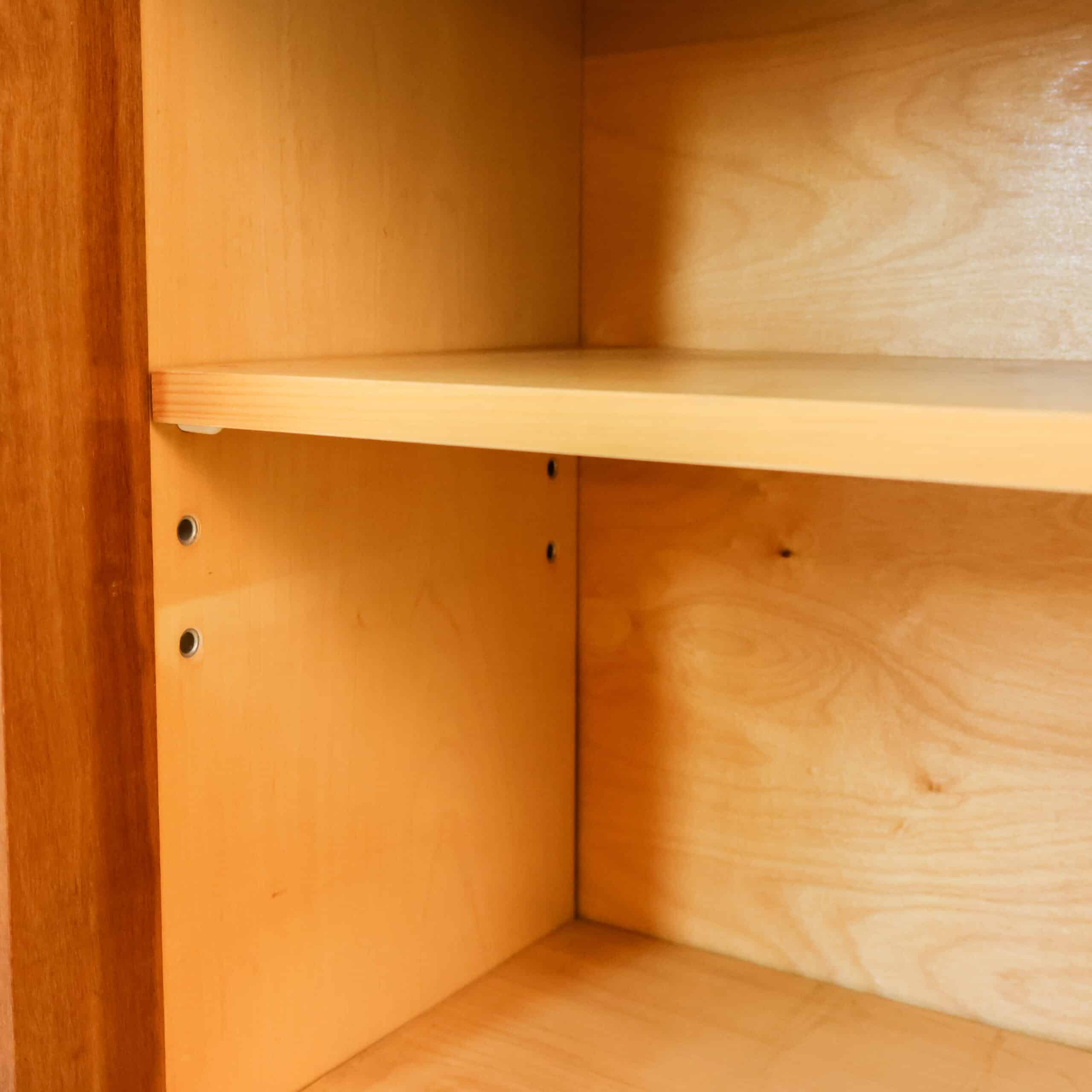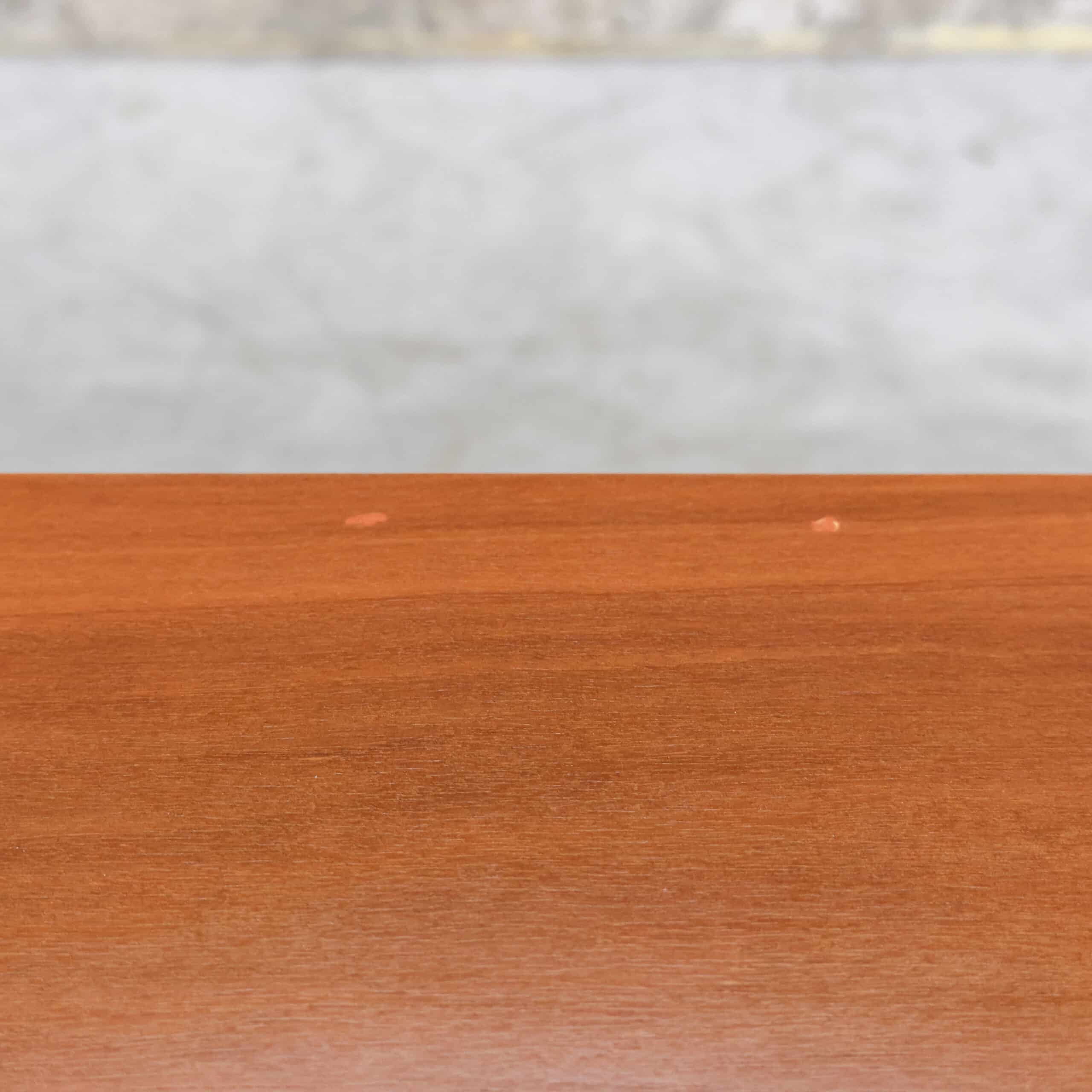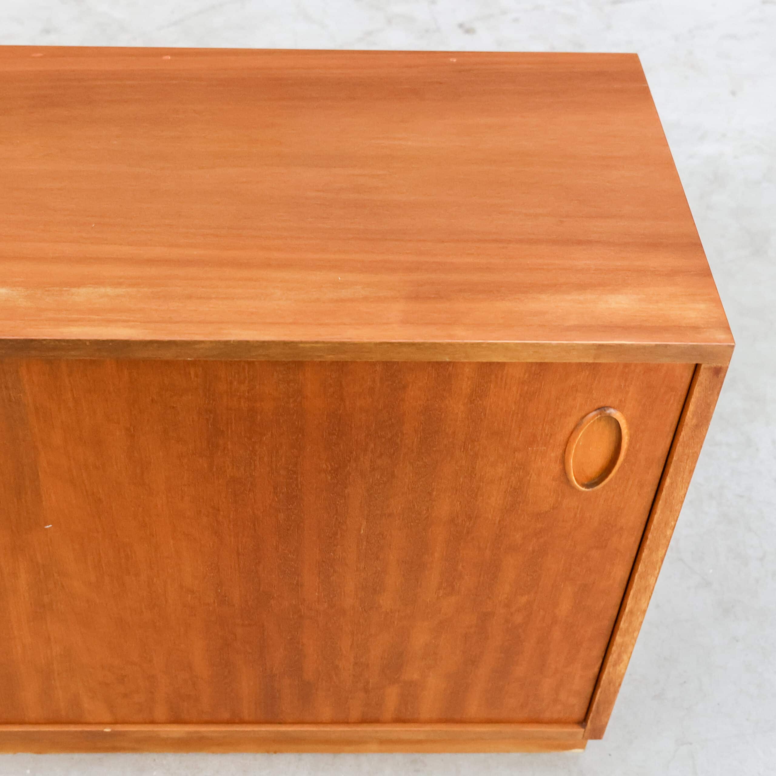 Strak vintage dressoir met schuifdeuren en warme houtkleur, typerend voor het mid-century design uit de jaren ’60. Achter de schuifdeuren bevinden zich praktische legplanken met veel opbergruimte, terwijl de minimalistische handgrepen zorgen voor een rustige en tijdloze uitstraling. Het dressoir heeft een mooi geleefd karakter en is stevig en functioneel. Bovenop zaten ooit kleine bevestigingen; de gaatjes zijn netjes opgevuld en vallen nauwelijks op.