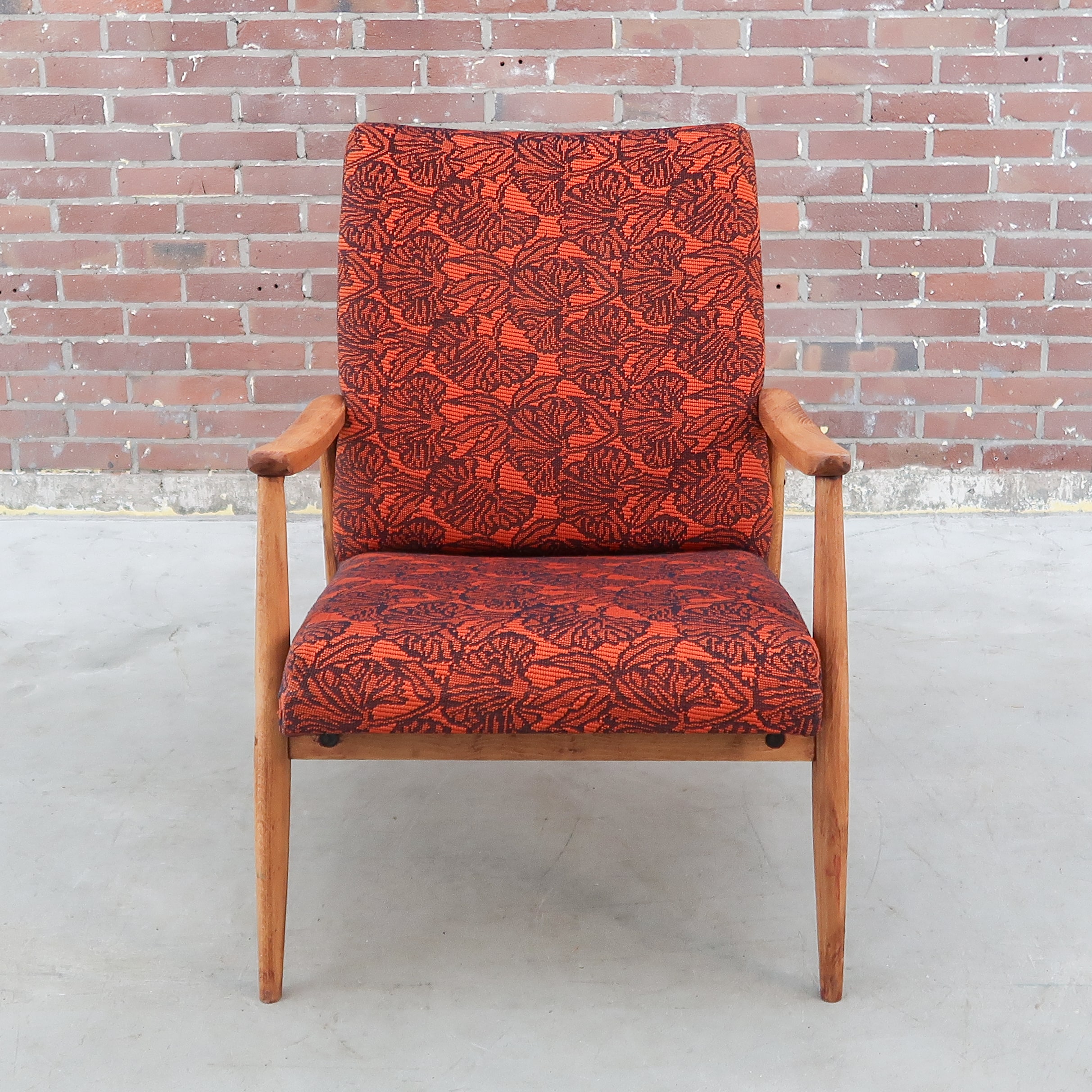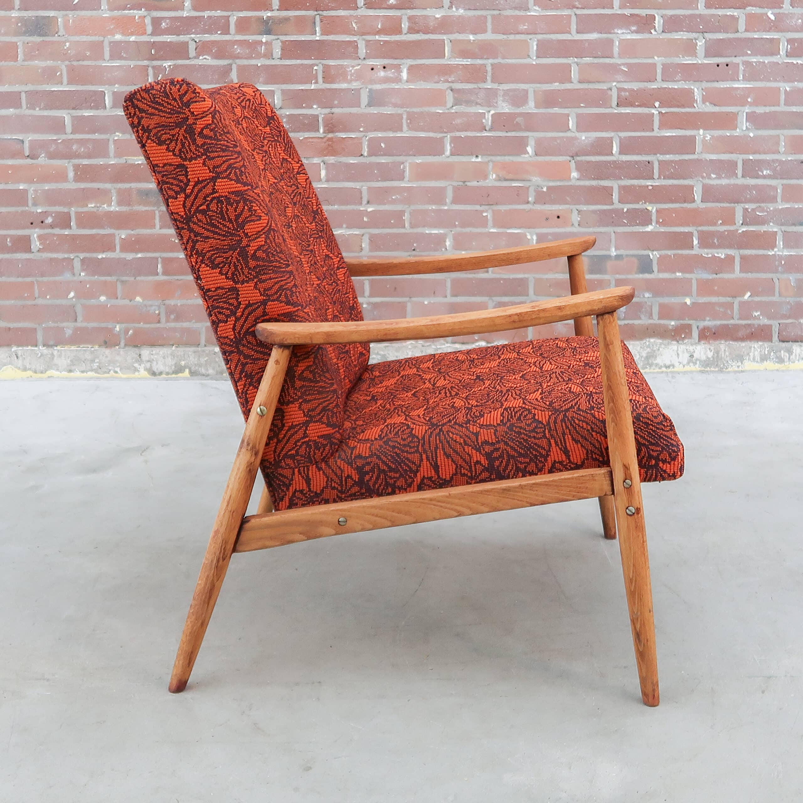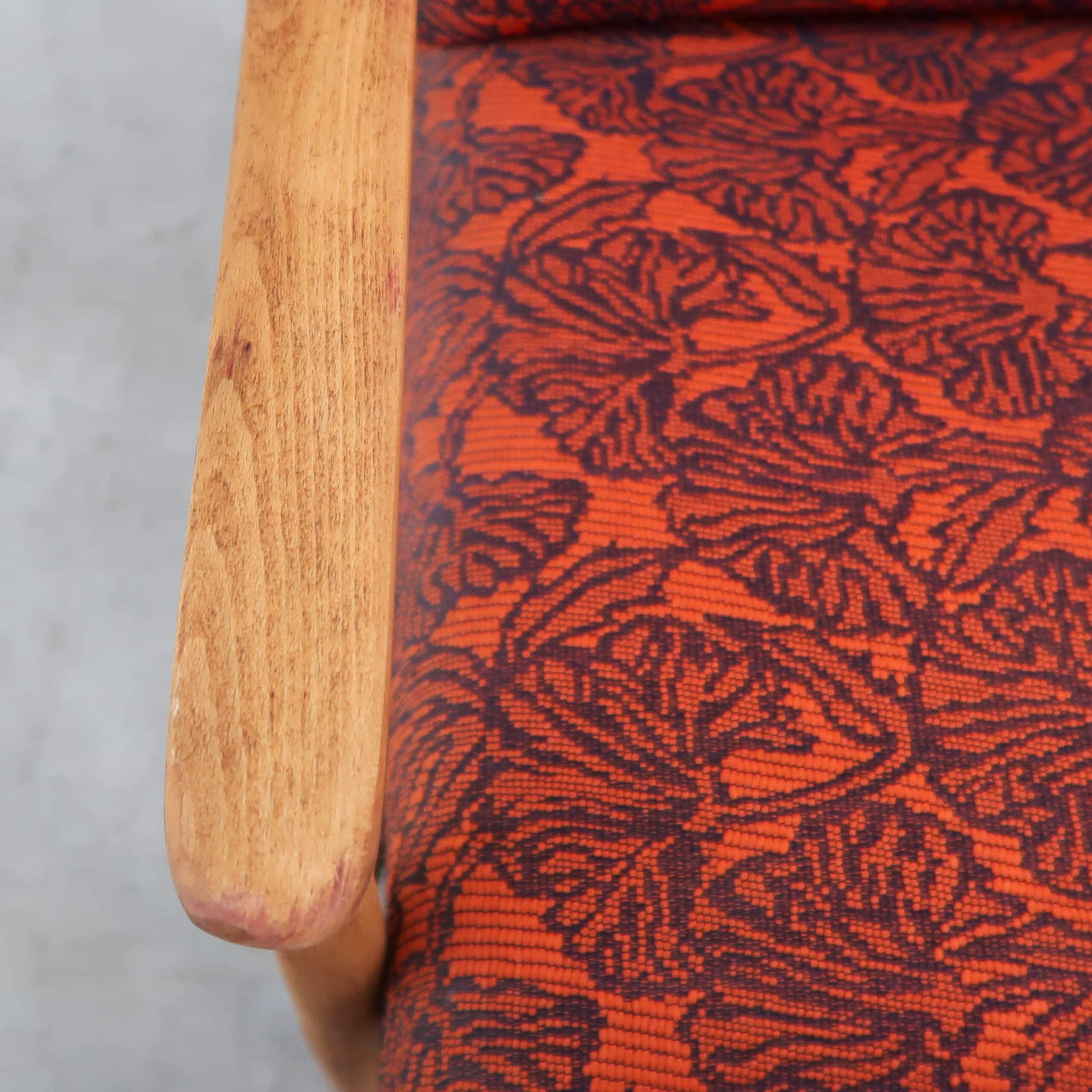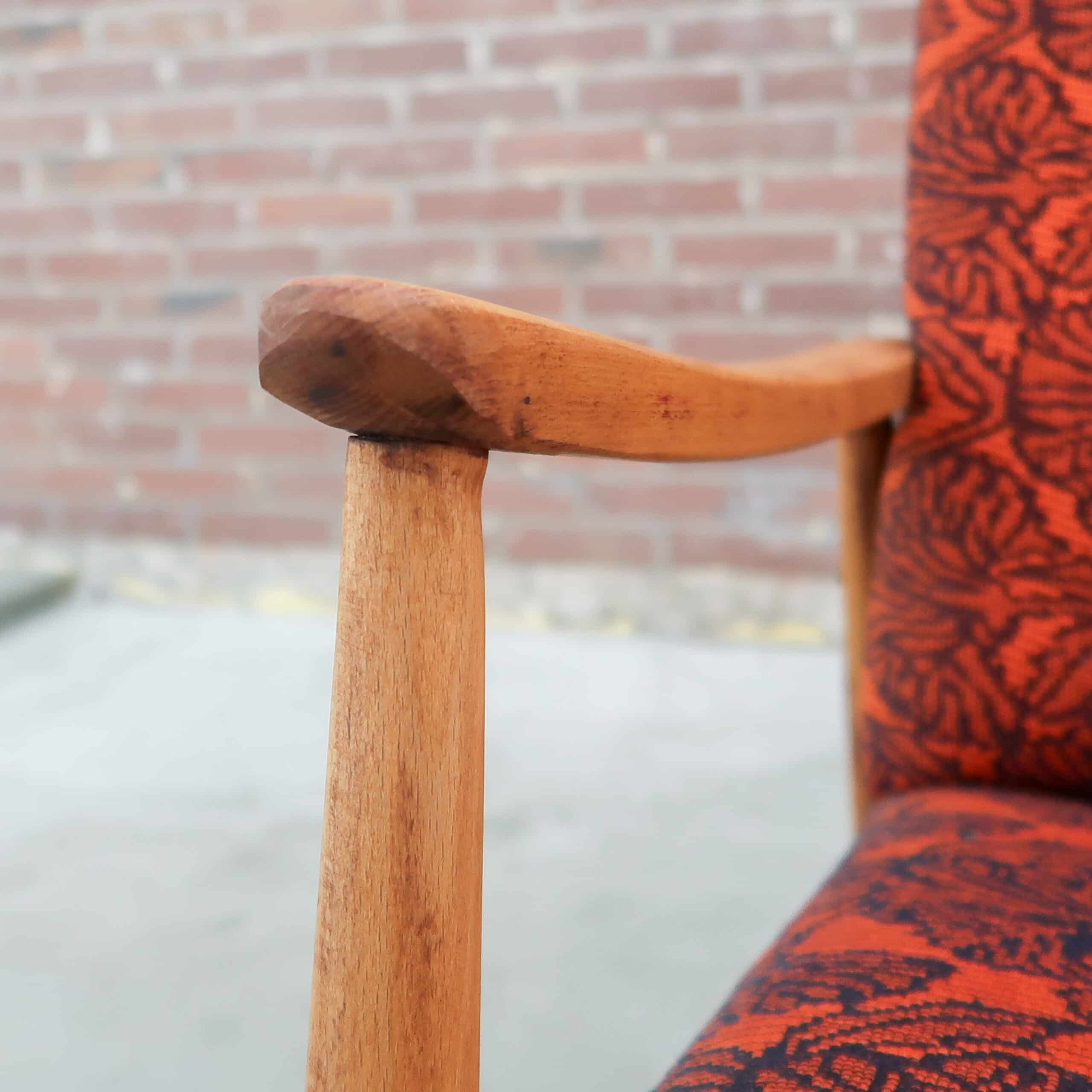 Vintage fauteuil met houten frame en originele oranje/roestkleurige bekleding. De poten zijn licht opgeschuurd, wat zorgt voor een warme, geleefde uitstraling. Stevig en comfortabel zitmeubel met karakter. Mooie mix van patina en design.