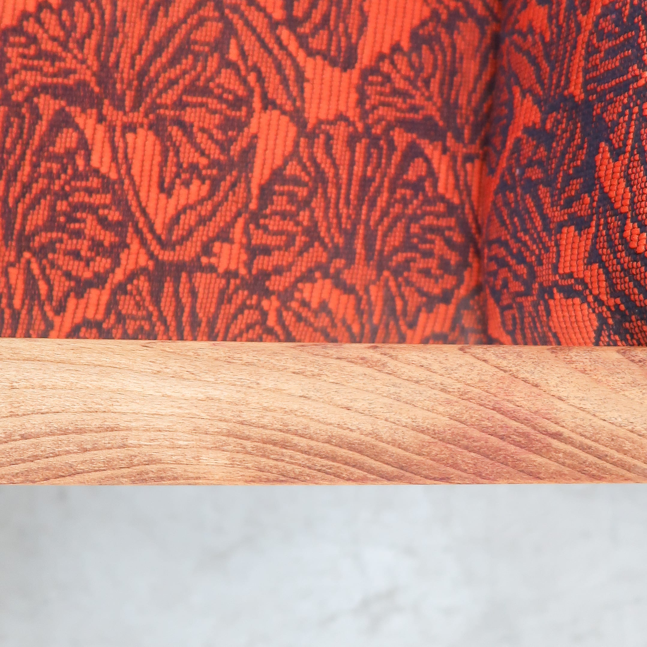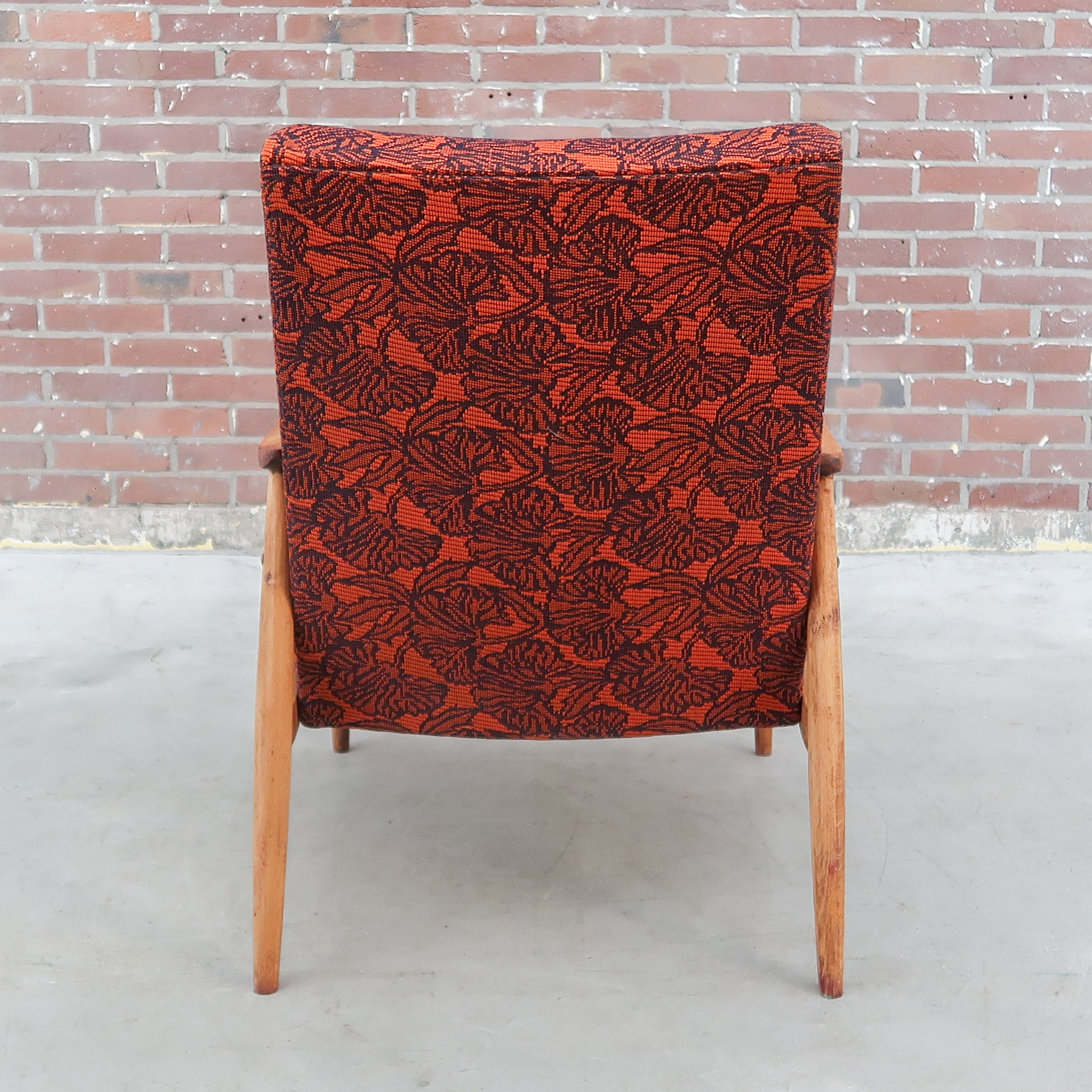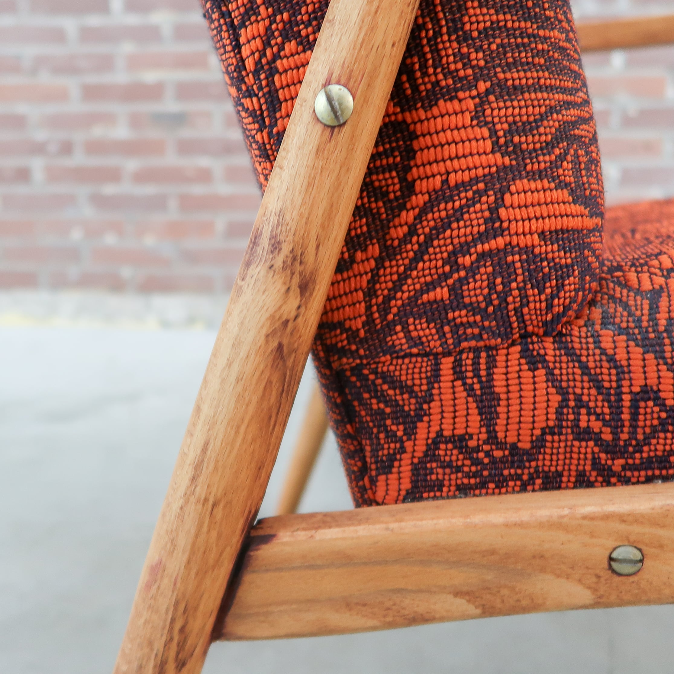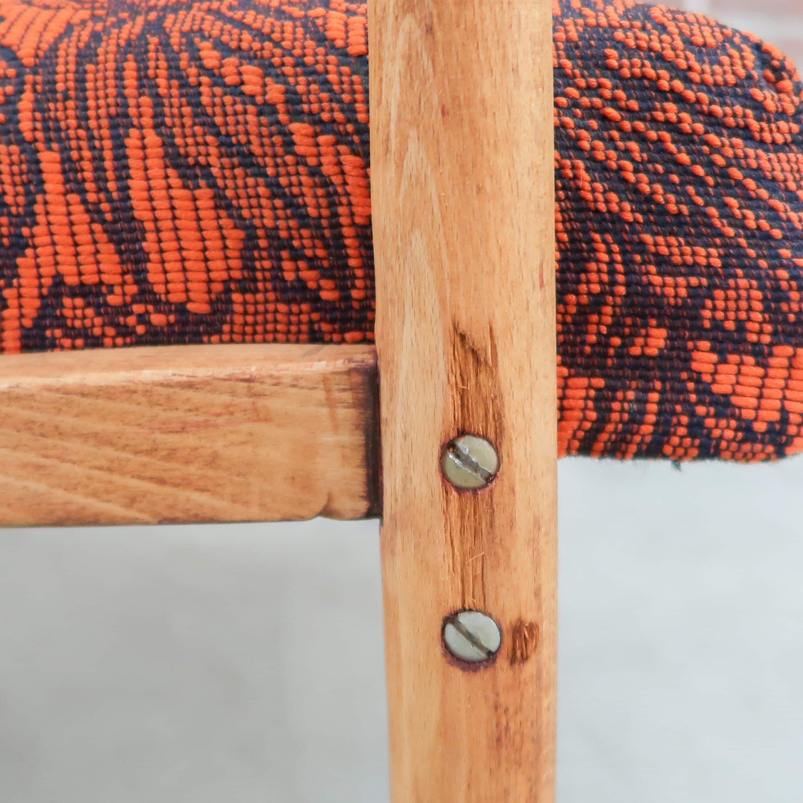 Vintage fauteuil met houten frame en originele oranje/roestkleurige bekleding. De poten zijn licht opgeschuurd, wat zorgt voor een warme, geleefde uitstraling. Stevig en comfortabel zitmeubel met karakter. Mooie mix van patina en design.