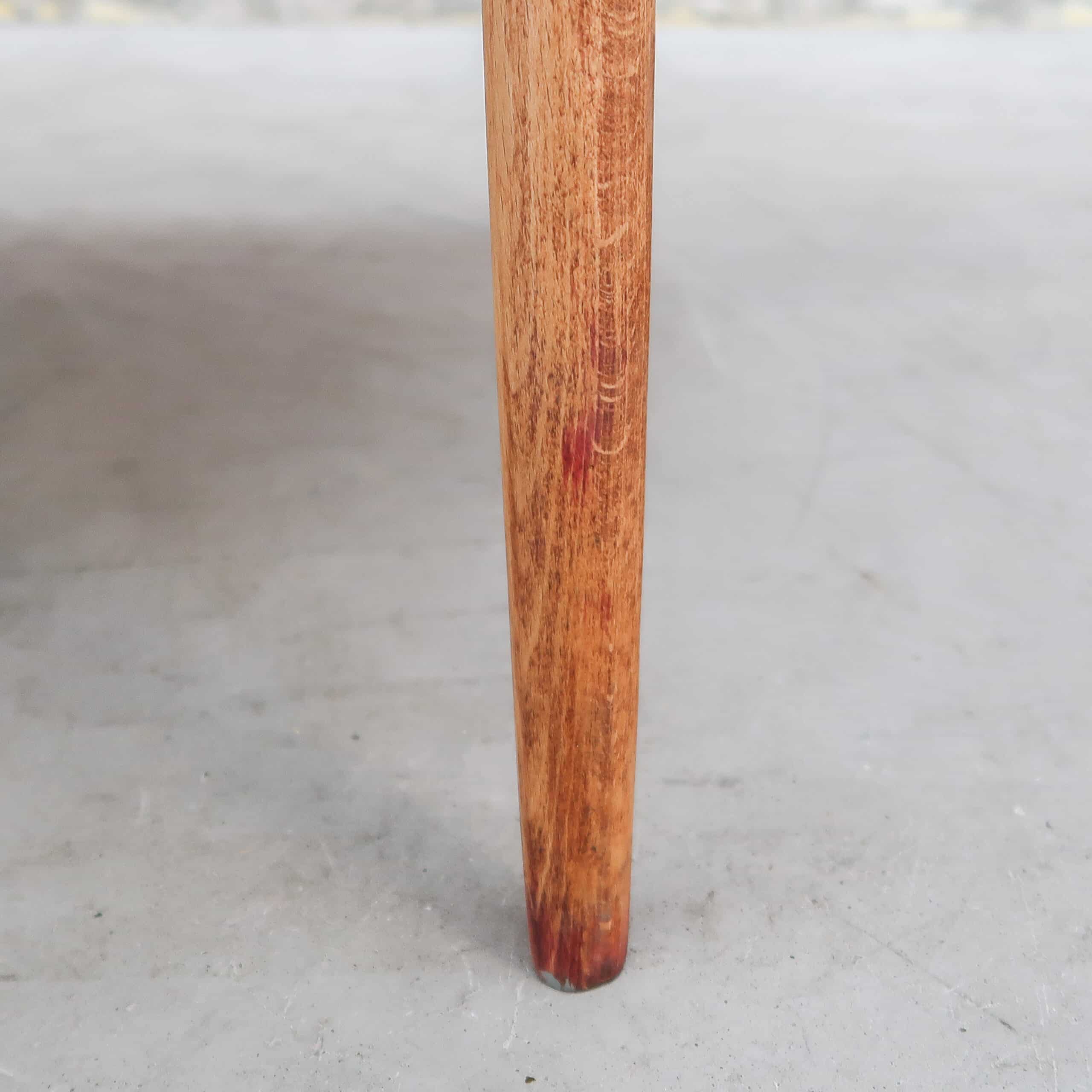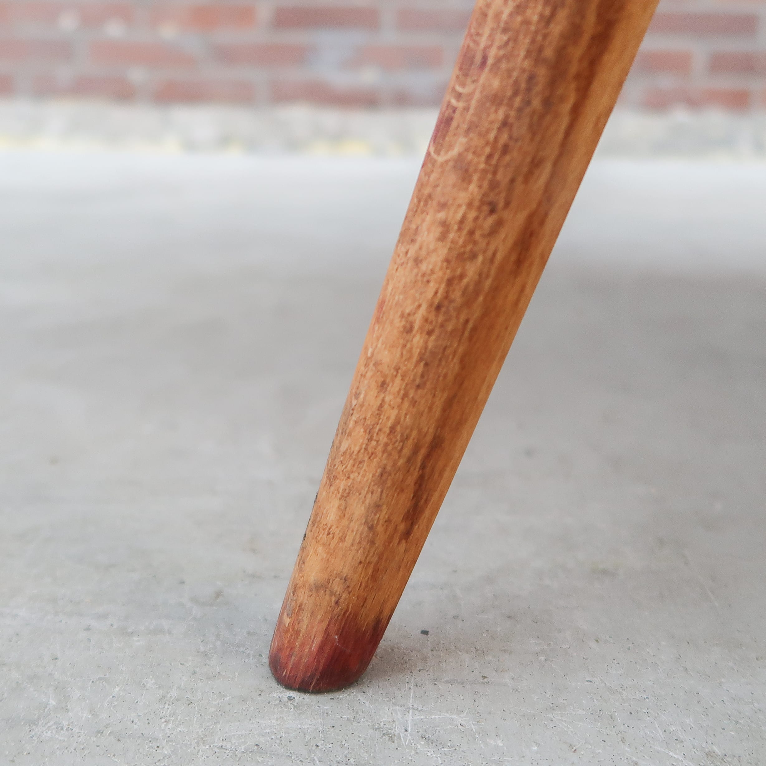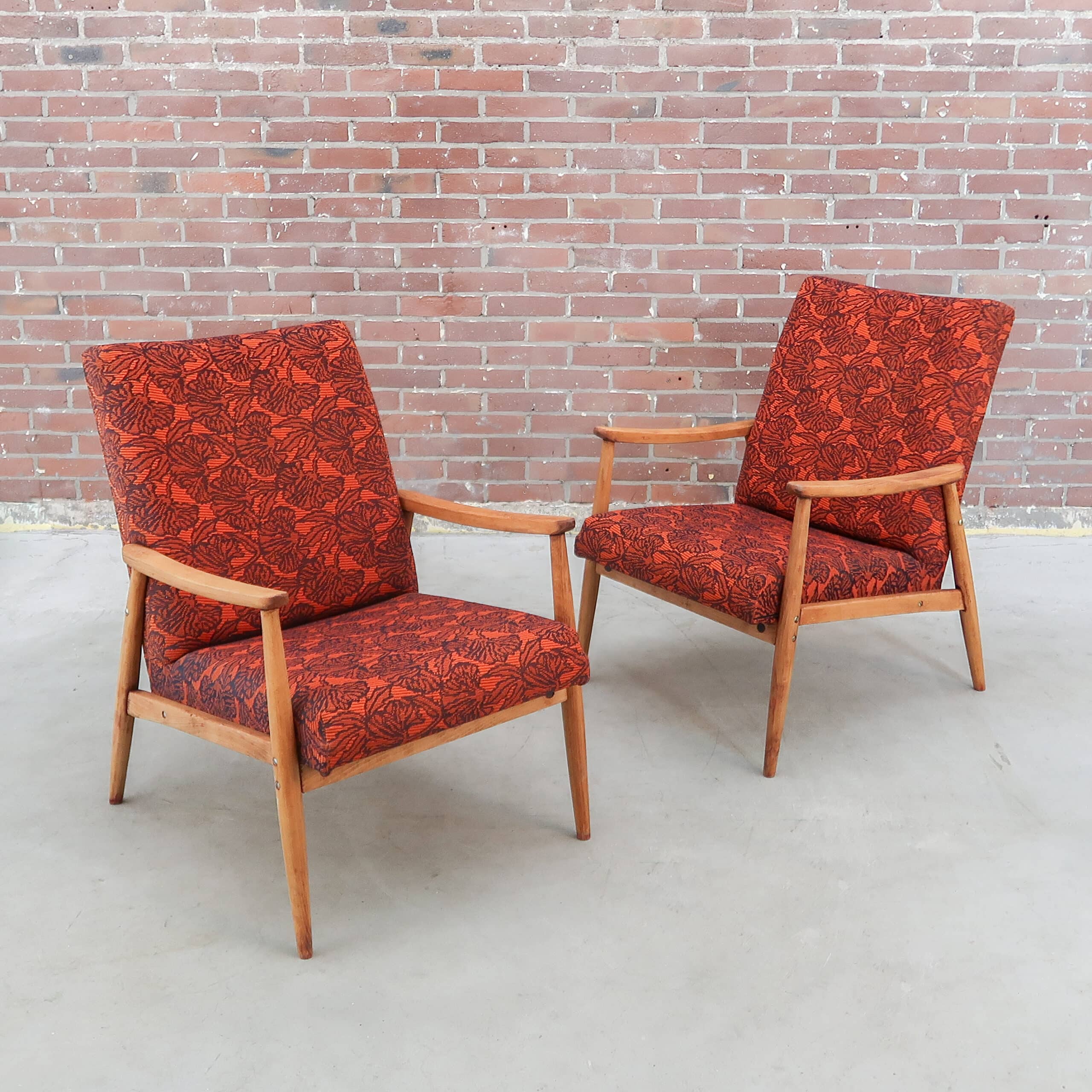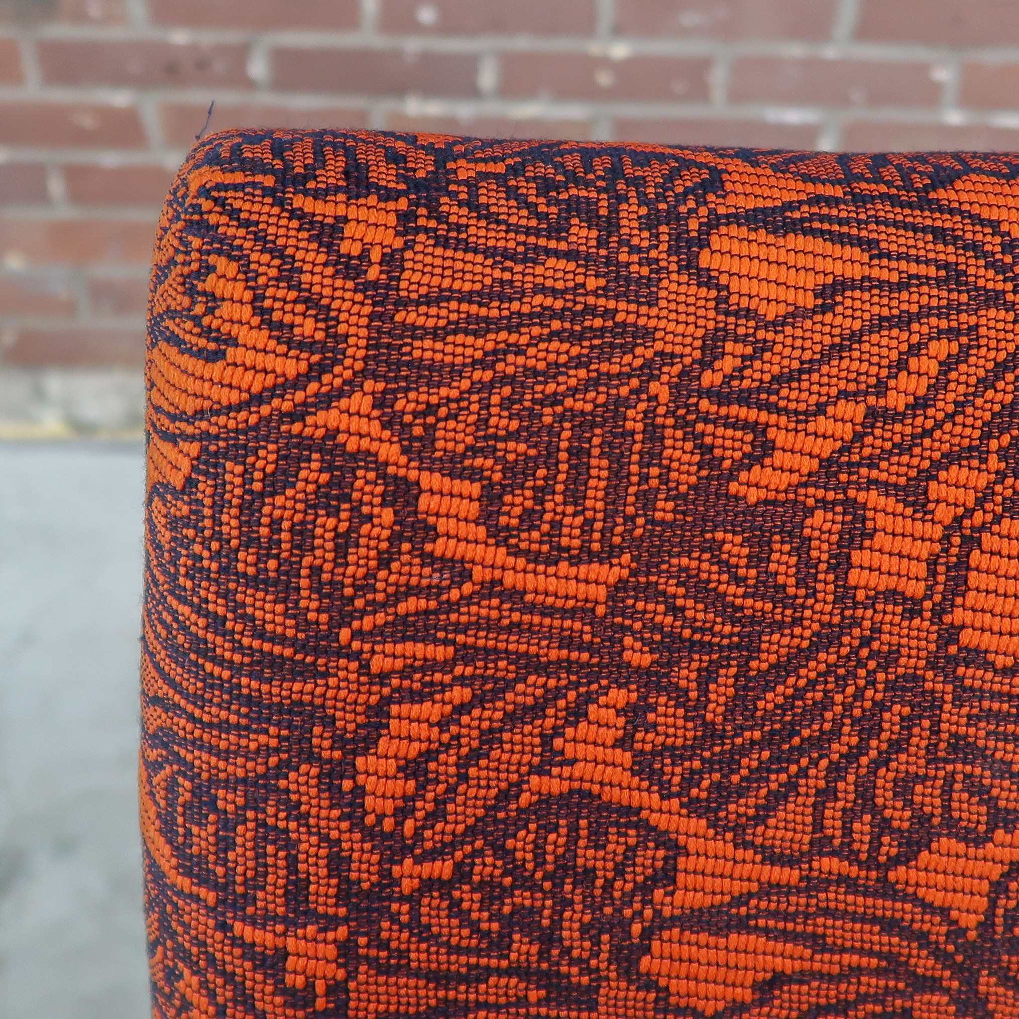 Vintage fauteuil met houten frame en originele oranje/roestkleurige bekleding. De poten zijn licht opgeschuurd, wat zorgt voor een warme, geleefde uitstraling. Stevig en comfortabel zitmeubel met karakter. Mooie mix van patina en design.