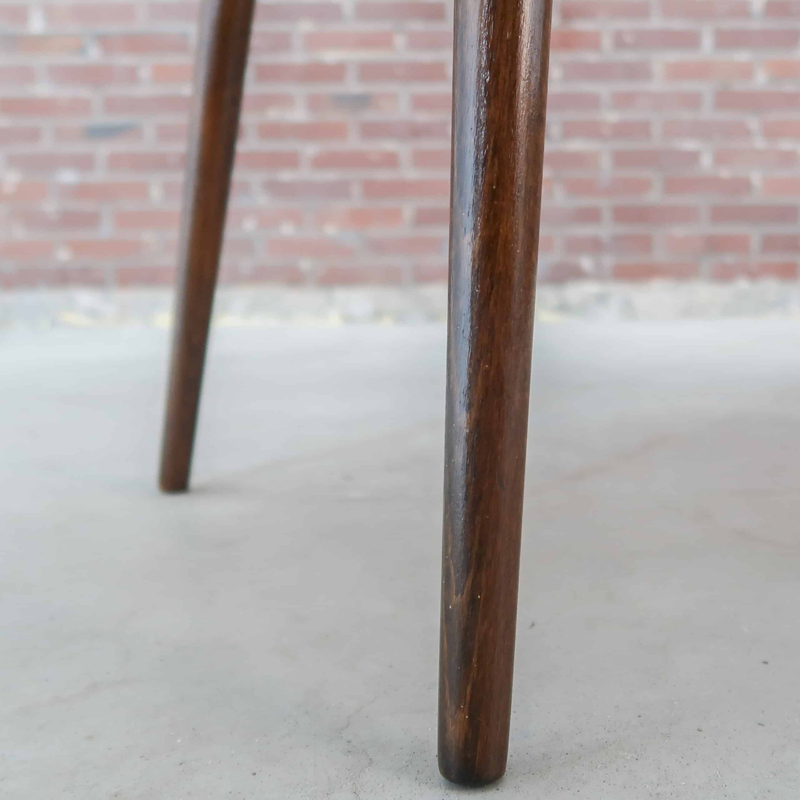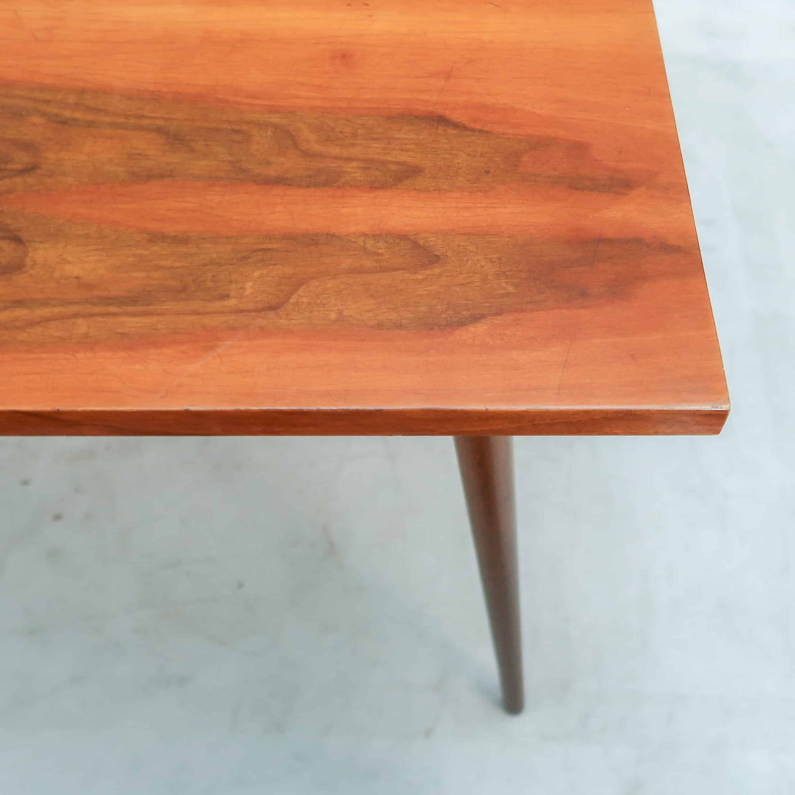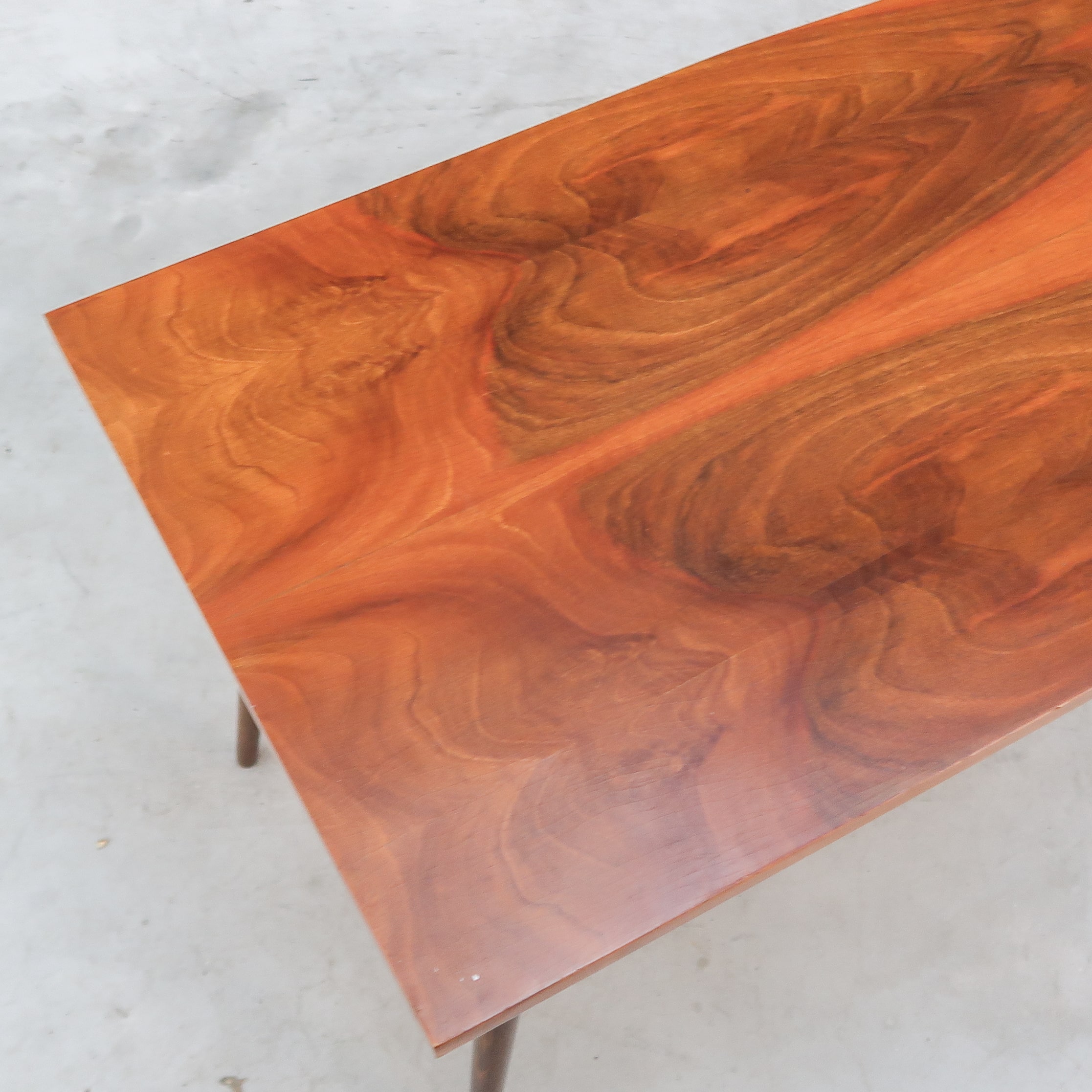 Deze slanke vintage salontafel komt uit de jaren ’70, gemaakt door Drevovýroba Košice in voormalig Tsjechoslowakije. Het warme verweerde walnootfineer en de taps toelopende poten geven haar een elegante, tijdloze uitstraling. Een subtiel ontwerp met een knipoog naar Scandinavisch modernisme. Een prachtig stuk met geschiedenis en karakter voor in elk interieur.