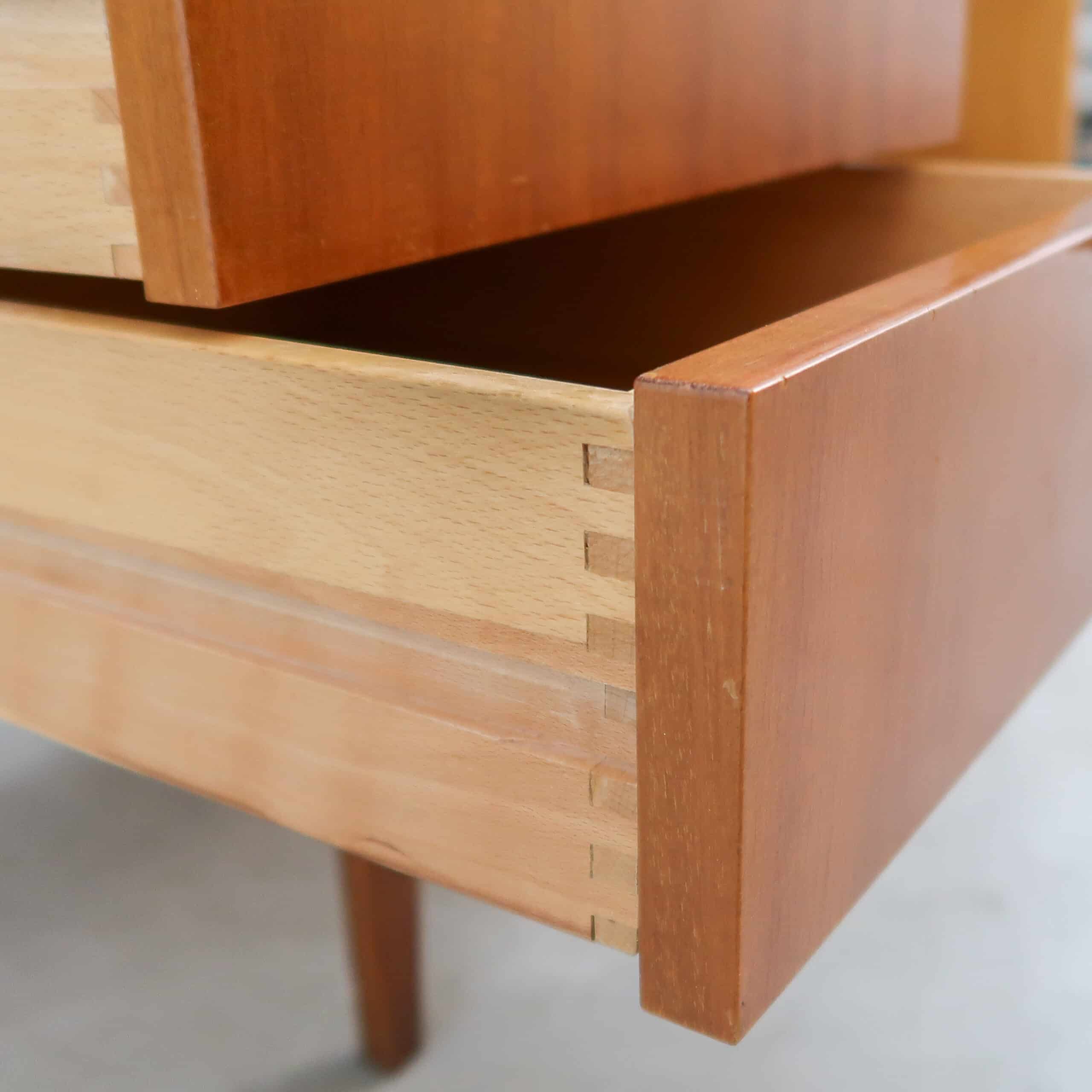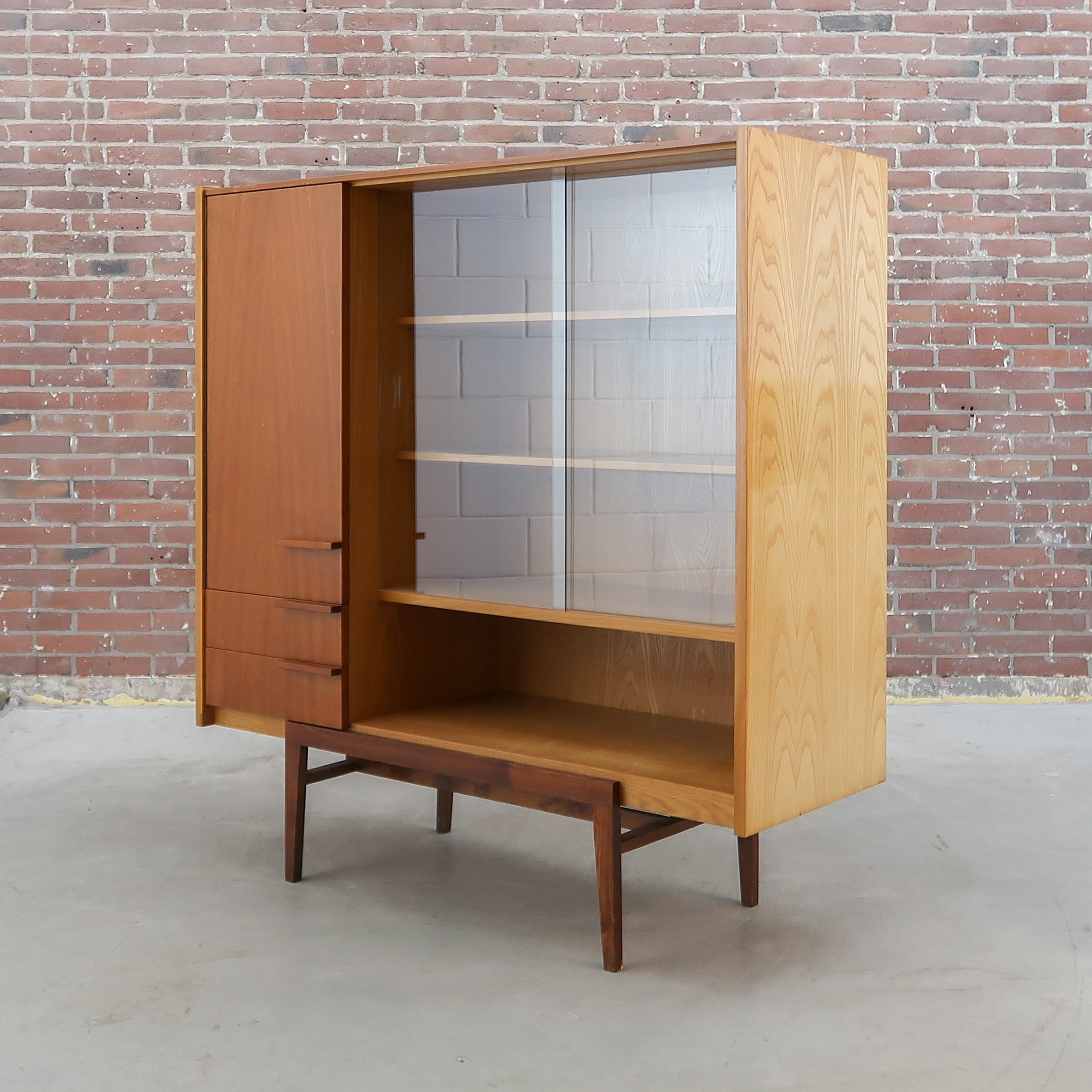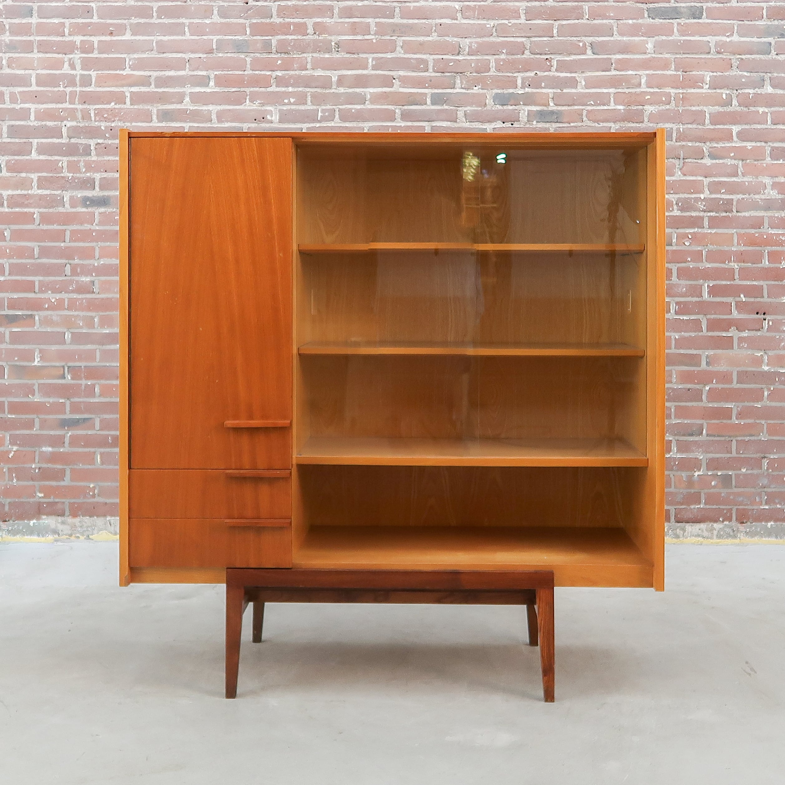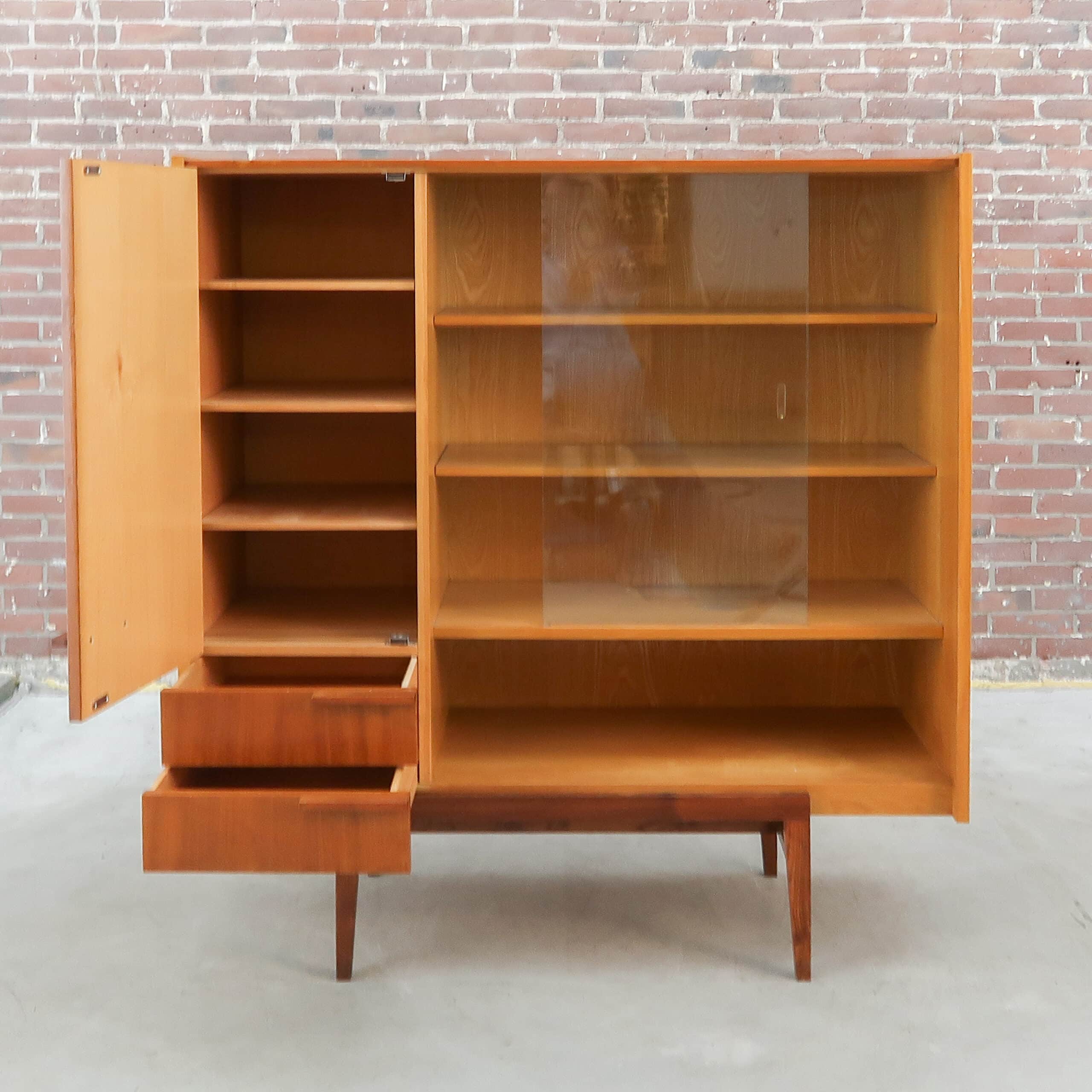 Prachtige vitrinekast uit de jaren 60 van UP Závody Tsjechoslowakije. De kast heeft een warme teakfineer met een mooie nerf en een elegante asymmetrische indeling met vitrinedeel, lades en kastdeuren. Strakke lijnen, verfijnde poten en subtiele details maken dit een tijdloos ontwerp in pure mid-century stijl. Een karaktervol meubel dat zowel praktisch als stijlvol is — ideaal voor servies, boeken of mooie vondsten.