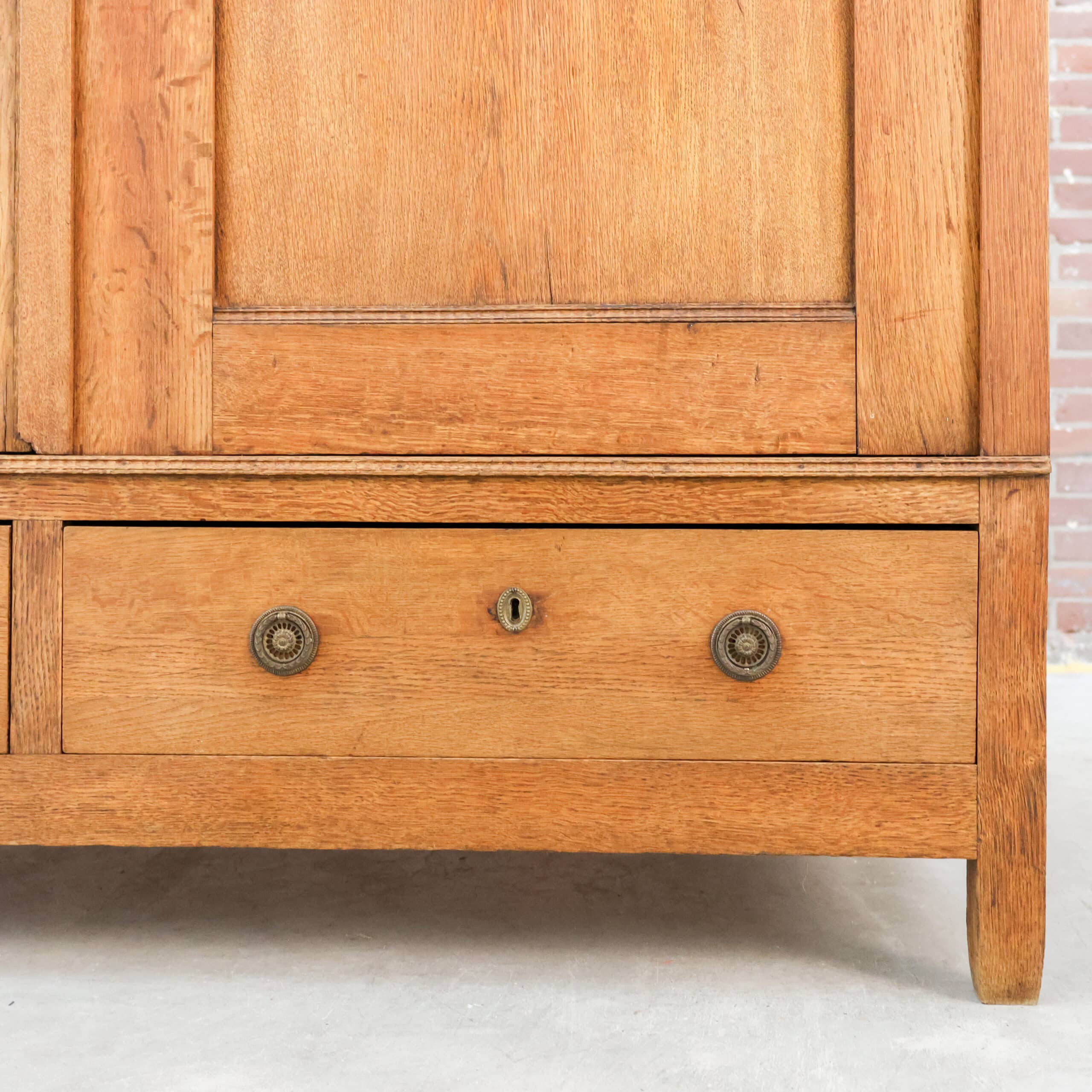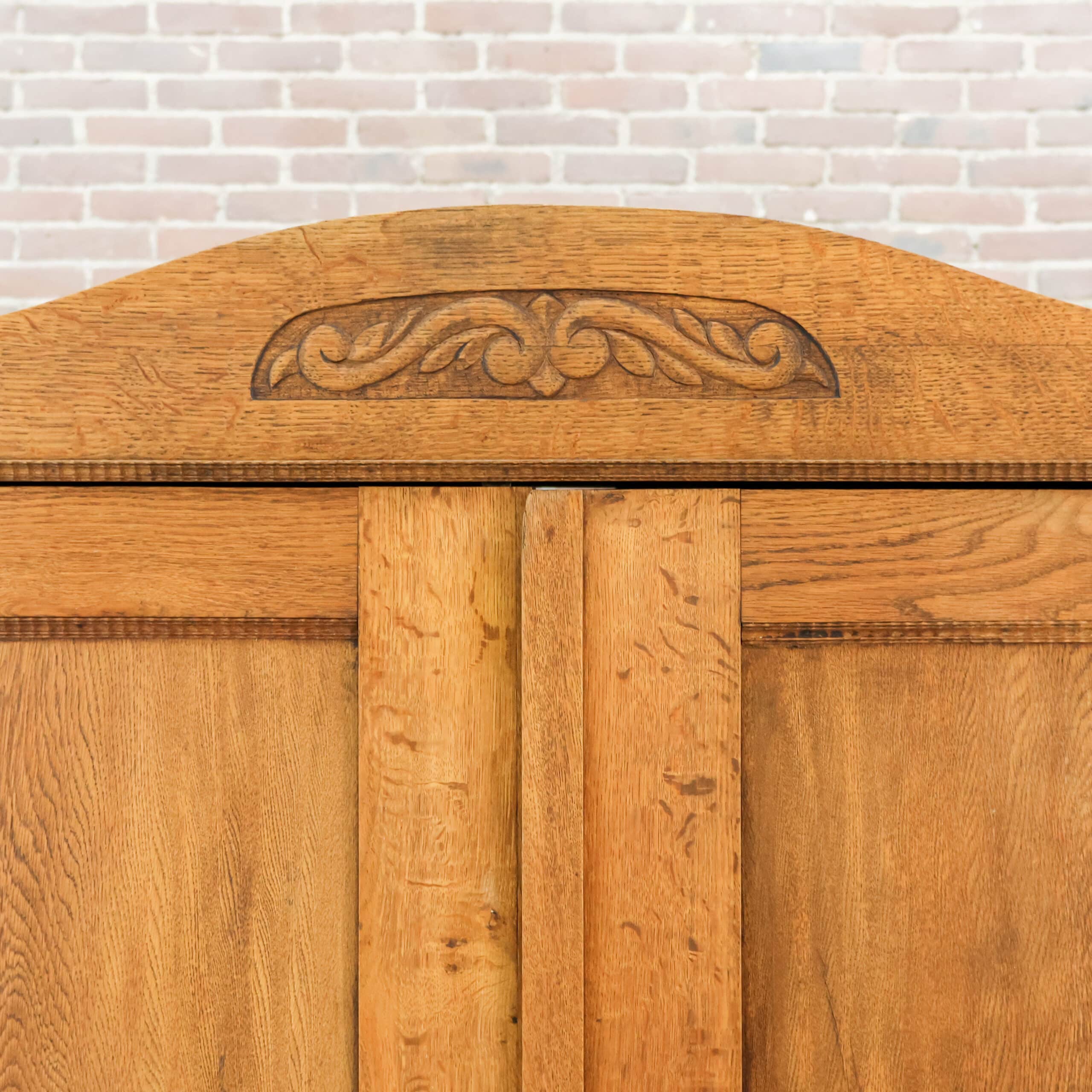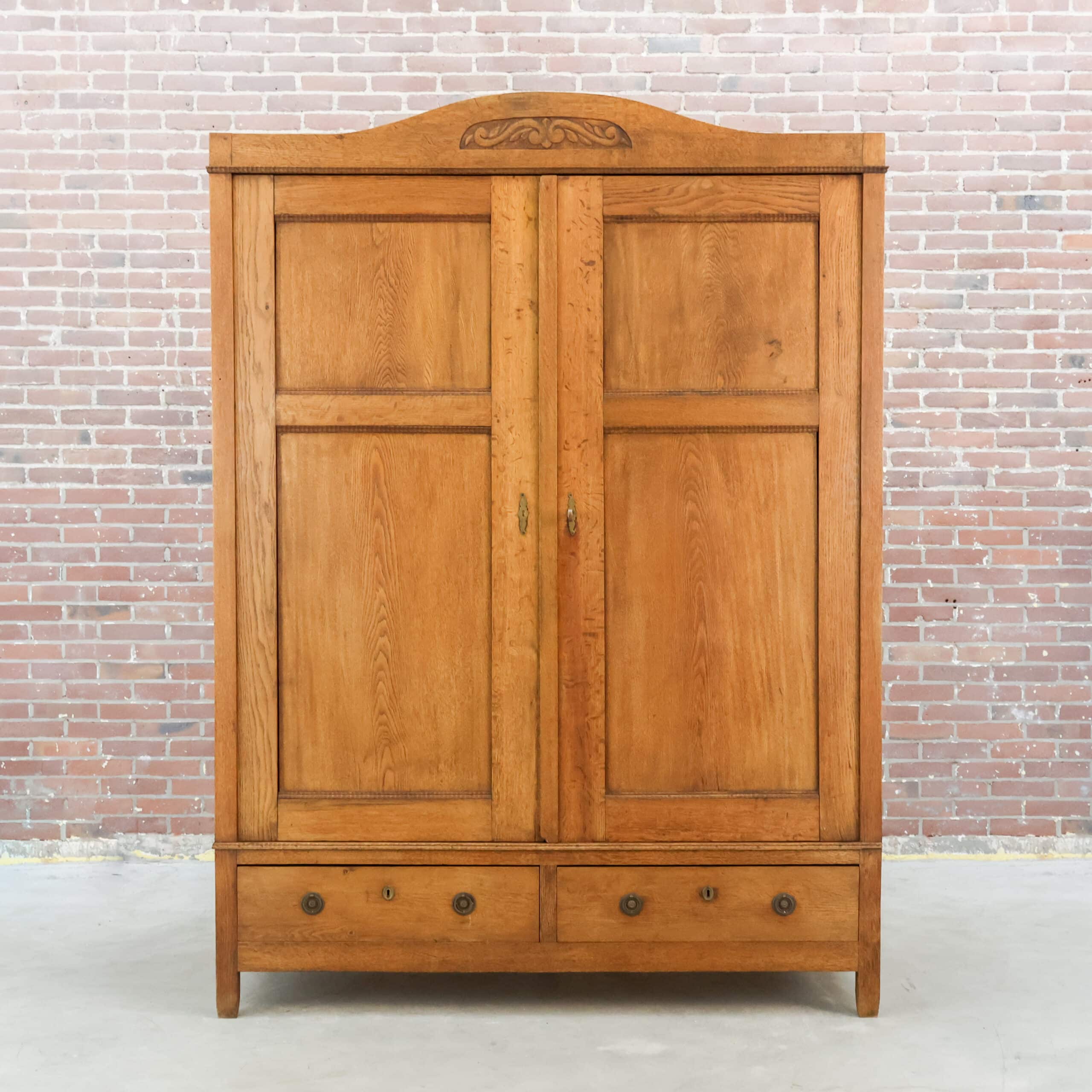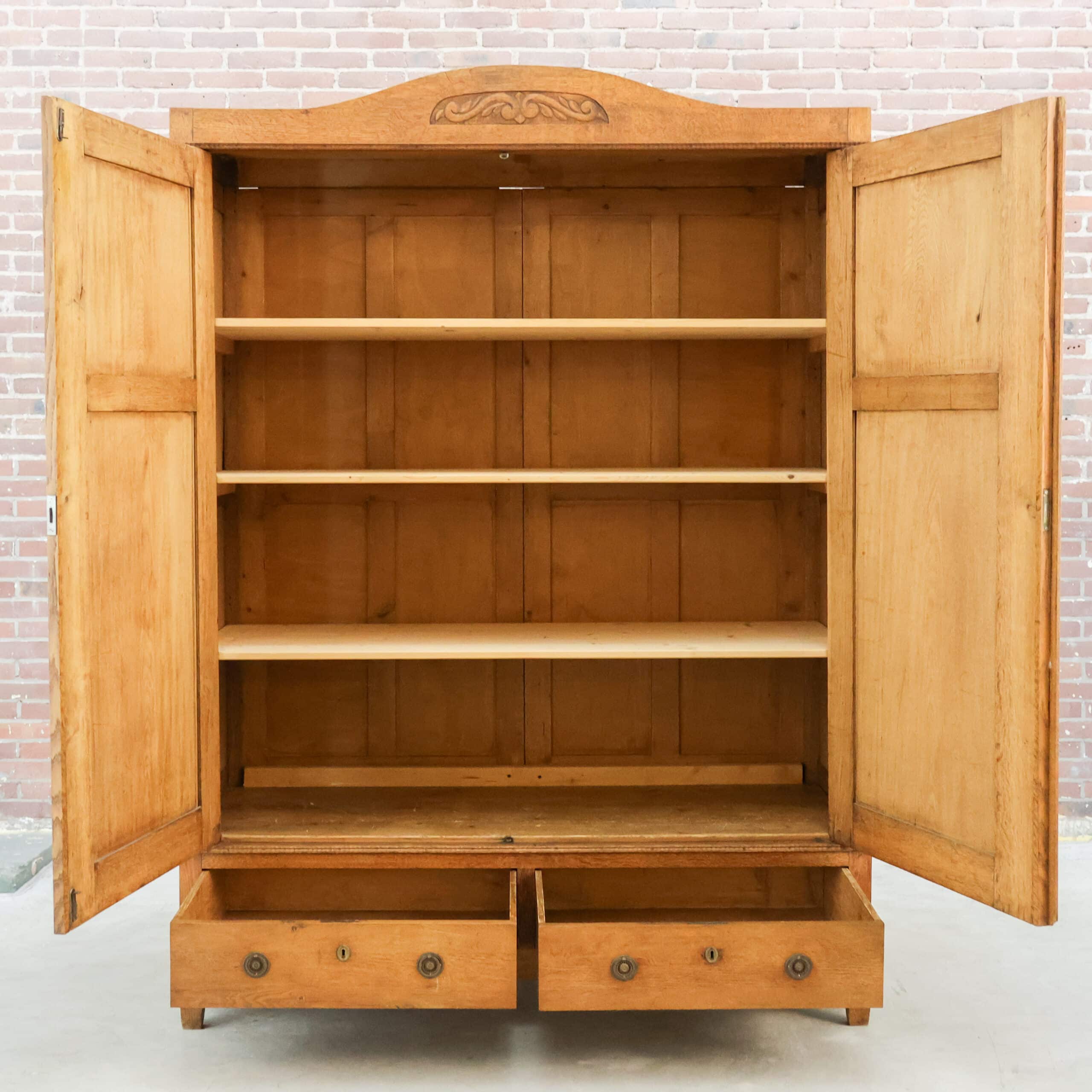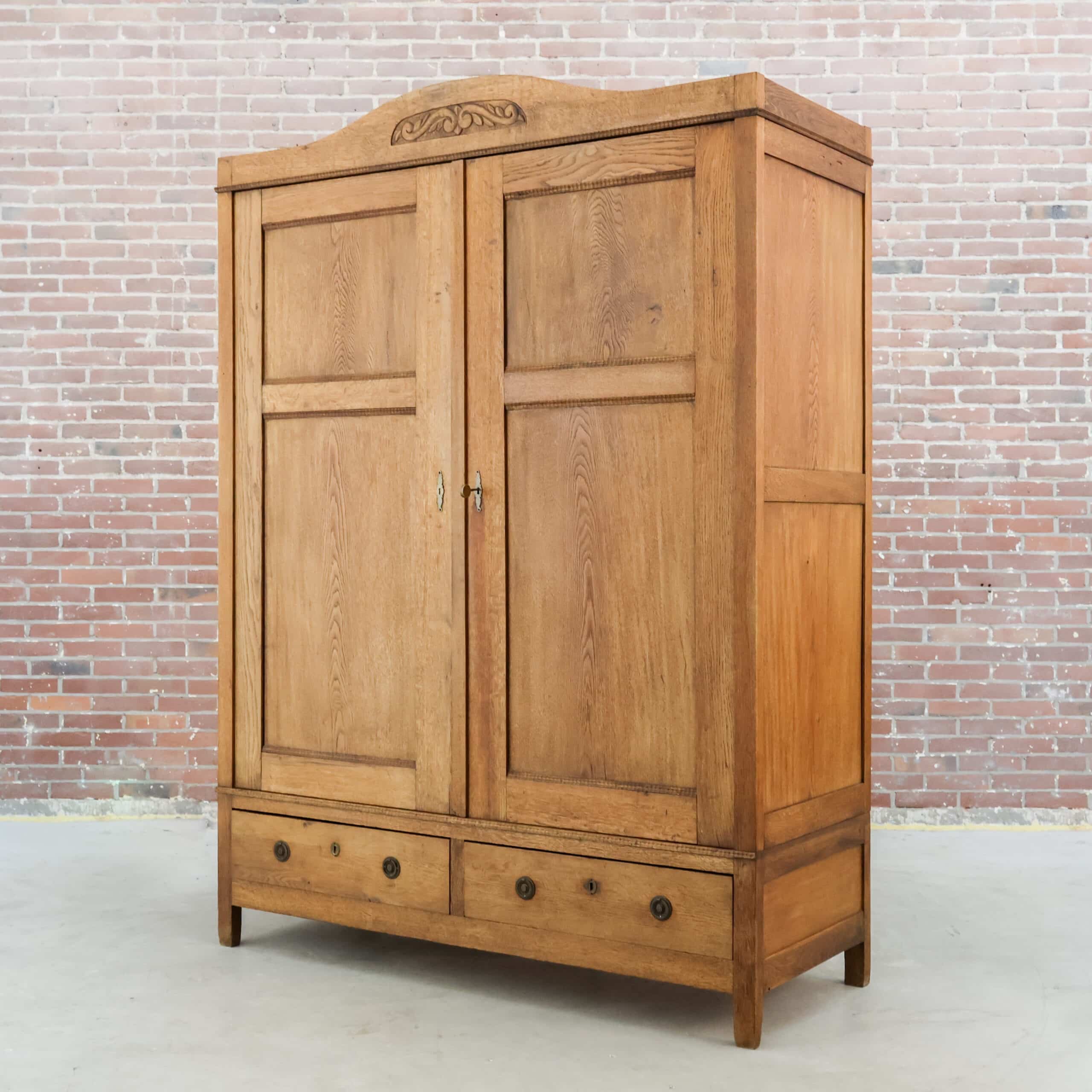 Sfeervolle antieke kledingkast (demontabel) met een warme houtkleur en een prachtig gesneden ornament in de kuif. Achter de twee deuren vind je een ruime indeling met legplanken, ideaal voor linnengoed, kleding of servies. Onderaan zitten twee grote lades voor extra opbergruimte, super praktisch én mooi in balans met het klassieke model. De kast heeft charmante gebruikssporen passend bij de leeftijd.