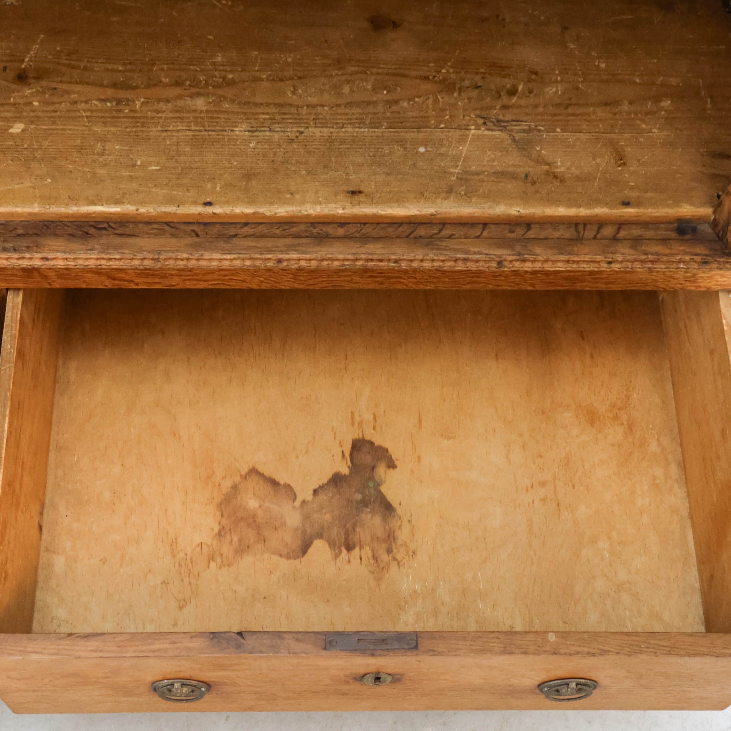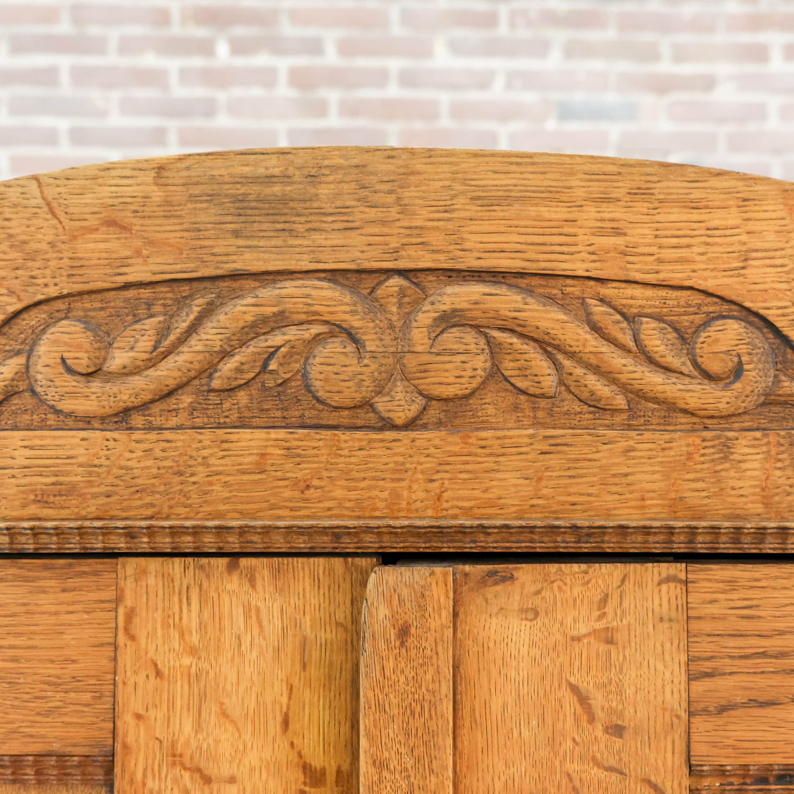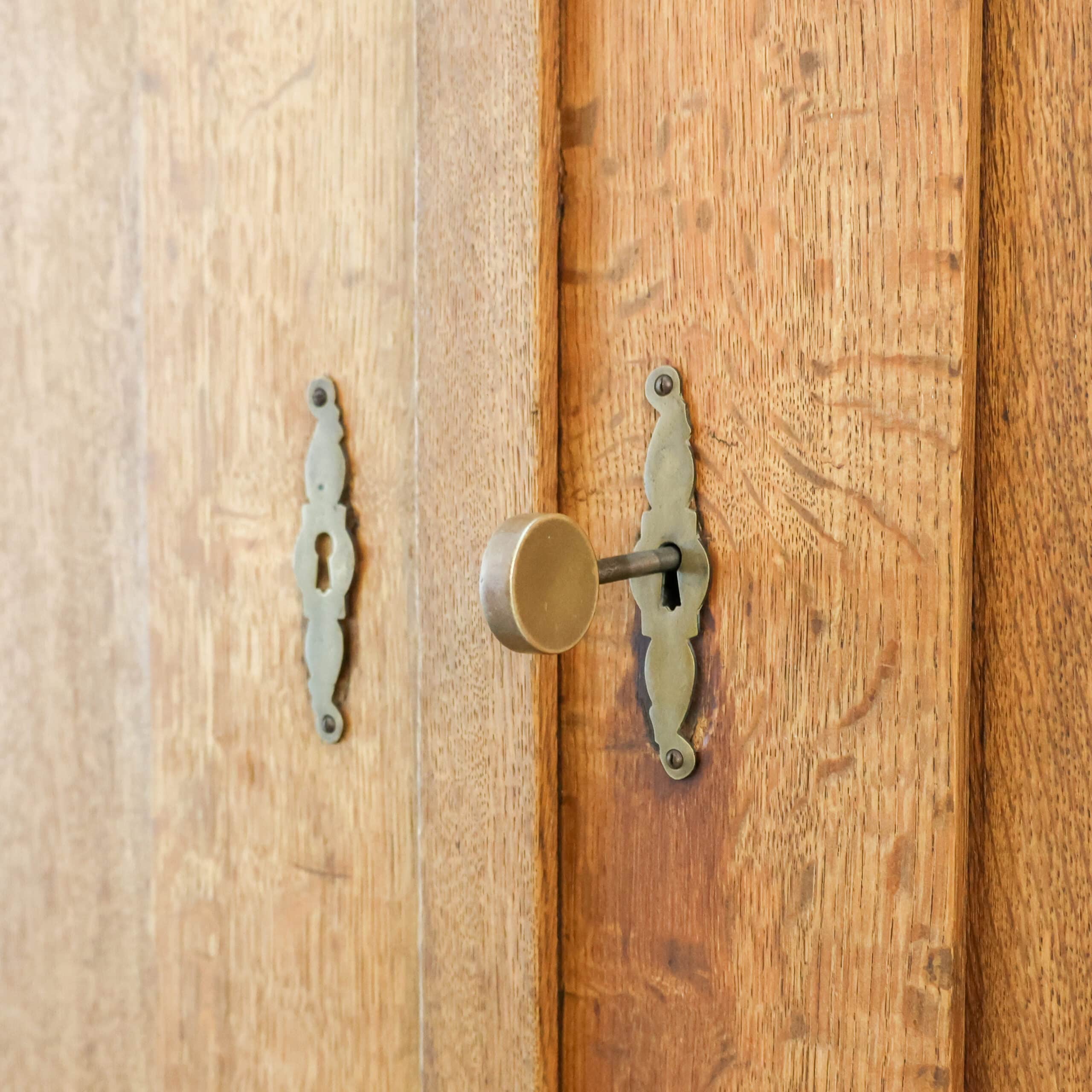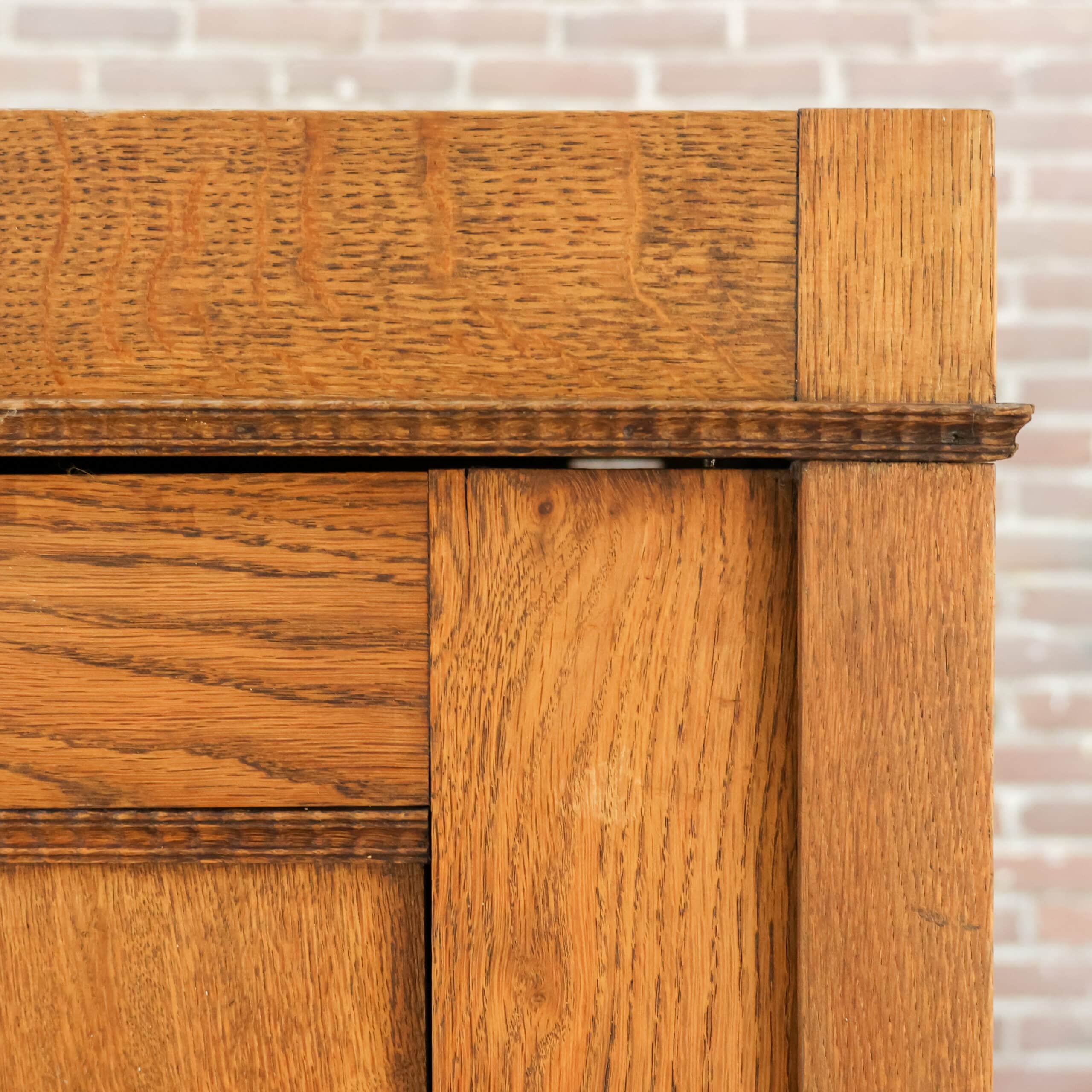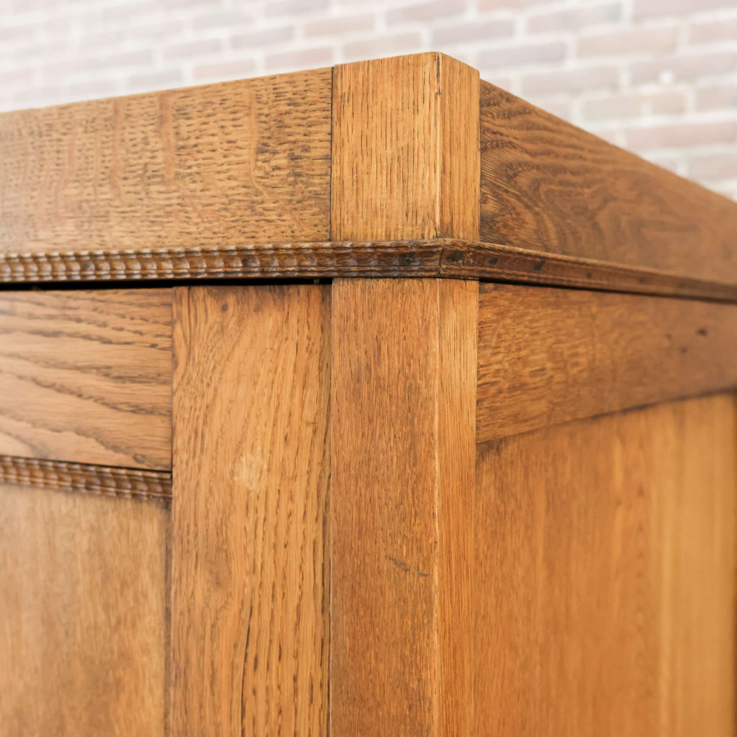 Sfeervolle antieke kledingkast (demontabel) met een warme houtkleur en een prachtig gesneden ornament in de kuif. Achter de twee deuren vind je een ruime indeling met legplanken, ideaal voor linnengoed, kleding of servies. Onderaan zitten twee grote lades voor extra opbergruimte, super praktisch én mooi in balans met het klassieke model. De kast heeft charmante gebruikssporen passend bij de leeftijd.