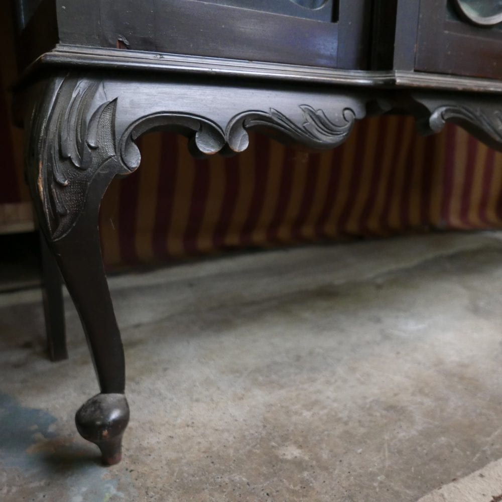 Prachtige antieke spiegelkast gemaakt van hout. De kast bestaat uit één stuk. De bovenkant heeft sierlijke houten rondingen en bogen rondom drie spiegels met geslepen glas. De onderkant van de kast heeft drie glazen deuren, met messing sloten, naar een ruimte met één plank. De kast heeft onderin één lades met messing grepen. Een antieke kast die nog een kans mag hebben.