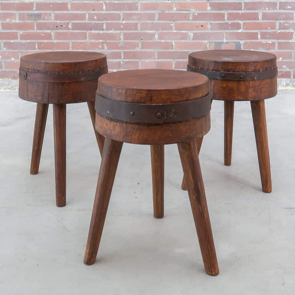 Deze authetieke houten krukjes zijn echte oude werkstukken: zwaar, massief en prachtig doorleefd. De ronde zittingen zijn verstevigd met originele ijzeren banden, wat ze een stoere, rustieke uitstraling geeft.