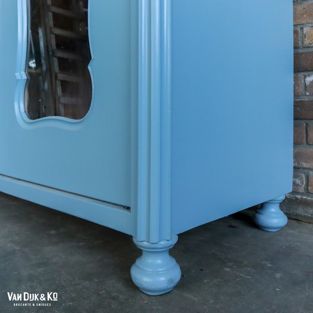 Mooi! Deze brocante blauwe vitrinekast uit Hongarije! We hebben haar opgeknapt waar nodig, zo heeft ze naast drie nieuwe planken ook een mooie blauwe tint gekregen.  Het leuke aan de kast zijn de twee lades onderin aan de binnenkant. Heel speciaal!