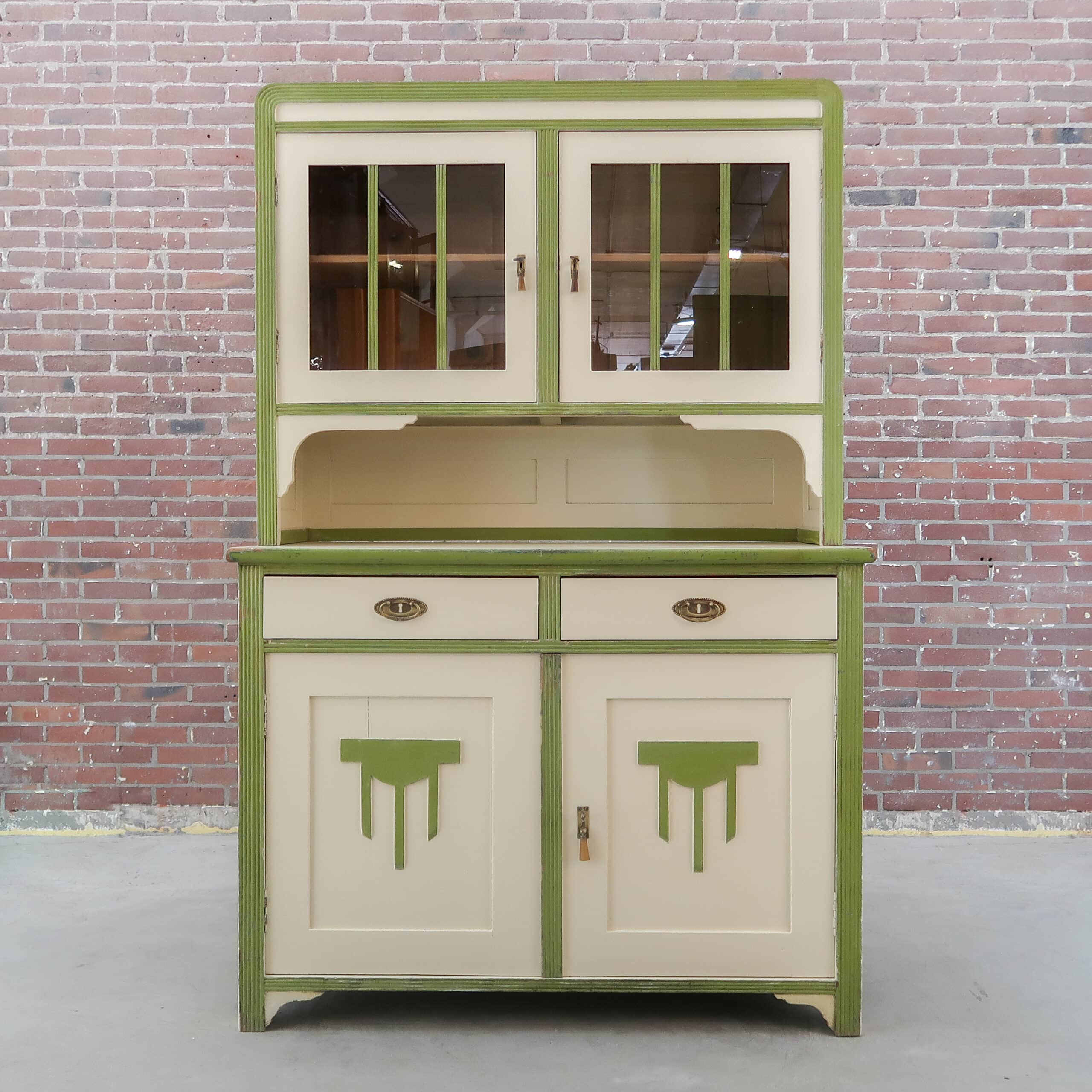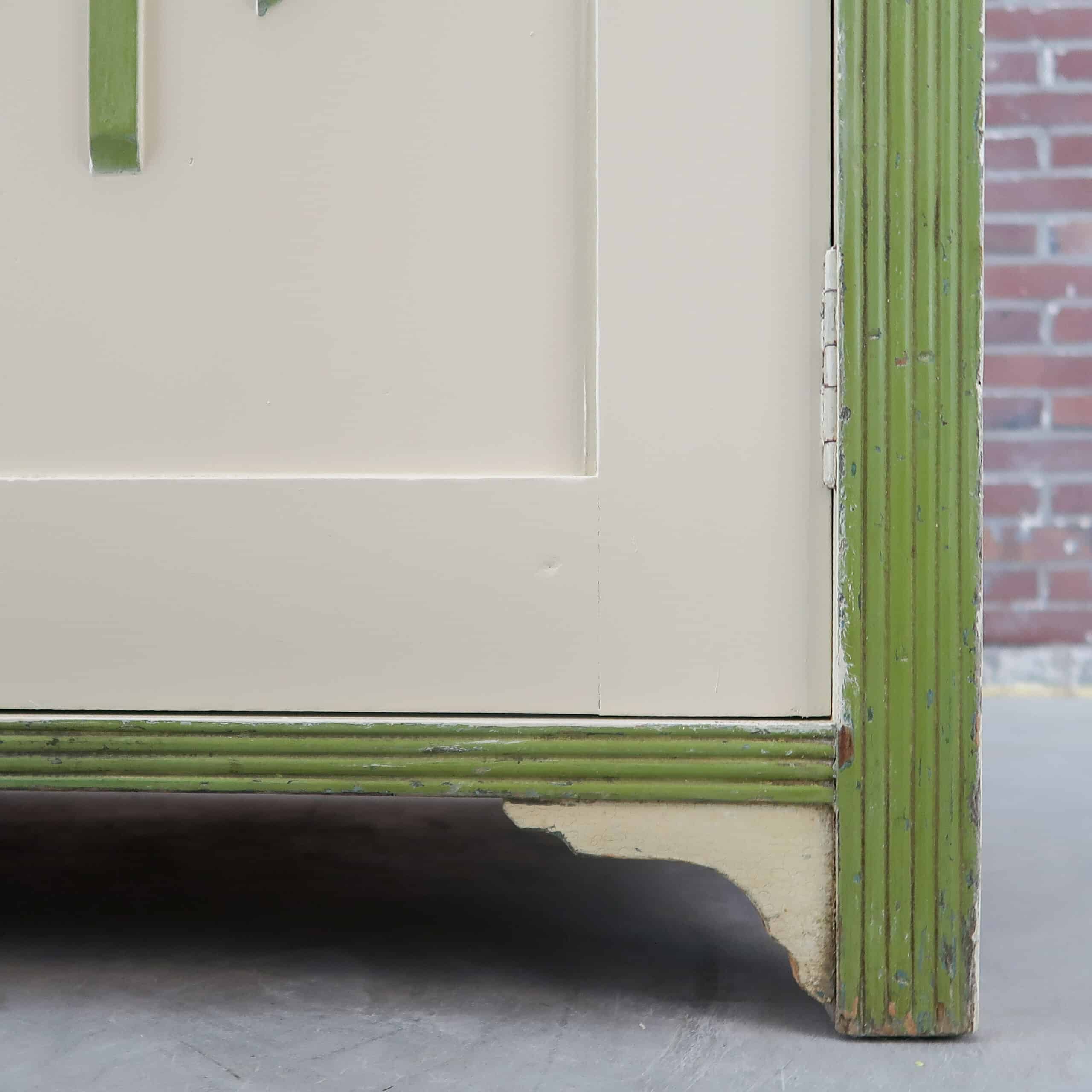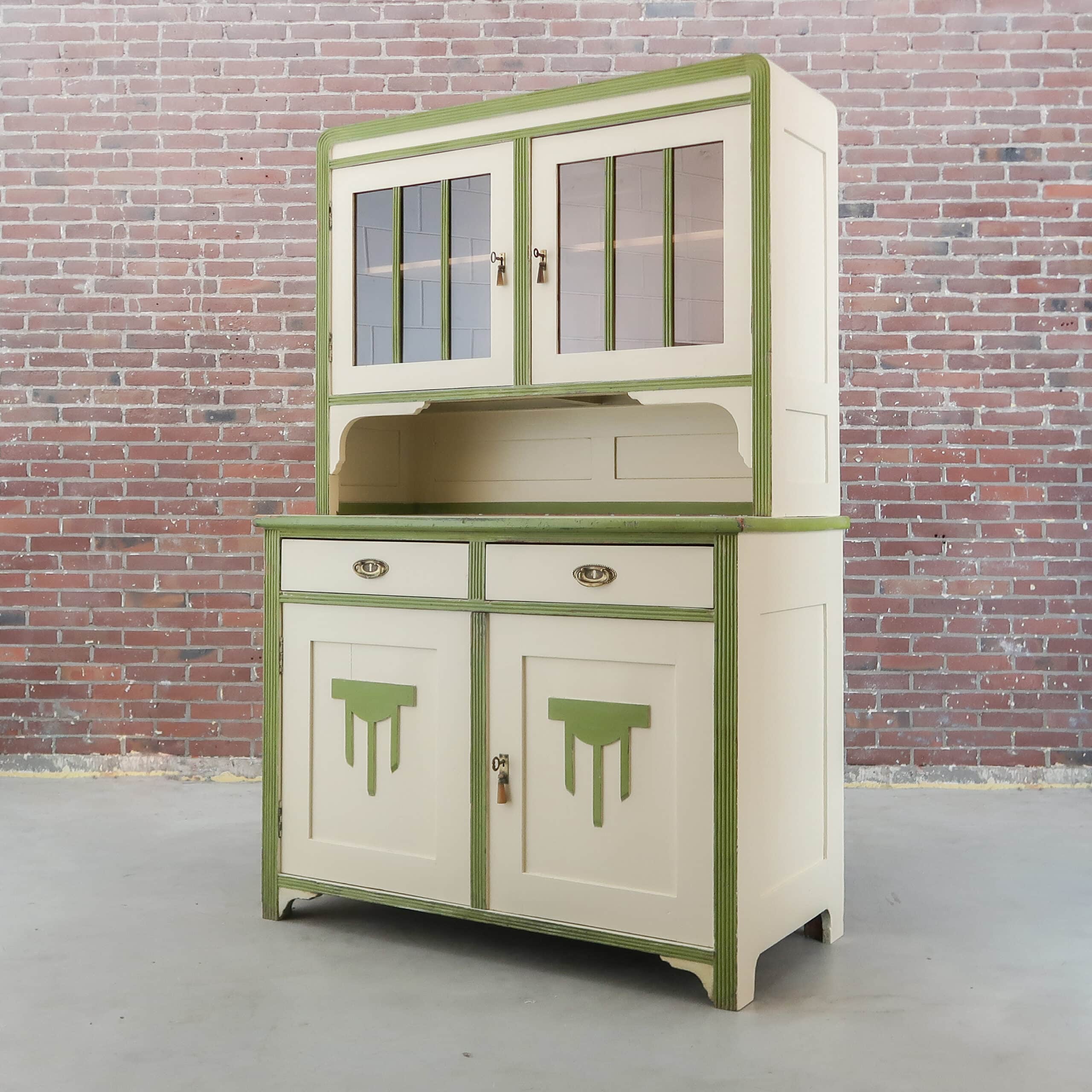 Deze prachtige brocante buffetkast hebben we gevonden in Hongarije. De kast heeft een mooie lichte kleur met groene accenten, daarmee is het echt een sfeermaker voor in de keuken of woonkamer.