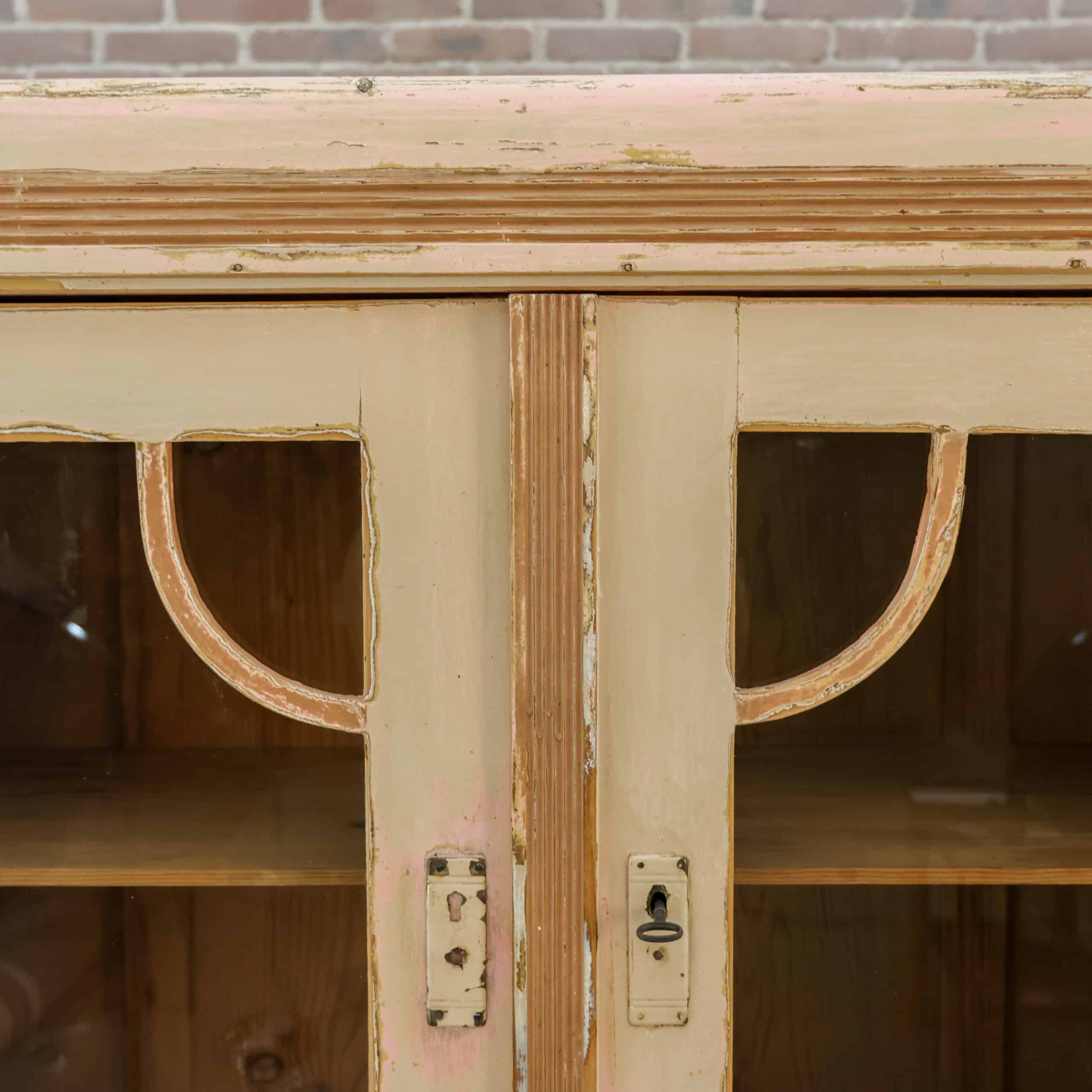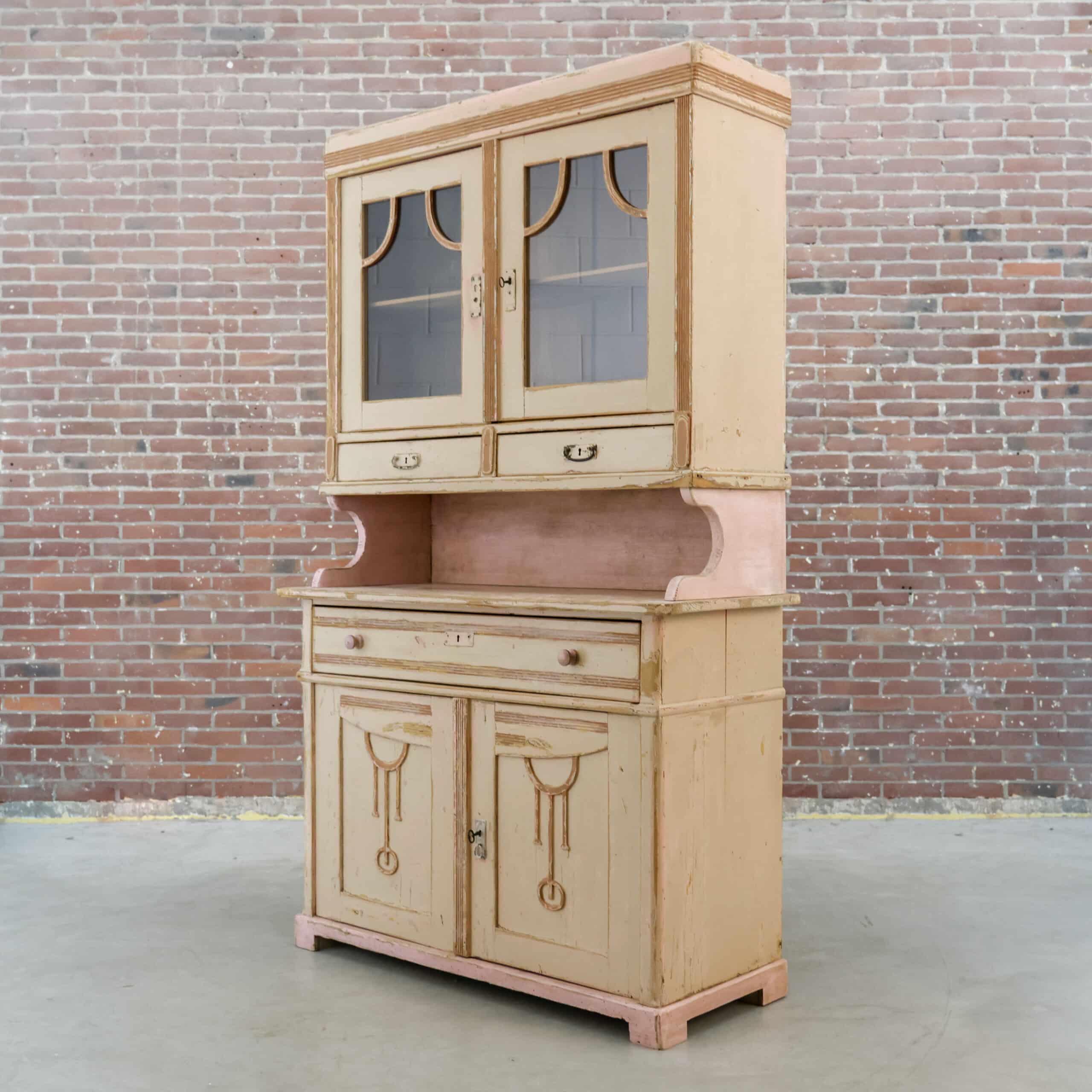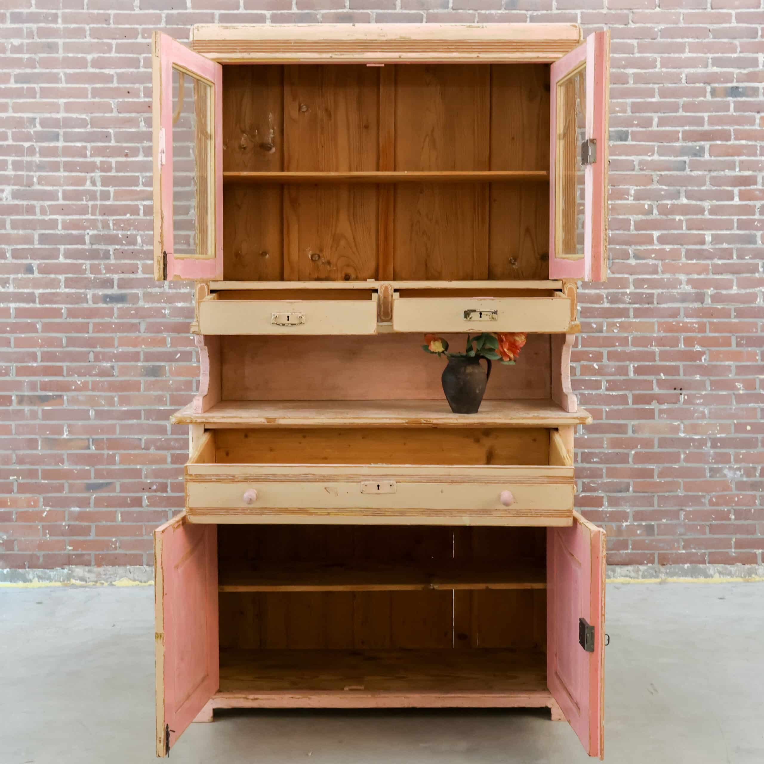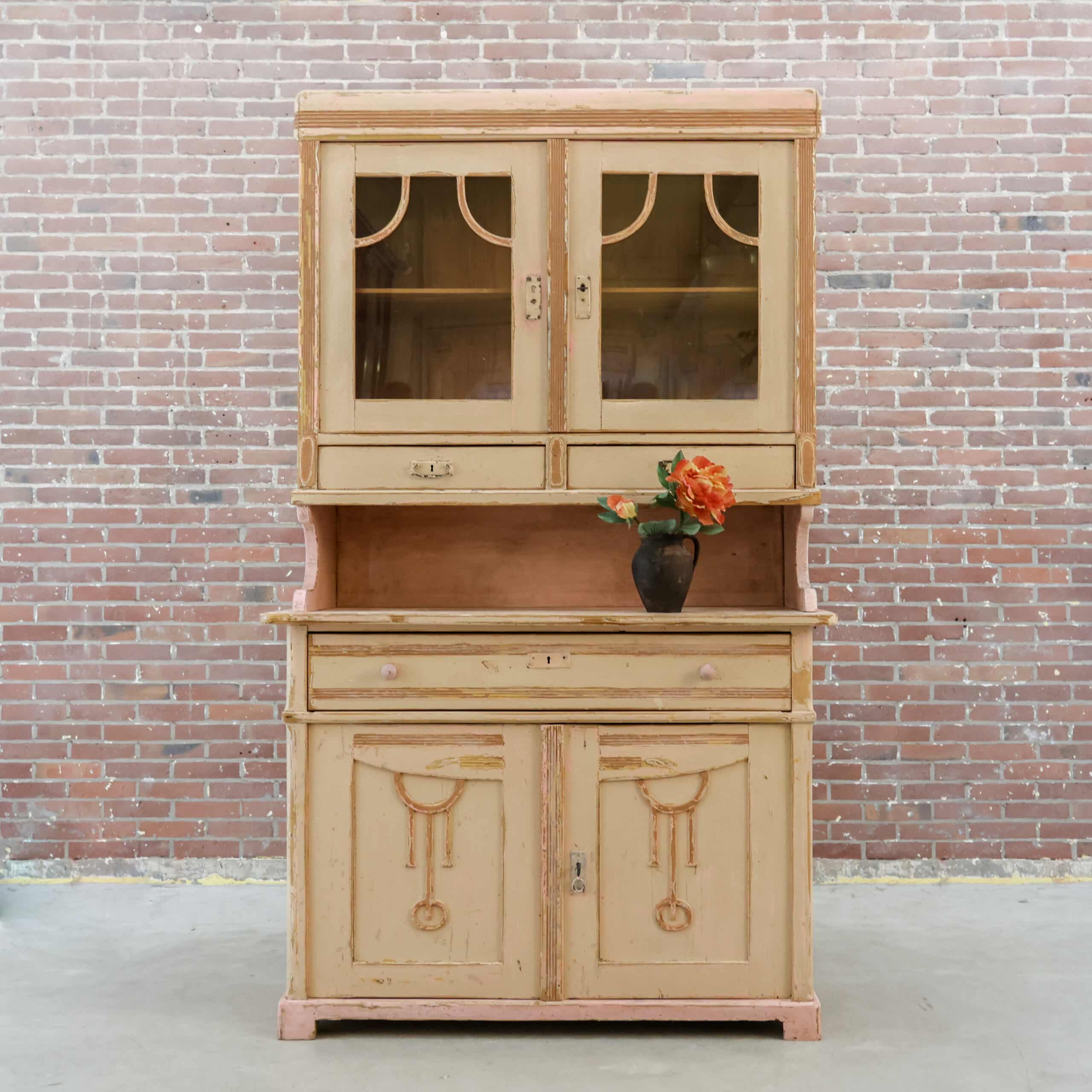 Prachtige brocante buffetkast met een zacht verweerde verflaag in warme crème- en roze tinten, vol karakter en charme. De combinatie van glasdeuren, open middendeel en gesloten onderkast maakt haar zowel sfeervol als praktisch in gebruik. Een echte blikvanger die meteen warmte en authenticiteit brengt in een landelijk of vintage interieur.