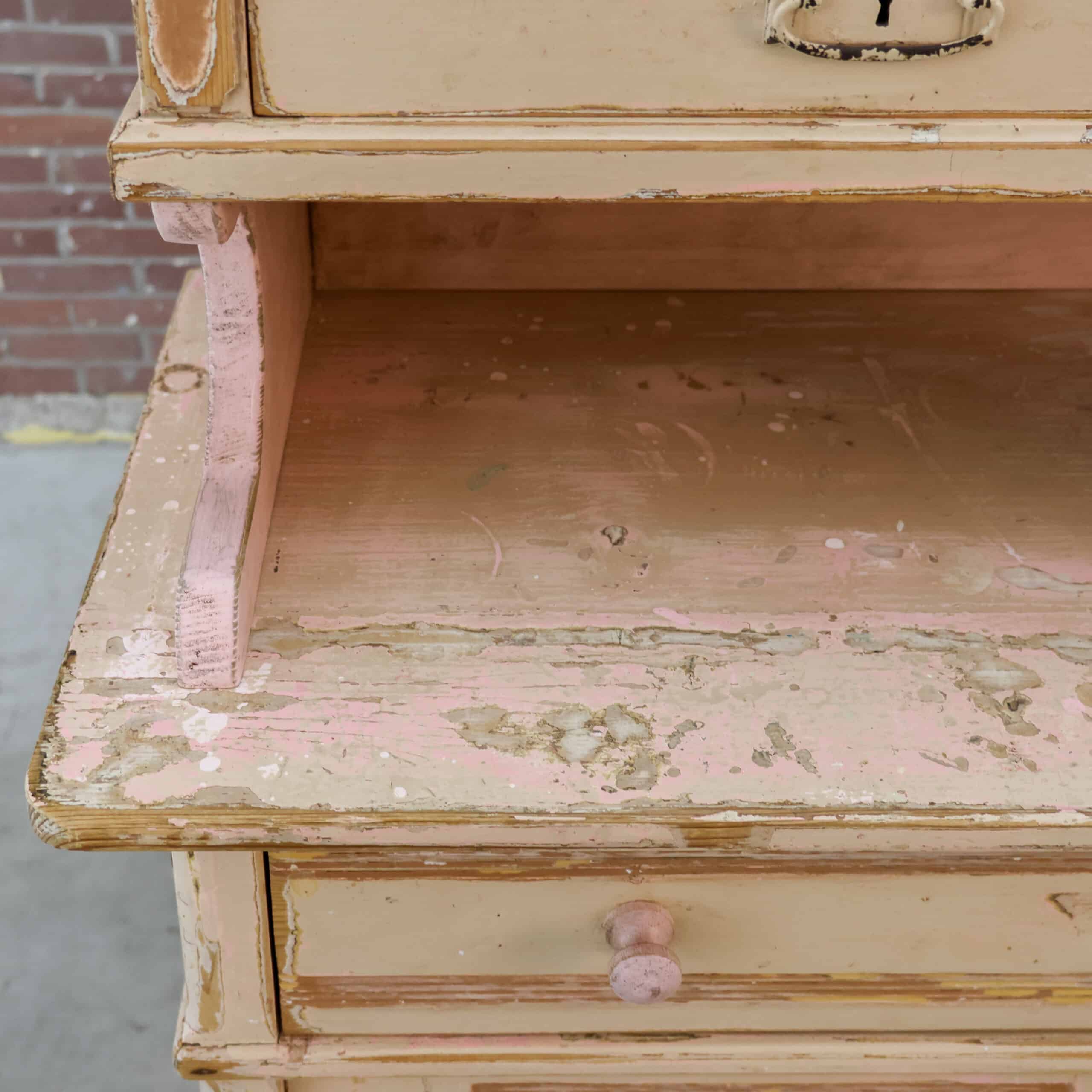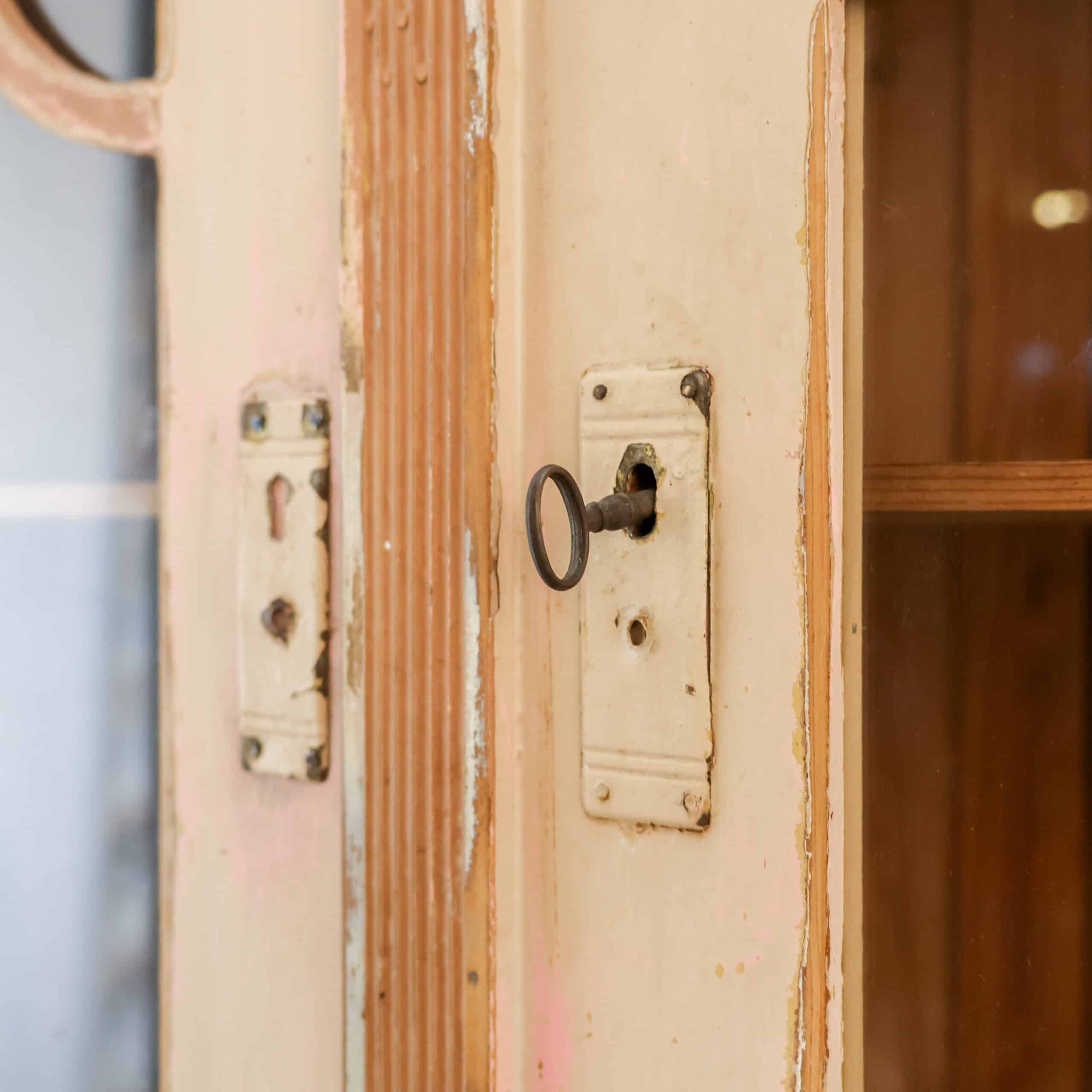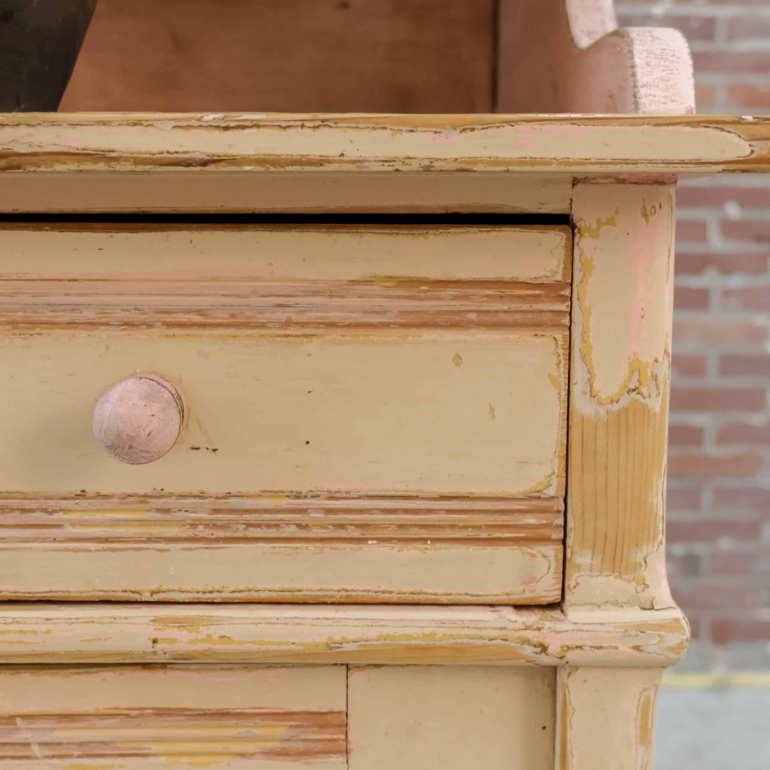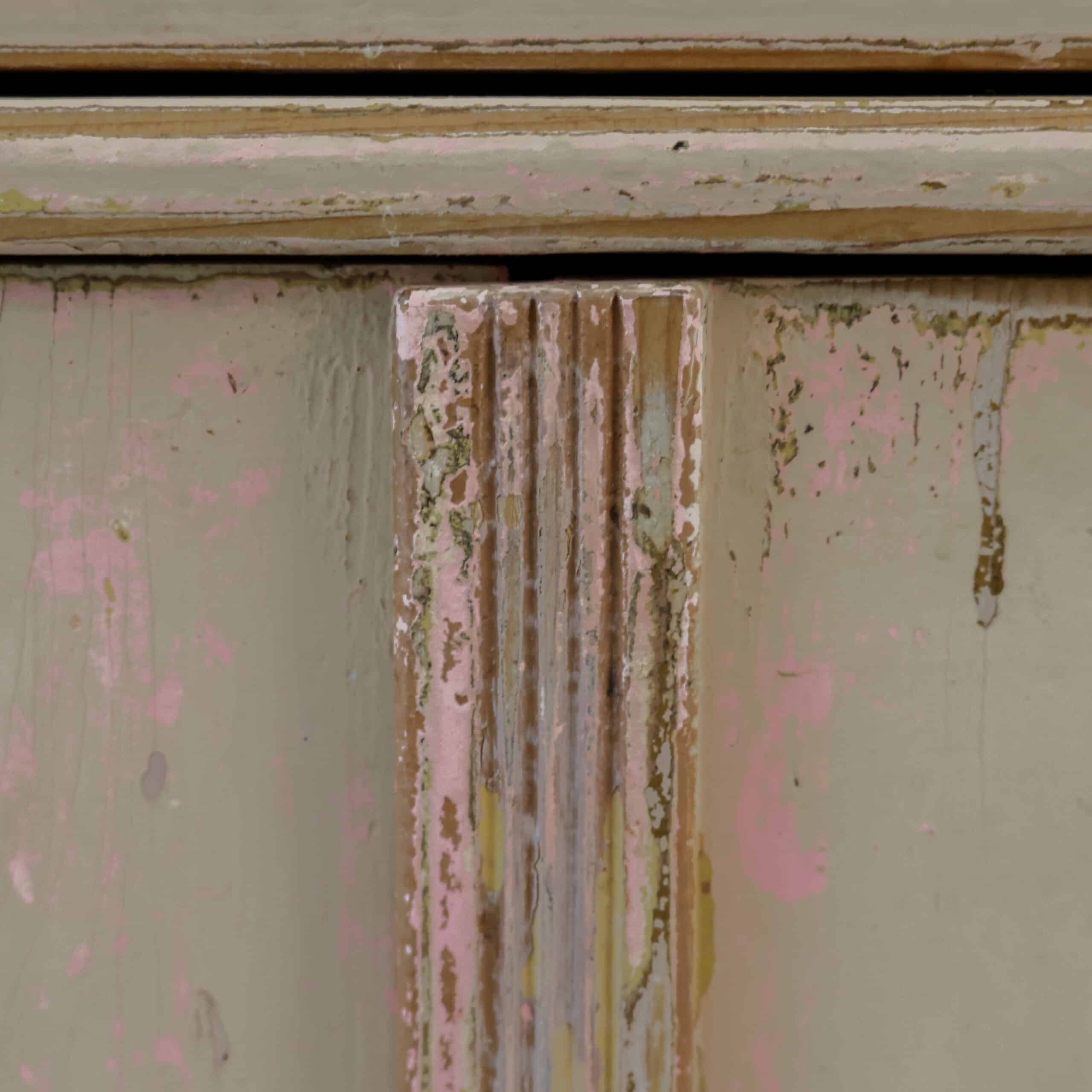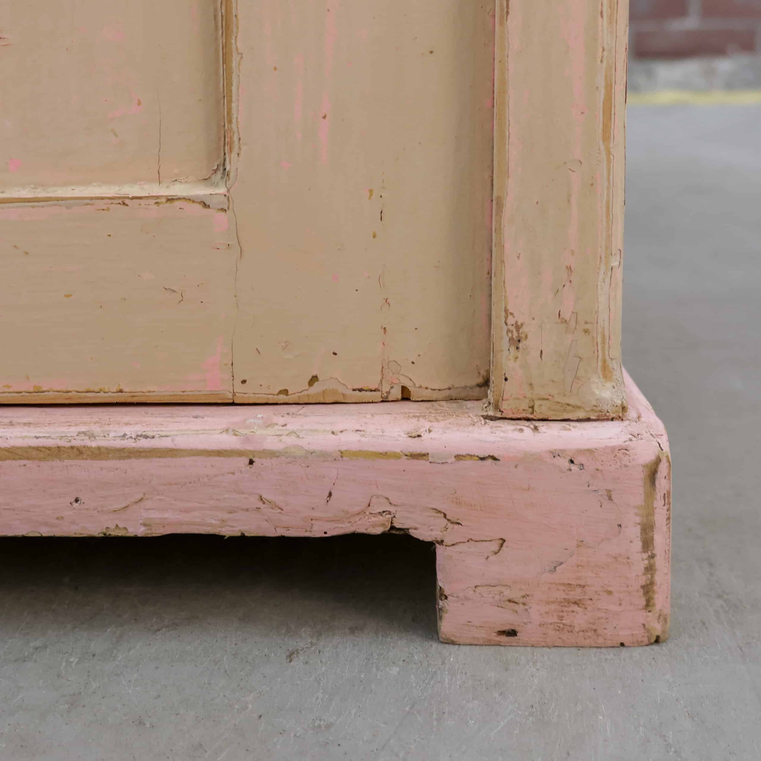 Prachtige brocante buffetkast met een zacht verweerde verflaag in warme crème- en roze tinten, vol karakter en charme. De combinatie van glasdeuren, open middendeel en gesloten onderkast maakt haar zowel sfeervol als praktisch in gebruik. Een echte blikvanger die meteen warmte en authenticiteit brengt in een landelijk of vintage interieur.