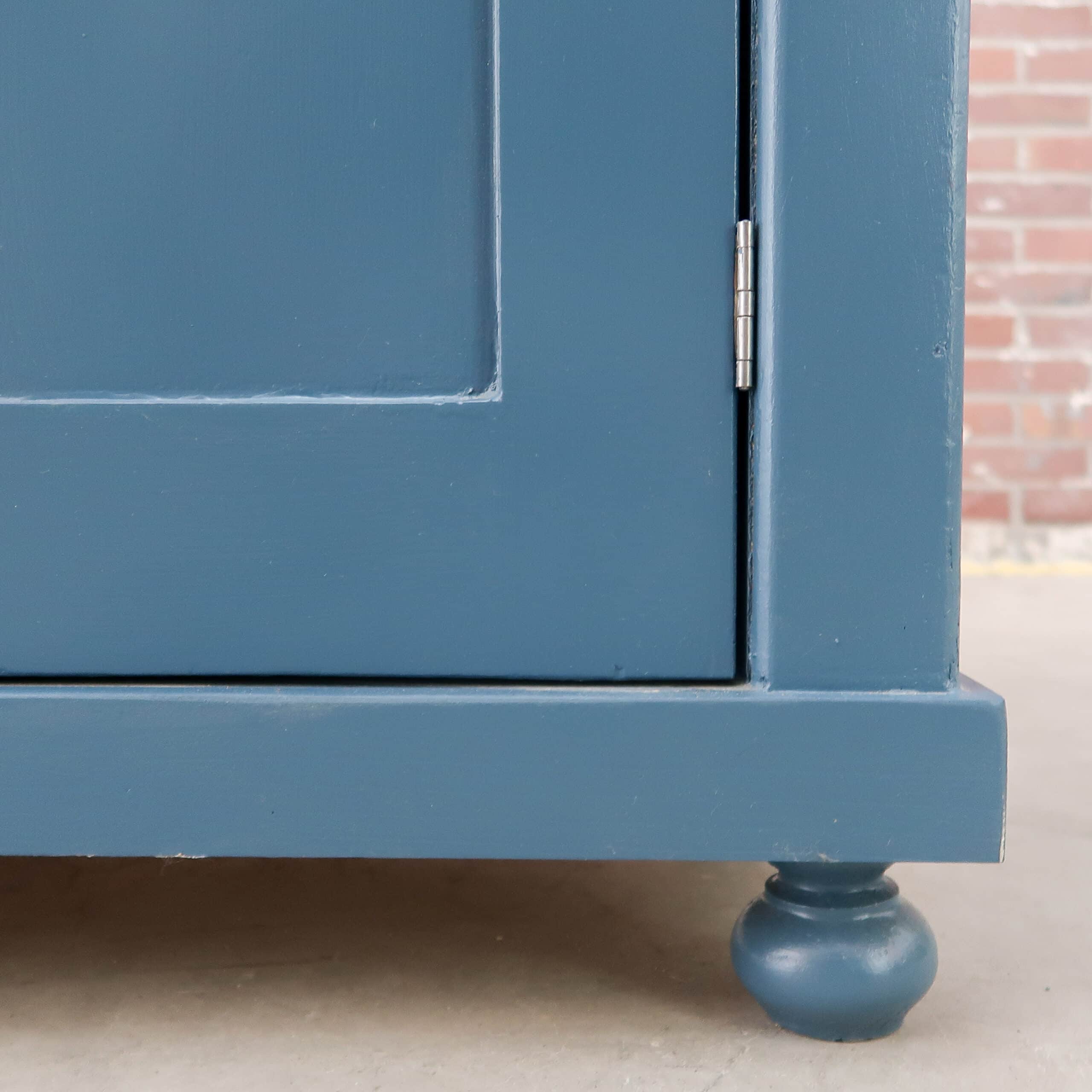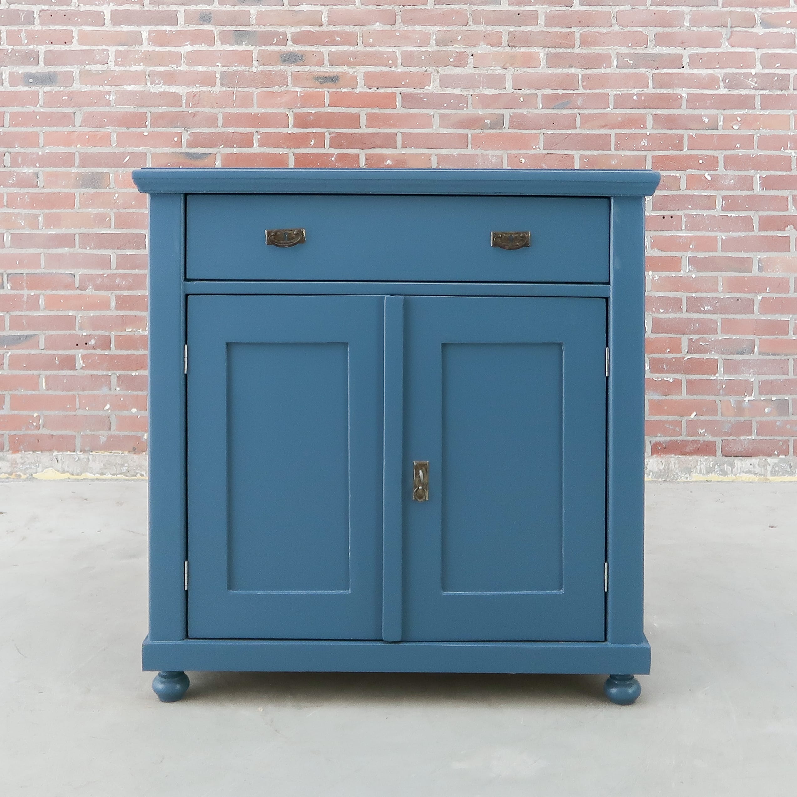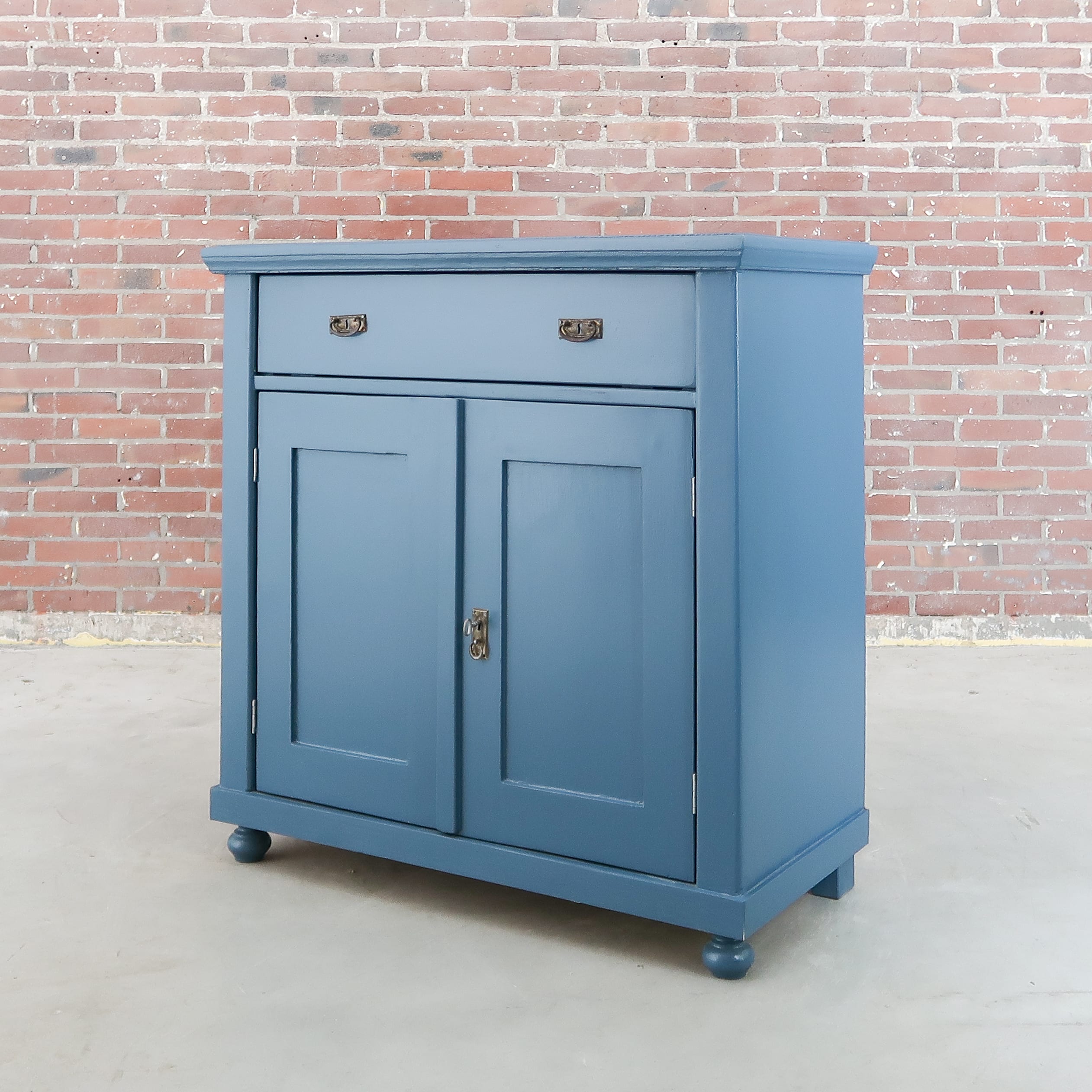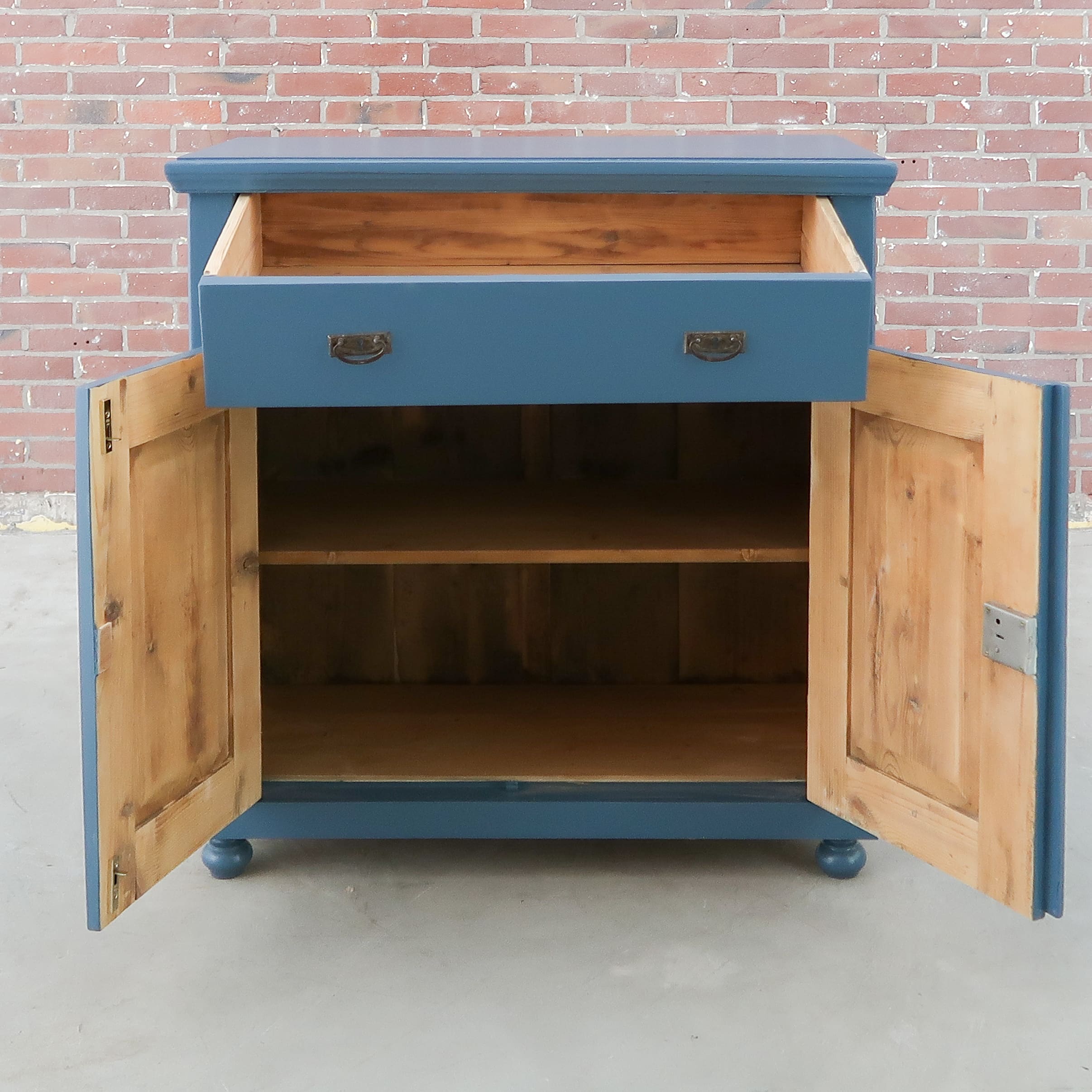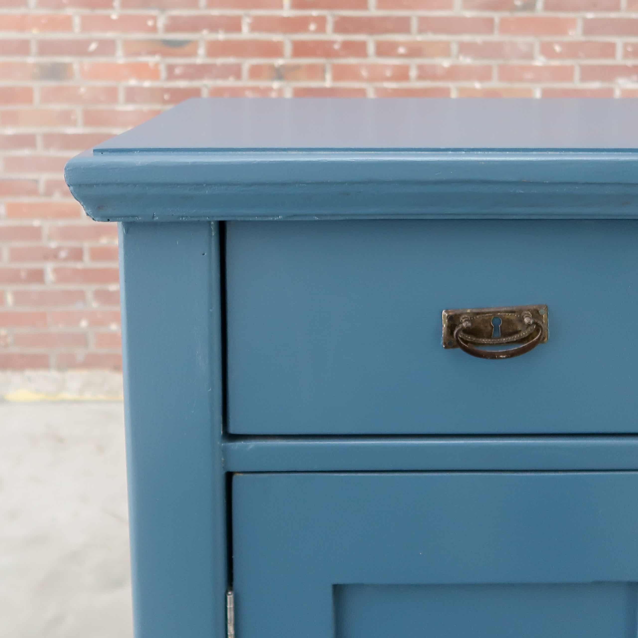 Leuk brocante dressoir uit Hongarije met in een blauwe kleur! Het kastje heeft twee lades en simpele klassieke look. Handig voor bijvoorbeeld een babykamer.