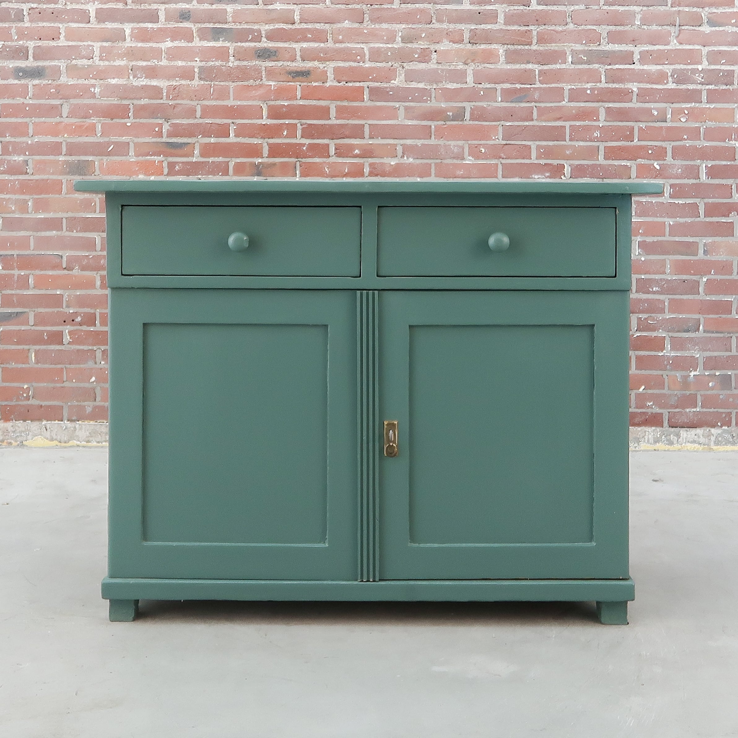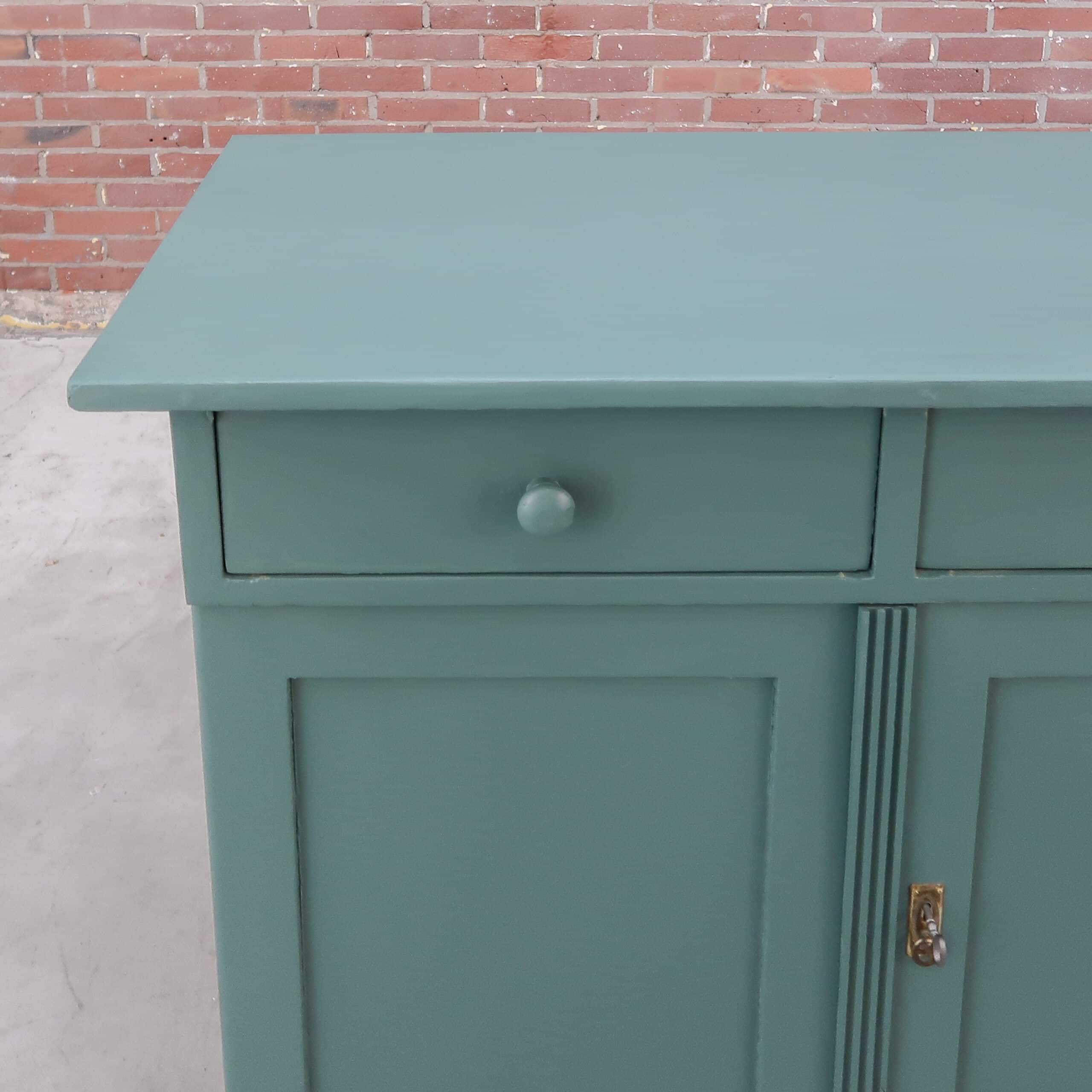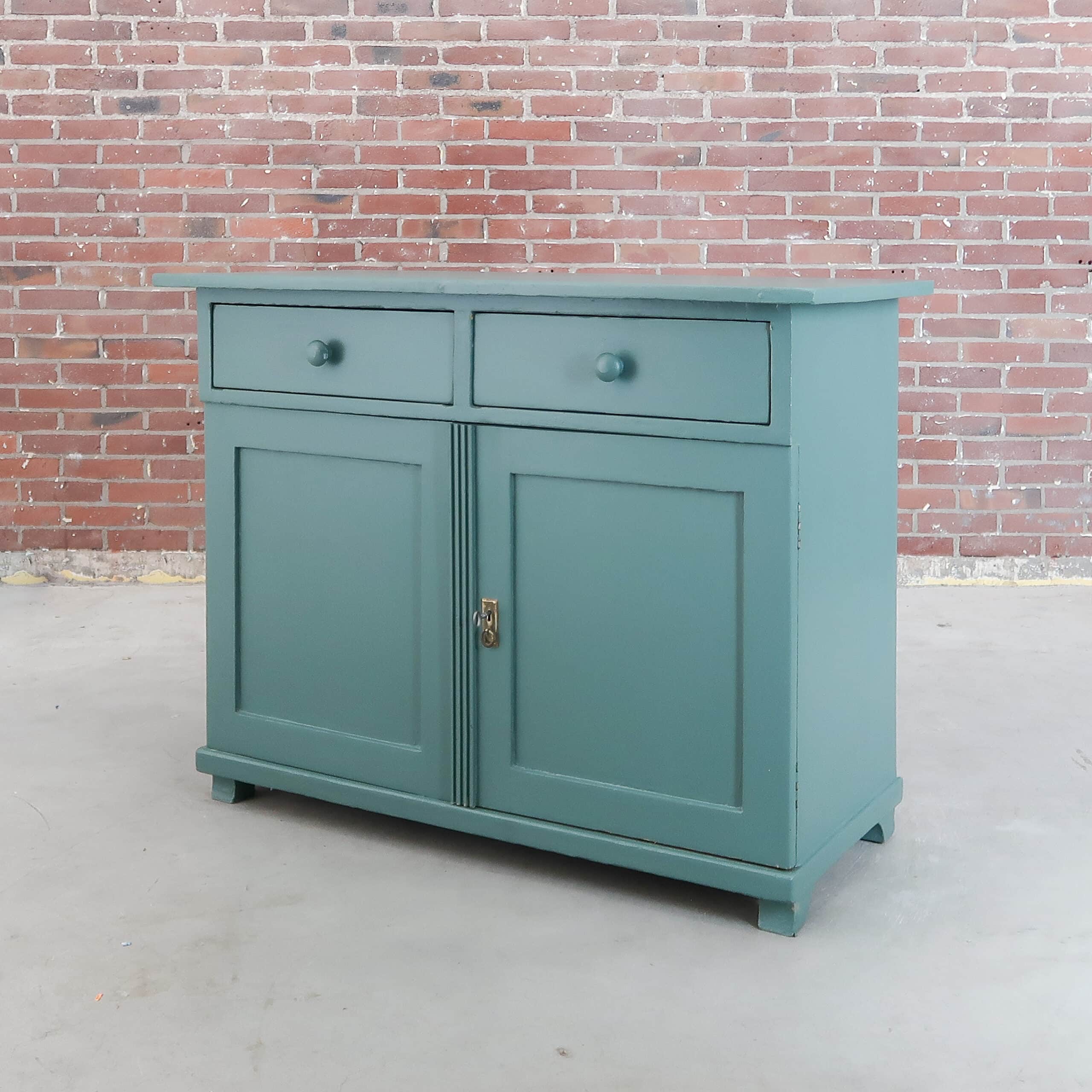 Leuk brocante dressoir uit Hongarije met in een blauwe kleur! Het kastje heeft twee lades en simpele klassieke look. Handig voor bijvoorbeeld een babykamer.