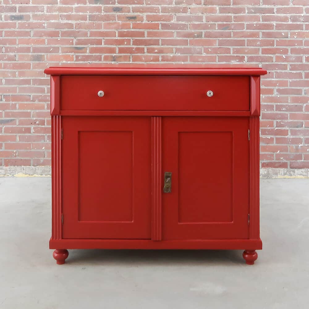 Leuk brocante dressoir met een mooie diep rode kleur! Het kastje heeft een grote la en simpele klassieke look. Handig voor bijvoorbeeld een babykamer.