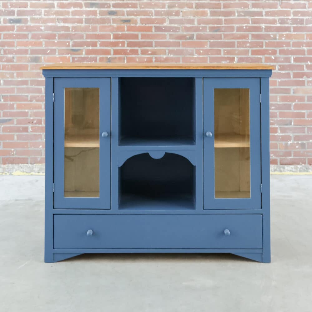 Brocante dressoir, gevonden en opgeknapt in Hongarije met een frisse, zachte uitstraling. De combinatie van het blauwe frame en het warme houten blad geeft het meubel een mooie balans. Voorzien van twee vitrine deurtjes en open vakken, ideaal voor zowel opbergen als decoreren. In nette staat met lichte sporen van gebruik die het karakter van het stuk versterken.
