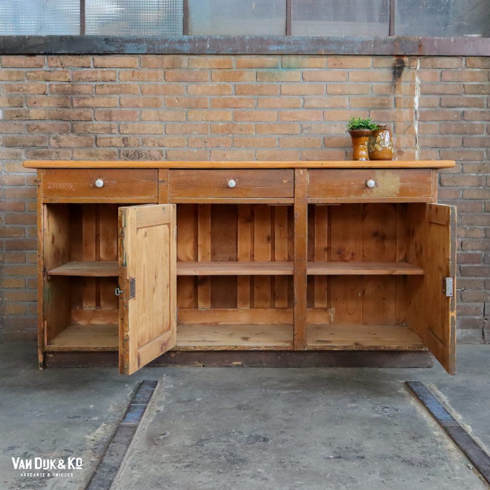 Dit brocante dressoir uit Hongarije is door de jaren prachtig doorleefd en dat maakt hem een echte sfeermaker. Van verweerde hoekjes tot geschreven teksten; je raakt op dit dressoir niet snel uitgekeken. Een meubel met een verhaal!