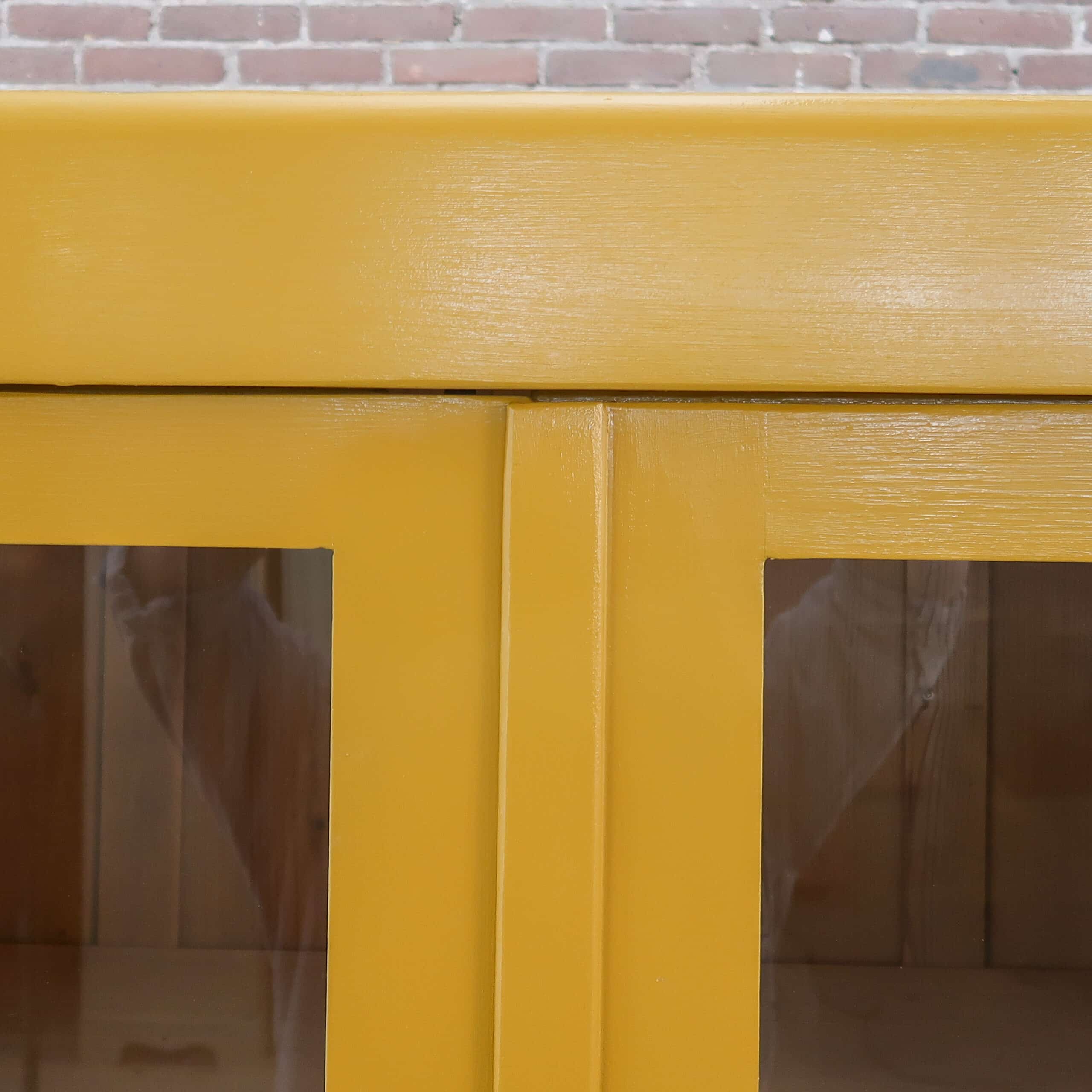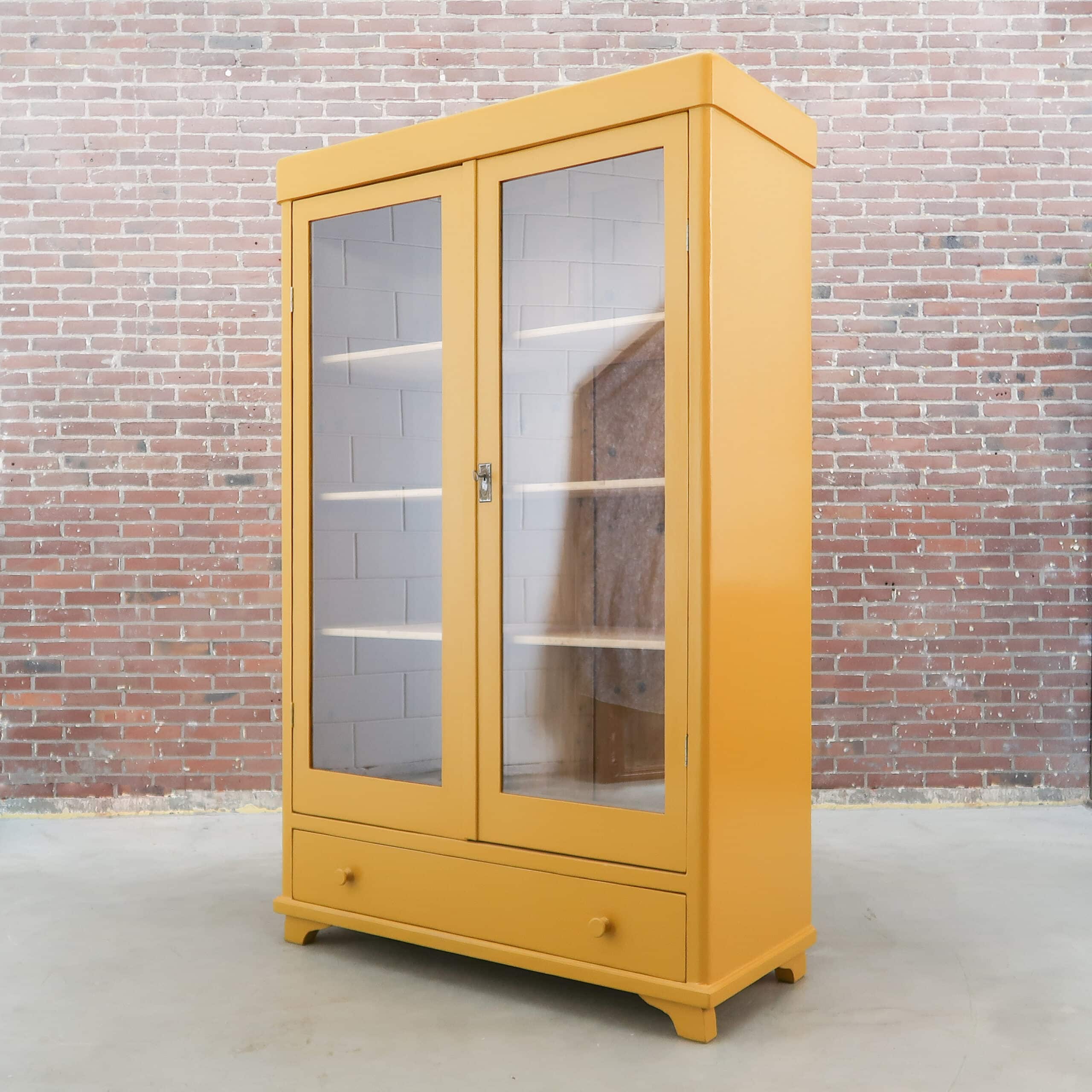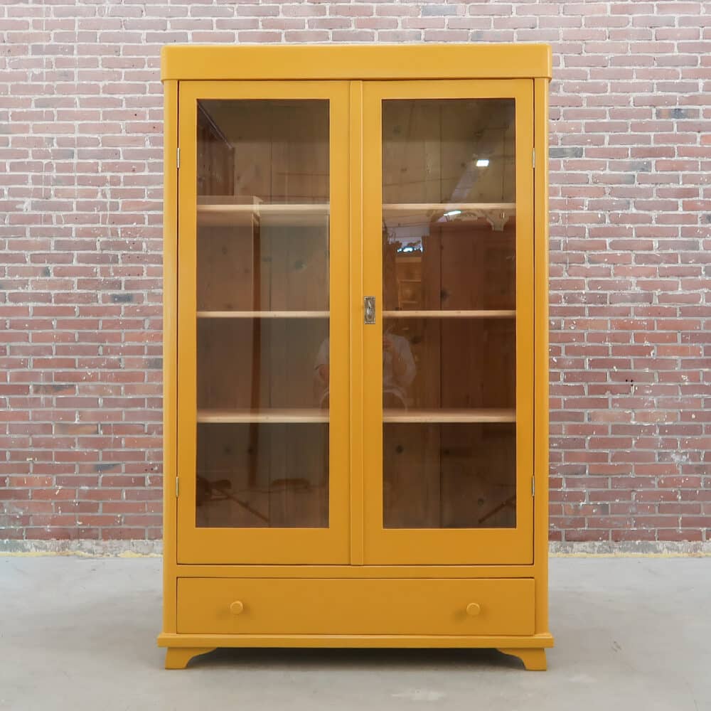 Deze brocante vitrinekast hebben we opgespeurd in Hongarije en opgeknapt waar nodig. Ze heeft ze oa nieuwe planken en een bijzondere kleur geel gekregen.