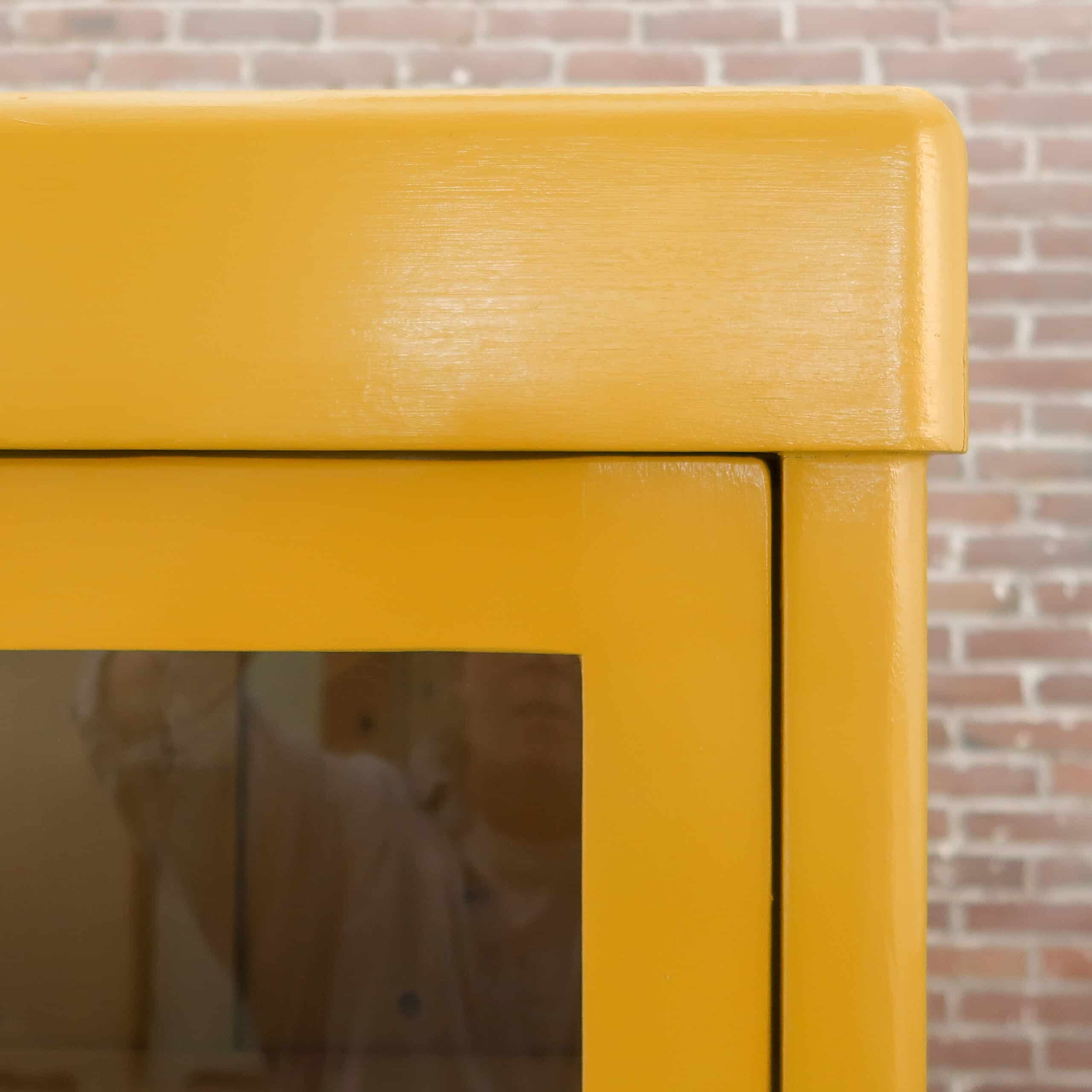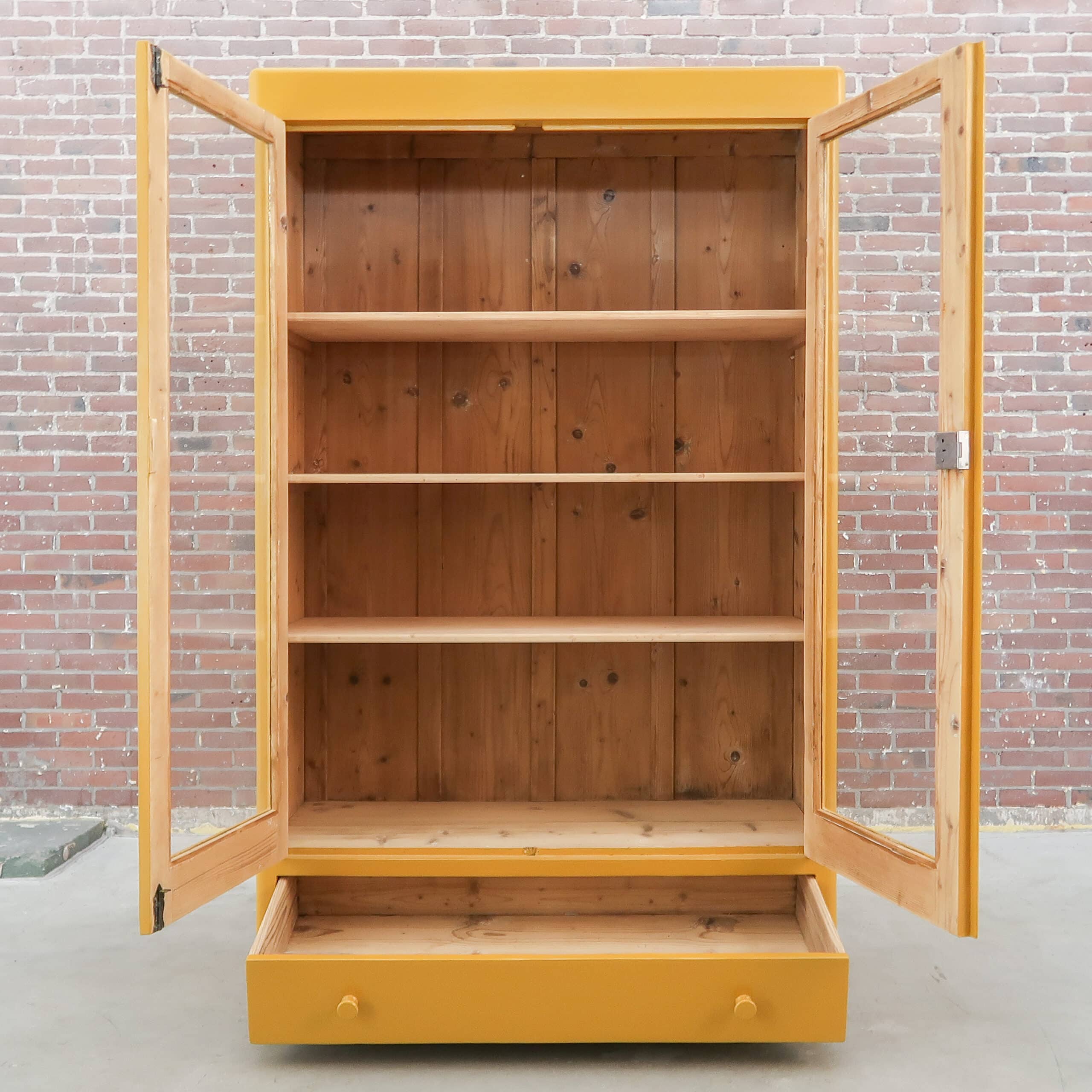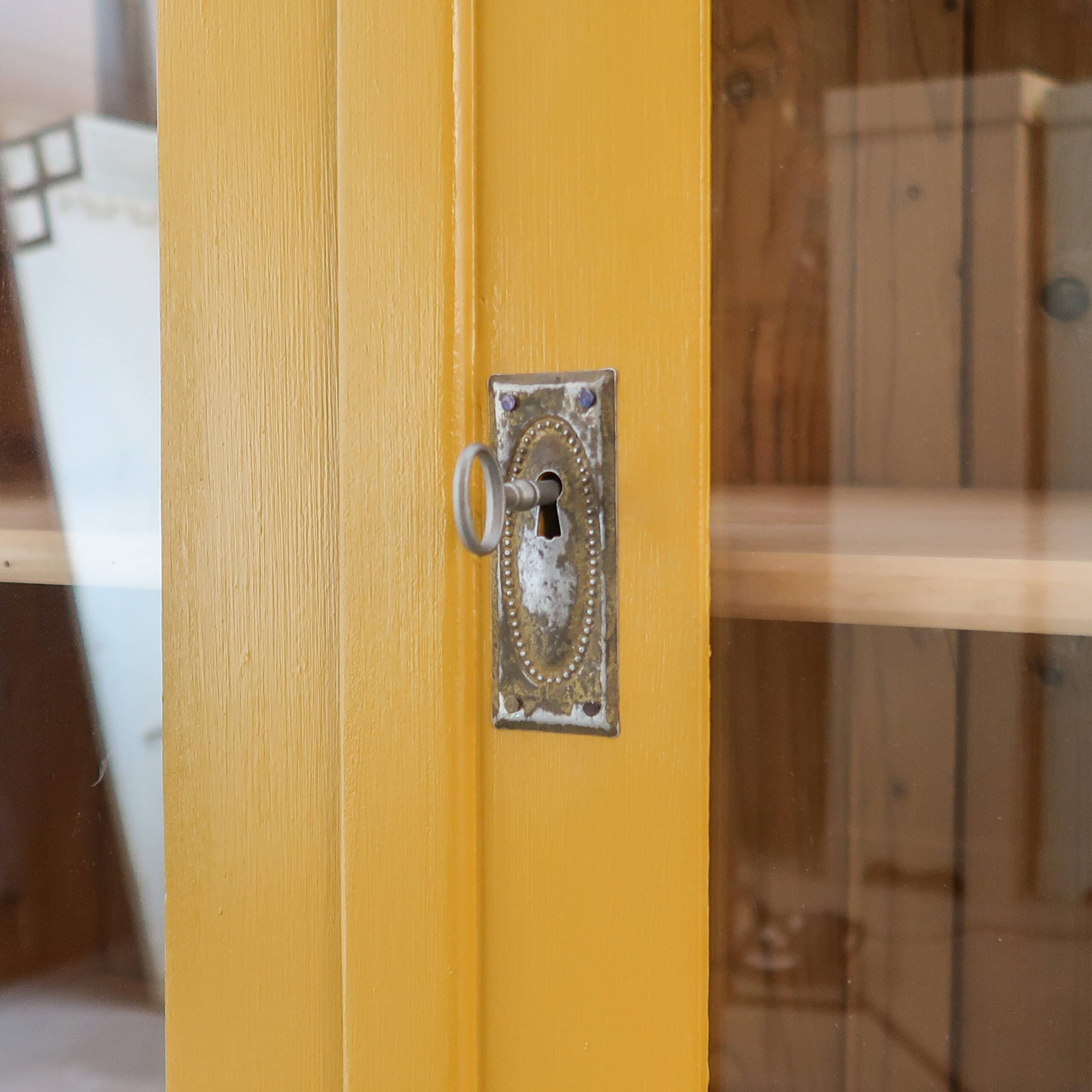 Deze brocante vitrinekast hebben we opgespeurd in Hongarije en opgeknapt waar nodig. Ze heeft ze oa nieuwe planken en een bijzondere kleur geel gekregen.