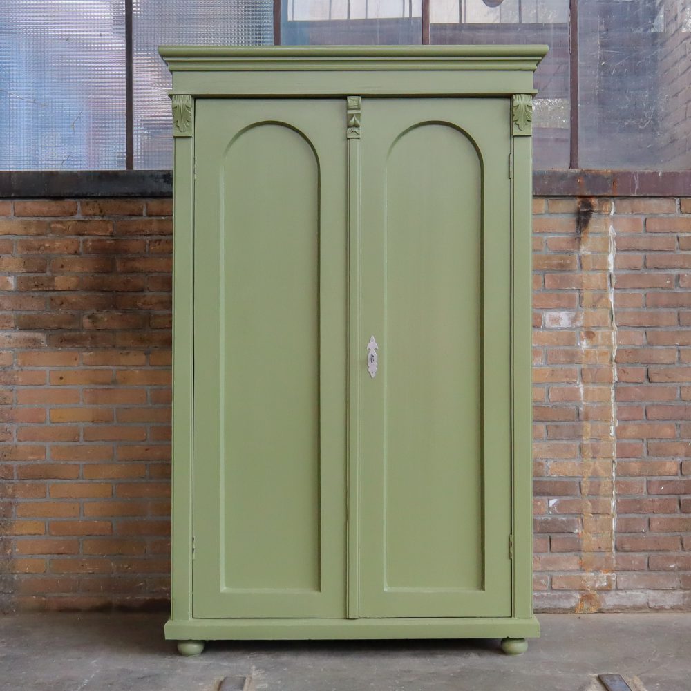 Deze brocante linnenkast hebben we opgespeurd in Hongarije en opgeknapt waar nodig. Ze heeft ze oa nieuwe planken en een klassieke groene kleur gekregen.
