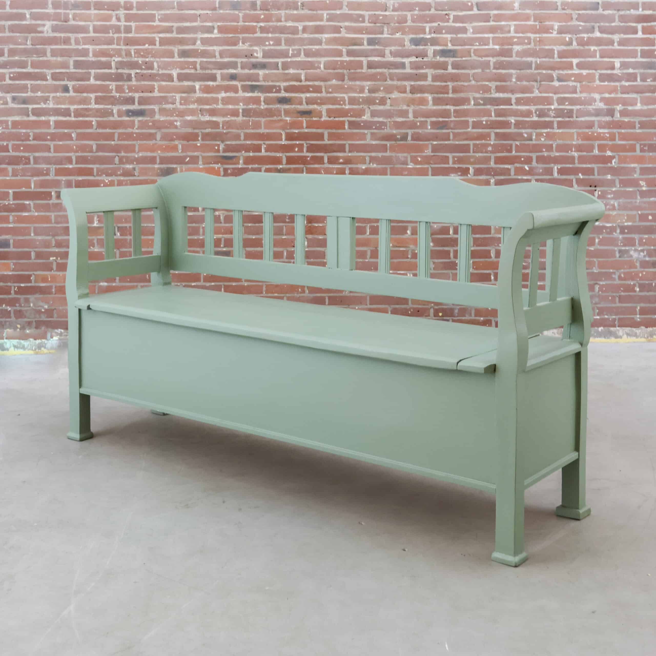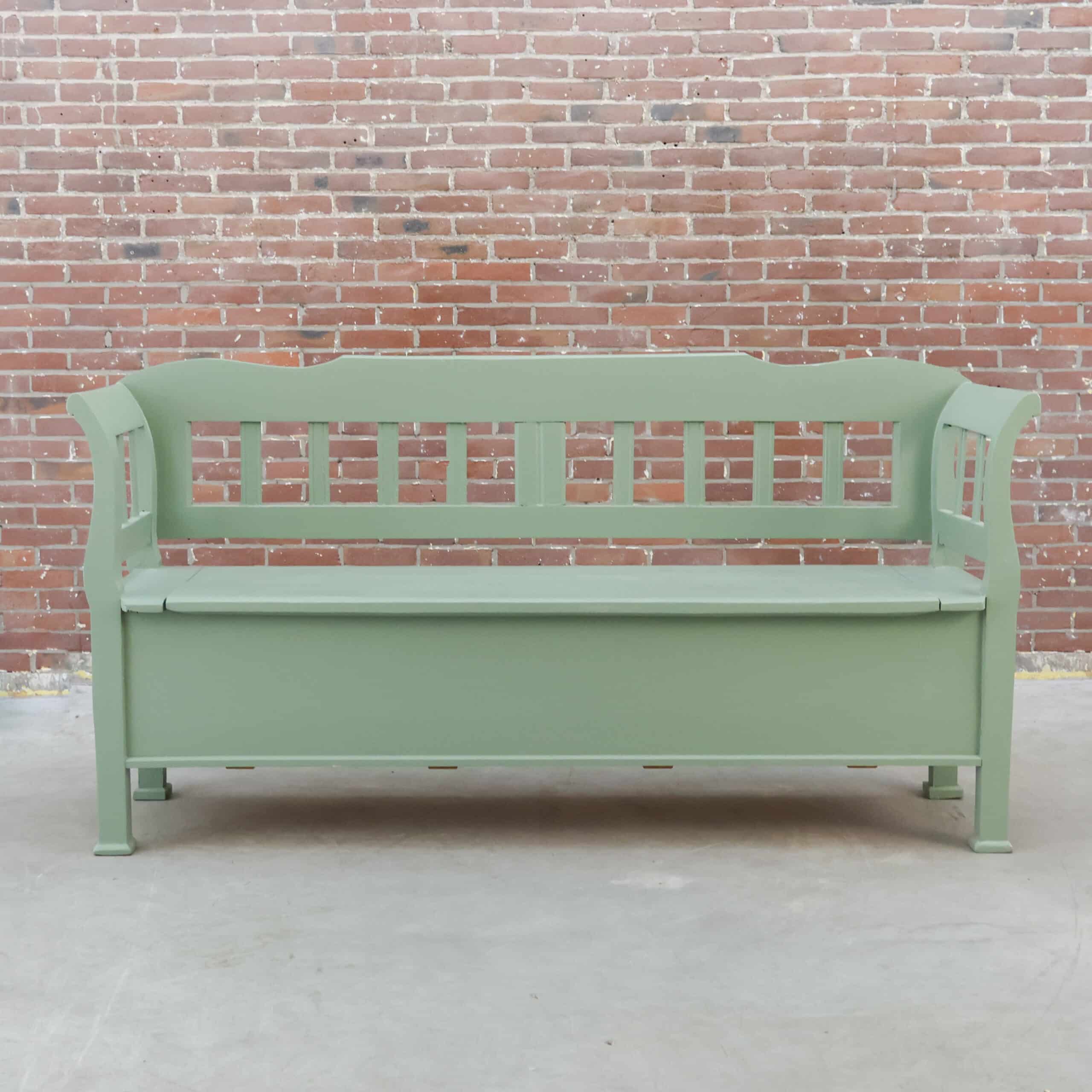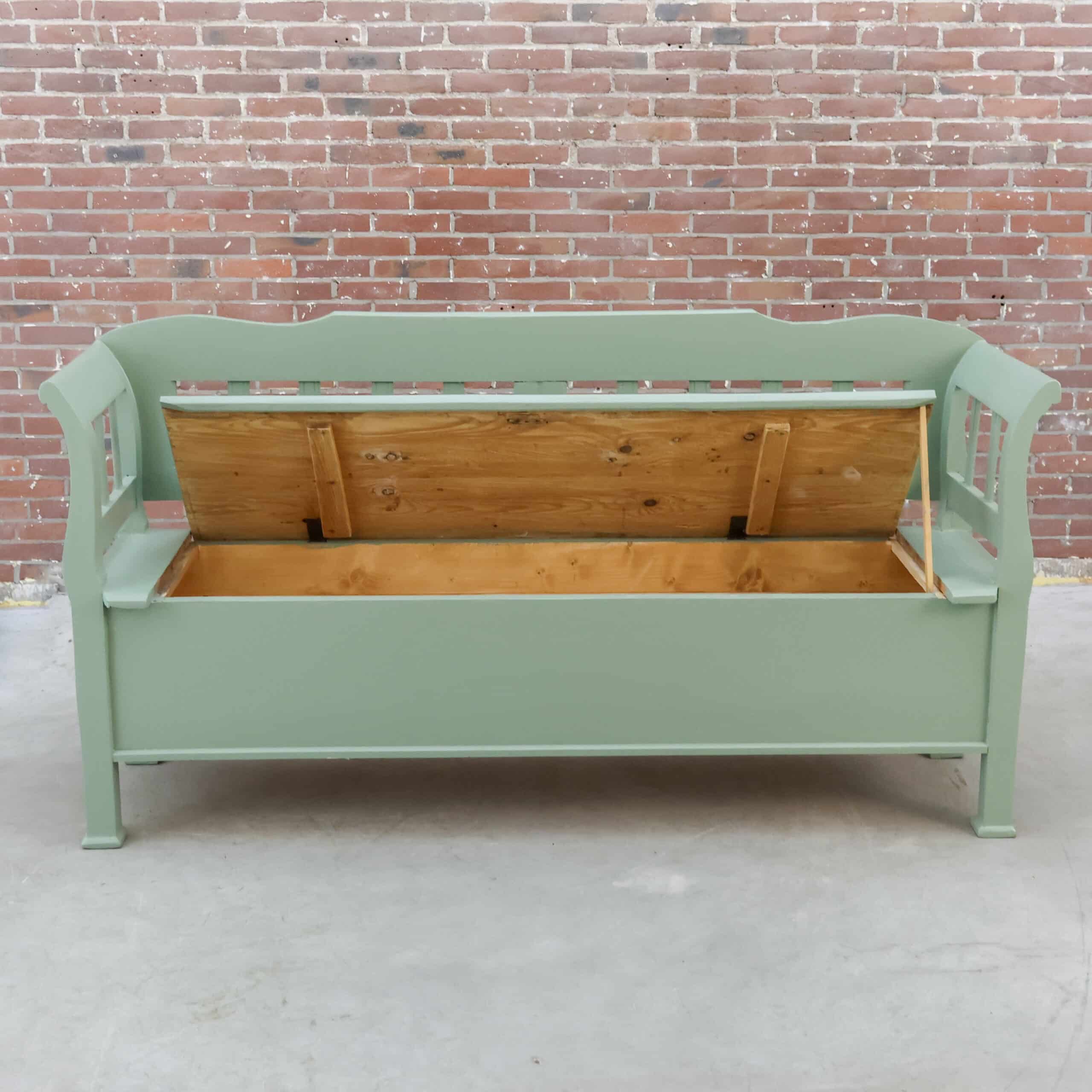 Prachtige brocante klepbank in een zachte vergrijsde groentint met subtiele rondingen en spijlenrug. Onder de zitting bevindt zich een royale opbergruimte. Ideaal voor plaids, speelgoed of schoenen. De lichte gebruikssporen geven haar karakter en versterken de authentieke uitstraling. Een sfeervolle én praktische blikvanger voor hal, keuken of serre.
