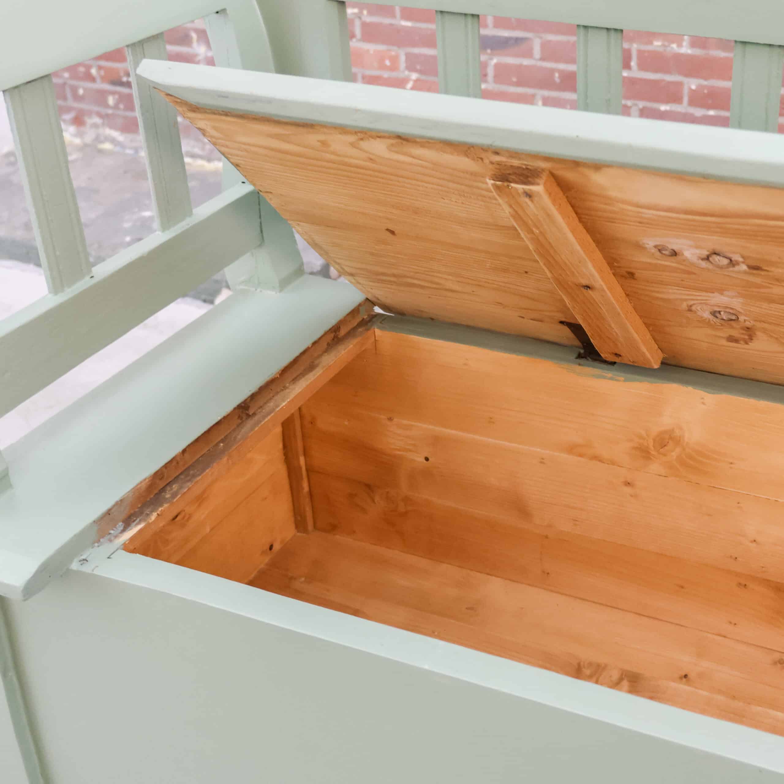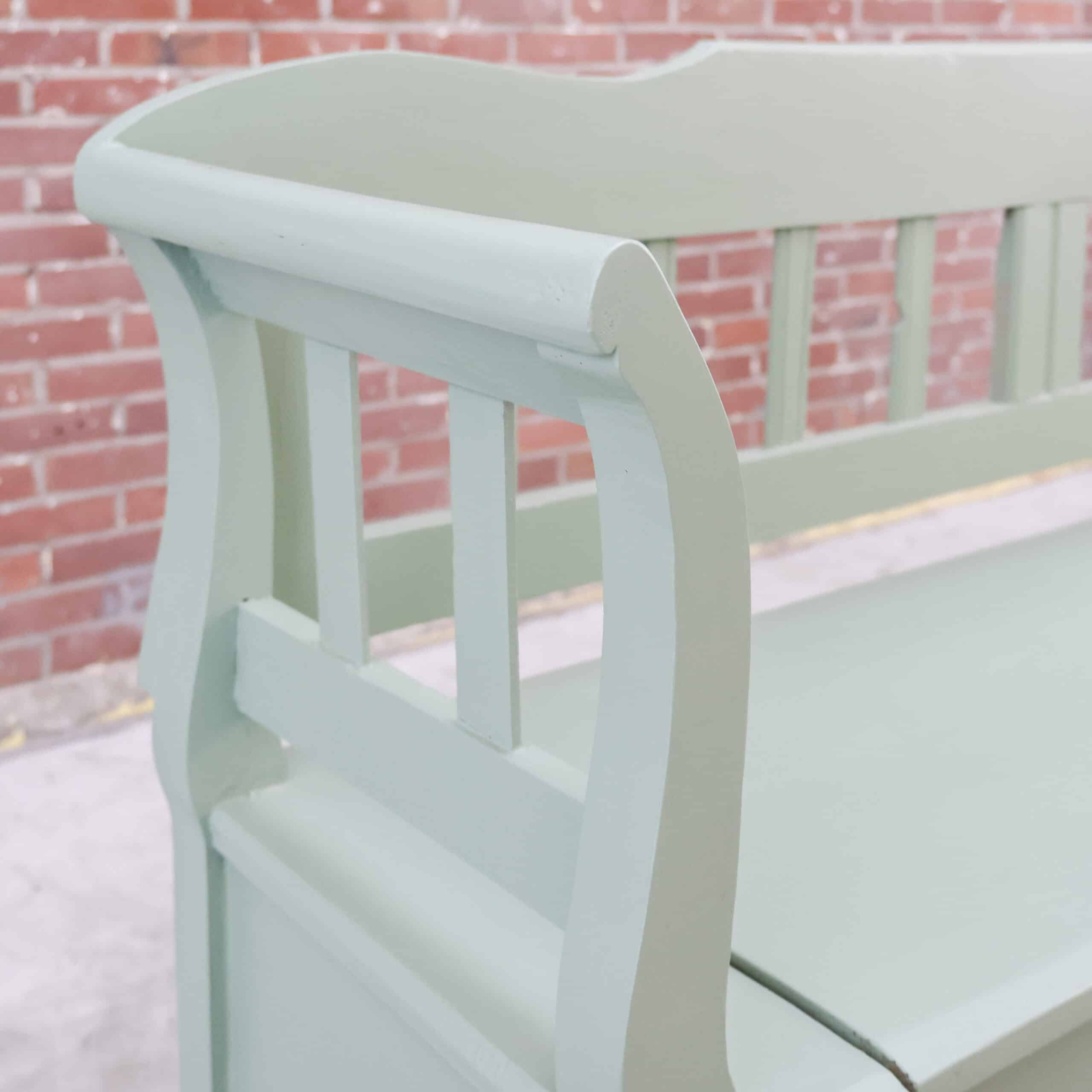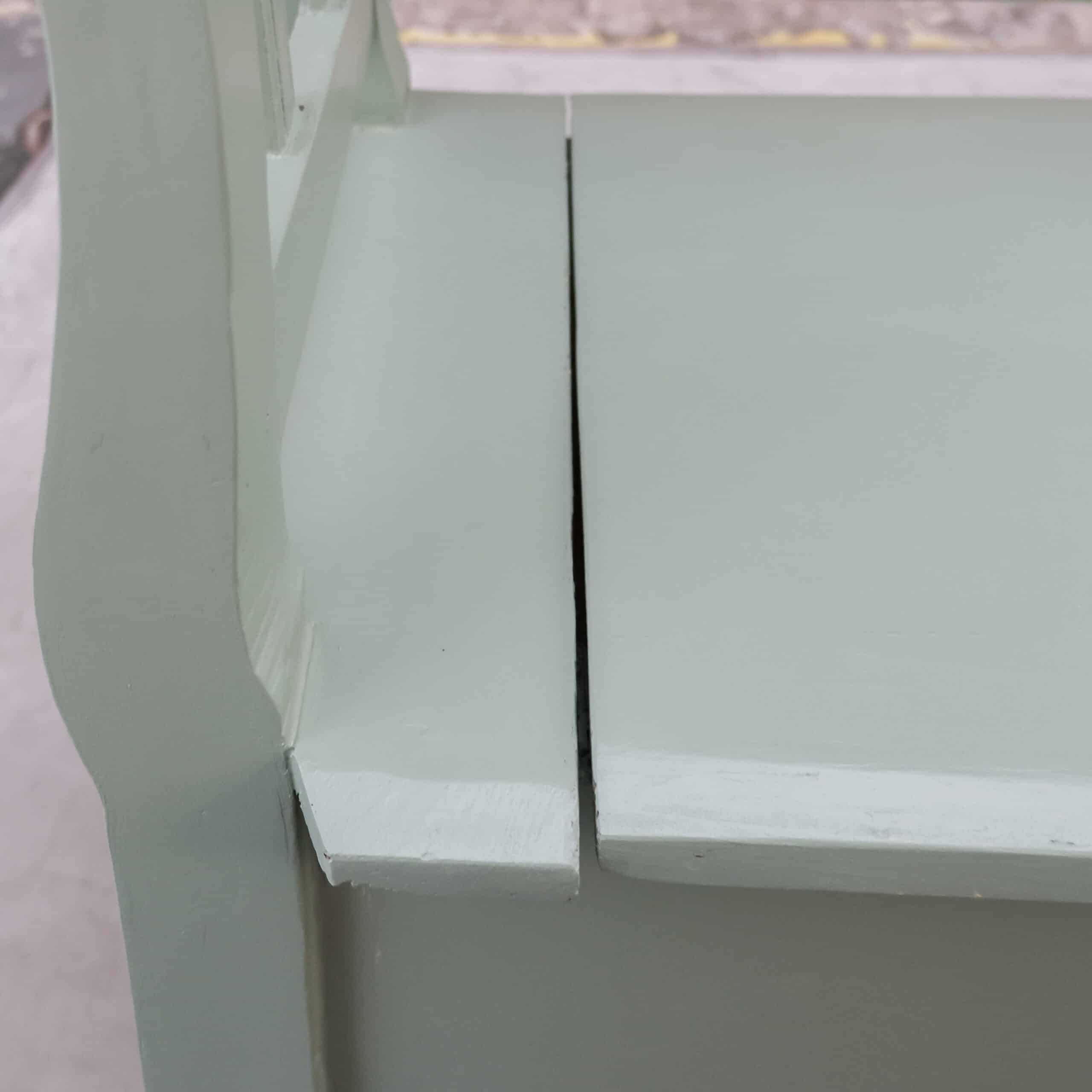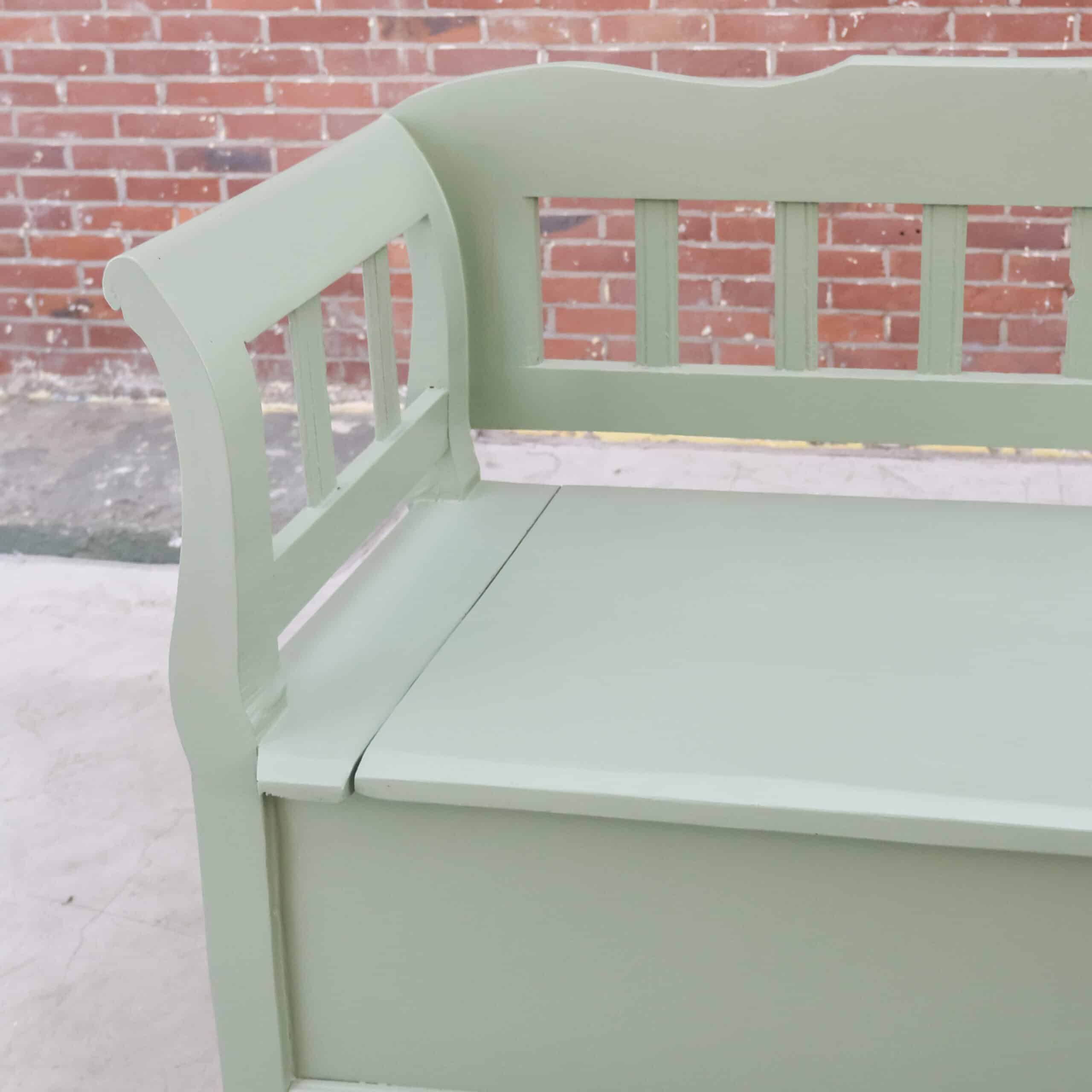 Prachtige brocante klepbank in een zachte vergrijsde groentint met subtiele rondingen en spijlenrug. Onder de zitting bevindt zich een royale opbergruimte. Ideaal voor plaids, speelgoed of schoenen. De lichte gebruikssporen geven haar karakter en versterken de authentieke uitstraling. Een sfeervolle én praktische blikvanger voor hal, keuken of serre.