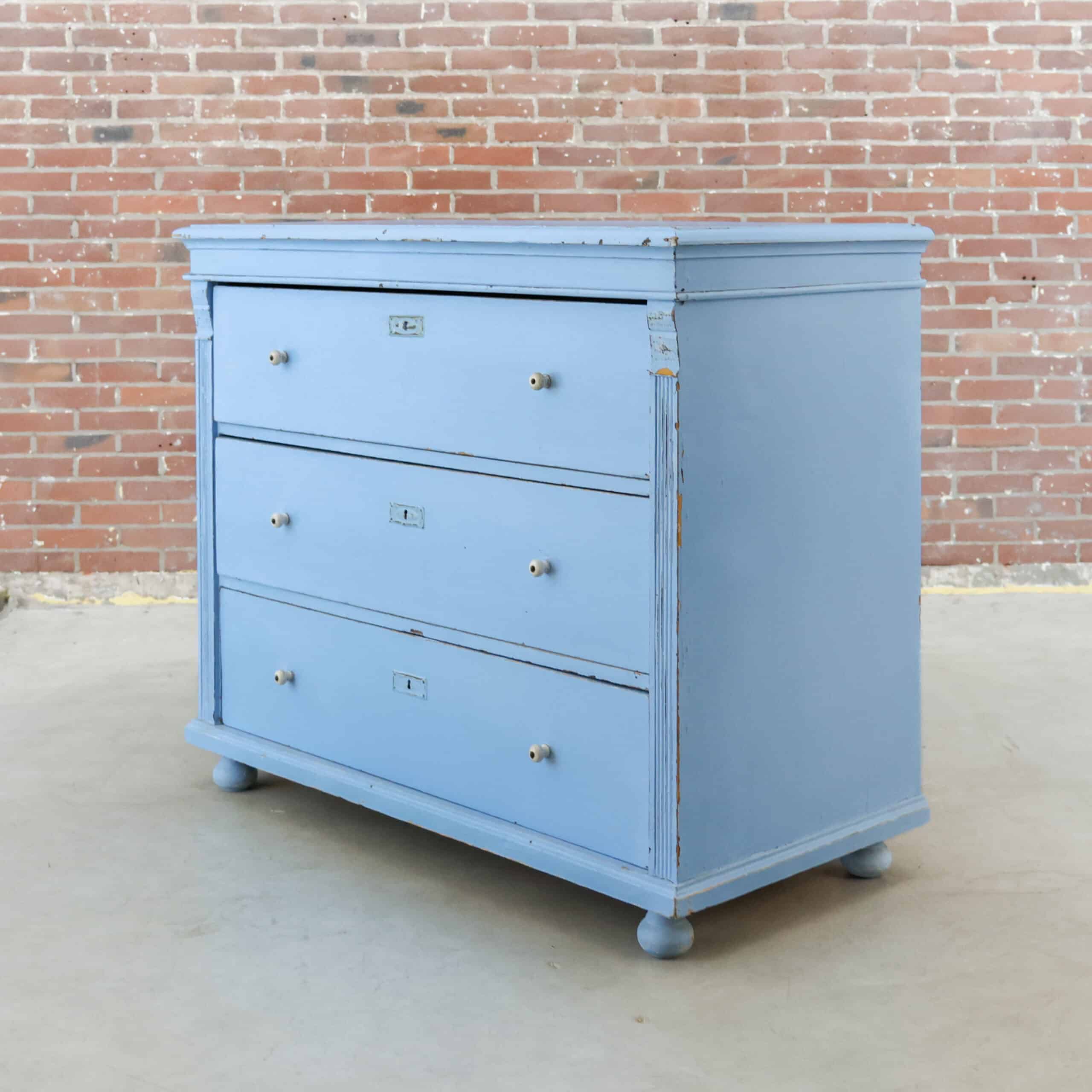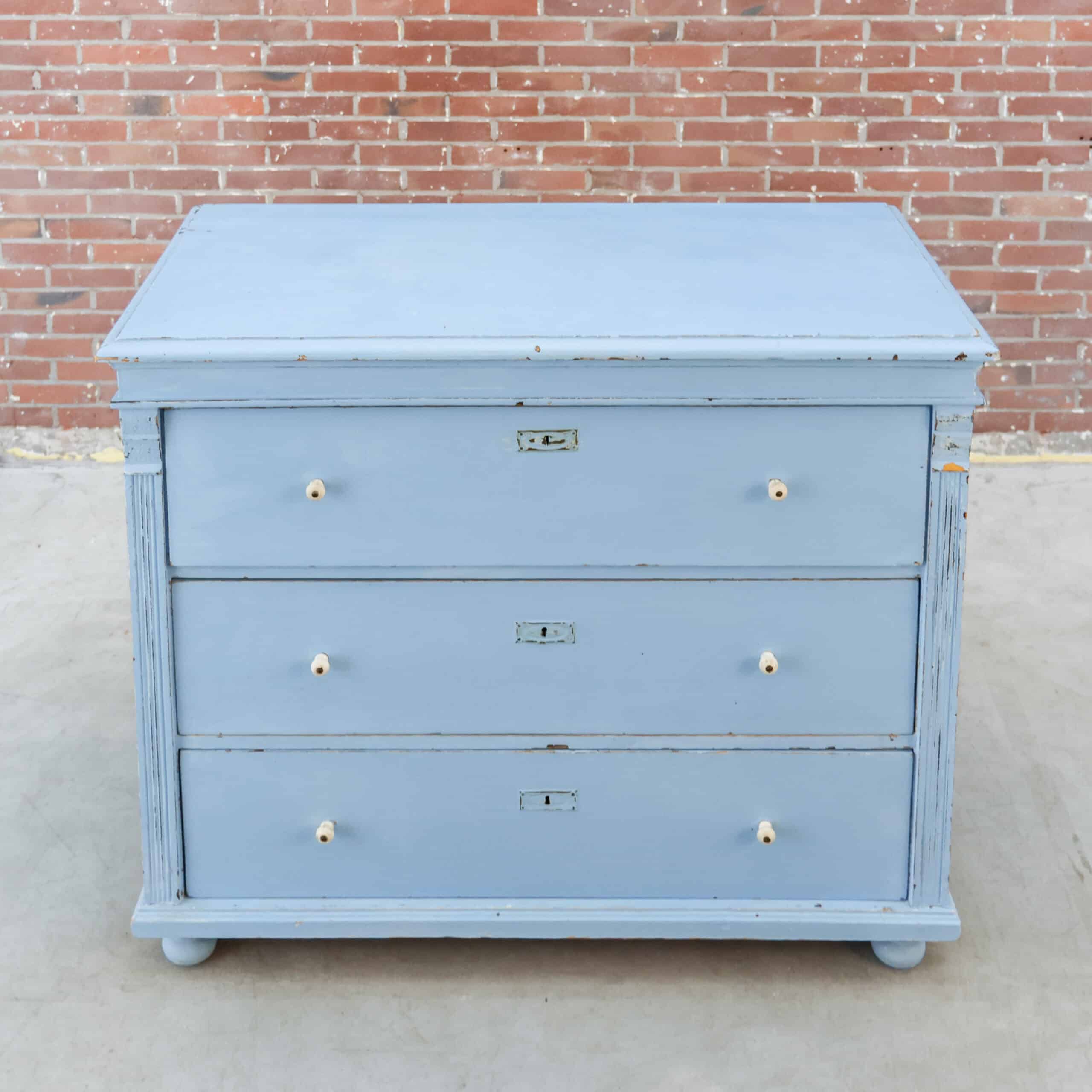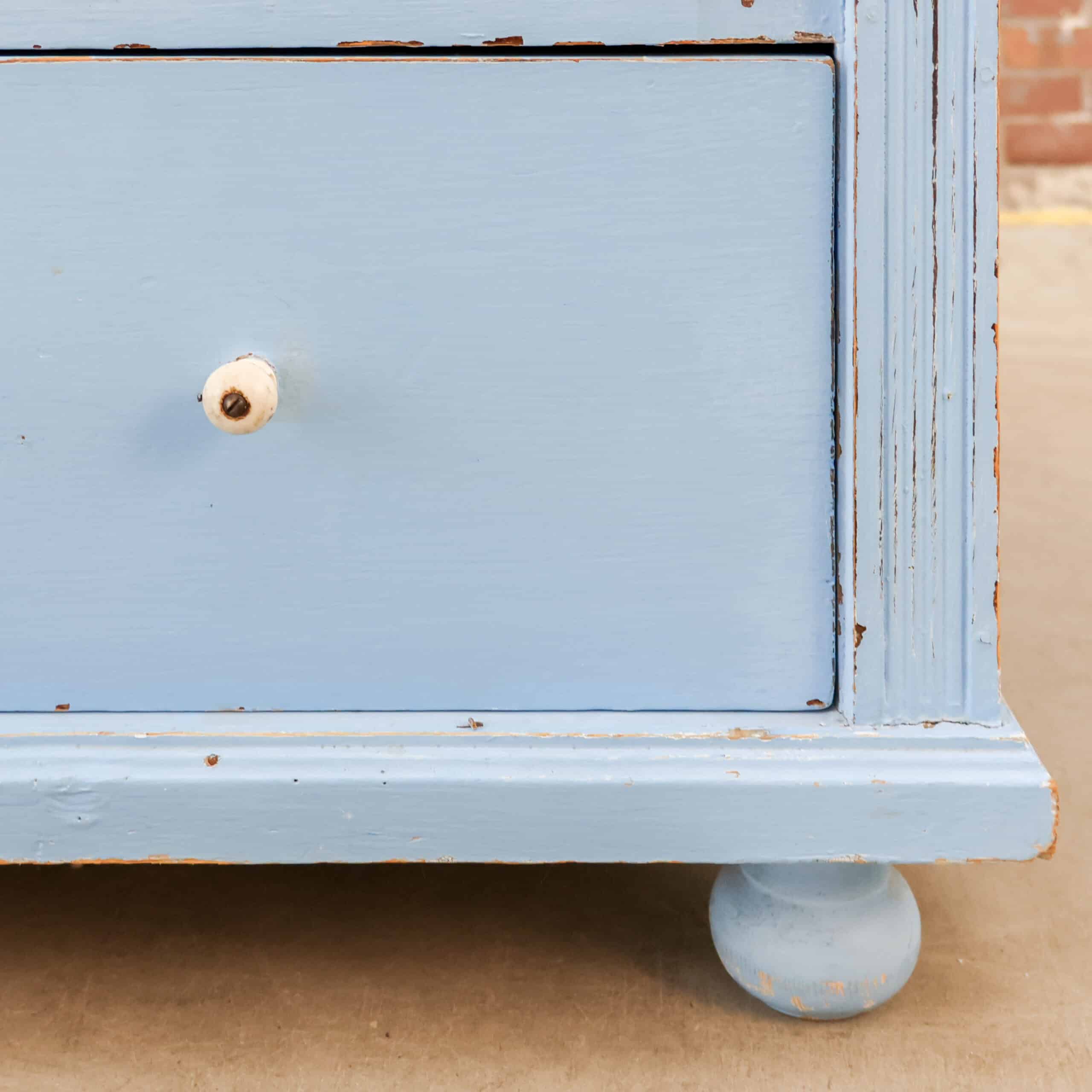 Charmante brocante ladekast in een zachte blauw paarse tint met drie ruime lades. De kast heeft door de jaren heen duidelijke gebruikssporen en slijtage in de verf, wat zorgt voor een geleefde, authentieke uitstraling .Stevig en functioneel, met goed lopende lades en veel opbergruimte. Perfect voor liefhebbers van een doorleefde, landelijke of vintage stijl.