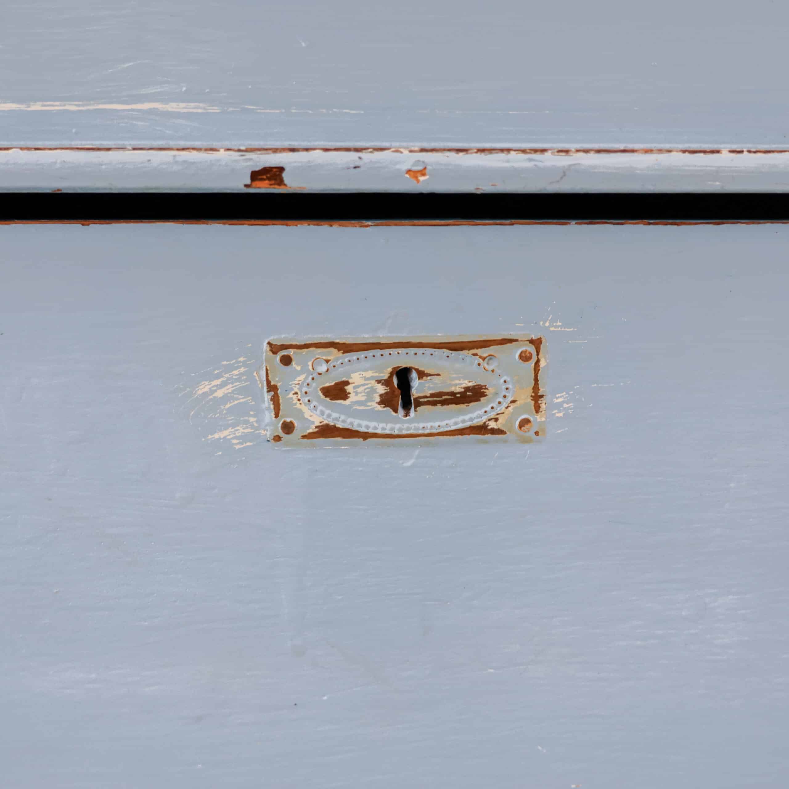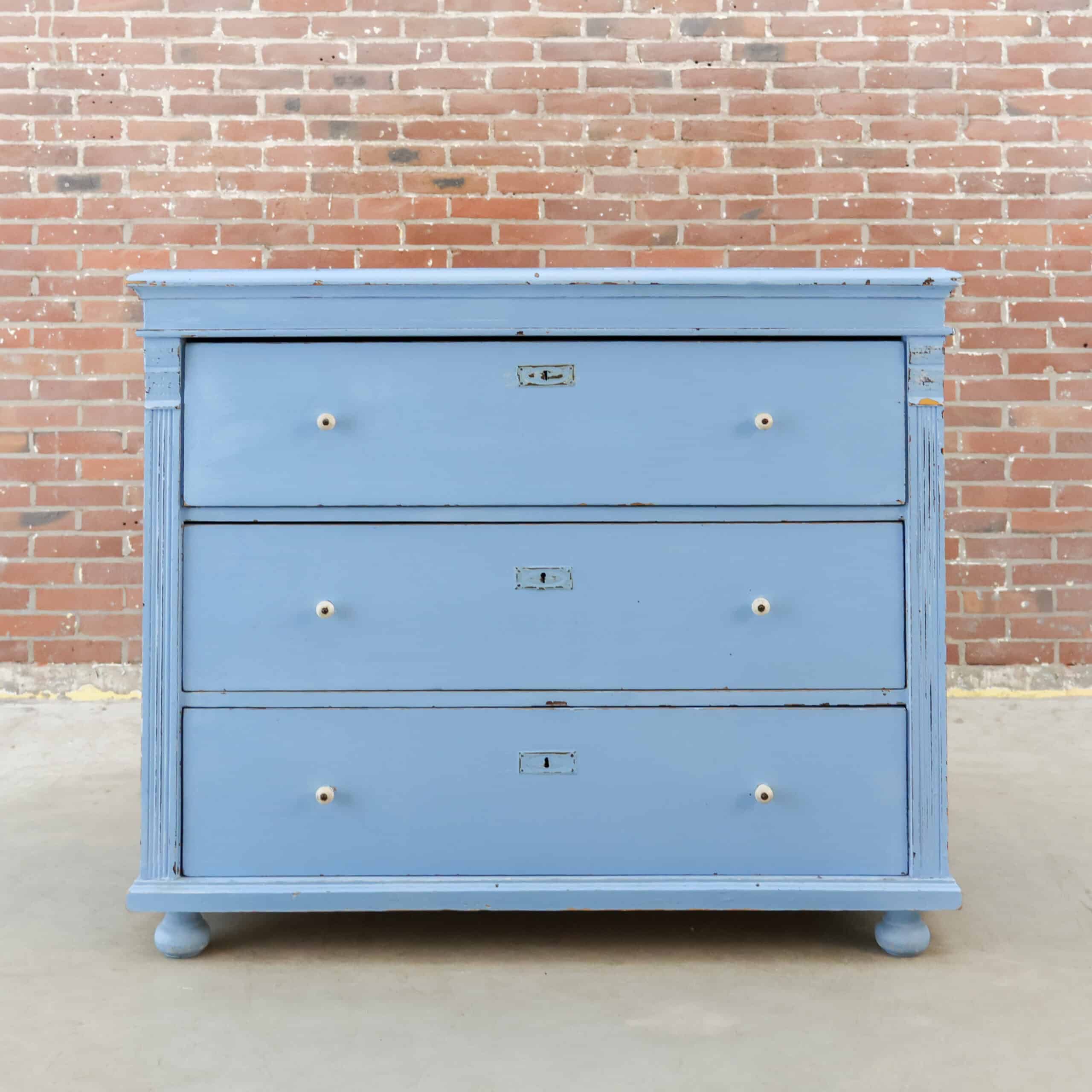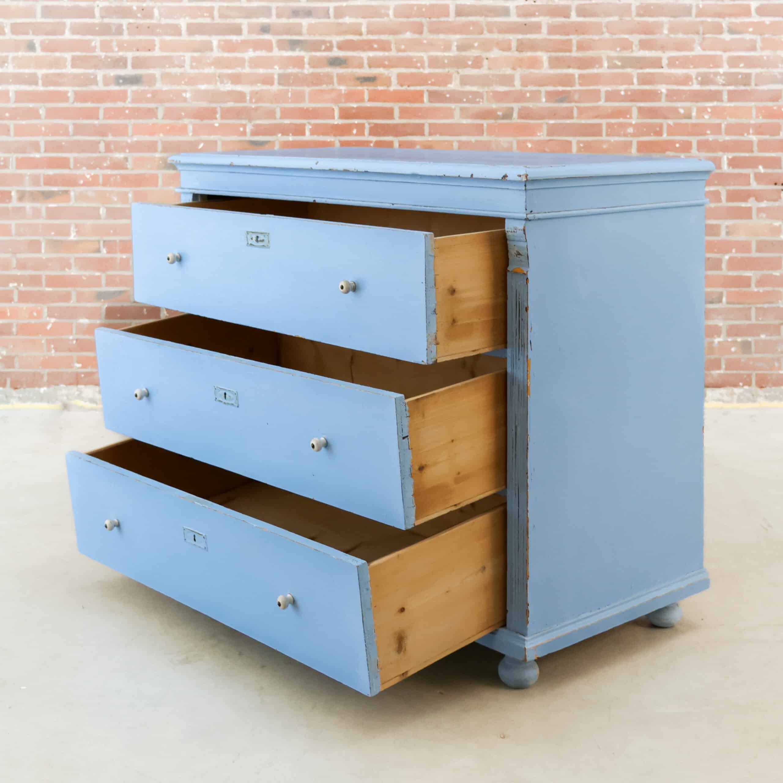 Charmante brocante ladekast in een zachte blauw paarse tint met drie ruime lades. De kast heeft door de jaren heen duidelijke gebruikssporen en slijtage in de verf, wat zorgt voor een geleefde, authentieke uitstraling .Stevig en functioneel, met goed lopende lades en veel opbergruimte. Perfect voor liefhebbers van een doorleefde, landelijke of vintage stijl.