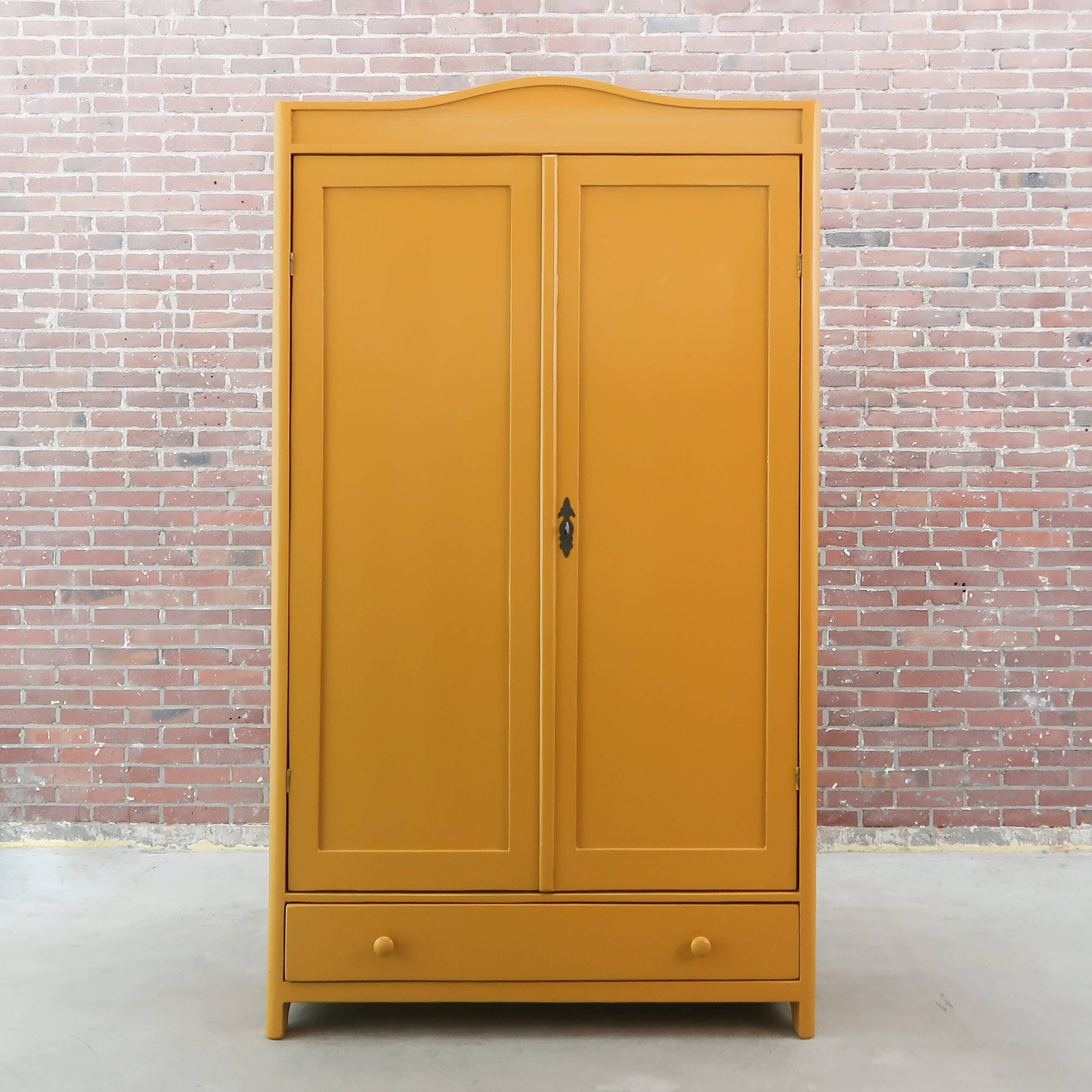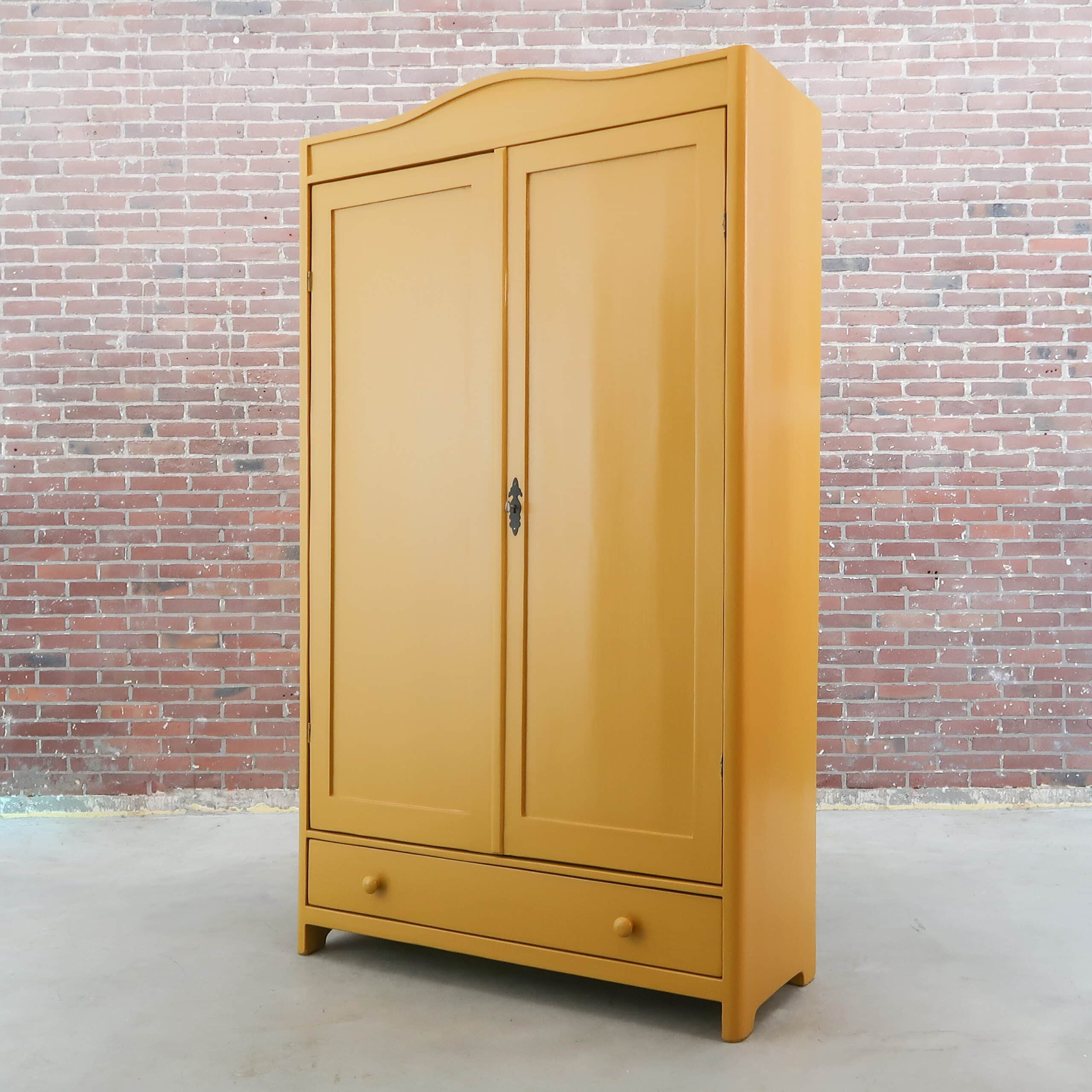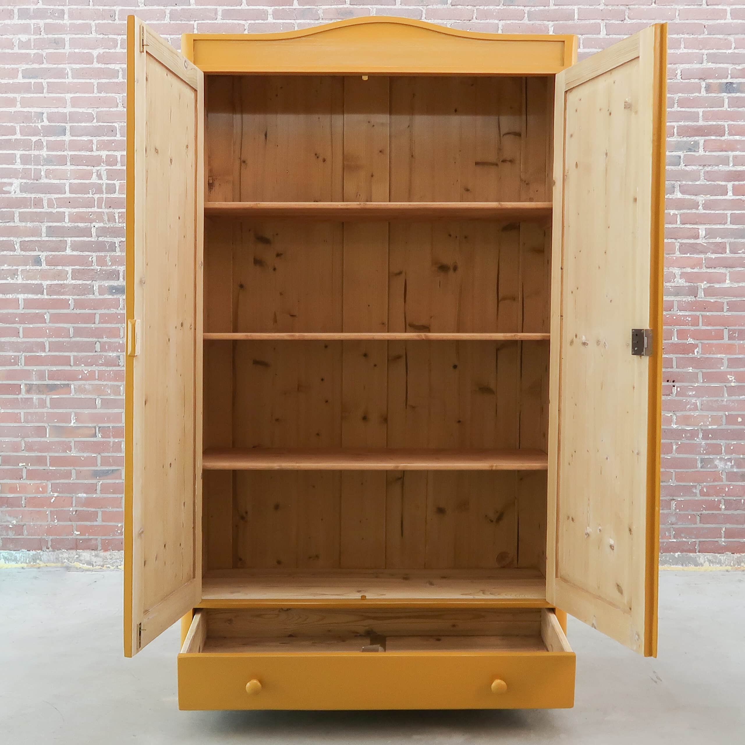 Deze brocante linnenkast hebben we opgespeurd in Hongarije en opgeknapt waar nodig. Ze heeft ze oa nieuwe planken en een bijzondere kleur geel gekregen.