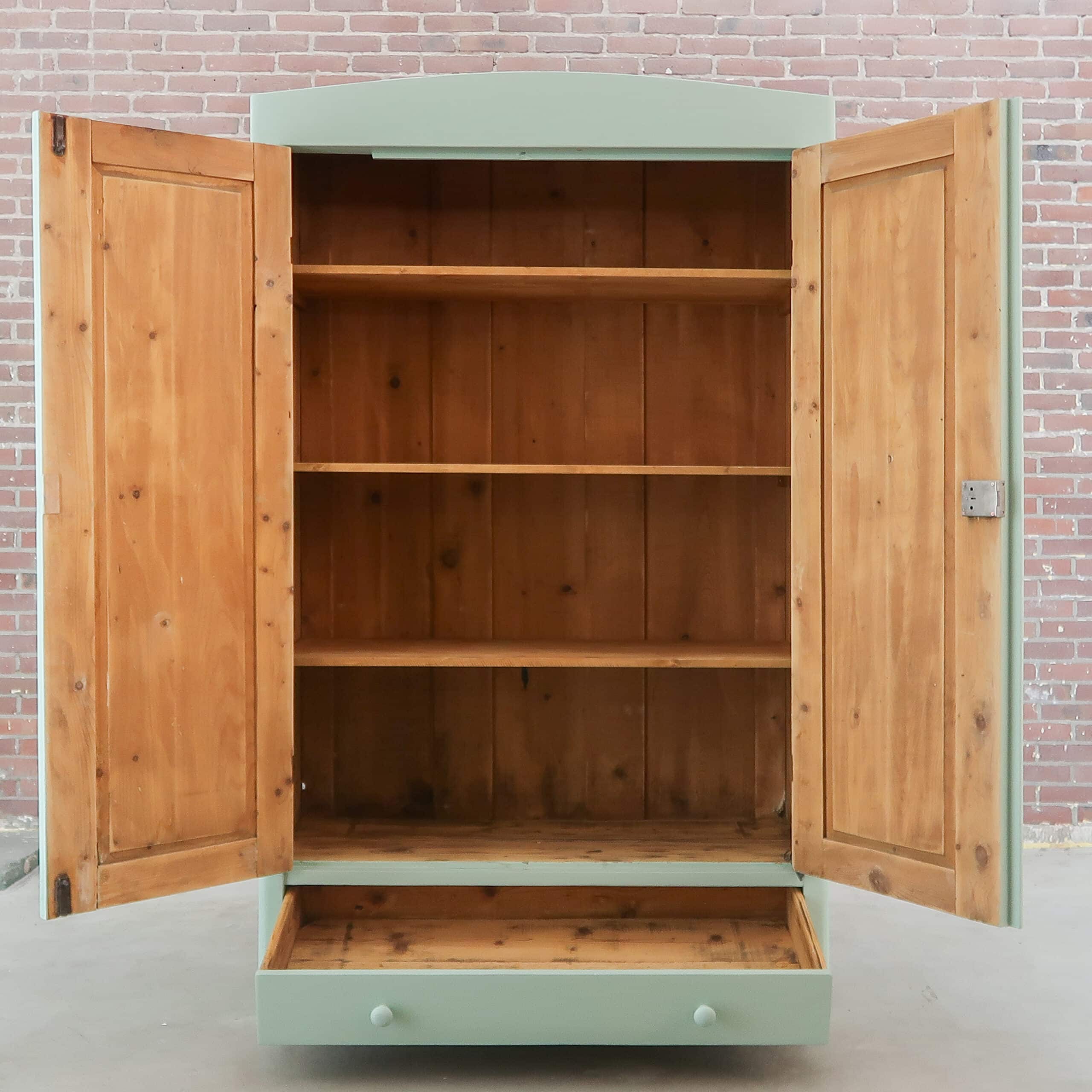 Deze brocante linnenkast uit Hongarije hebben we een fris mint kleurtje gegeven! Verder hebben wij haar opgeknapt met oa nieuwe planken en poten, ze kan ze er weer járen tegenaan.