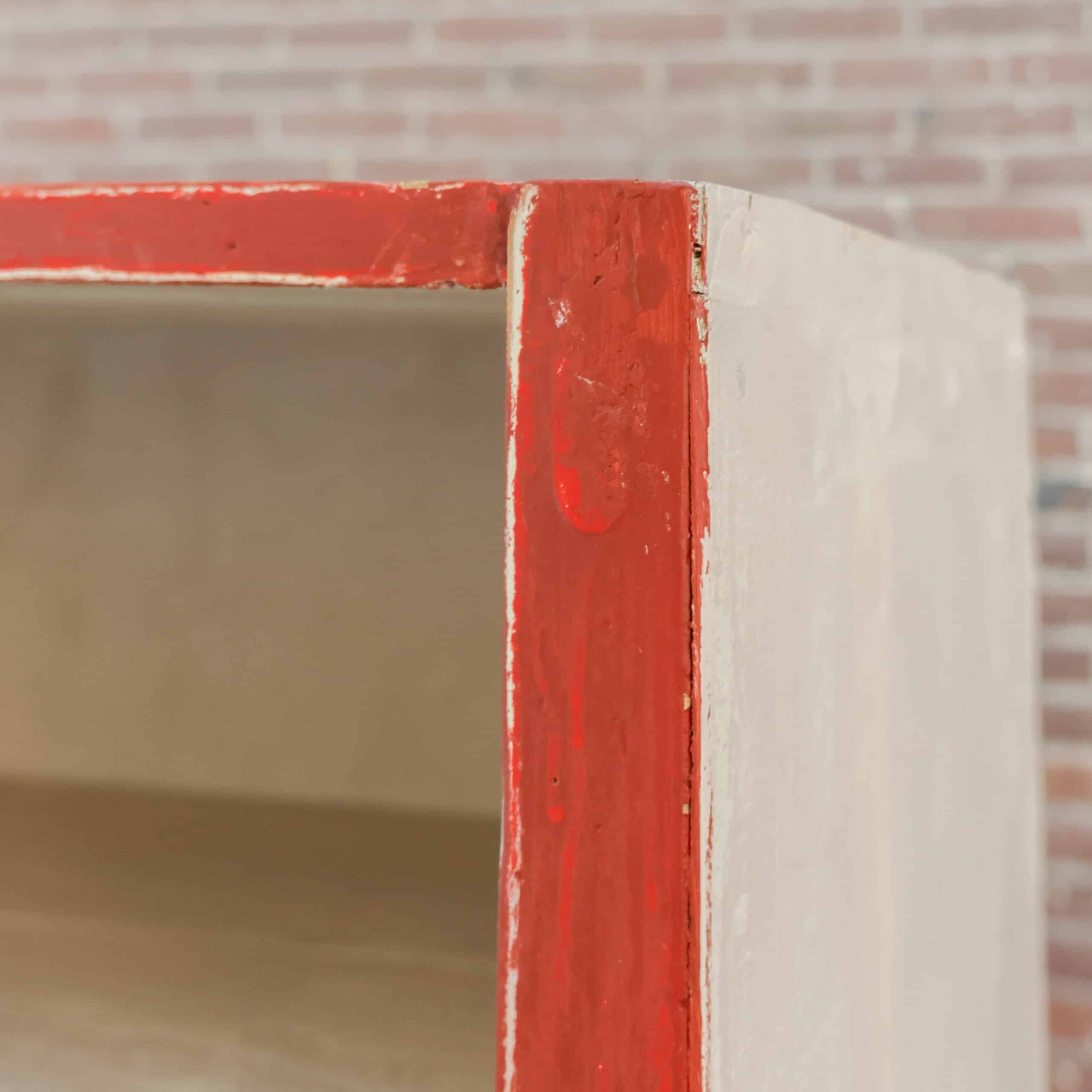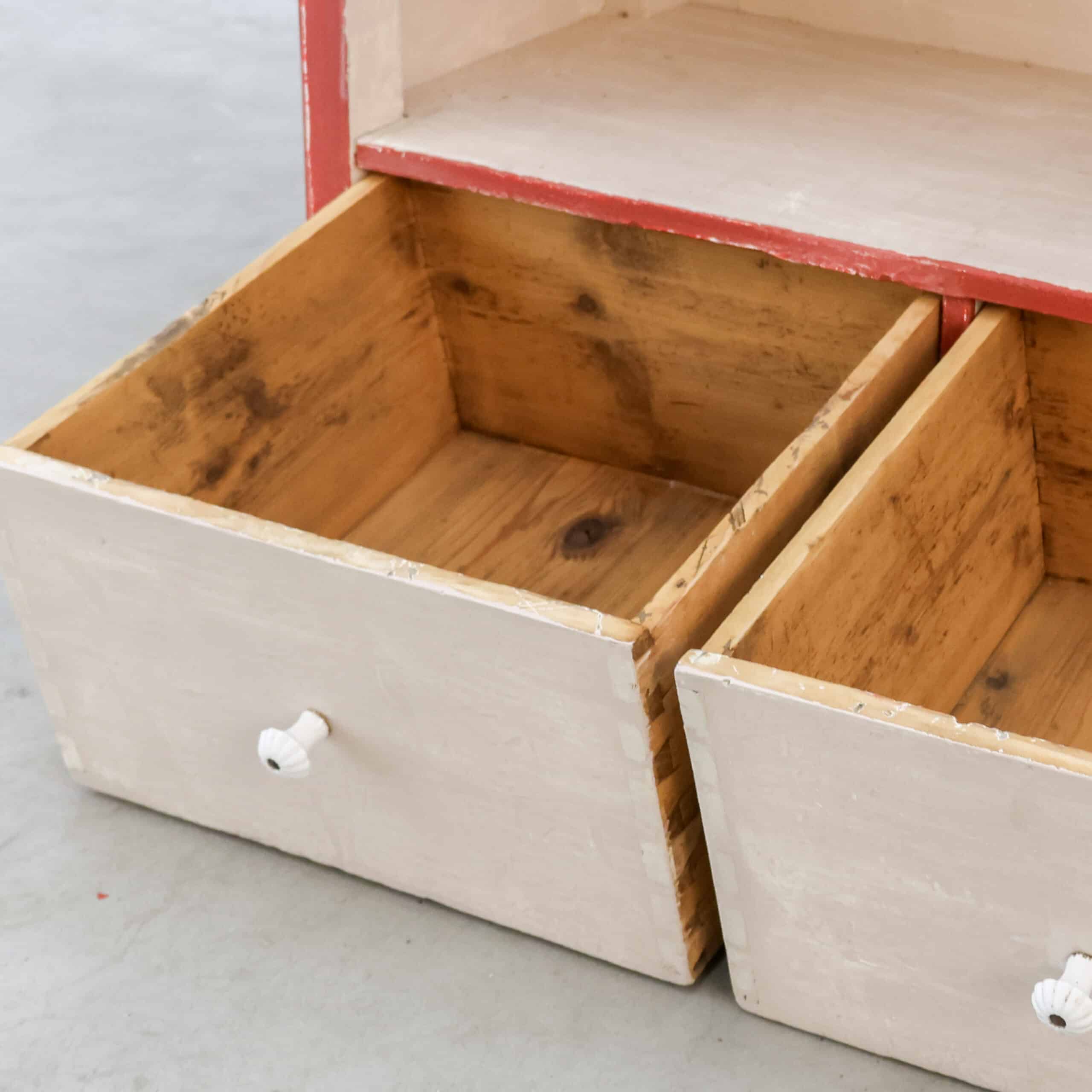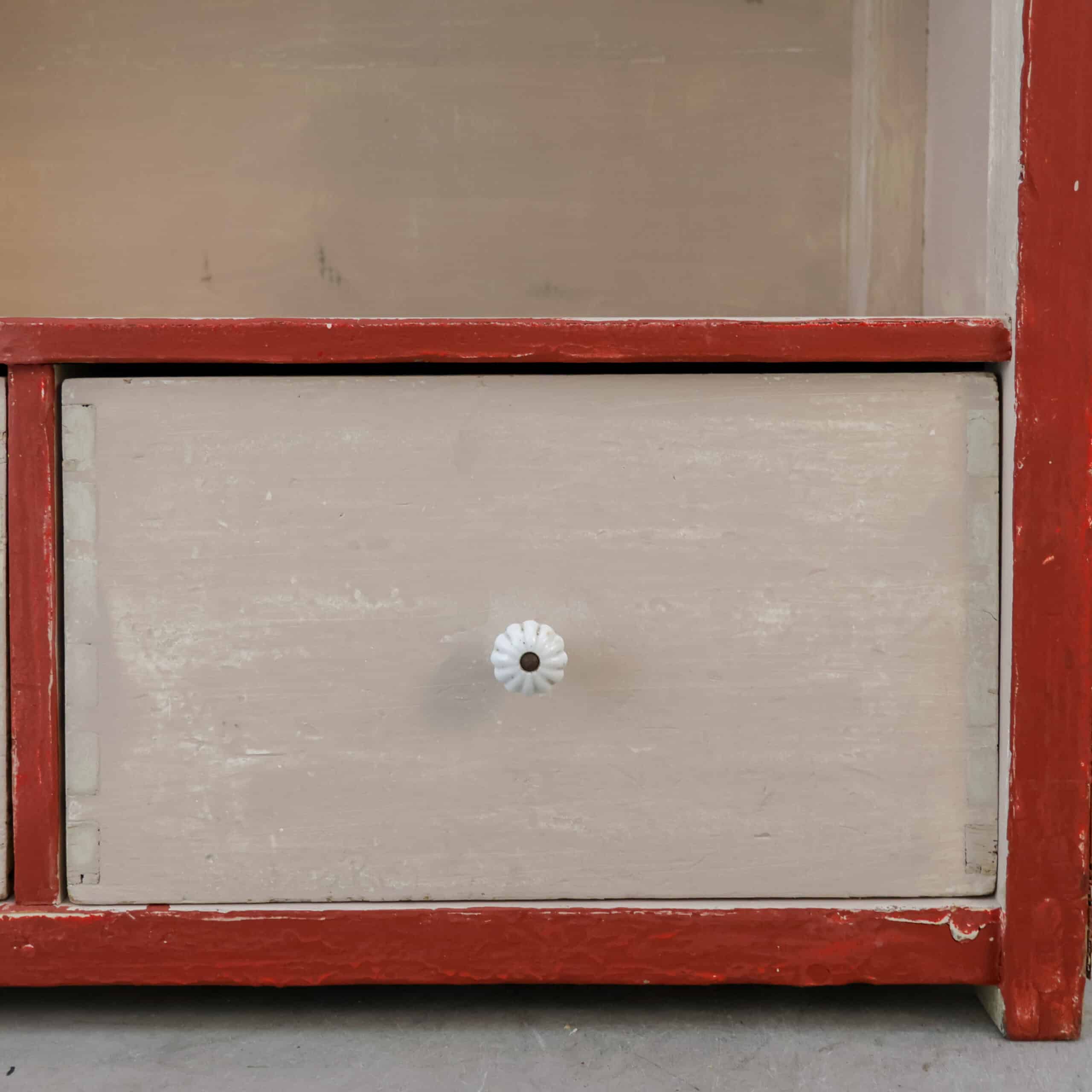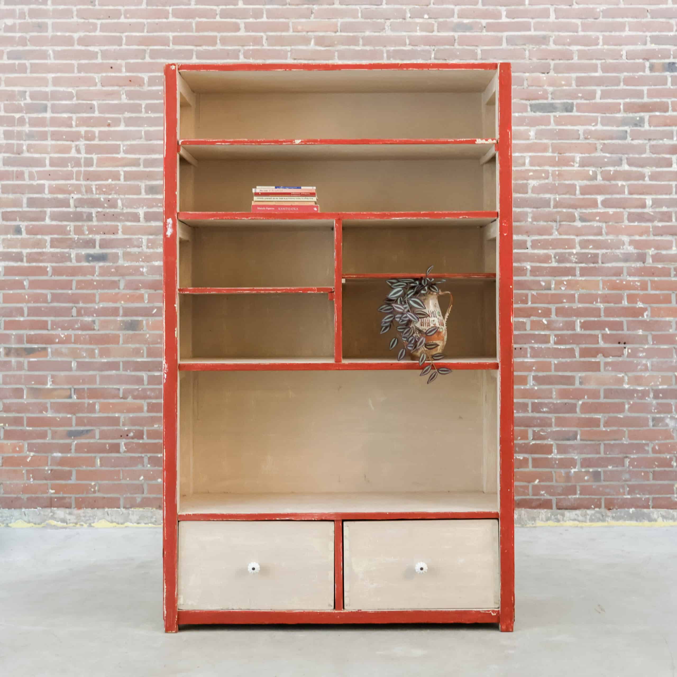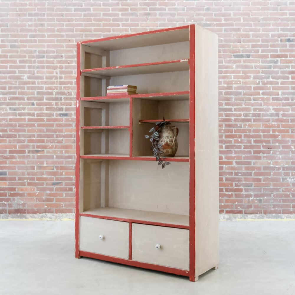 Mooie open boekenkast uit Hongarije! Van oude vervallen kast naar opgeknapte boekenkast met twee grote lade! Een duurzame en unieke kast.