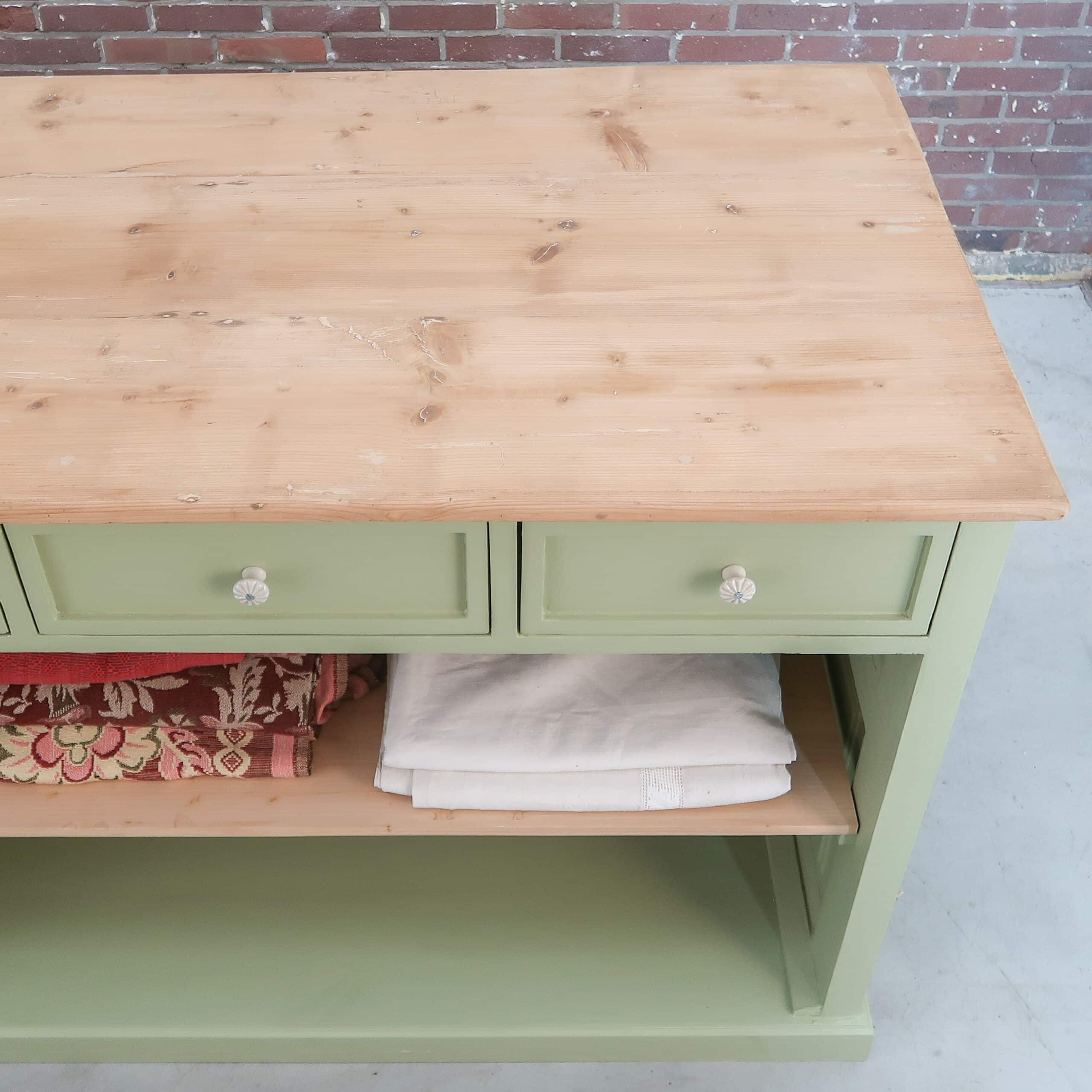 Een mooi brocante open dressoir. De achterkant is een oude ensuite deur en het blad is ook helemaal upcycled en opgeknapt. De kast is heeft een fijn formaat en is klaar voor een nieuw leven.