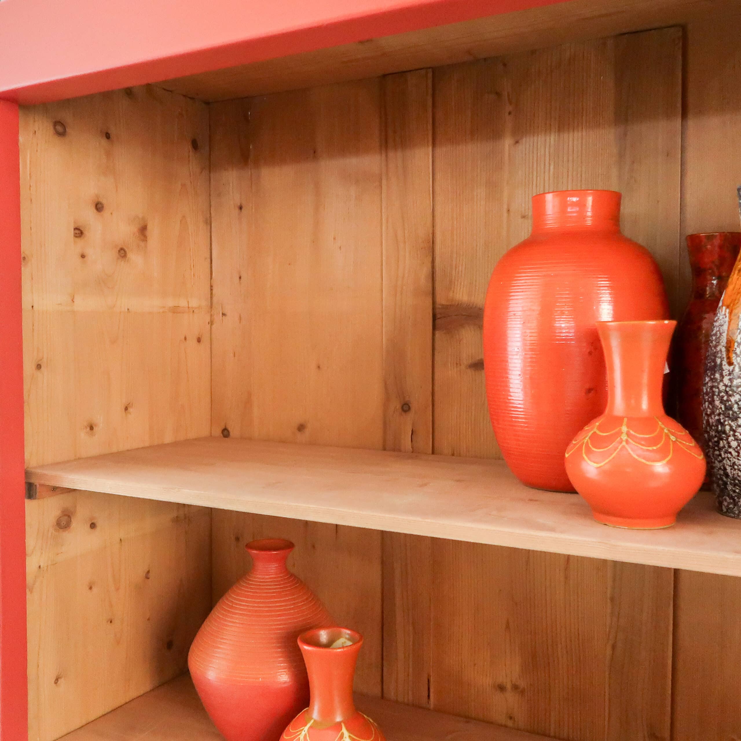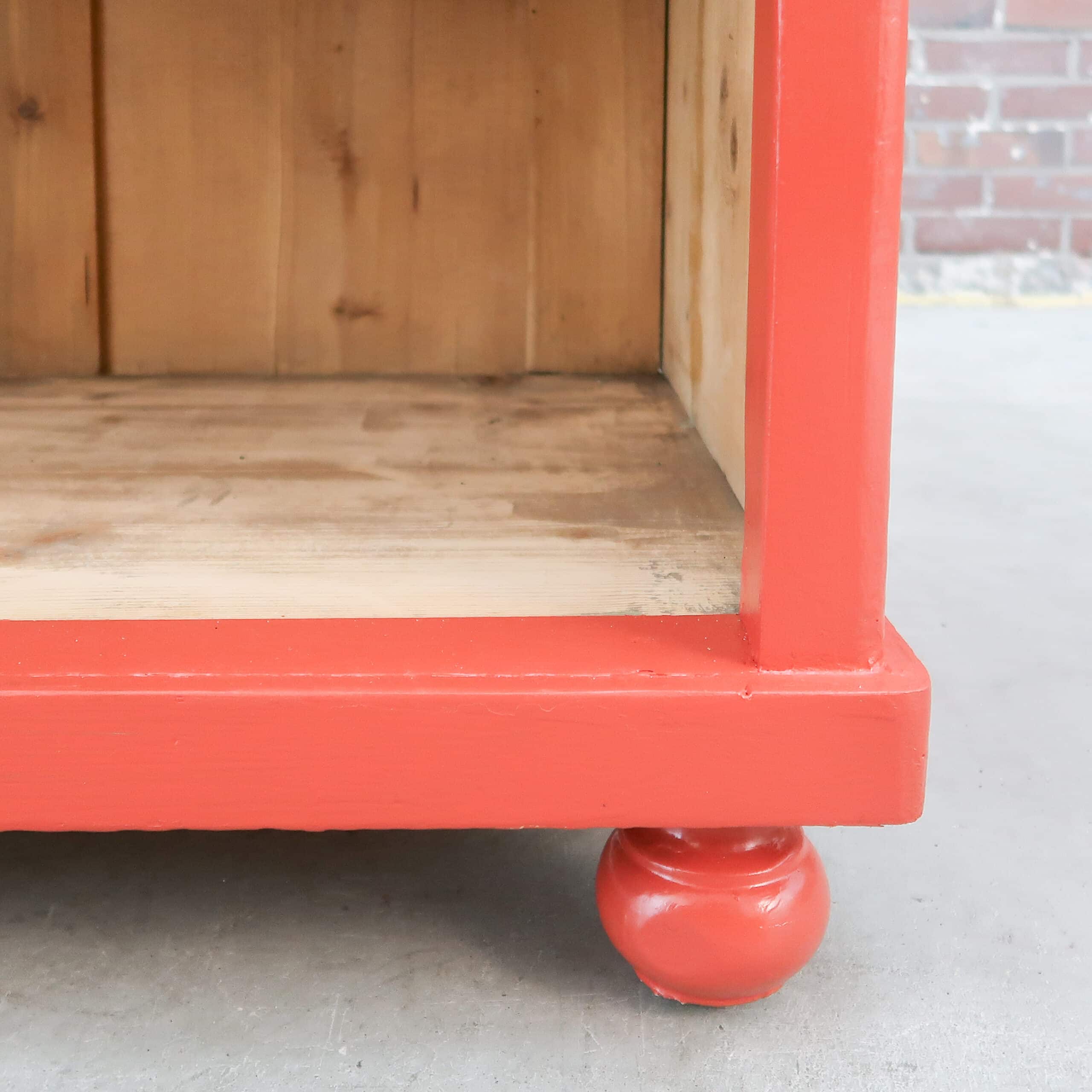 Prachtige brocante open boekenkast! Van oude vervallen kast naar opgeknapte rode boekenkast! Een duurzame en unieke kast.