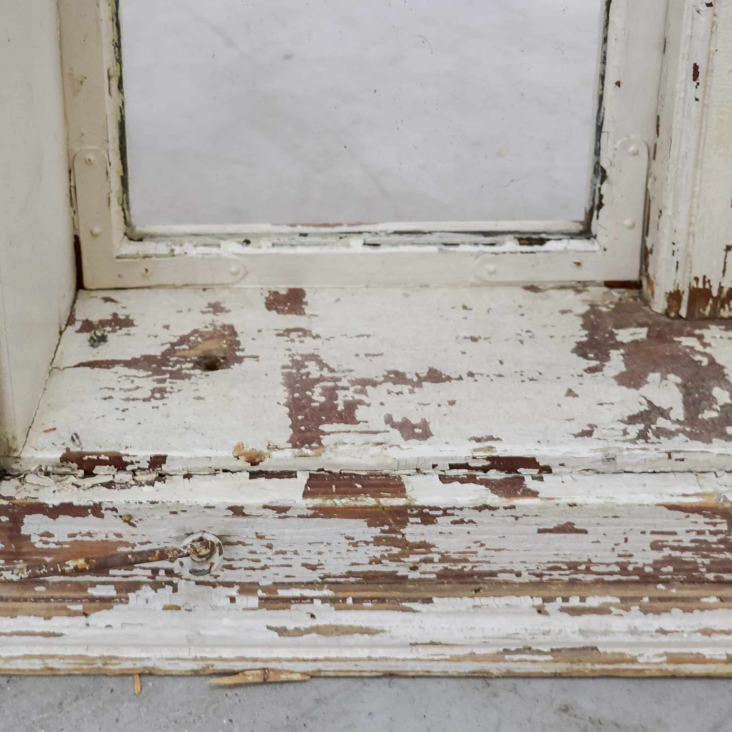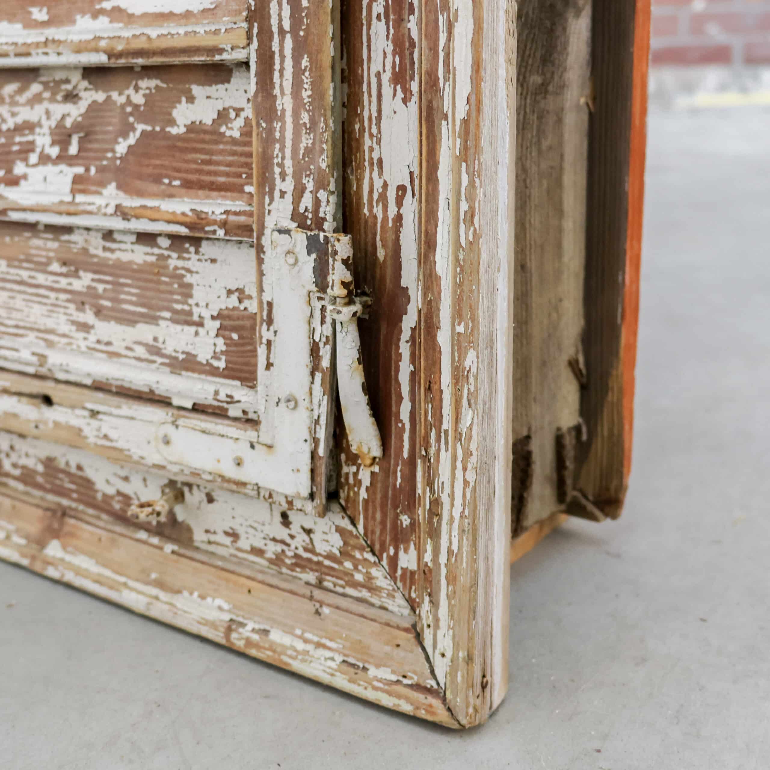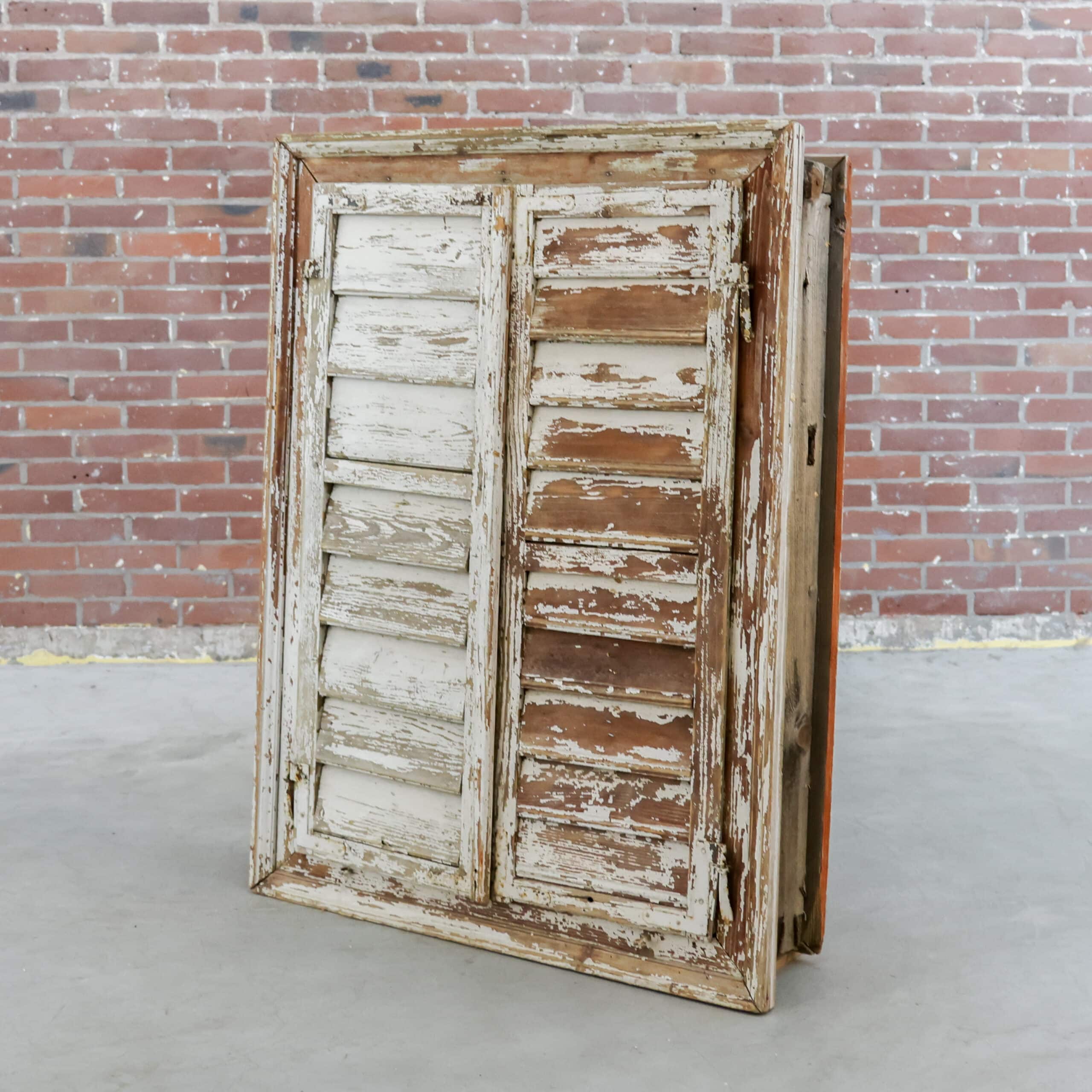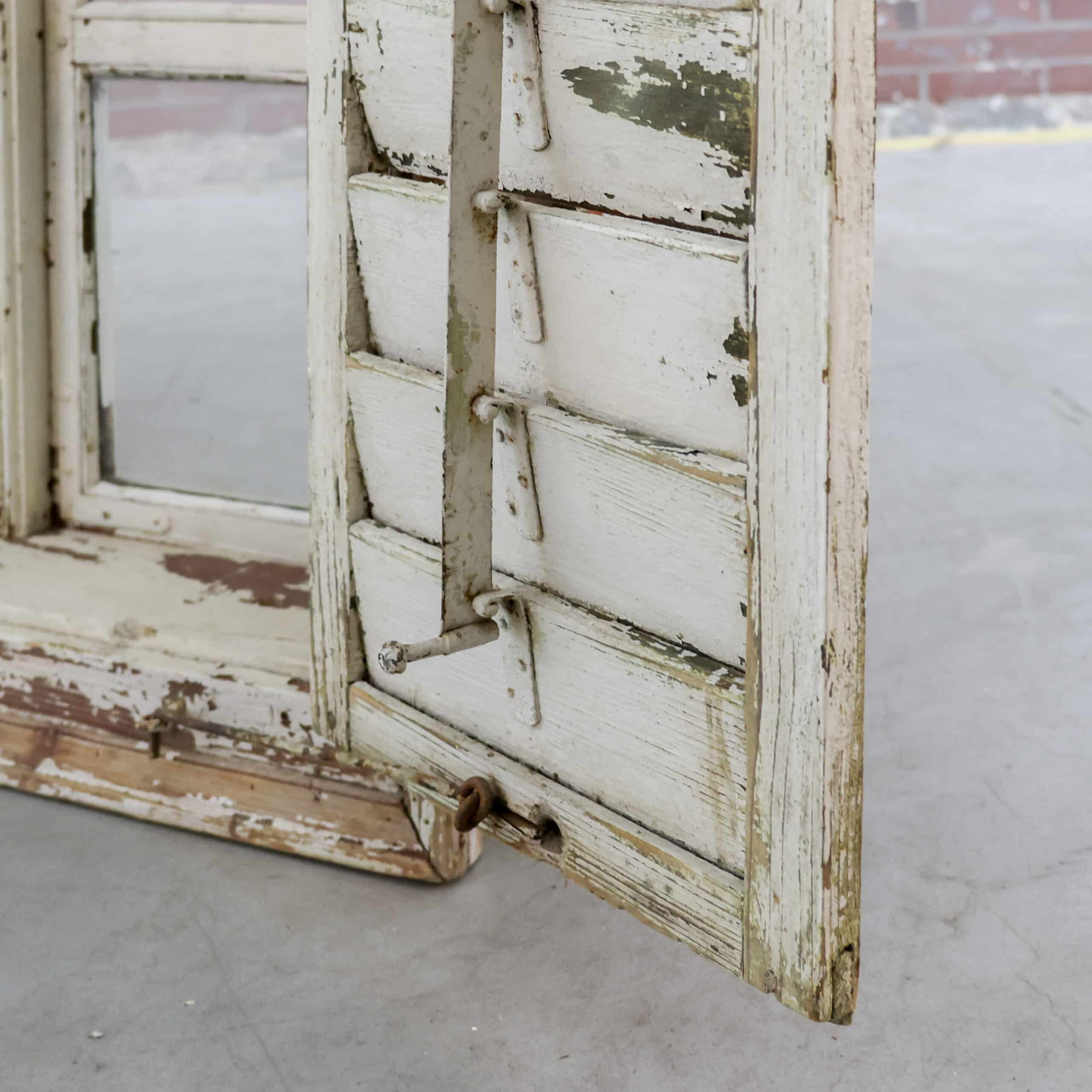 Pachtig brocante raamkozijn met originele luiken en glas, rijk aan karakter en een schitterende doorleefde verflaag in zachte crème- en aardetinten. De authentieke sluitingen, scharnieren en het verweerde hout geven dit stuk een stoere, landelijke uitstraling met een verhaal. Perfect als wanddecoratie of sfeervol element in een veranda of interieur met vintage ziel.