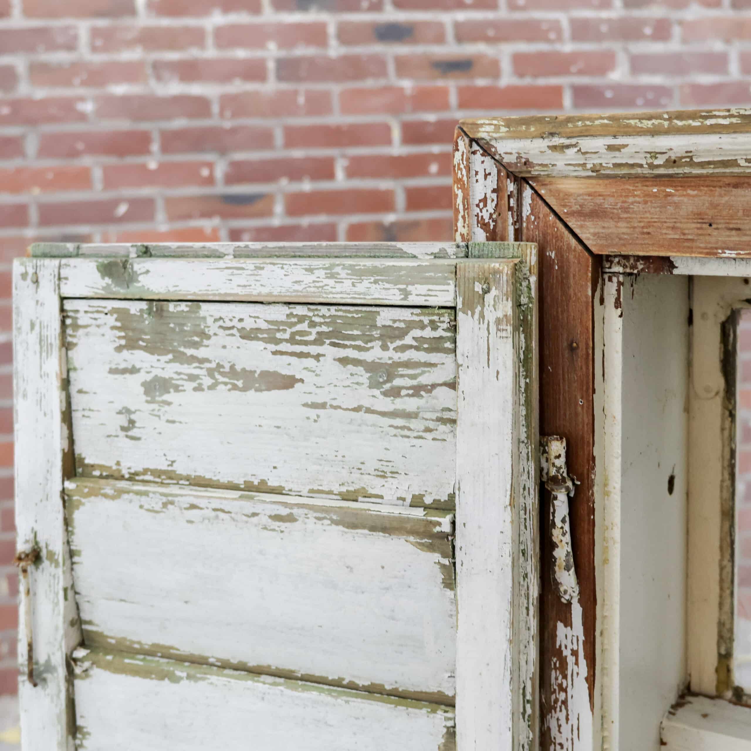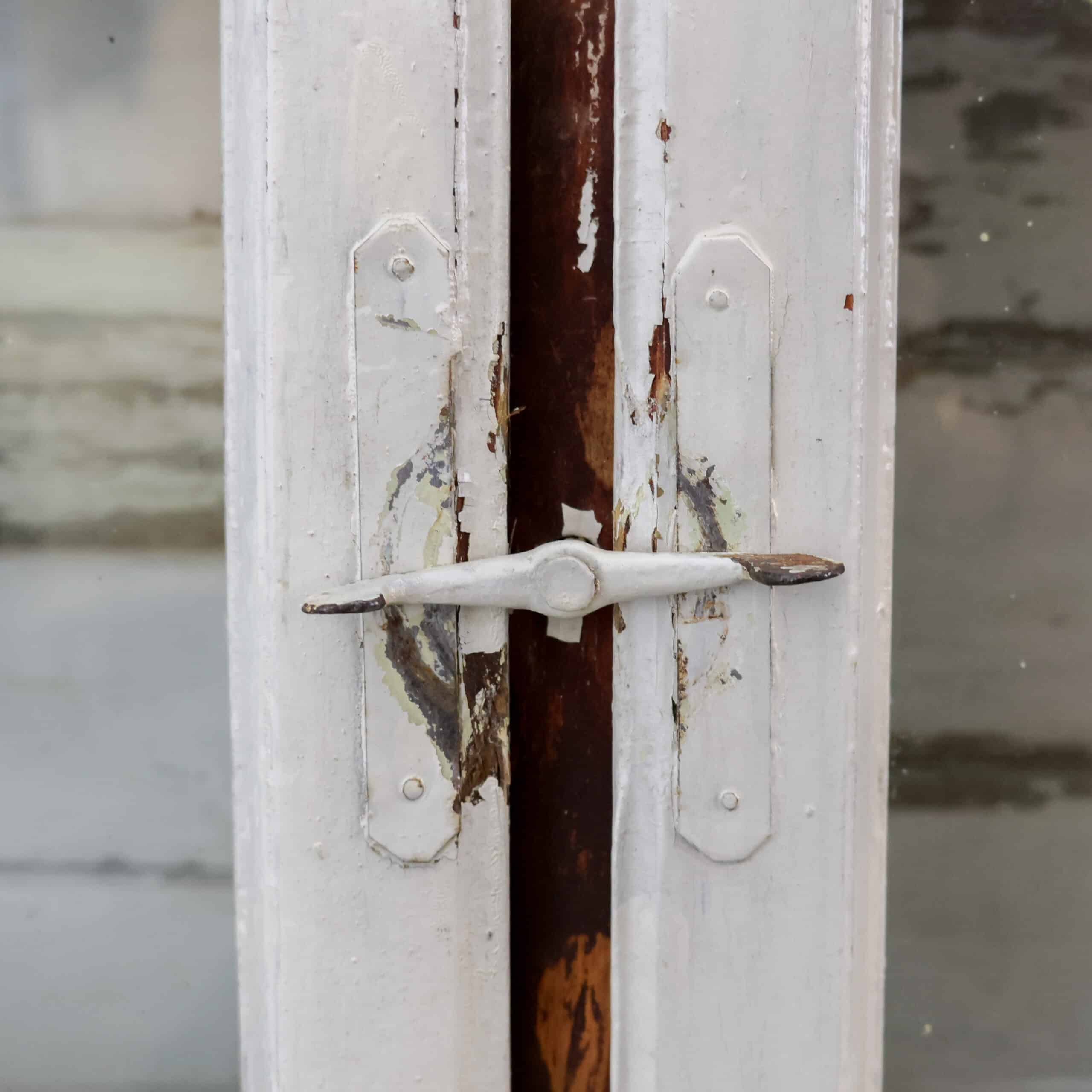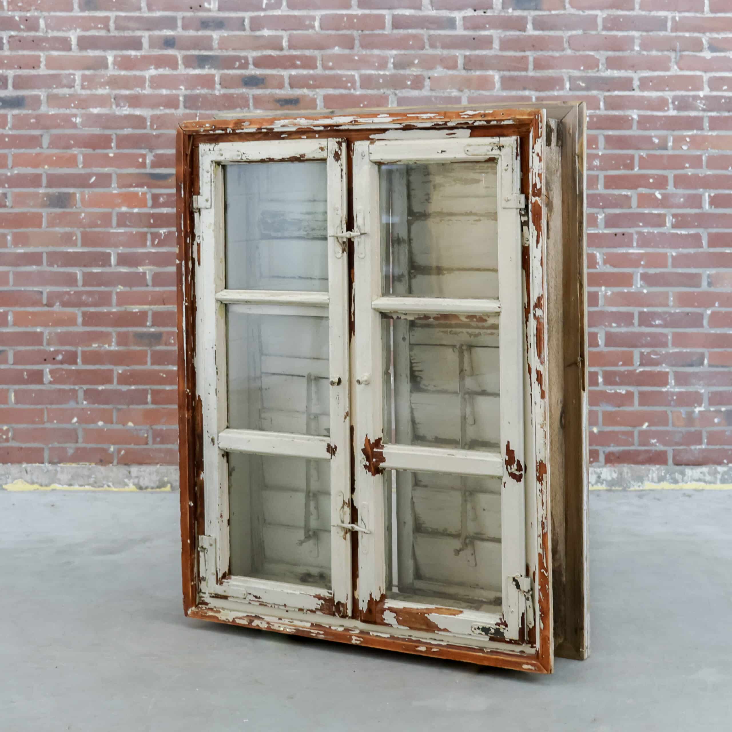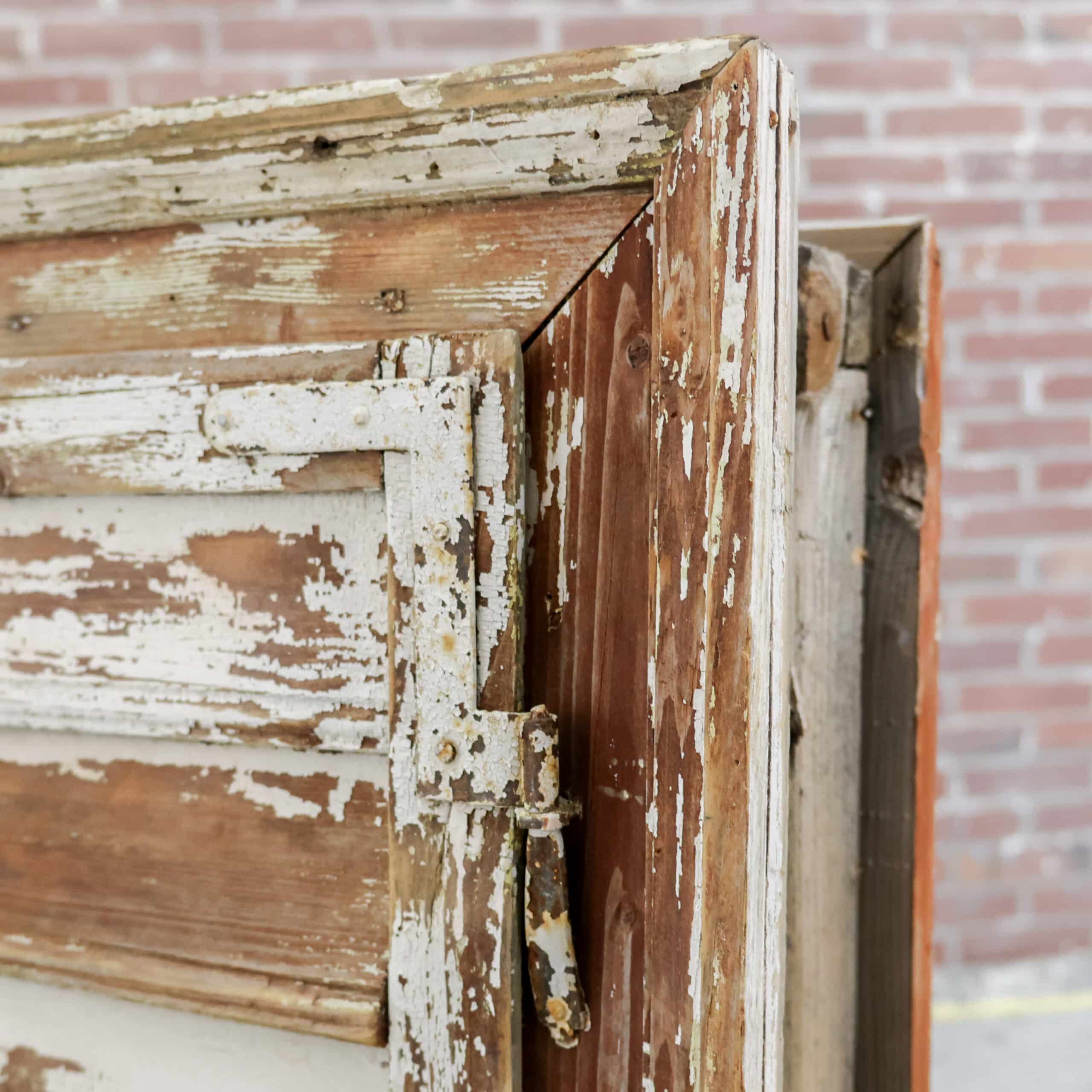 Pachtig brocante raamkozijn met originele luiken en glas, rijk aan karakter en een schitterende doorleefde verflaag in zachte crème- en aardetinten. De authentieke sluitingen, scharnieren en het verweerde hout geven dit stuk een stoere, landelijke uitstraling met een verhaal. Perfect als wanddecoratie of sfeervol element in een veranda of interieur met vintage ziel.
