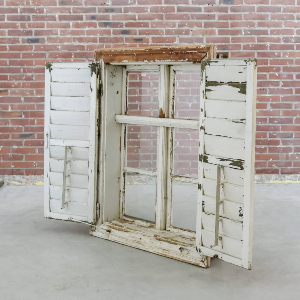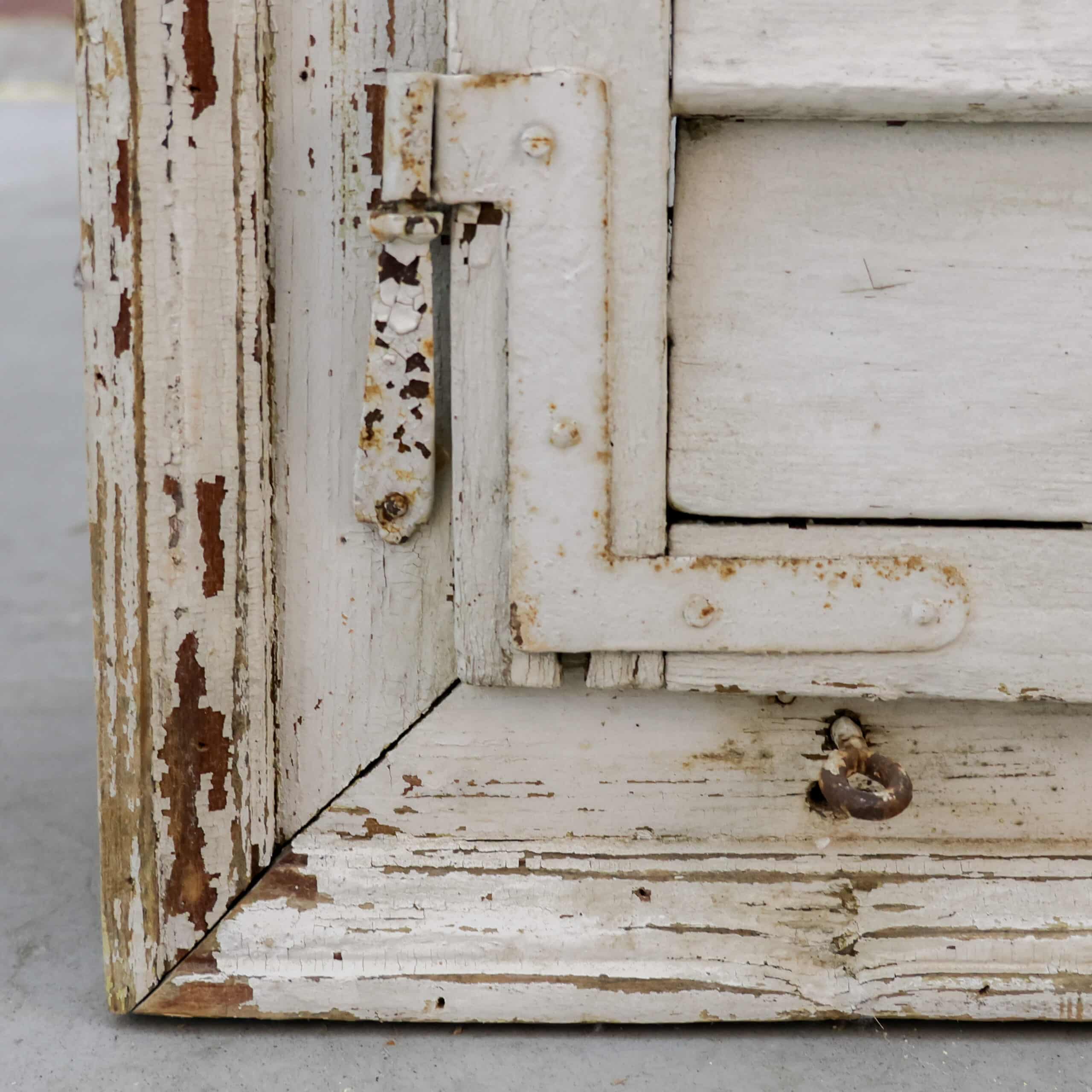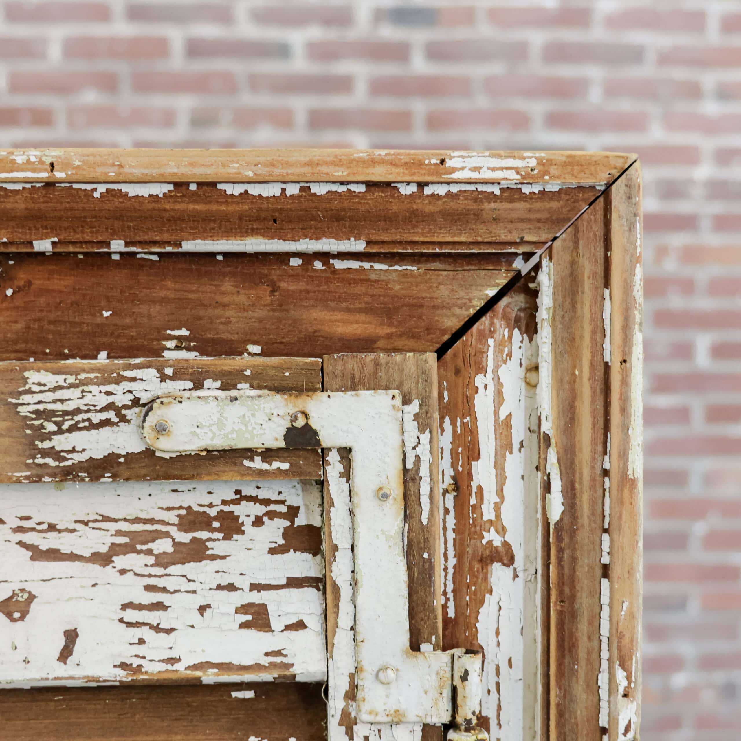 Pachtig brocante raamkozijn met originele luiken en glas, rijk aan karakter en een schitterende doorleefde verflaag in zachte crème- en aardetinten. De authentieke sluitingen, scharnieren en het verweerde hout geven dit stuk een stoere, landelijke uitstraling met een verhaal. Perfect als wanddecoratie of sfeervol element in een veranda of interieur met vintage ziel.